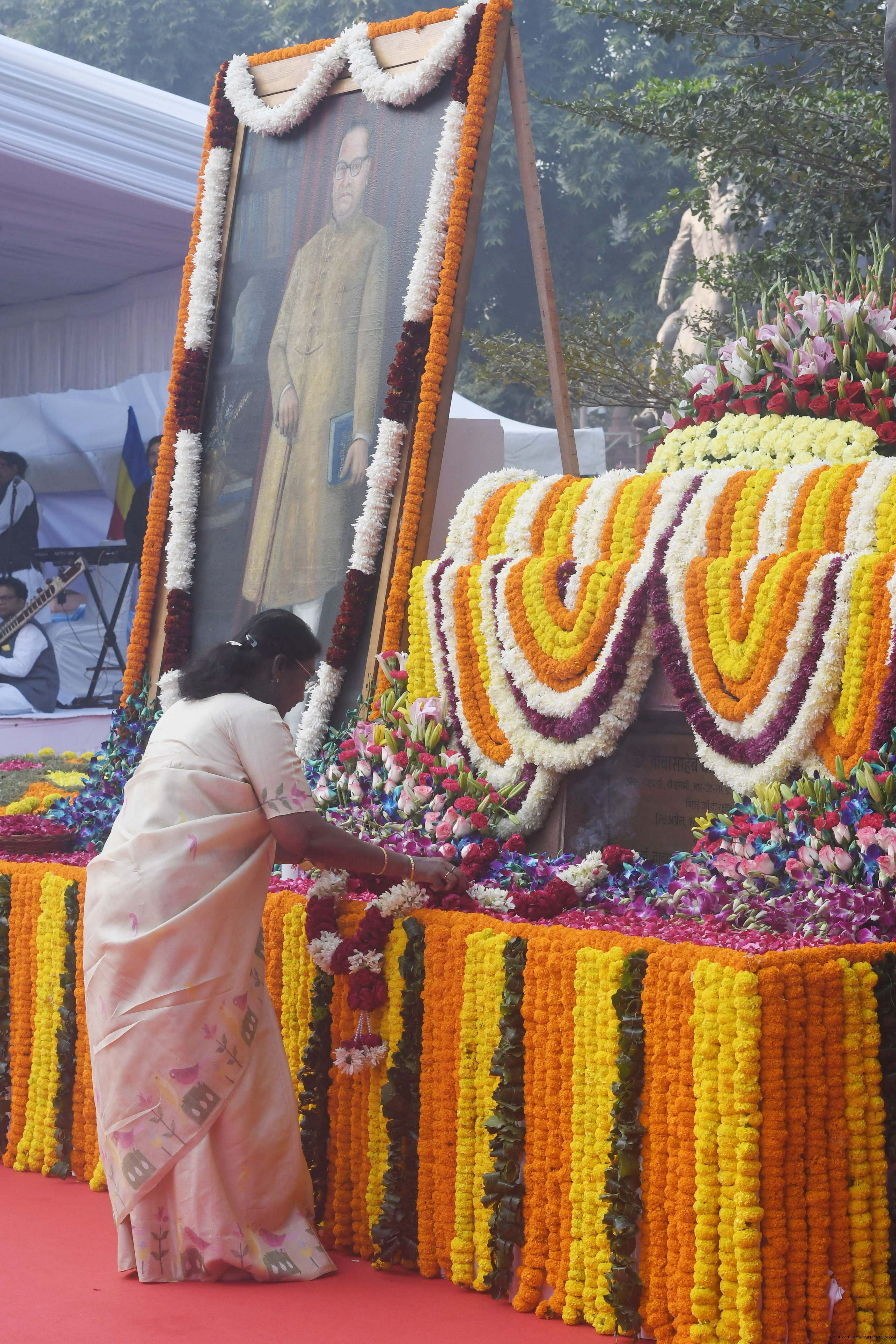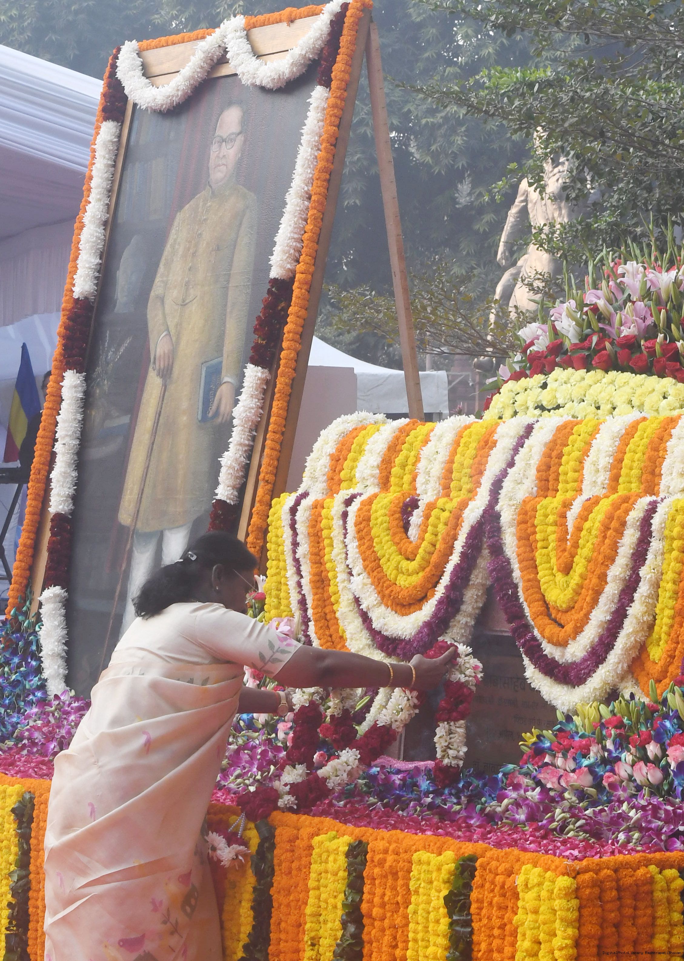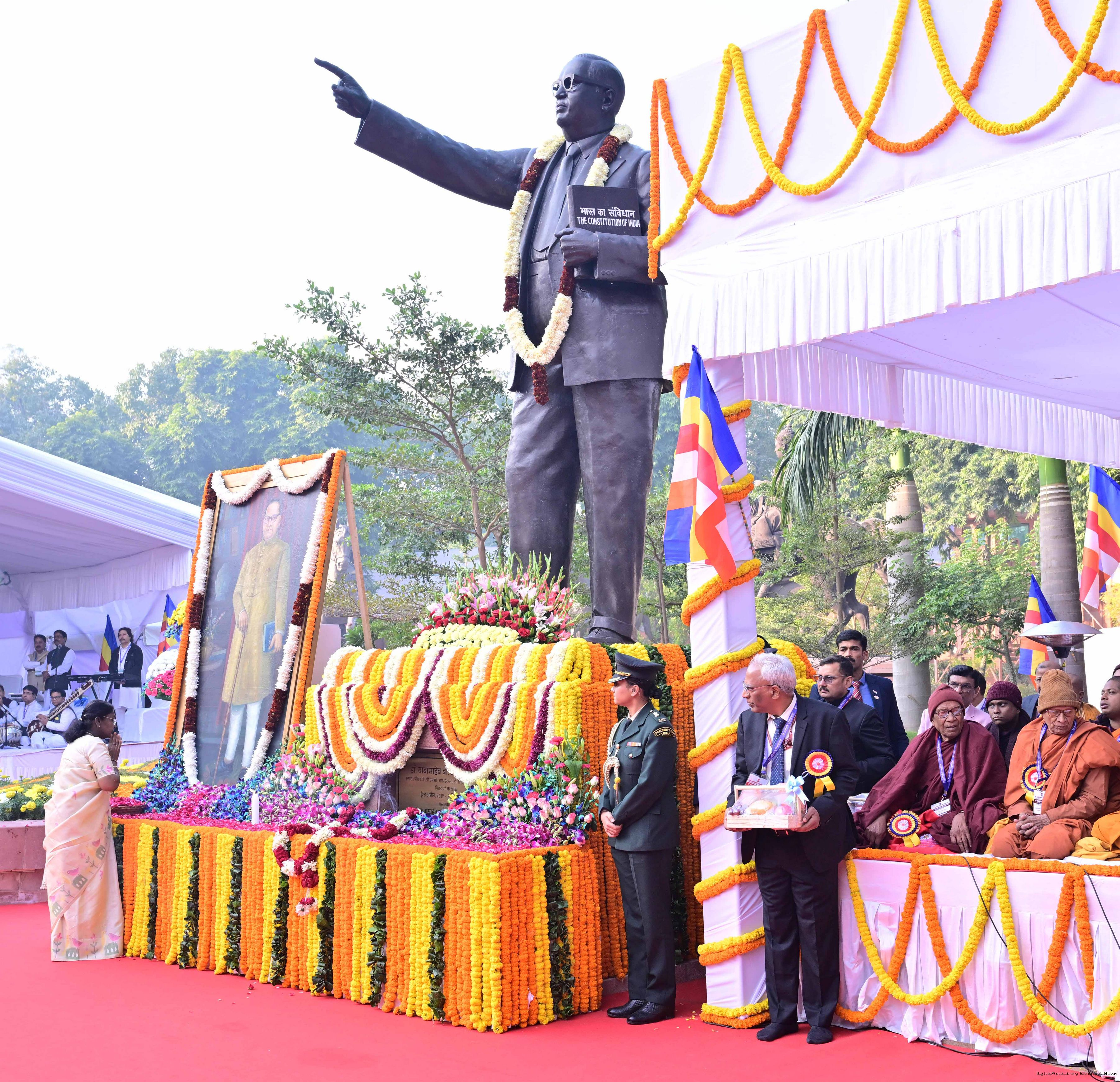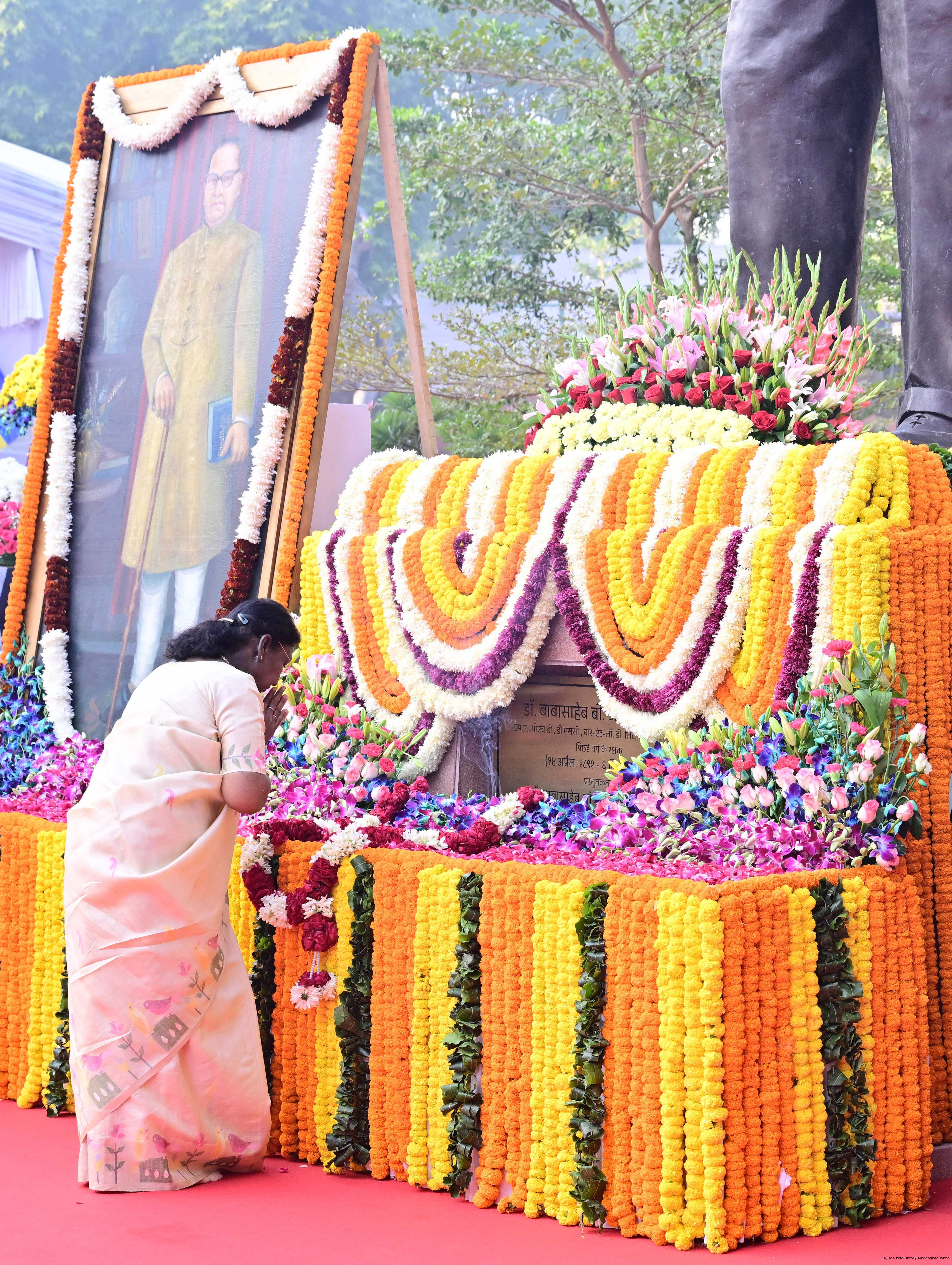 | Caption: | The President of India, Smt. Droupadi Murmu paid floral tributes to Babasaheb Dr B.R. Ambedkar on his Mahaparinirvan Diwas at Parliament House premises, New Delhi on December 06, 2025. |