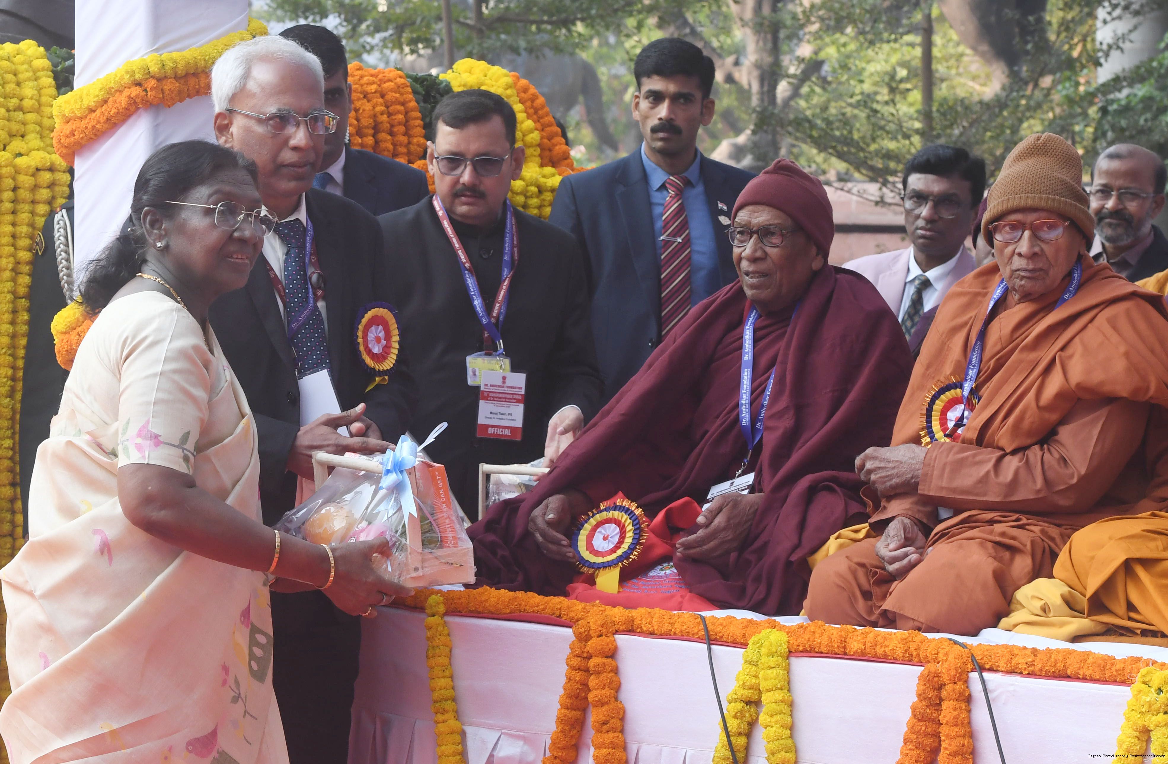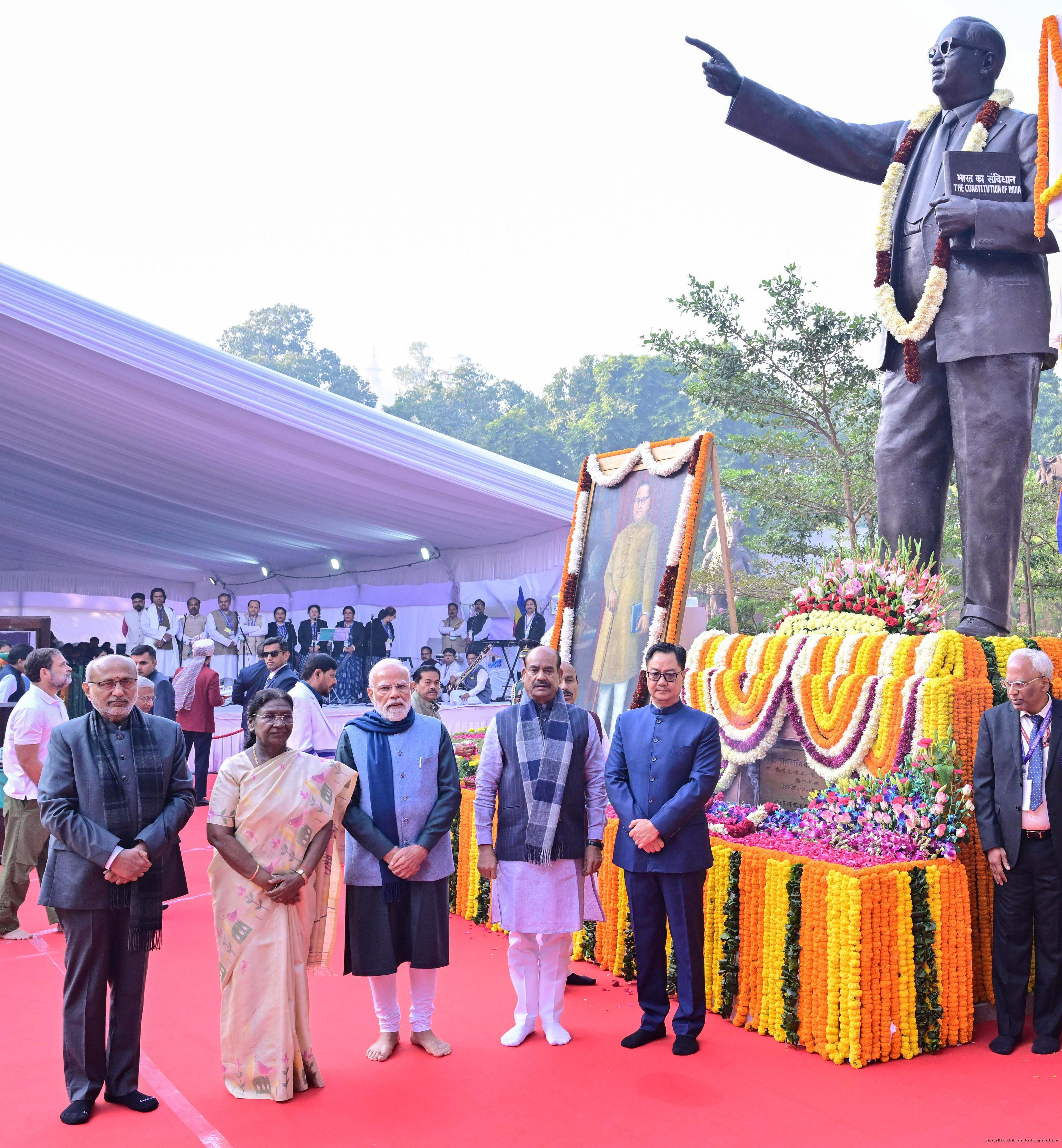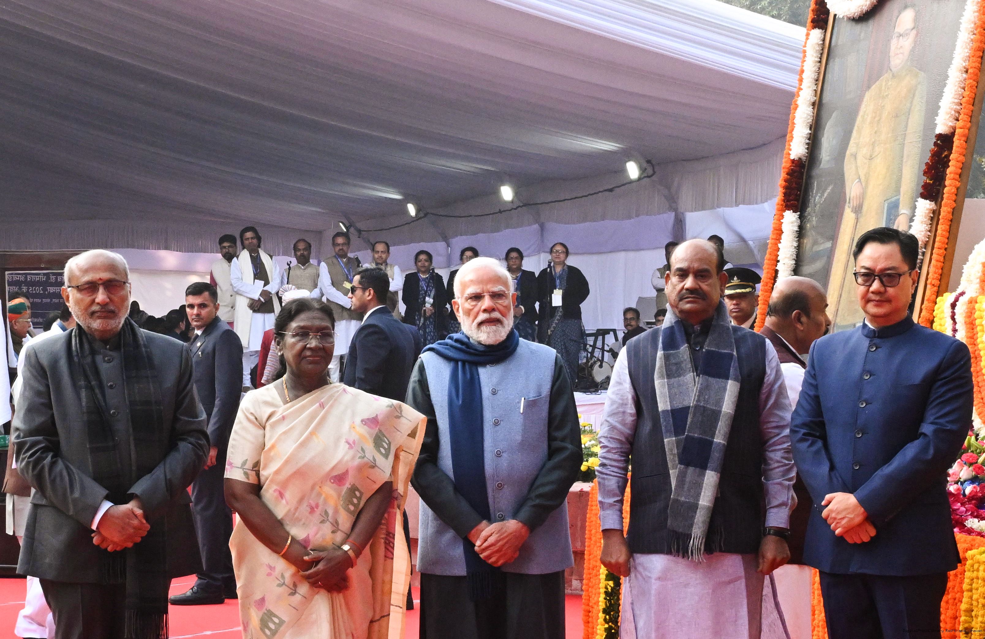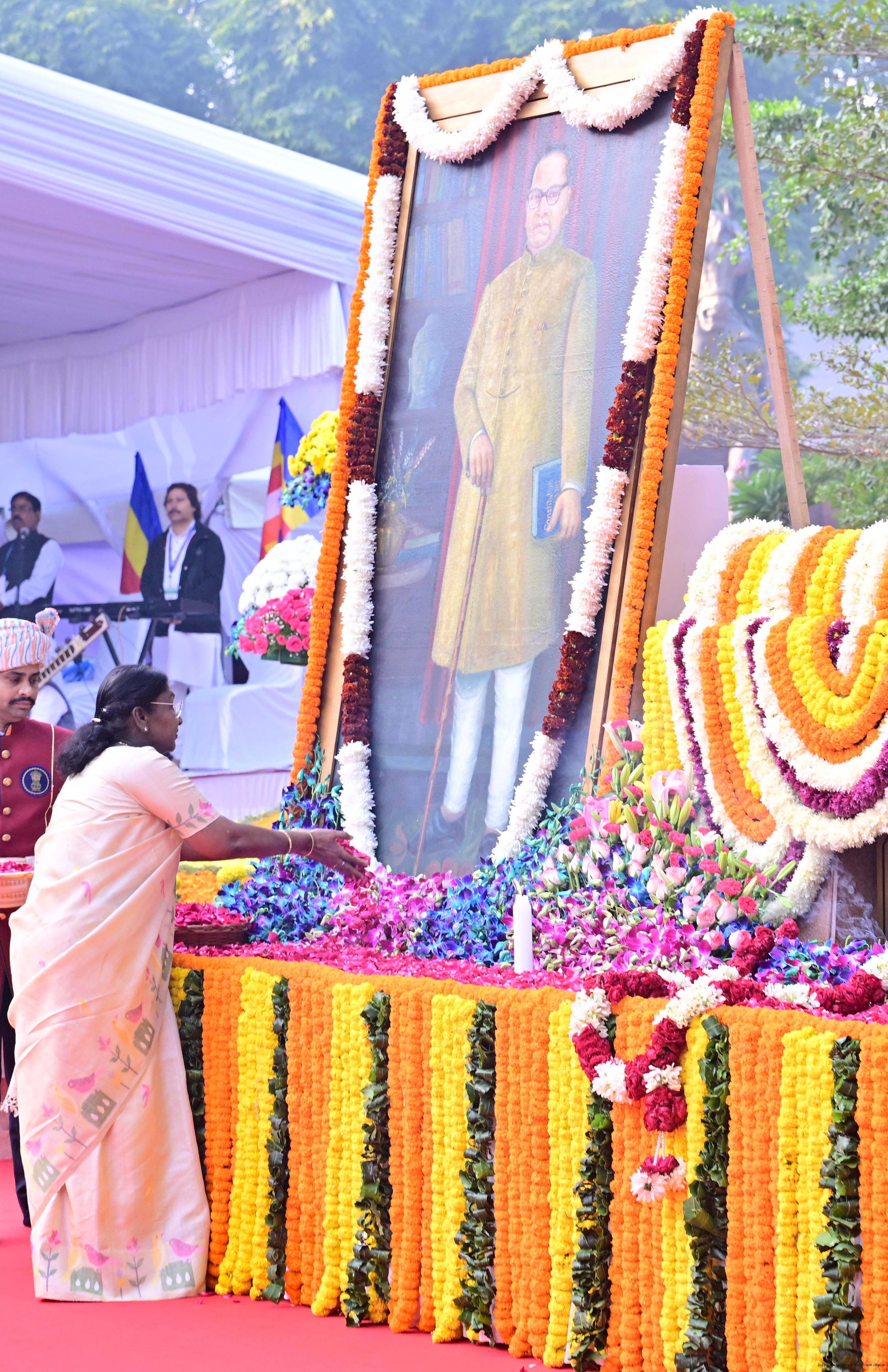 | Caption: | The President of India, Smt. Droupadi Murmu paid floral tributes to Babasaheb Dr B.R. Ambedkar on his Mahaparinirvan Diwas at Parliament House premises, New Delhi on December 06, 2025. |