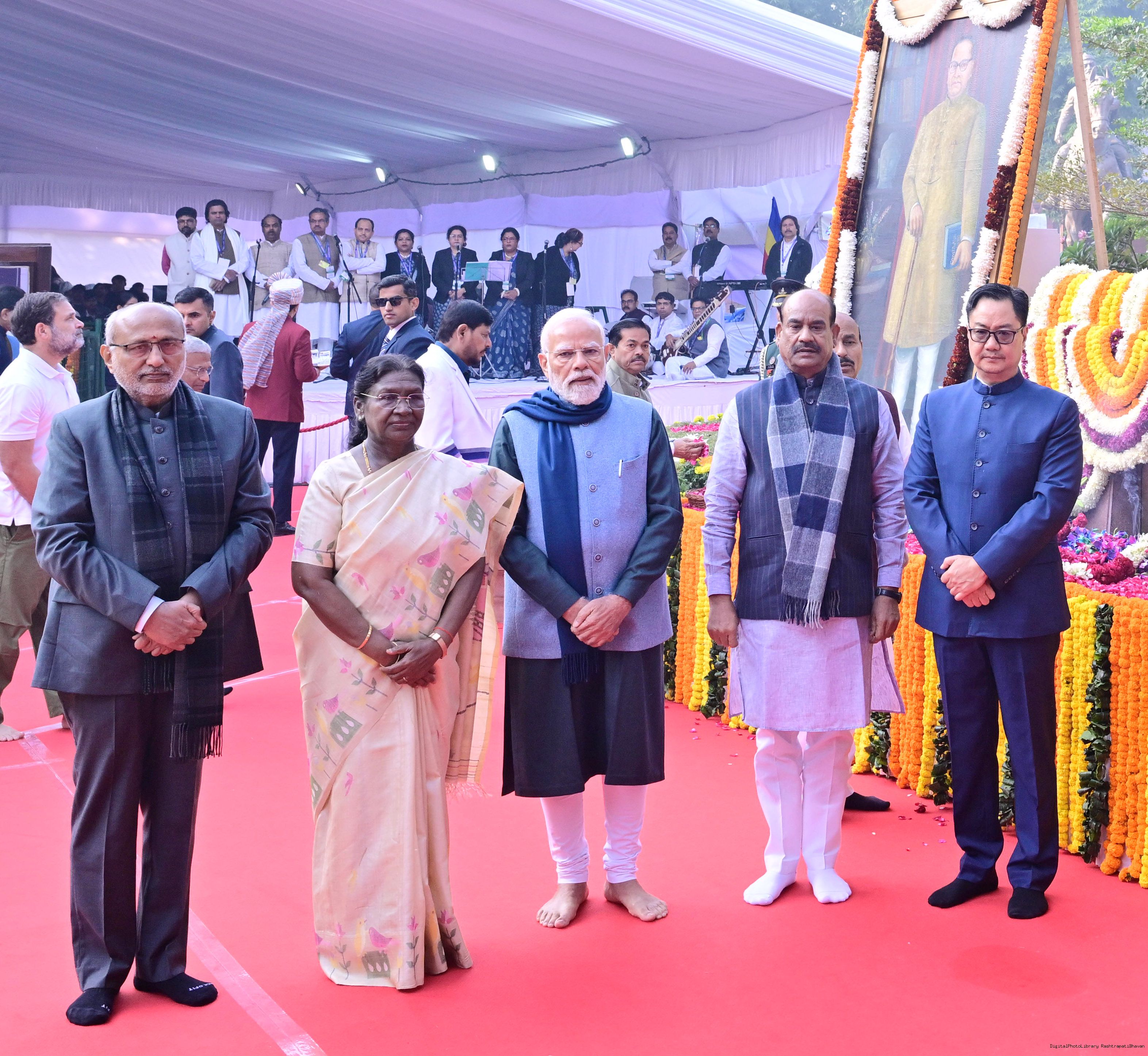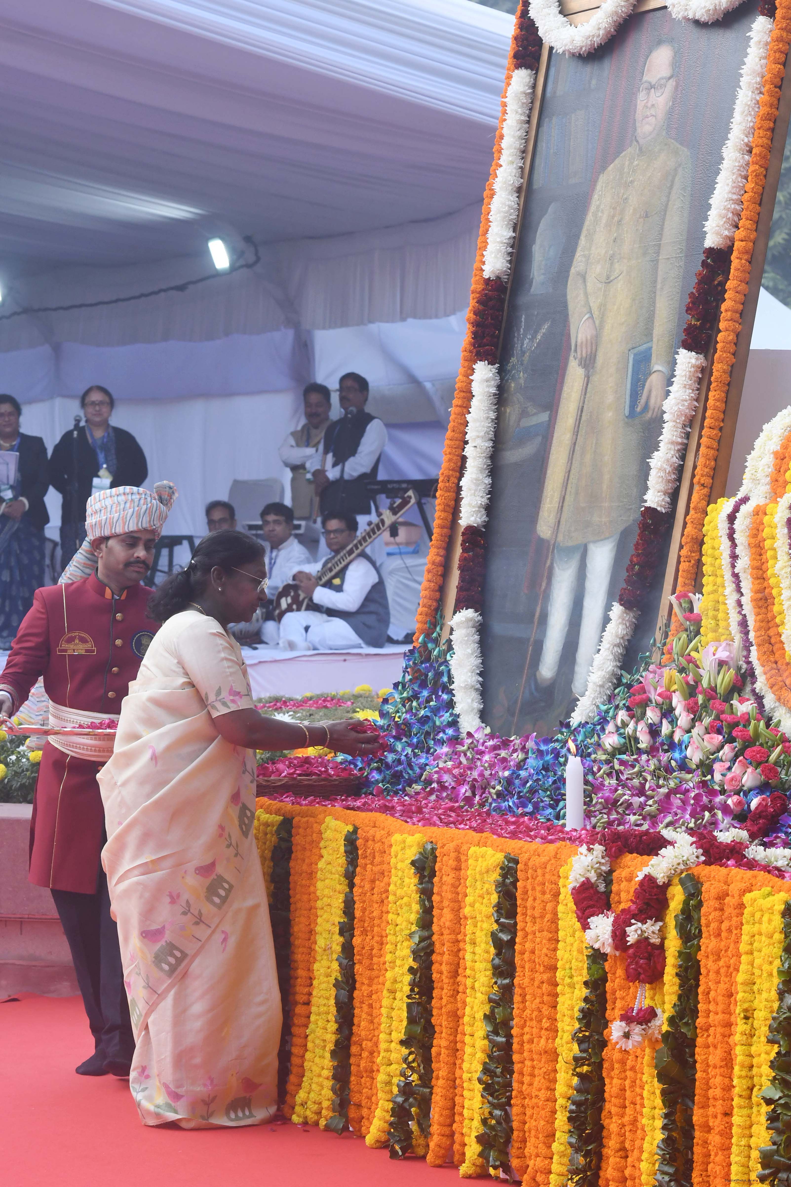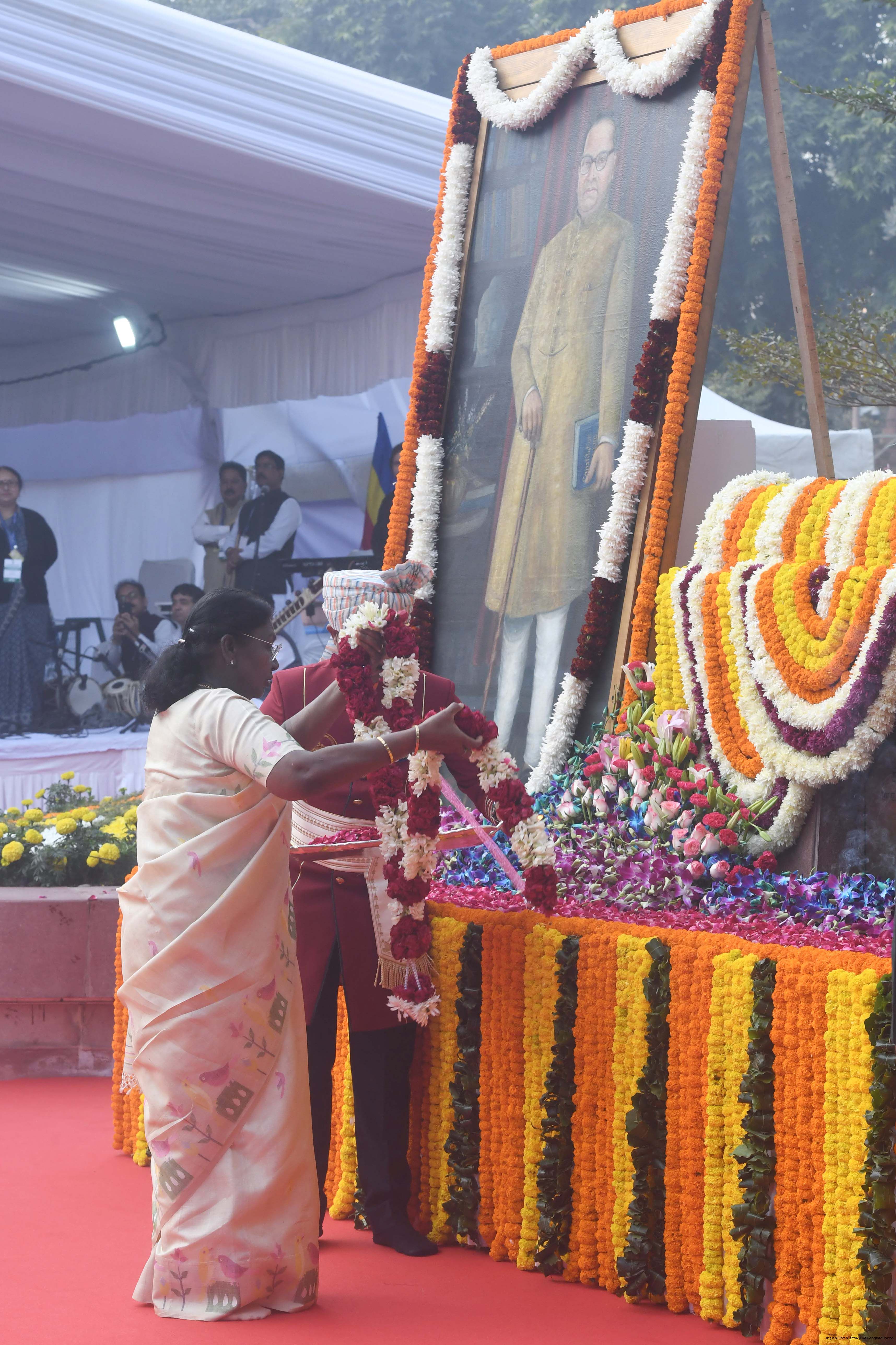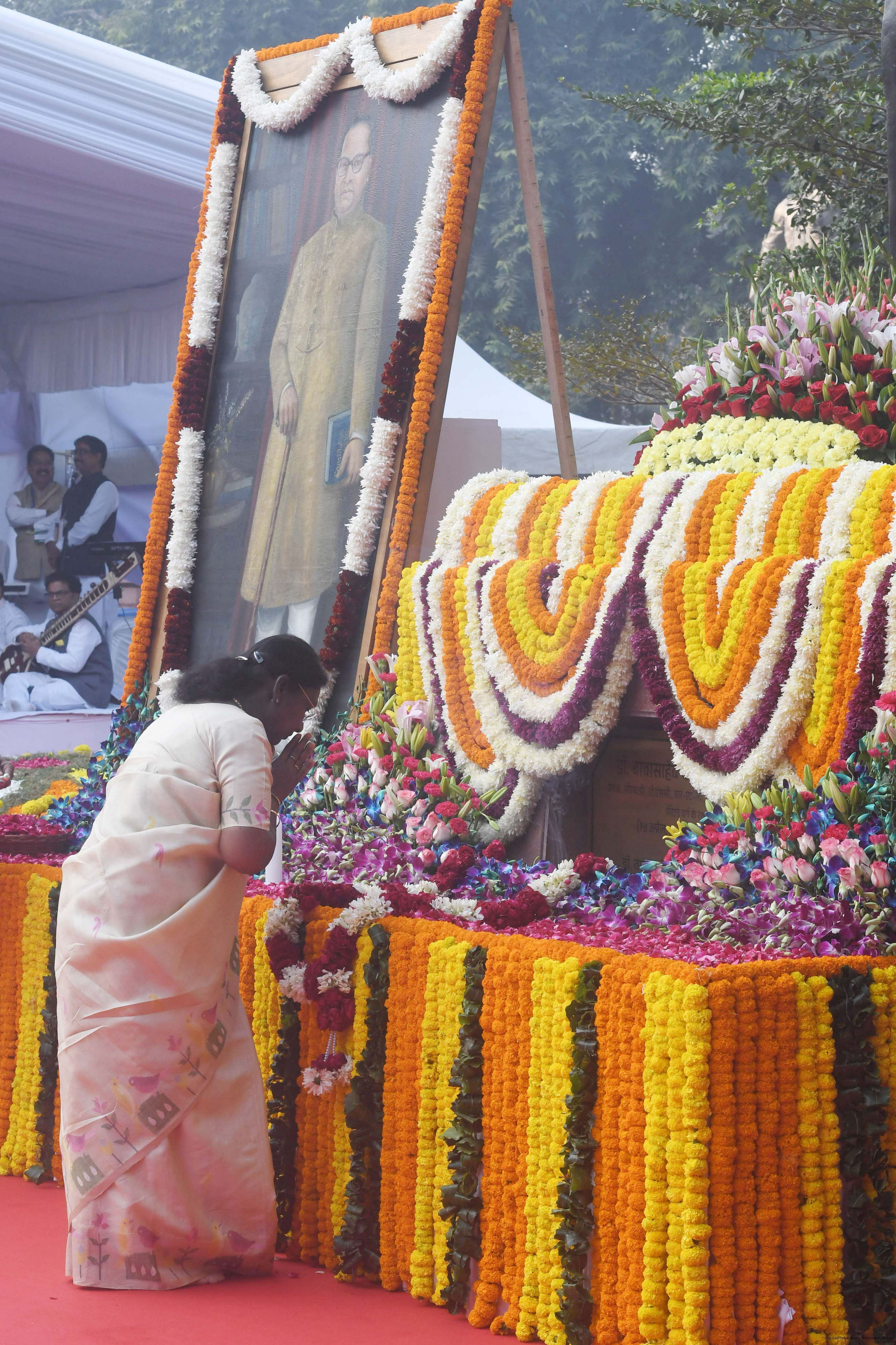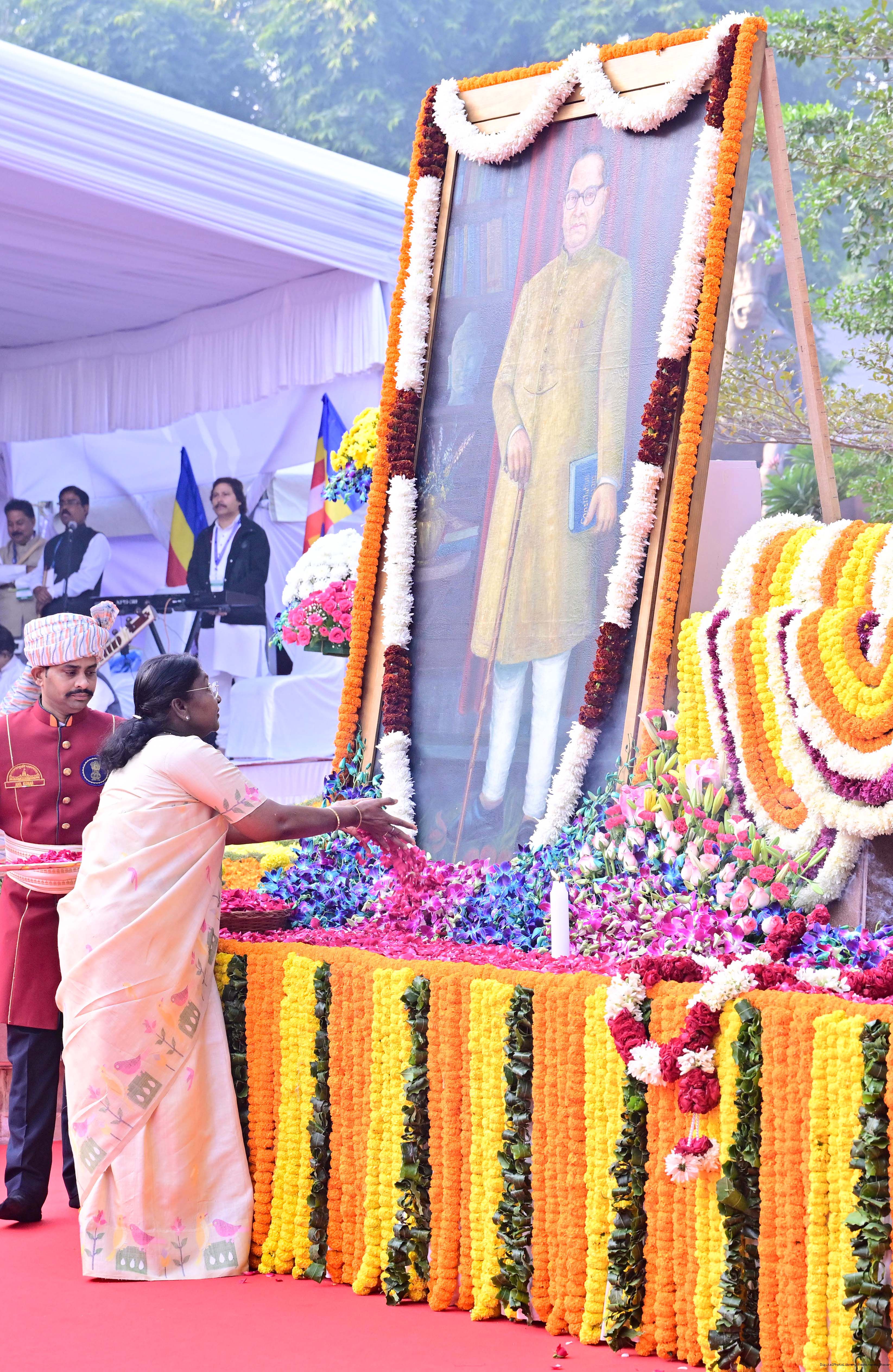 | Caption: | The President of India, Smt. Droupadi Murmu paid floral tributes to Babasaheb Dr B.R. Ambedkar on his Mahaparinirvan Diwas at Parliament House premises, New Delhi on December 06, 2025. |