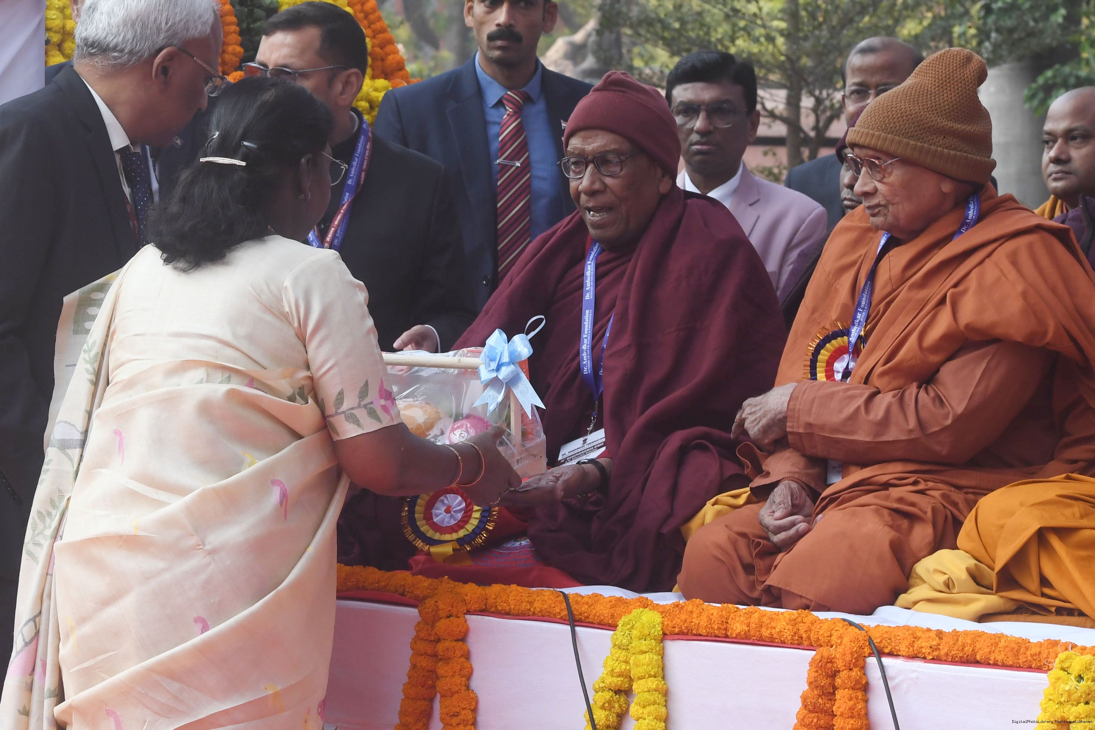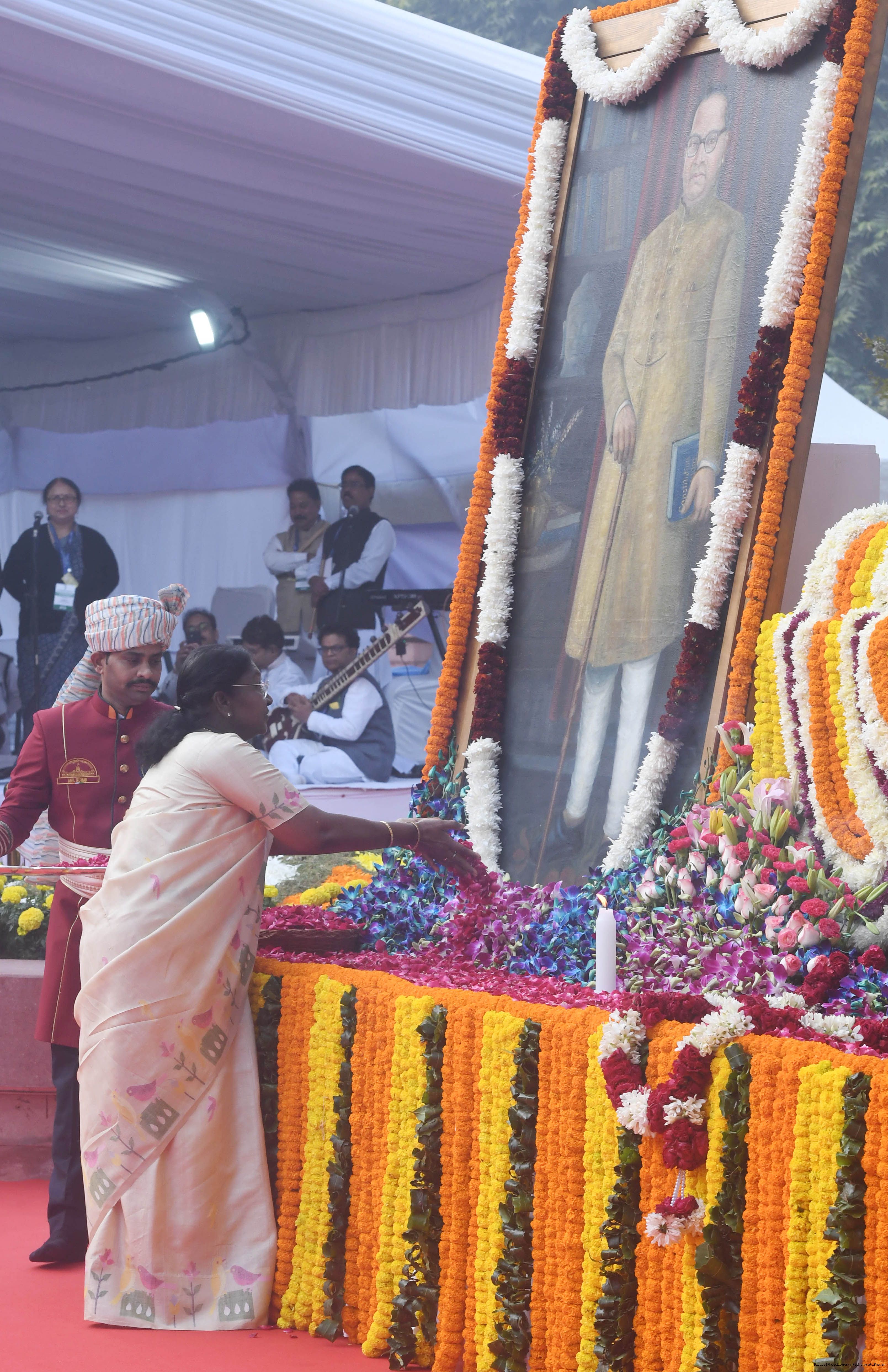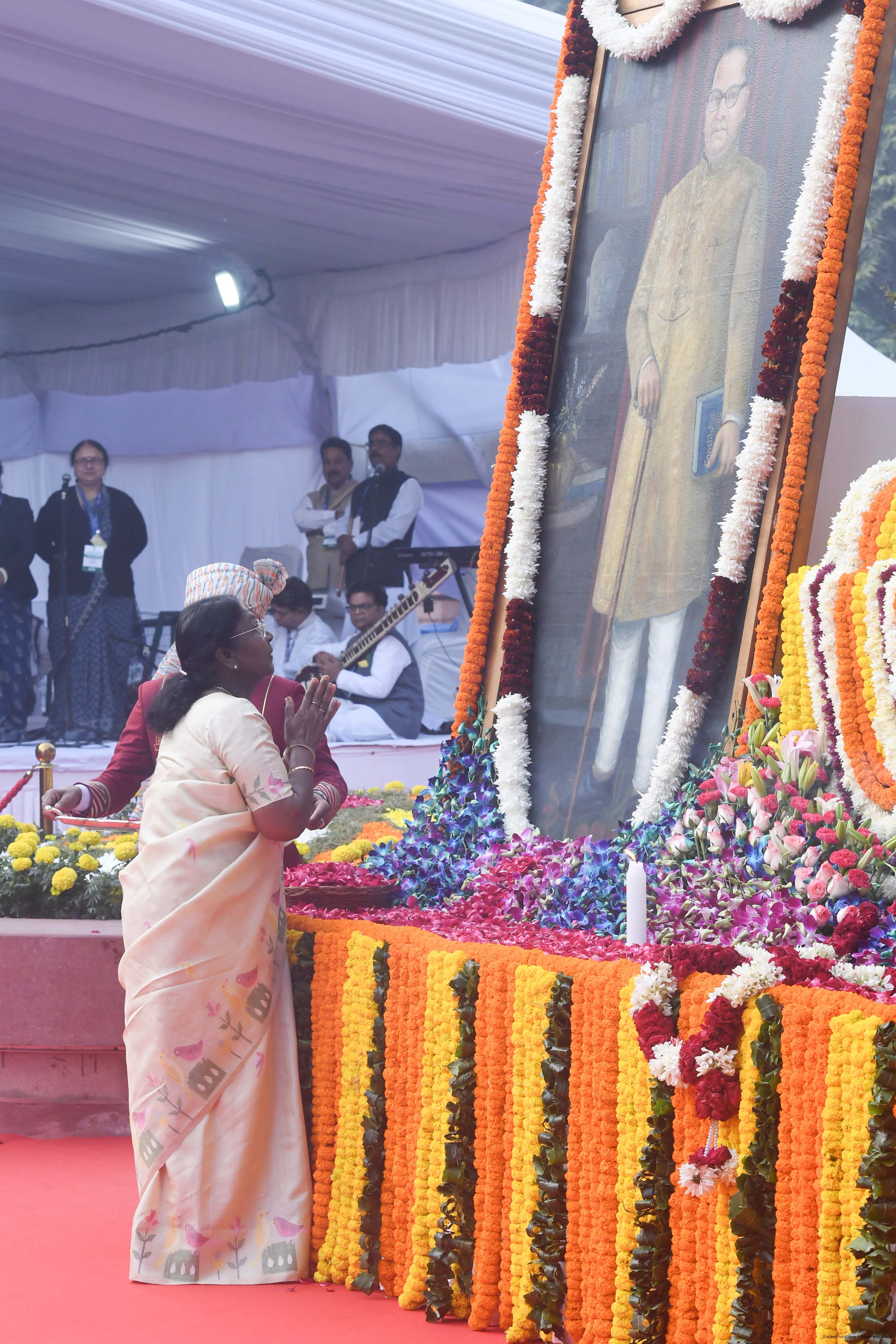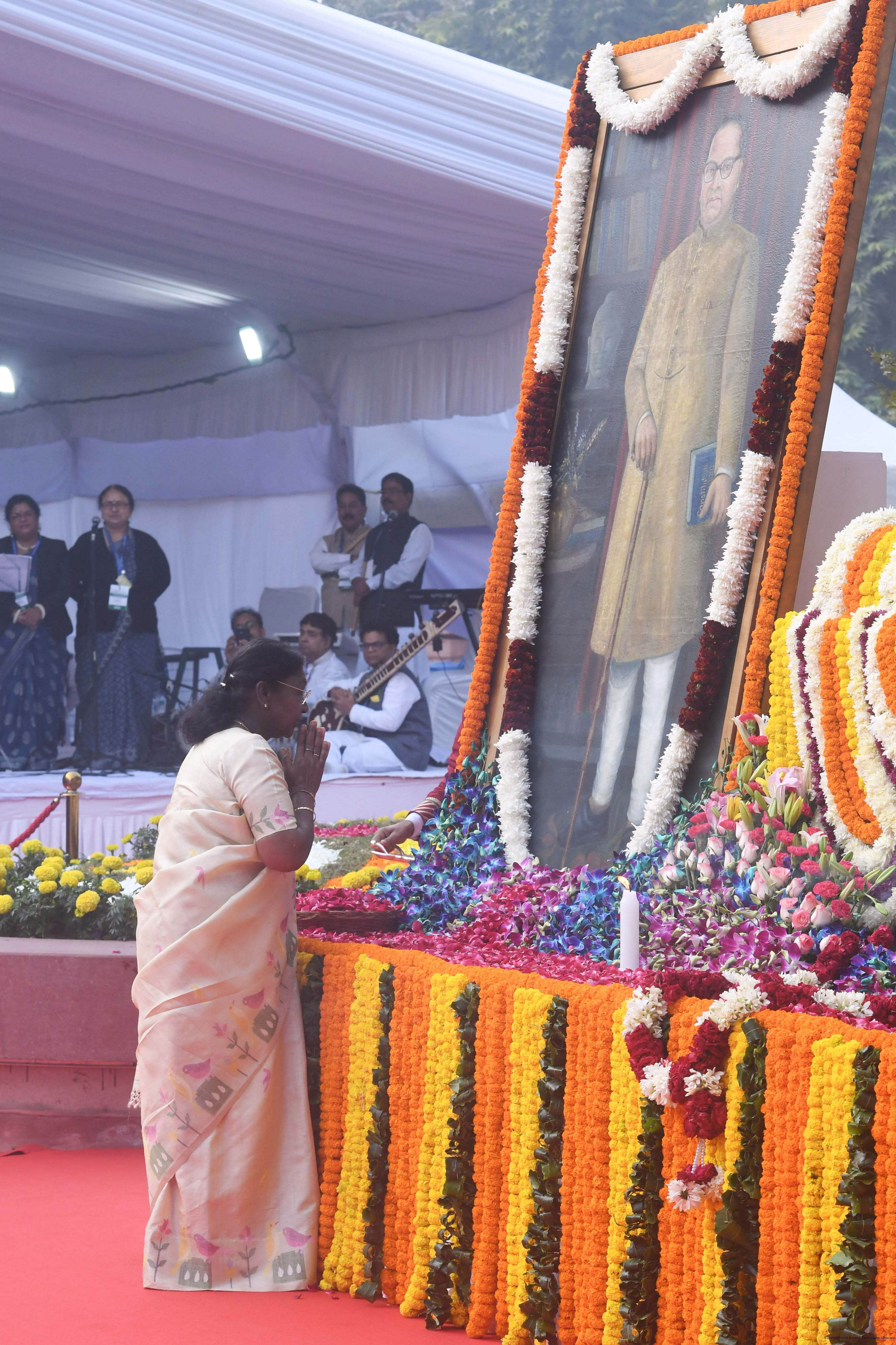 | Caption: | The President of India, Smt. Droupadi Murmu paid floral tributes to Babasaheb Dr B.R. Ambedkar on his Mahaparinirvan Diwas at Parliament House premises, New Delhi on December 06, 2025. |