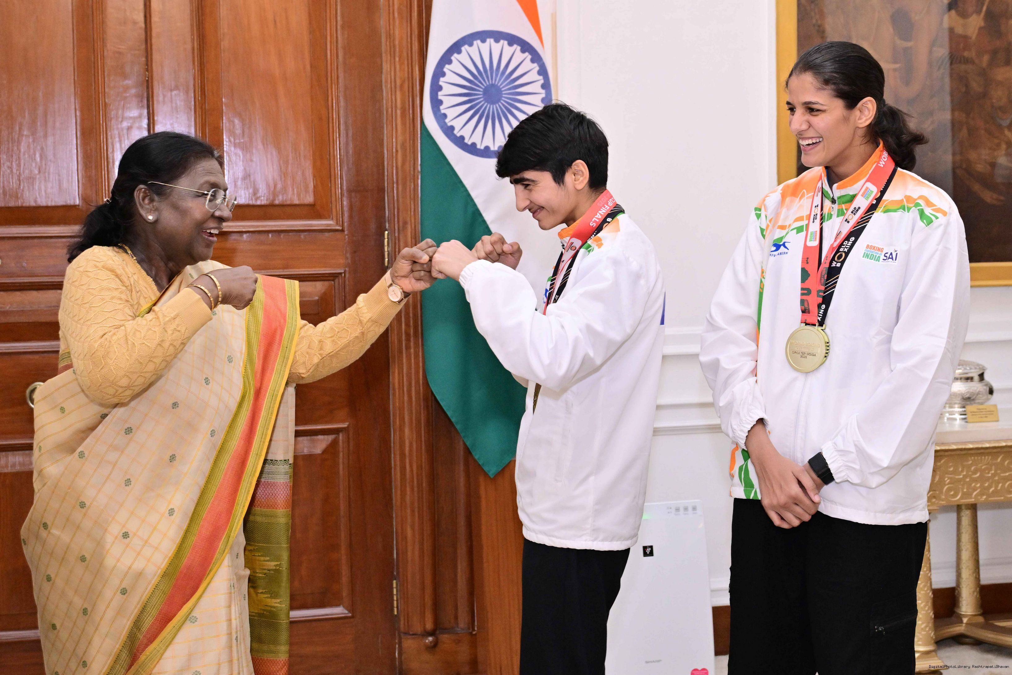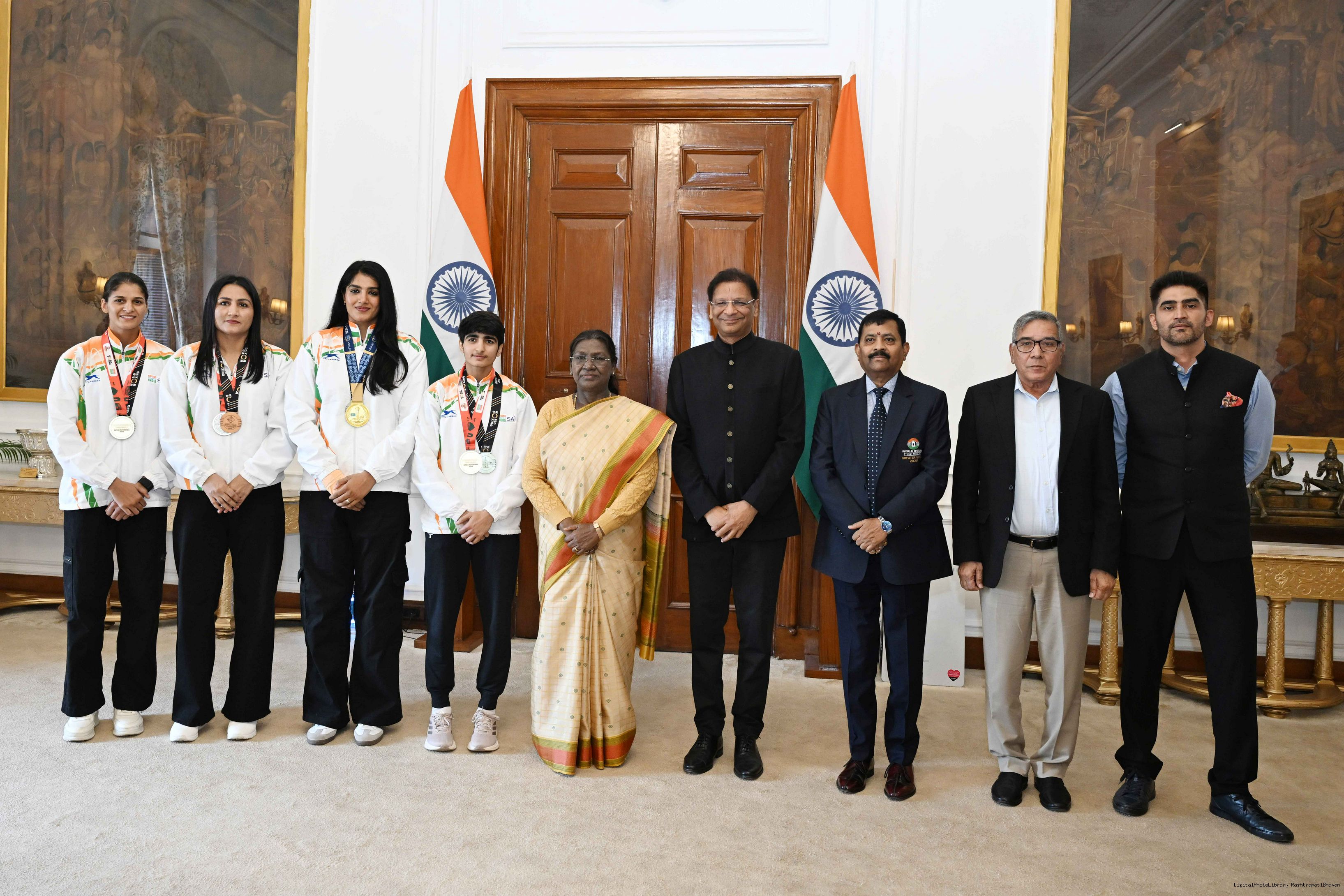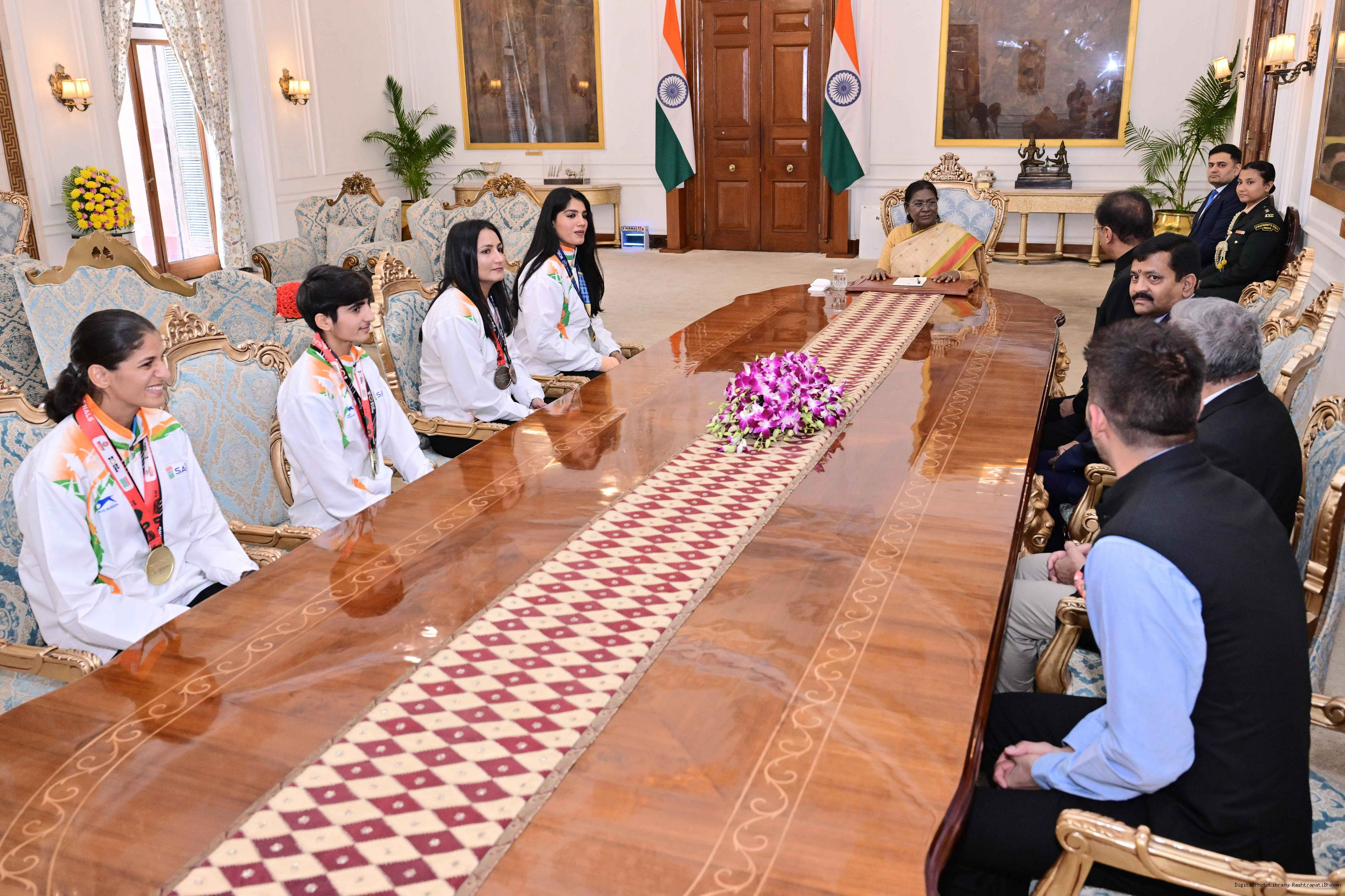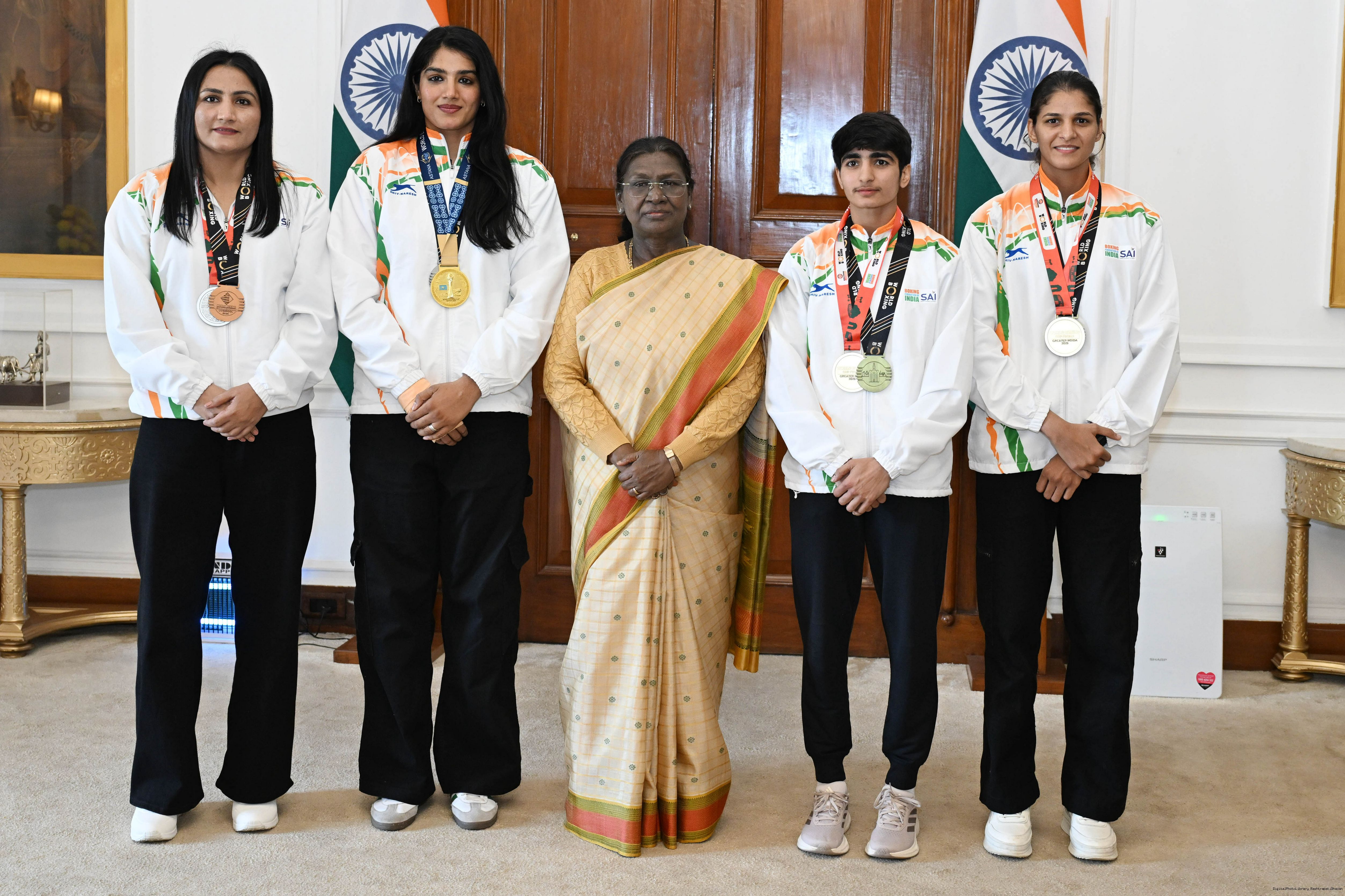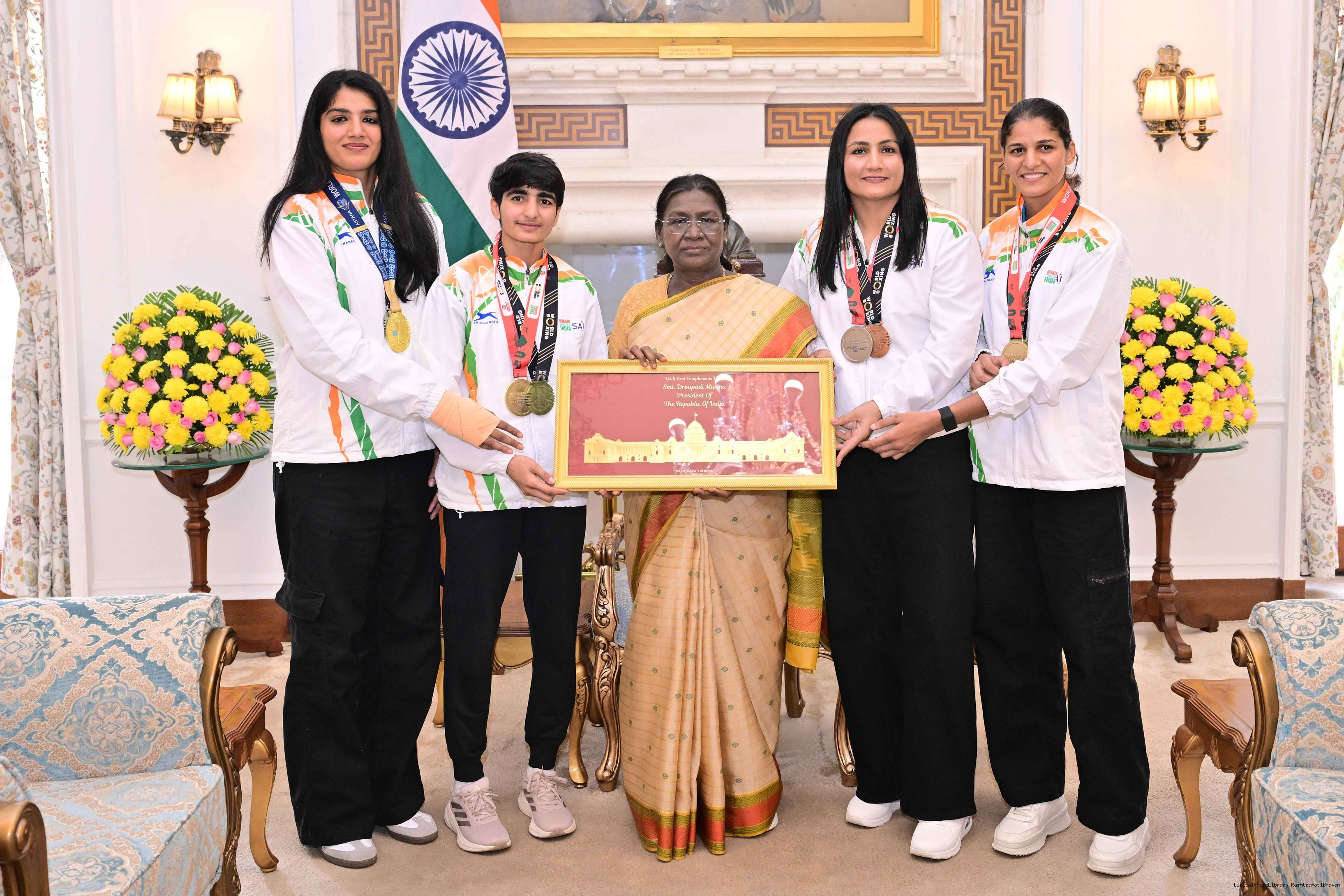 | Caption: | Indian women boxers who brought laurels to the nation at the 2025 World Boxing Championships in Liverpool called on the President Smt. Droupadi Murmu at Rashtrapati Bhavan on December 10, 2025. |