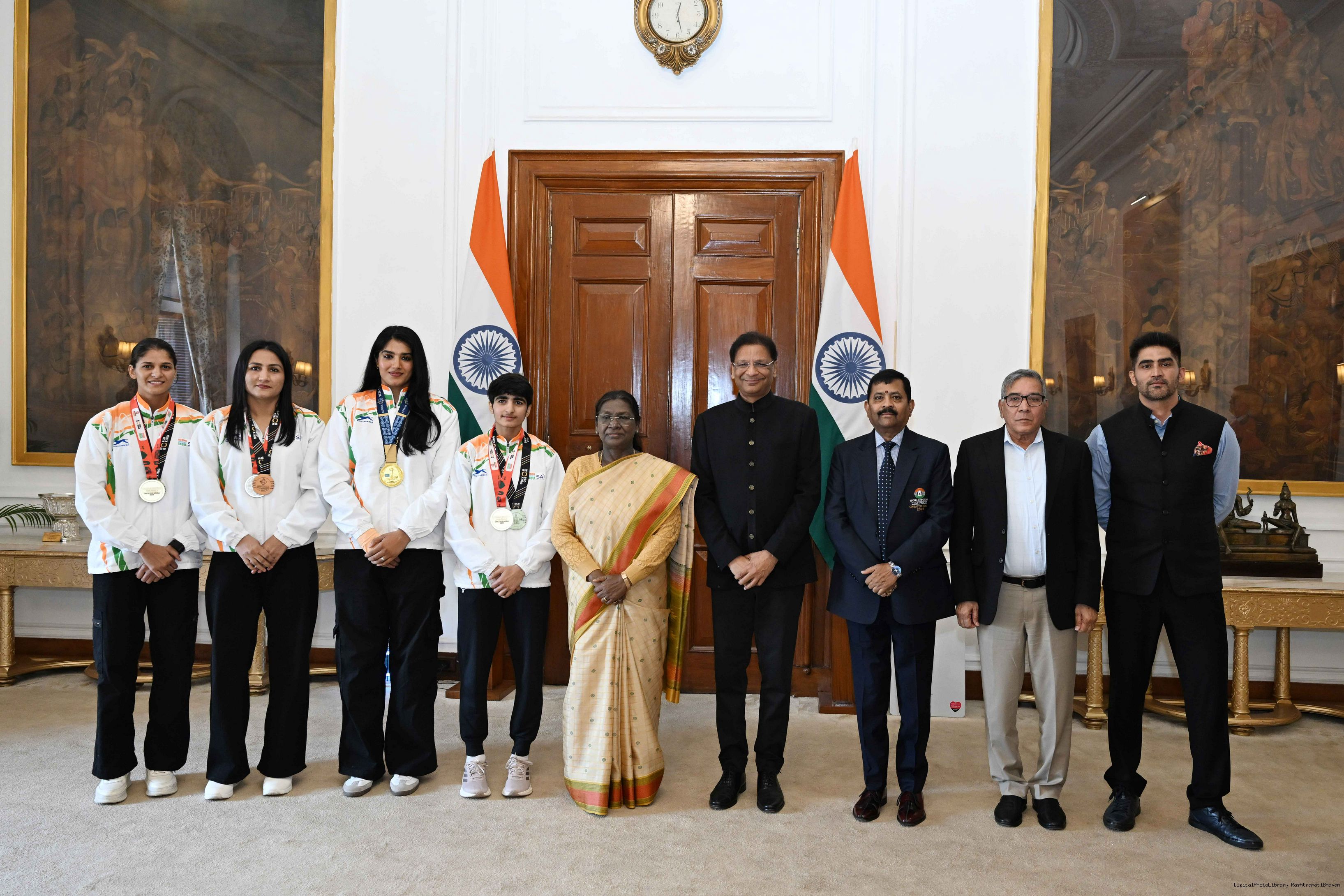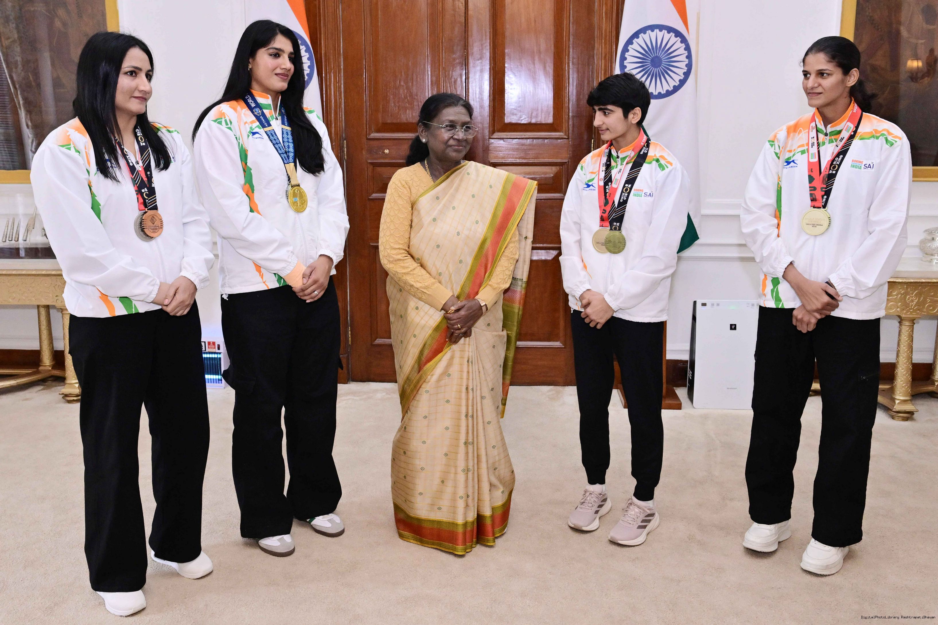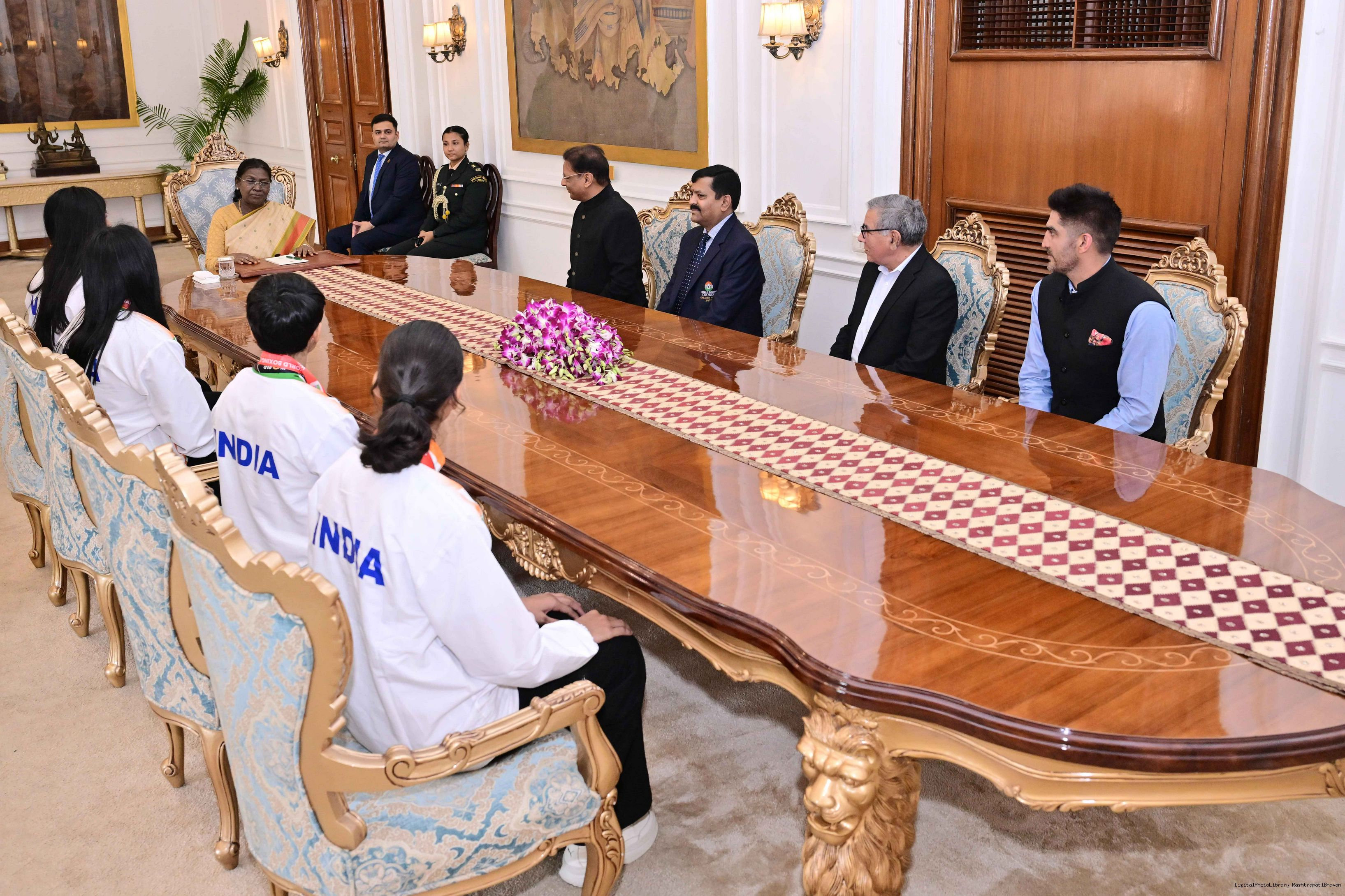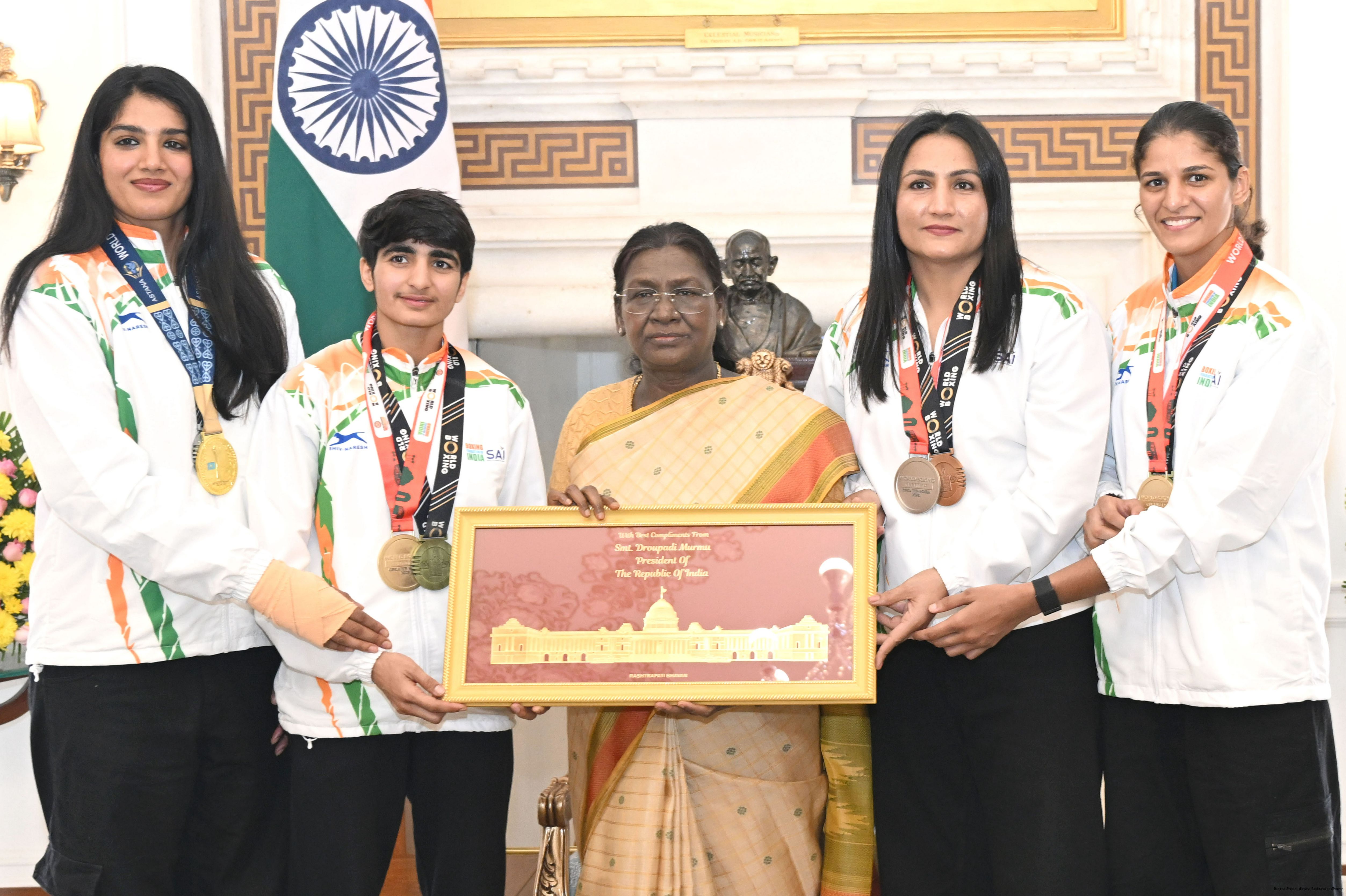 | Caption: | Indian women boxers who brought laurels to the nation at the 2025 World Boxing Championships in Liverpool called on the President Smt. Droupadi Murmu at Rashtrapati Bhavan on December 10, 2025. |