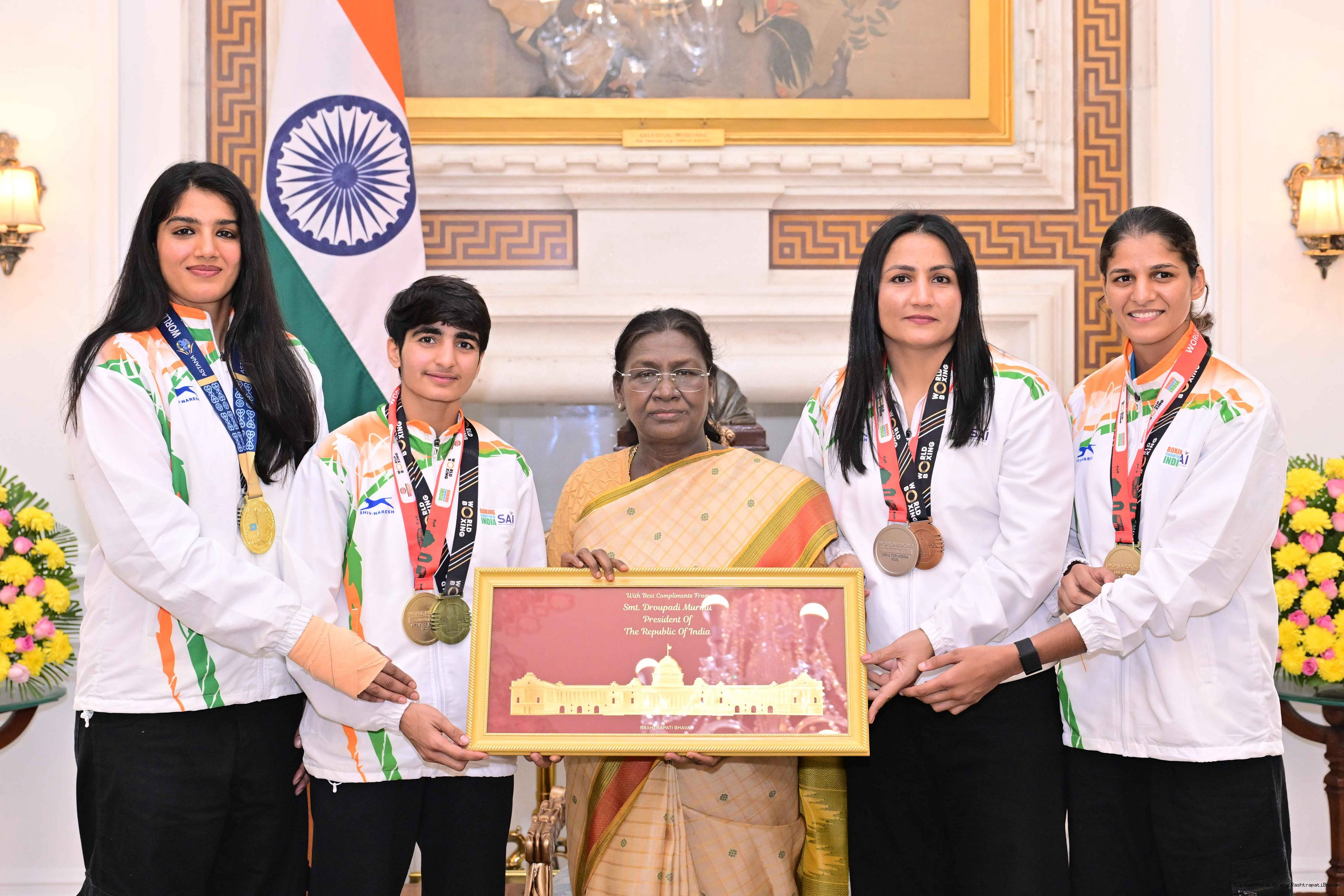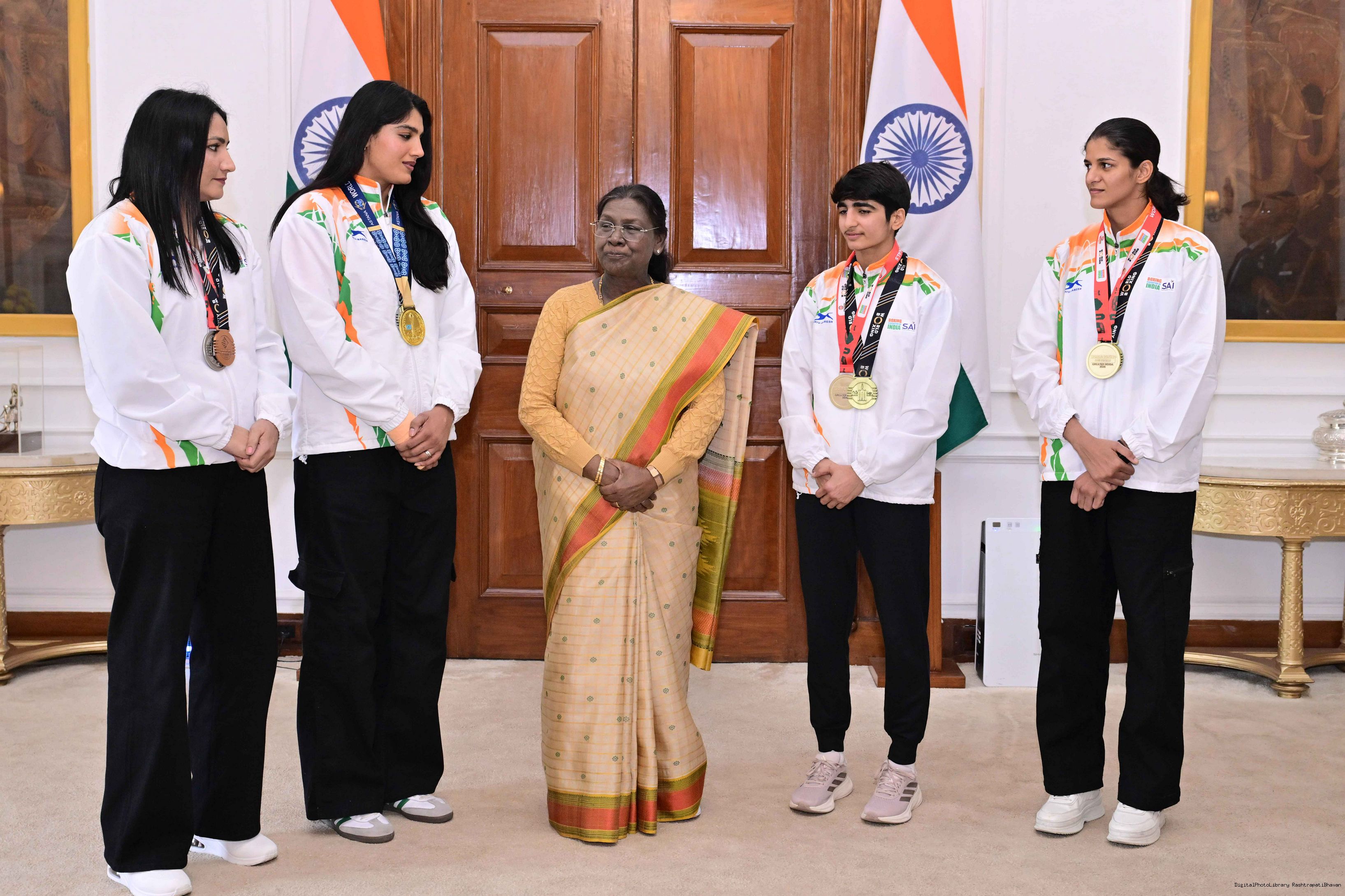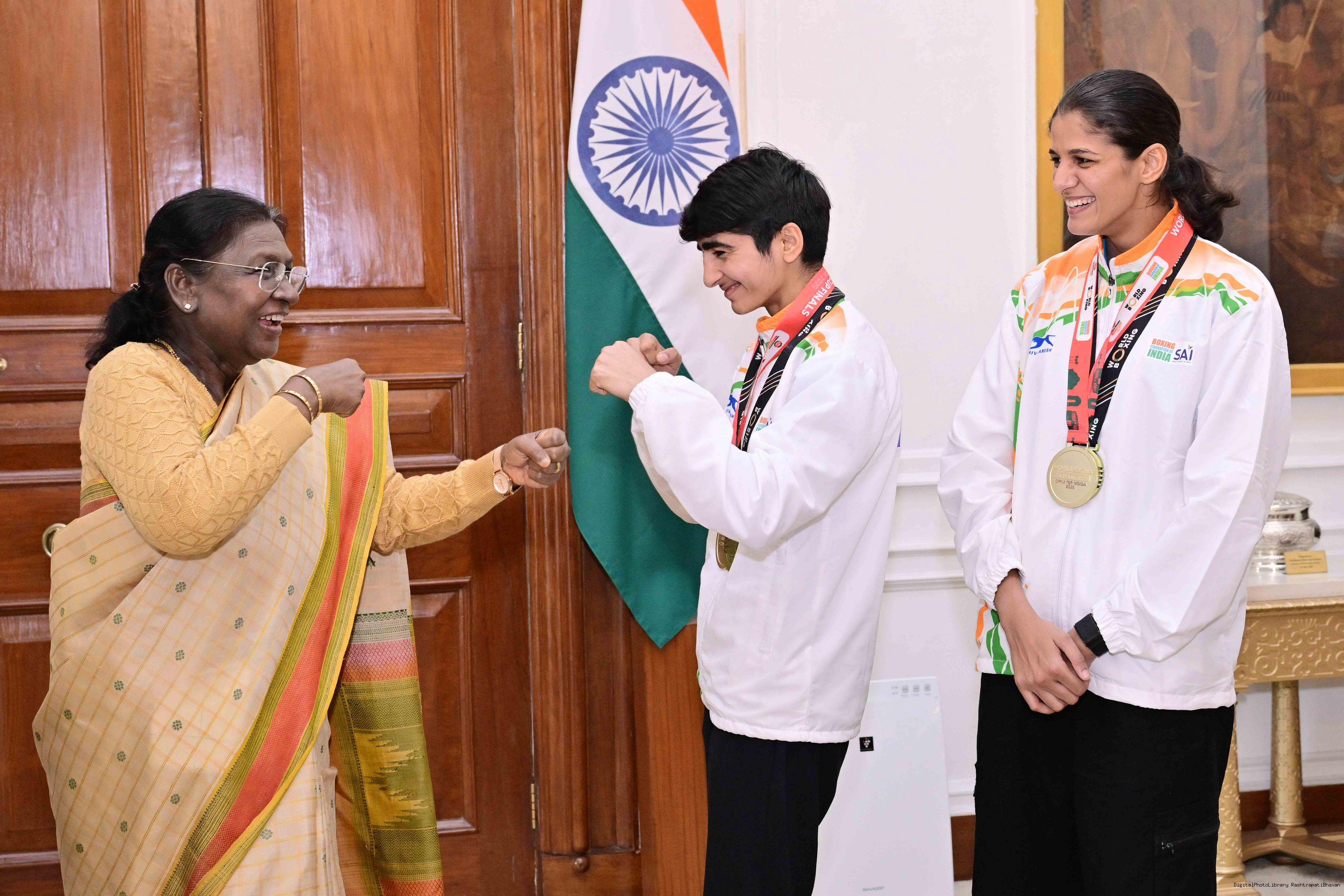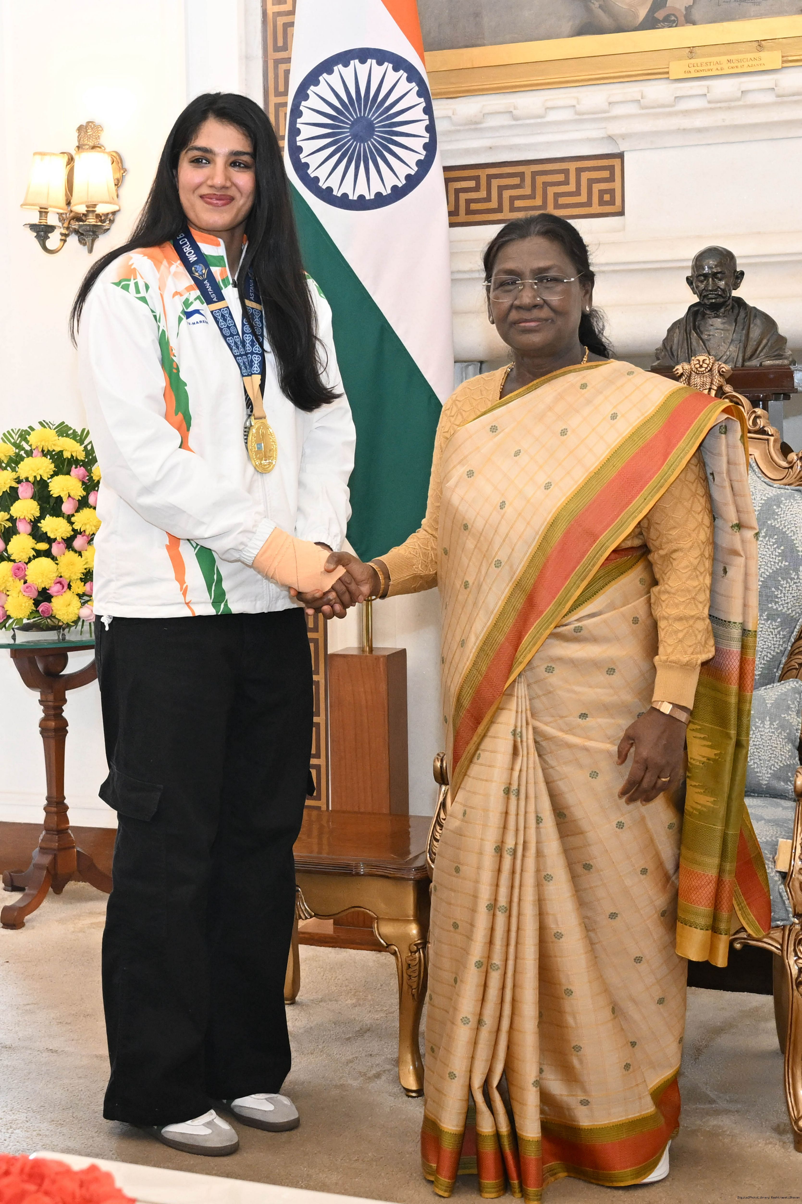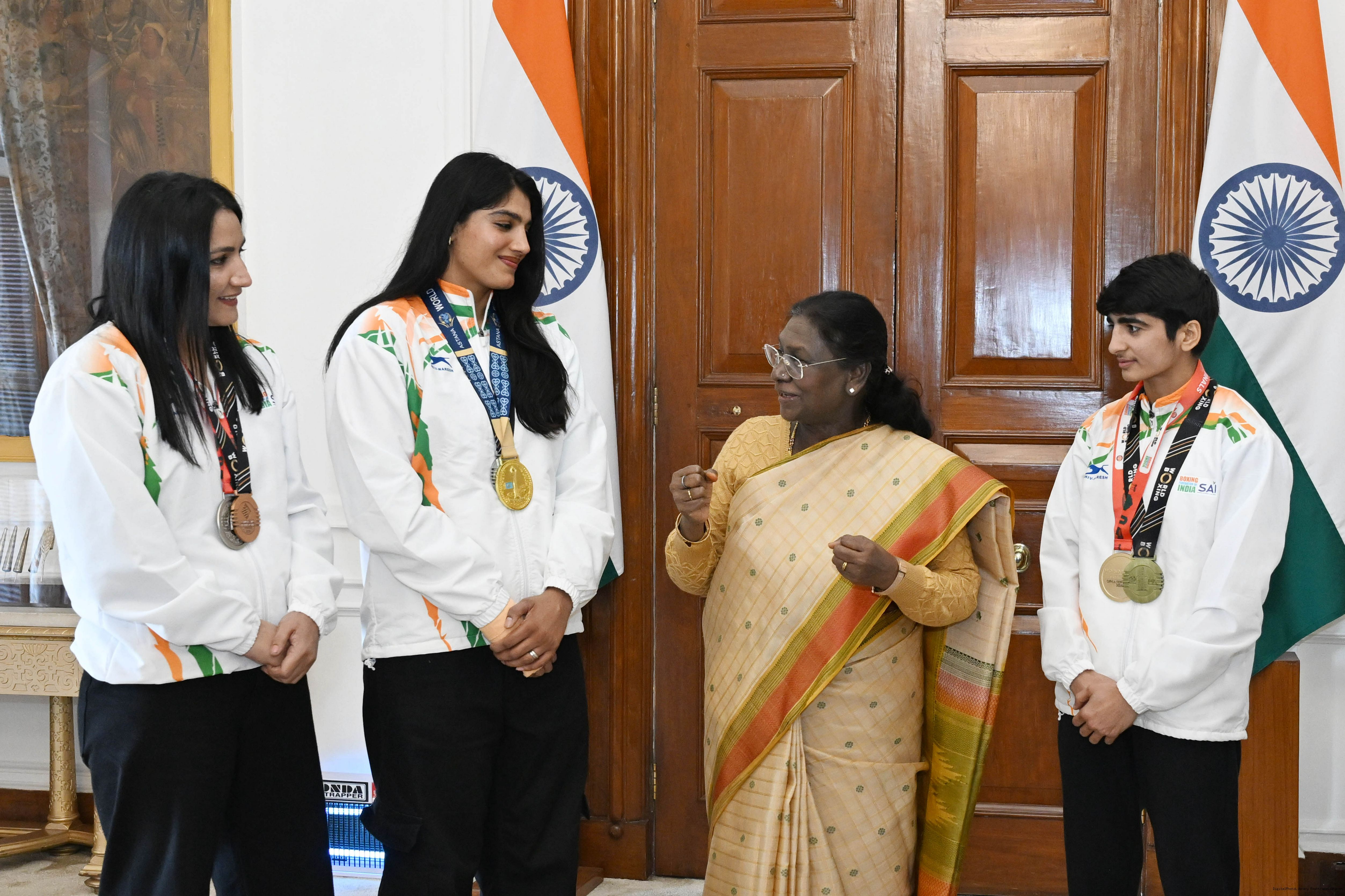 | Caption: | Indian women boxers who brought laurels to the nation at the 2025 World Boxing Championships in Liverpool called on the President Smt. Droupadi Murmu at Rashtrapati Bhavan on December 10, 2025. |