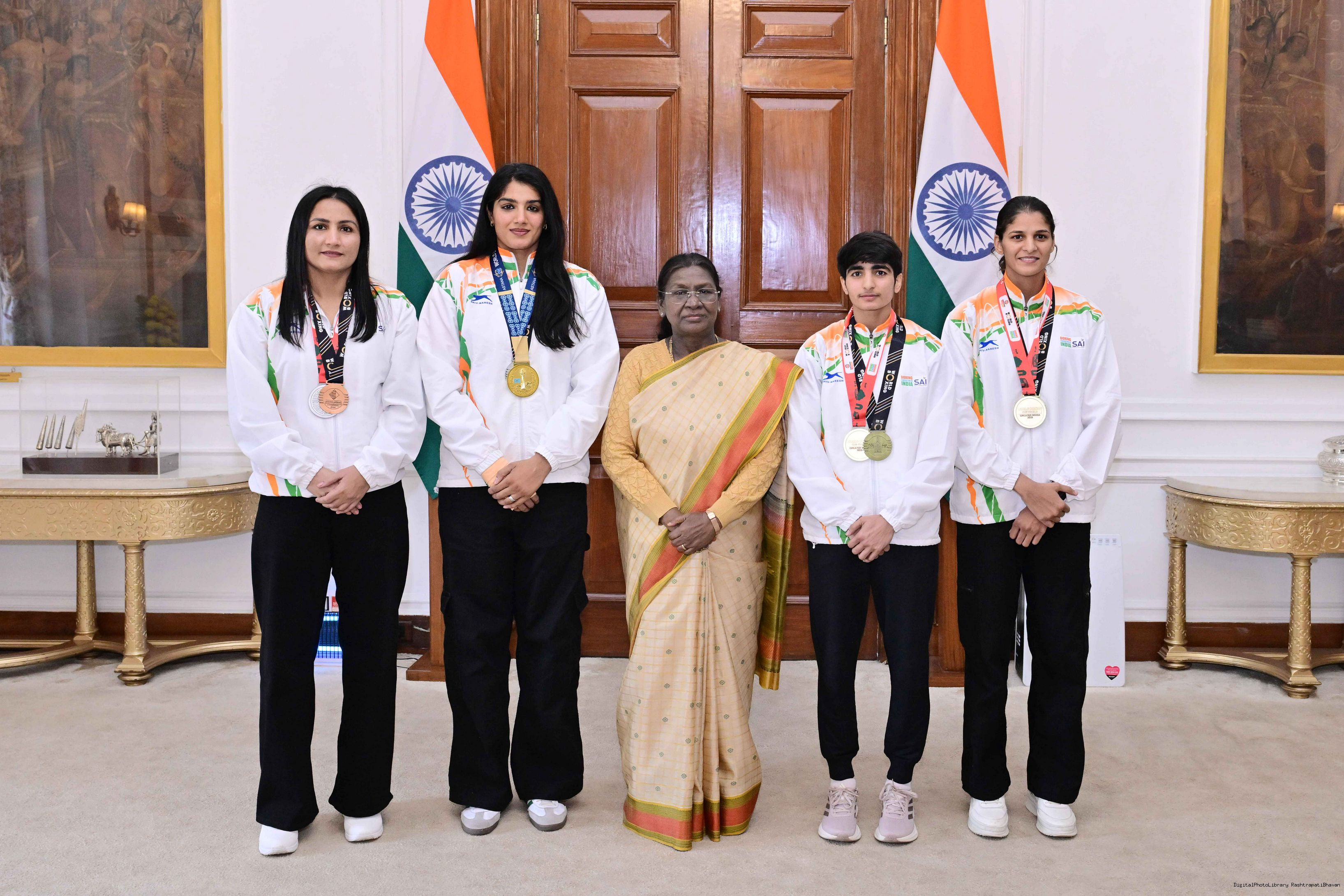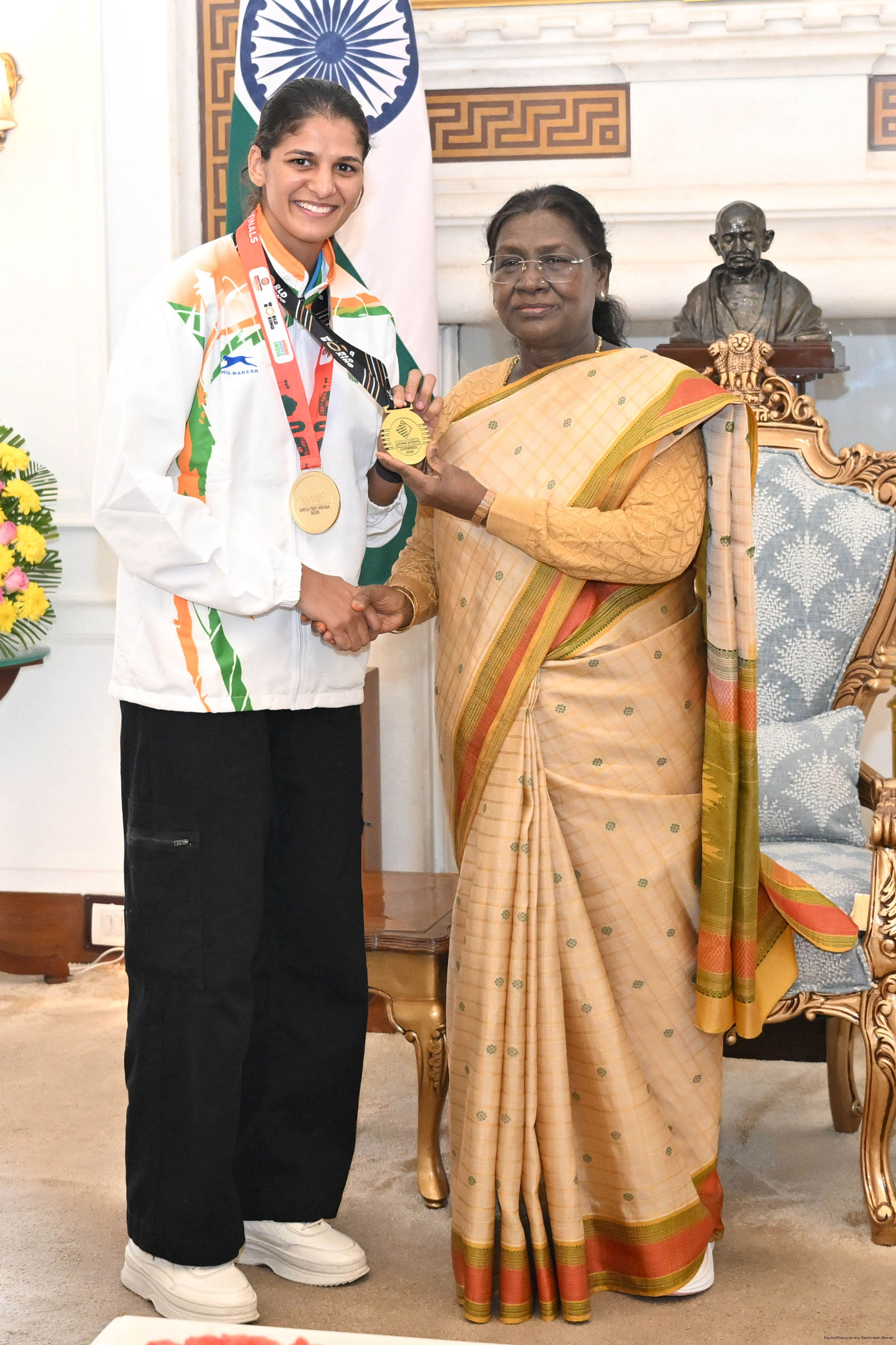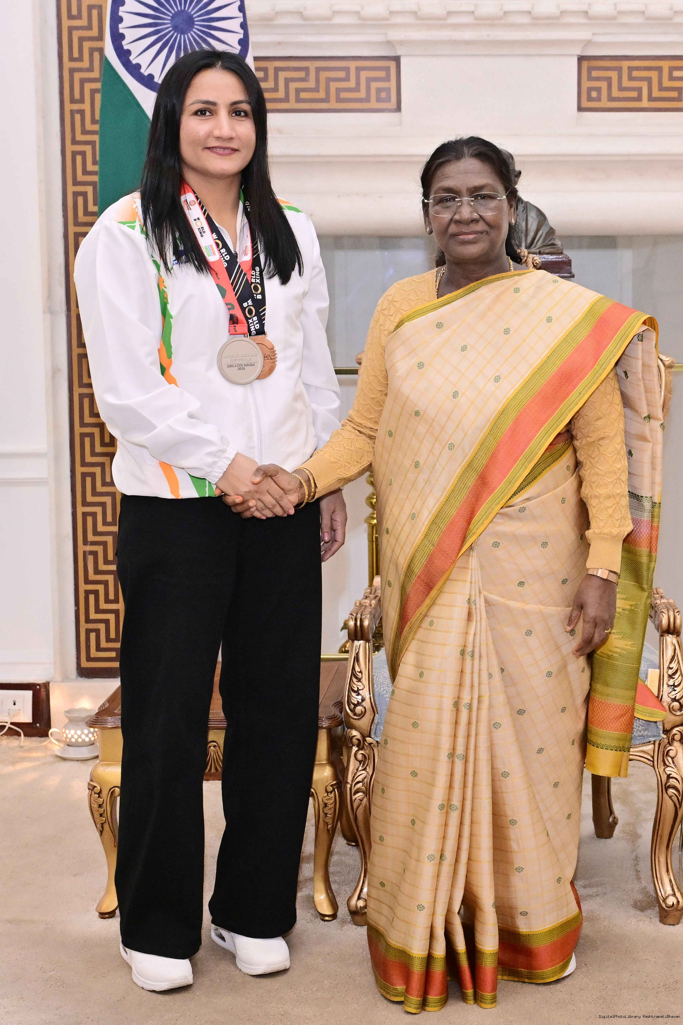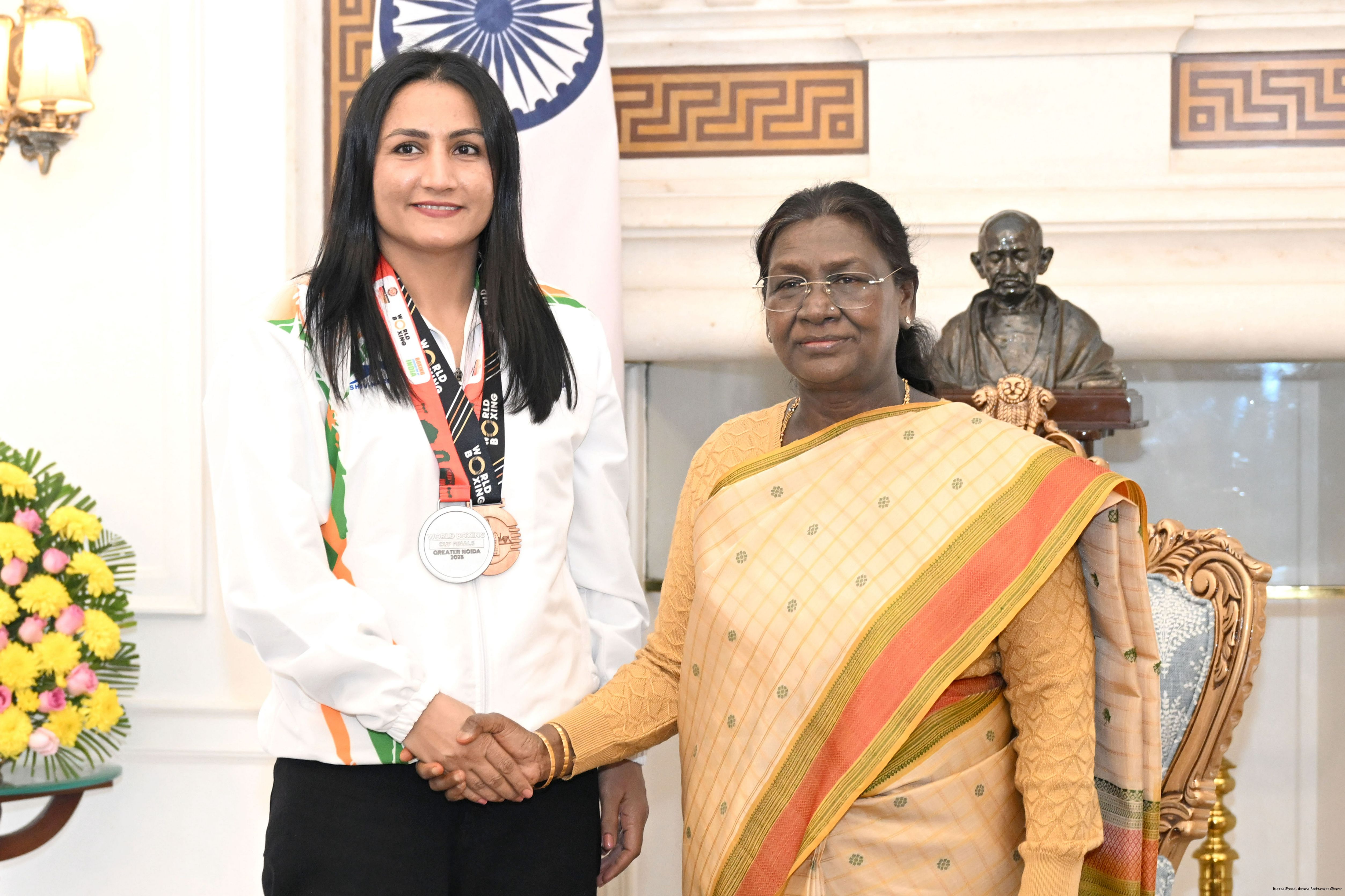 | Caption: | Indian women boxers who brought laurels to the nation at the 2025 World Boxing Championships in Liverpool called on the President Smt. Droupadi Murmu at Rashtrapati Bhavan on December 10, 2025. |