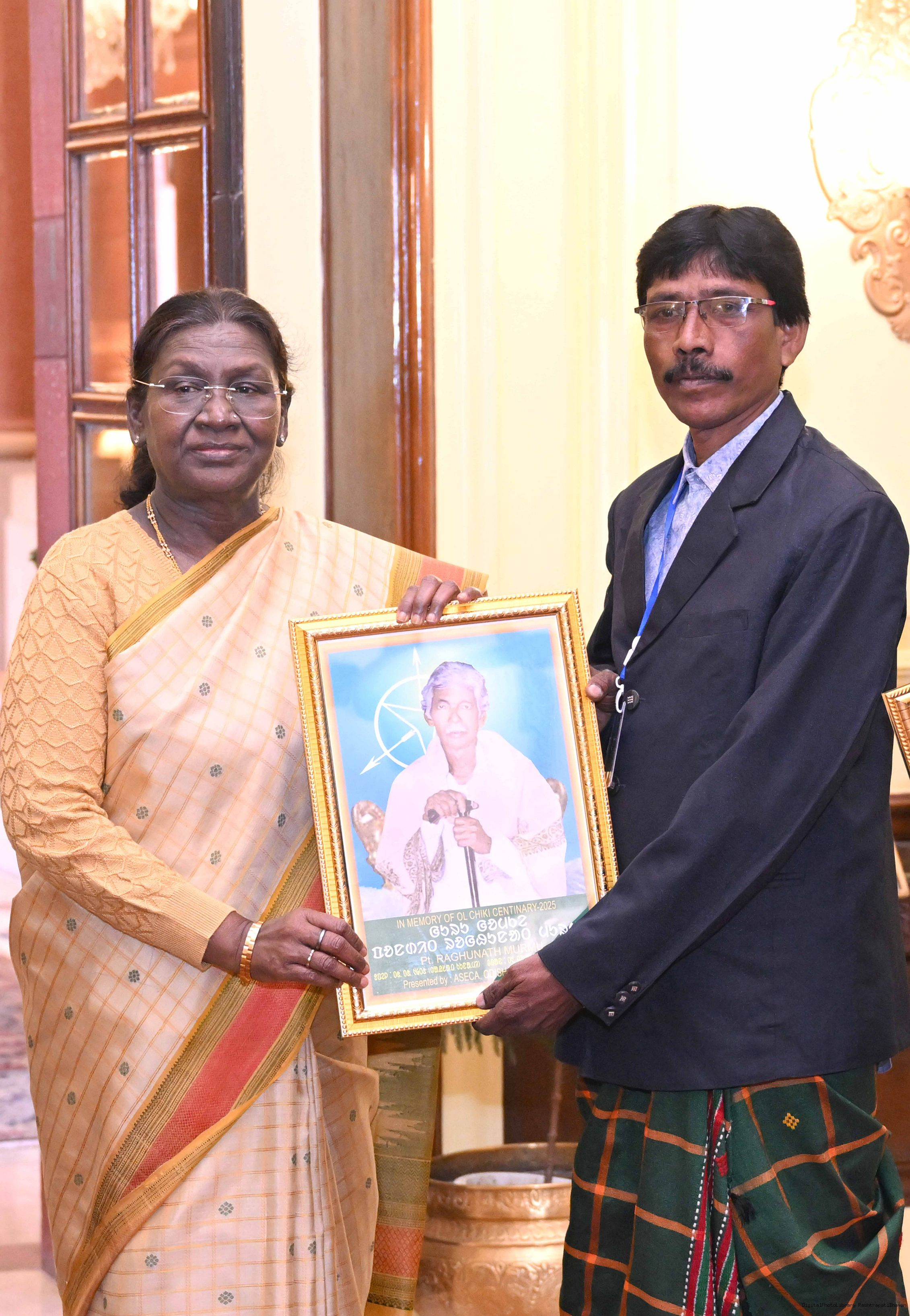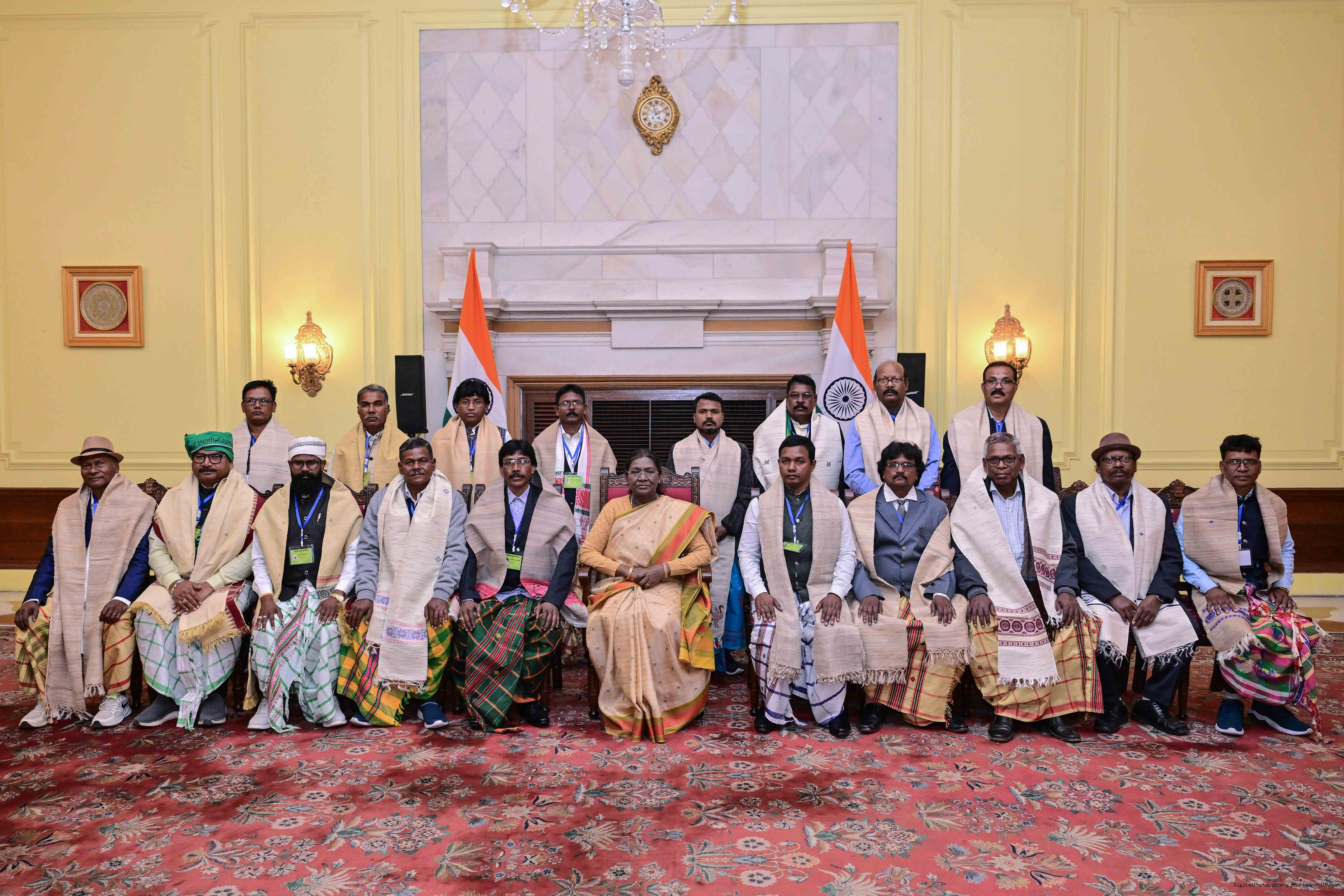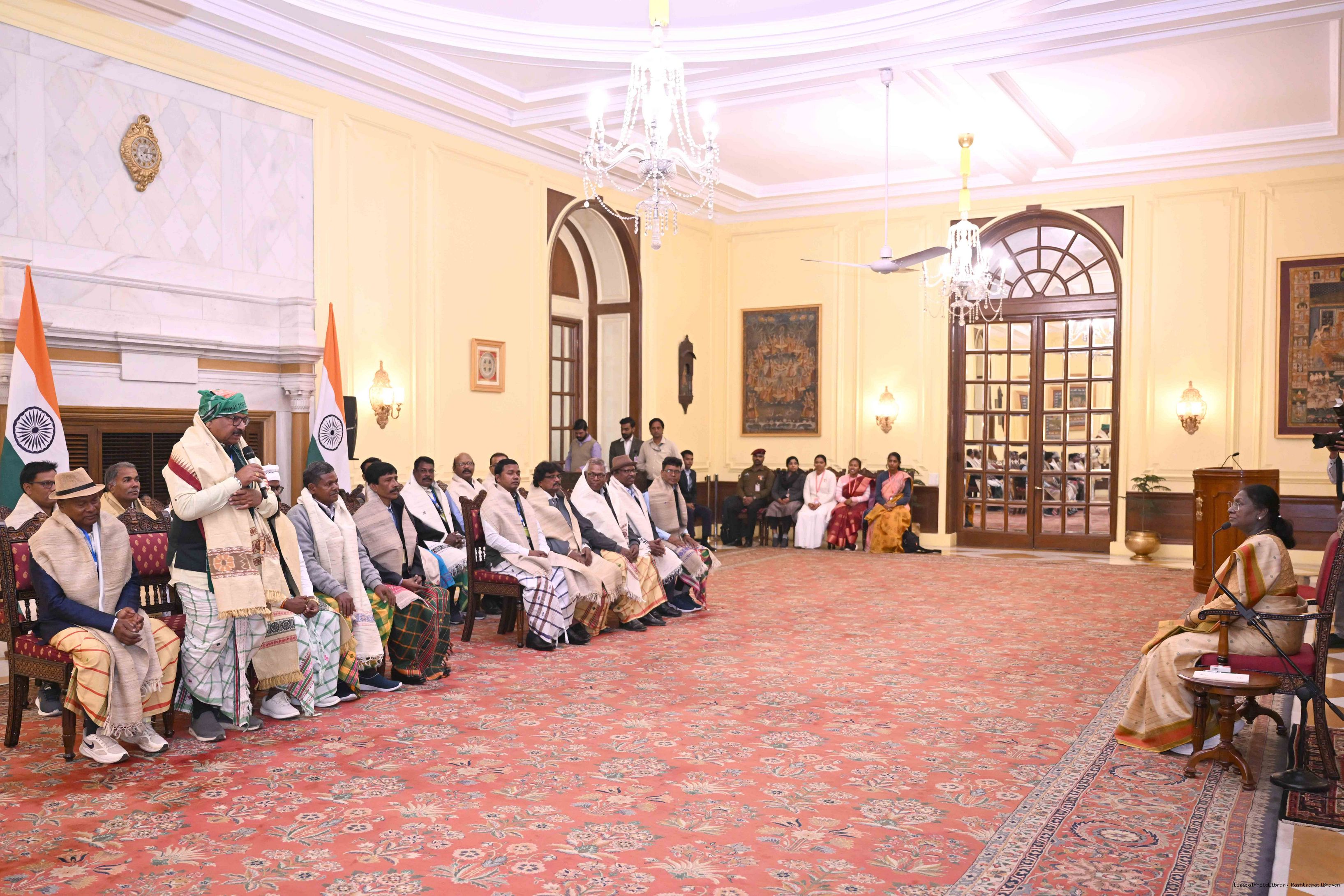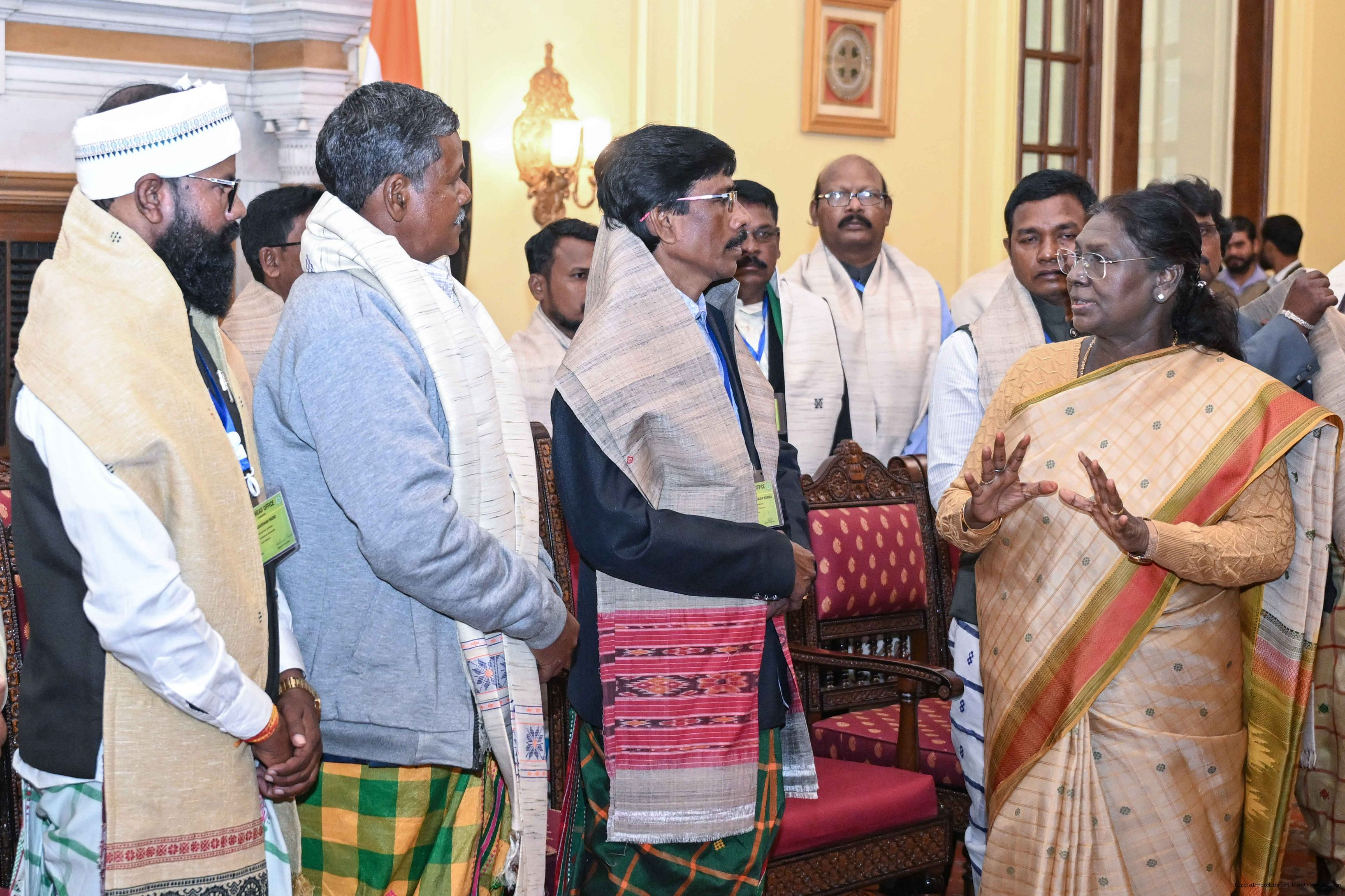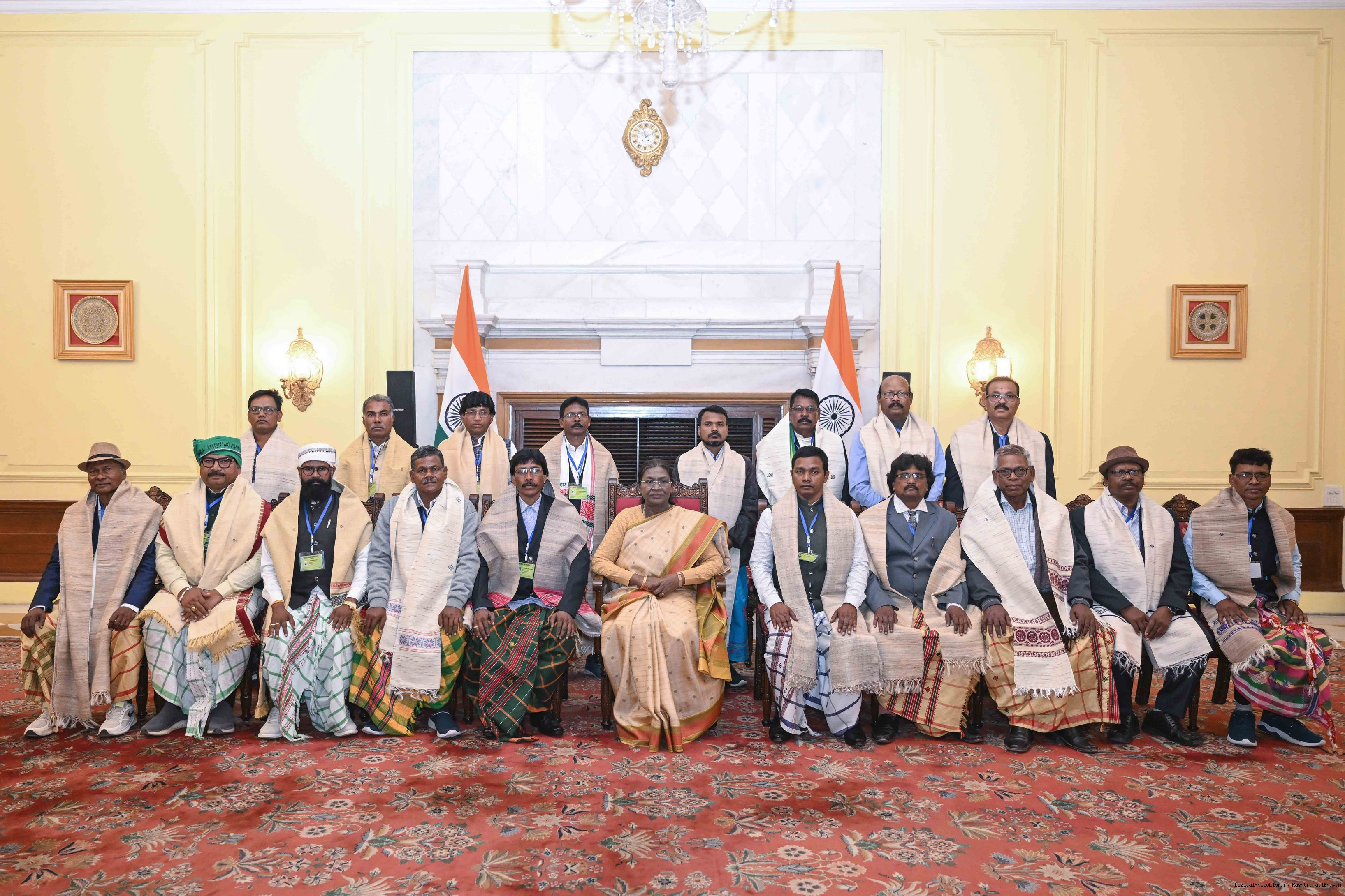 | Caption: | Shri Manoranjan Murmu, President, ASECA, Rairangpur, Odisha along with others meeting with the President of India, Smt. Droupadi Murmu at Rashtrapati Bhavan on December 10, 2025. |