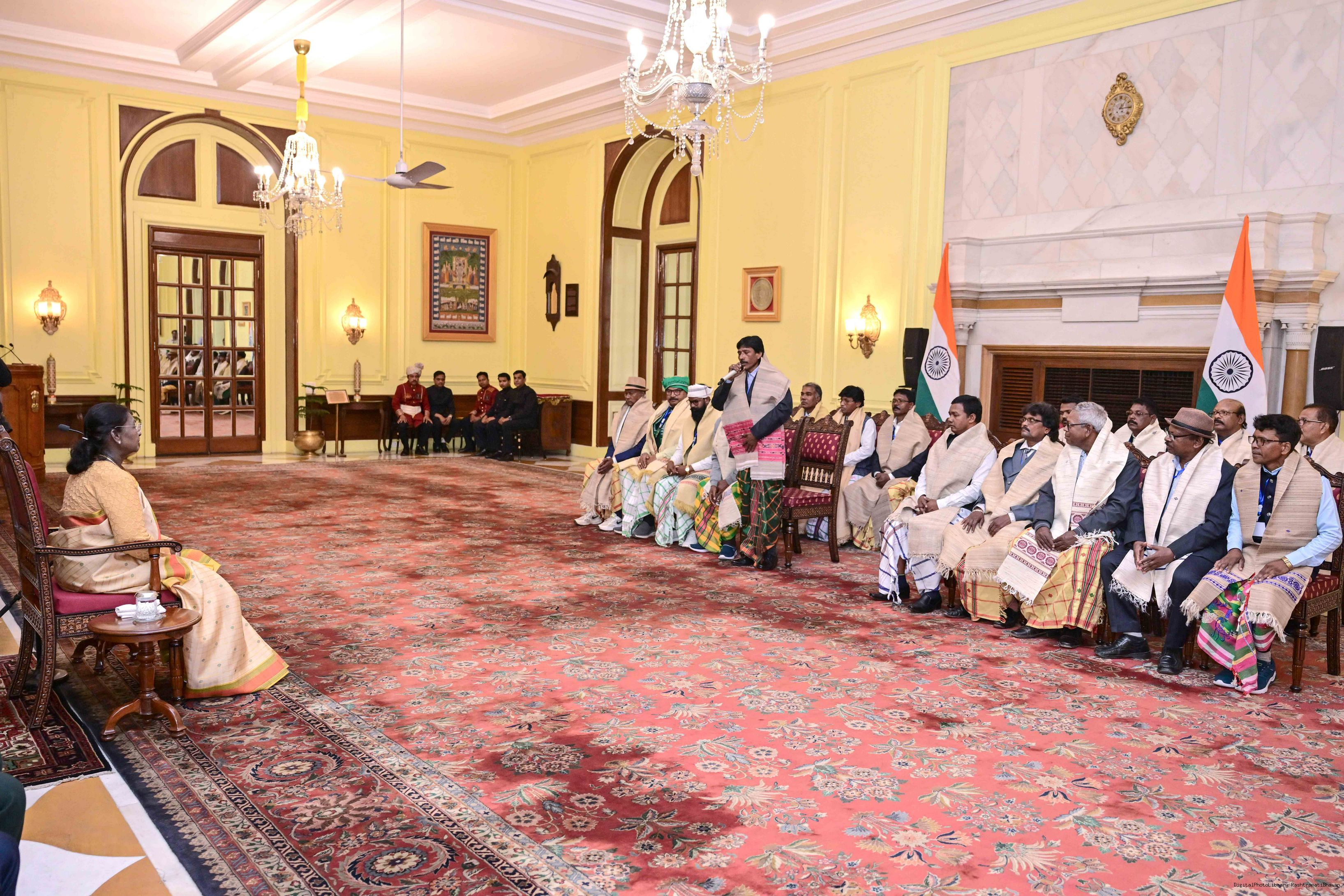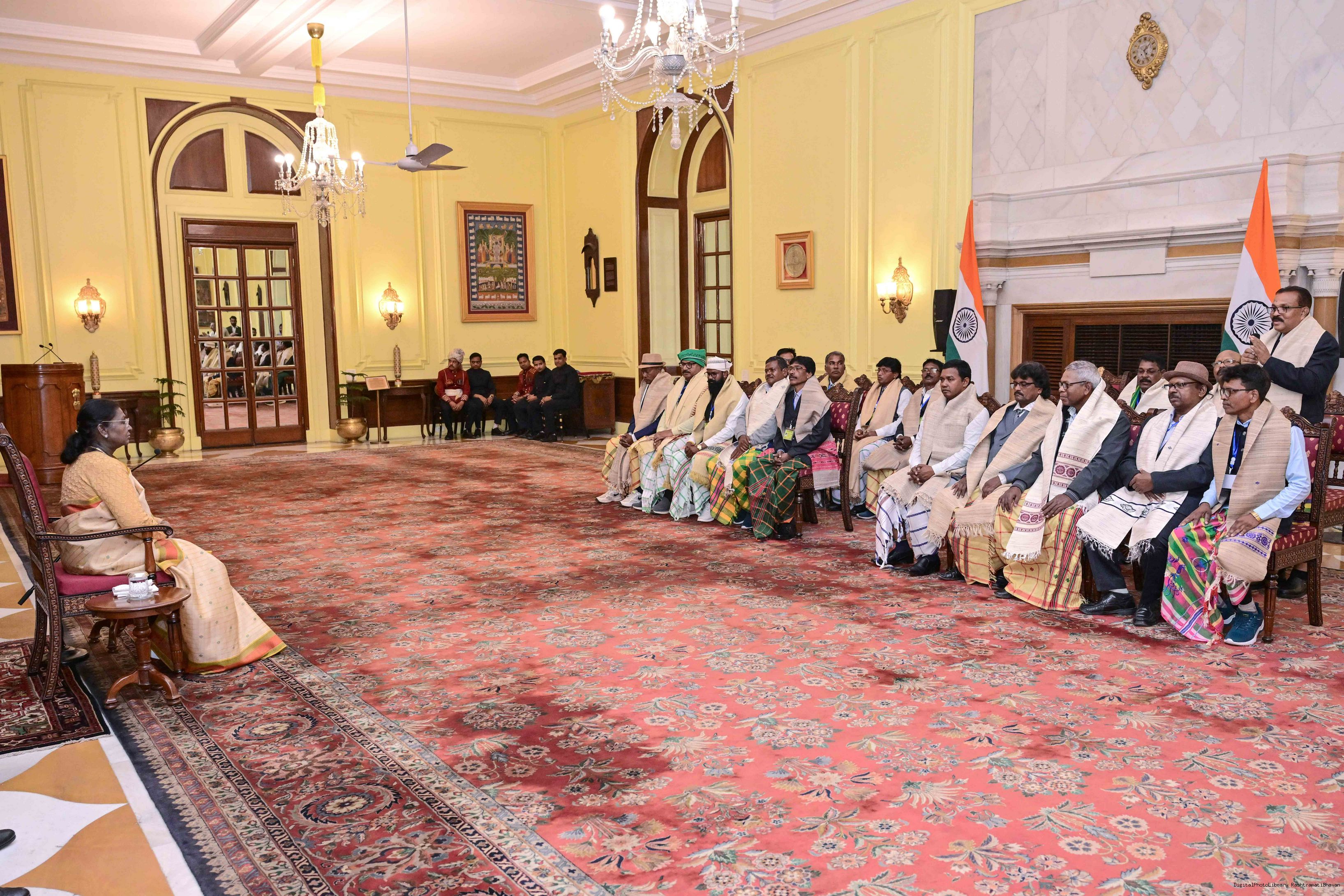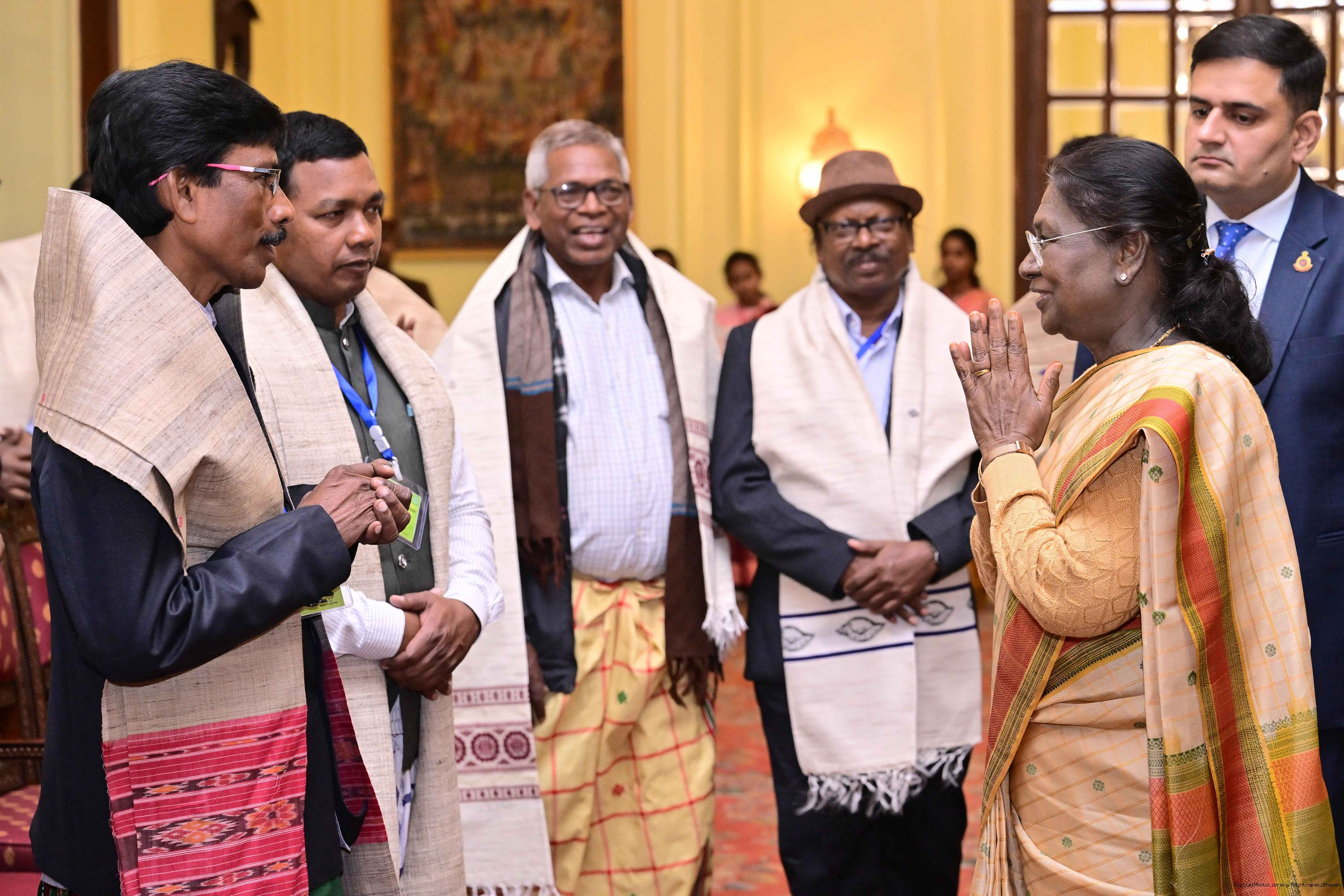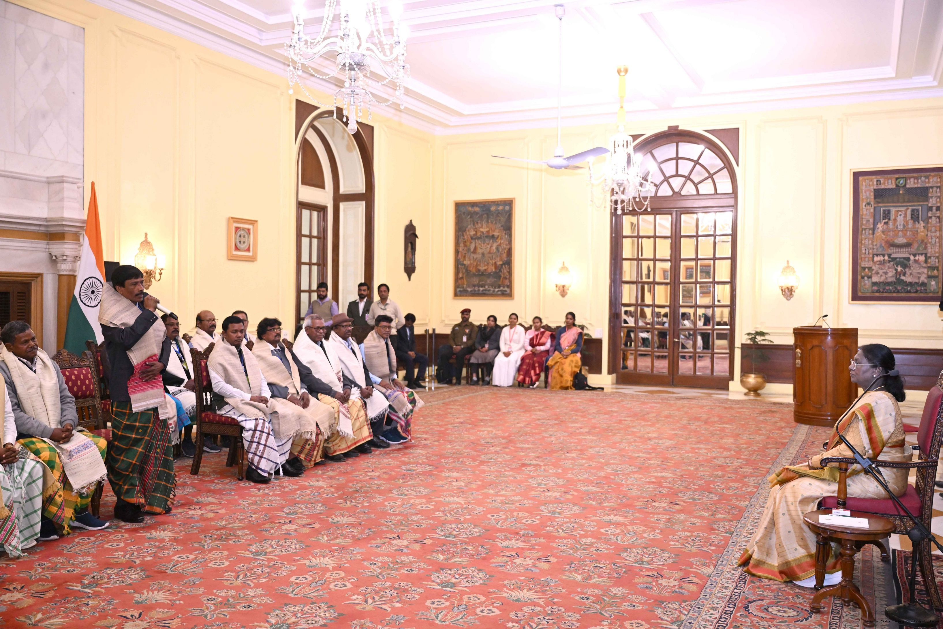 | Caption: | Shri Manoranjan Murmu, President, ASECA, Rairangpur, Odisha along with others meeting with the President of India, Smt. Droupadi Murmu at Rashtrapati Bhavan on December 10, 2025. |