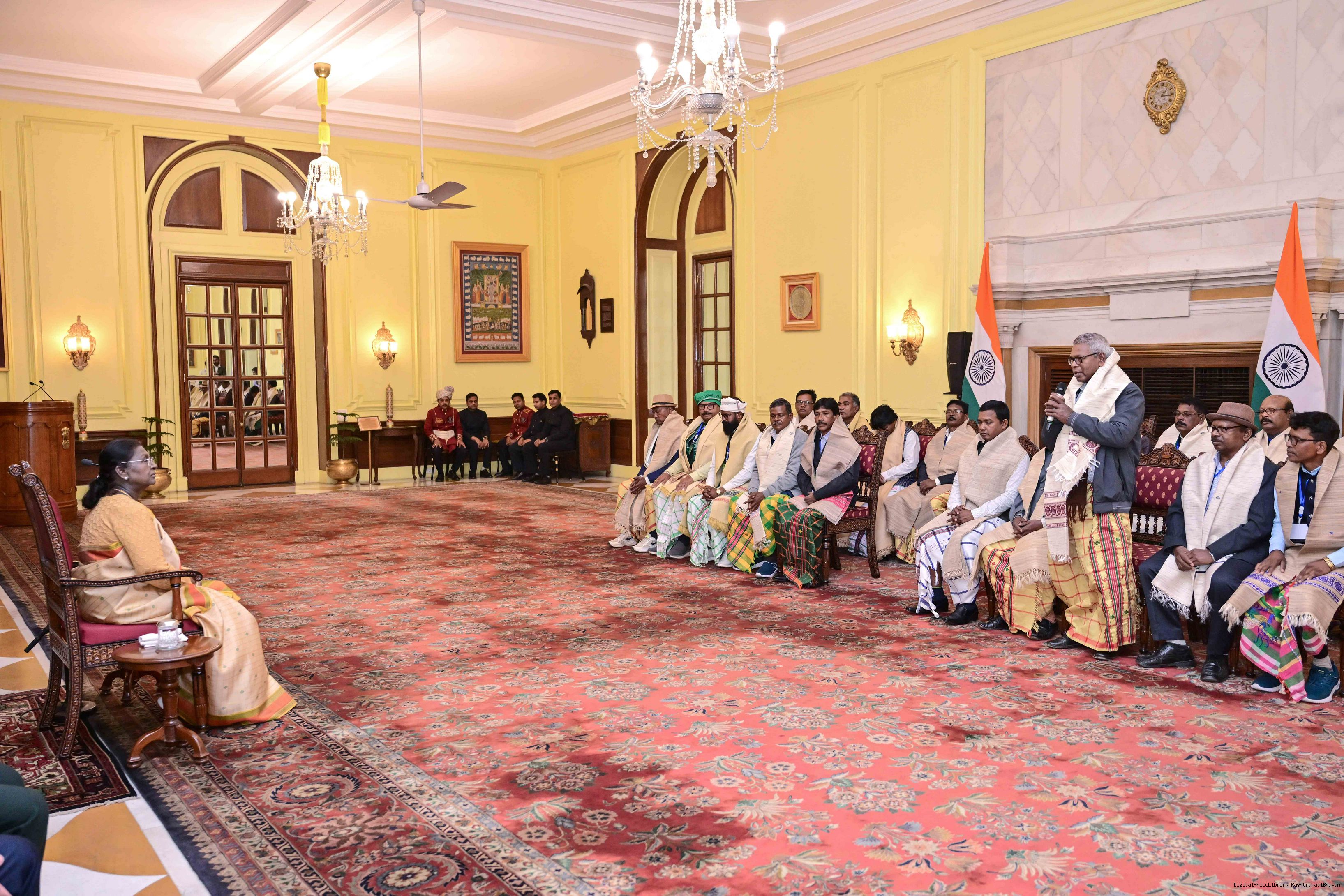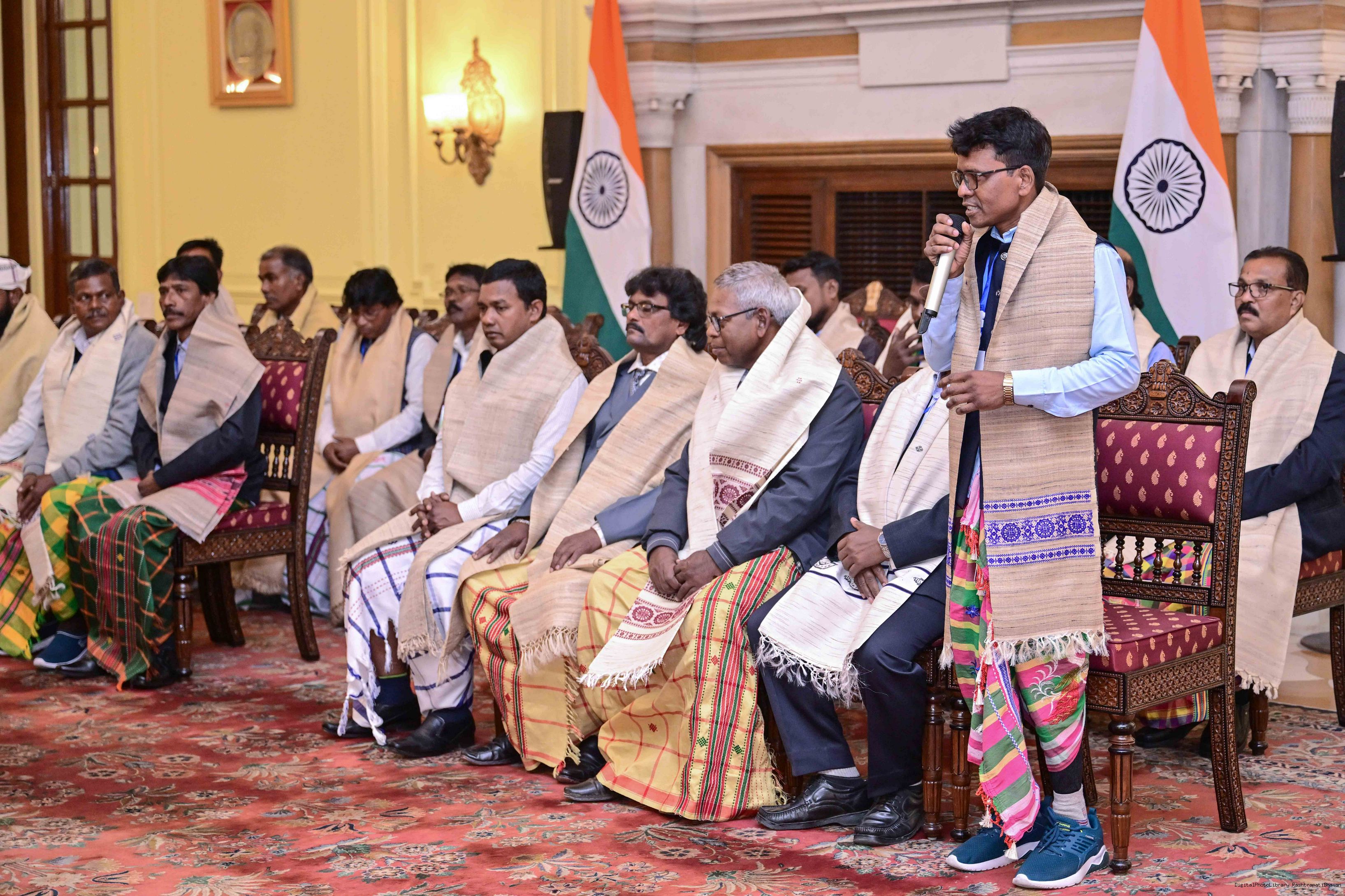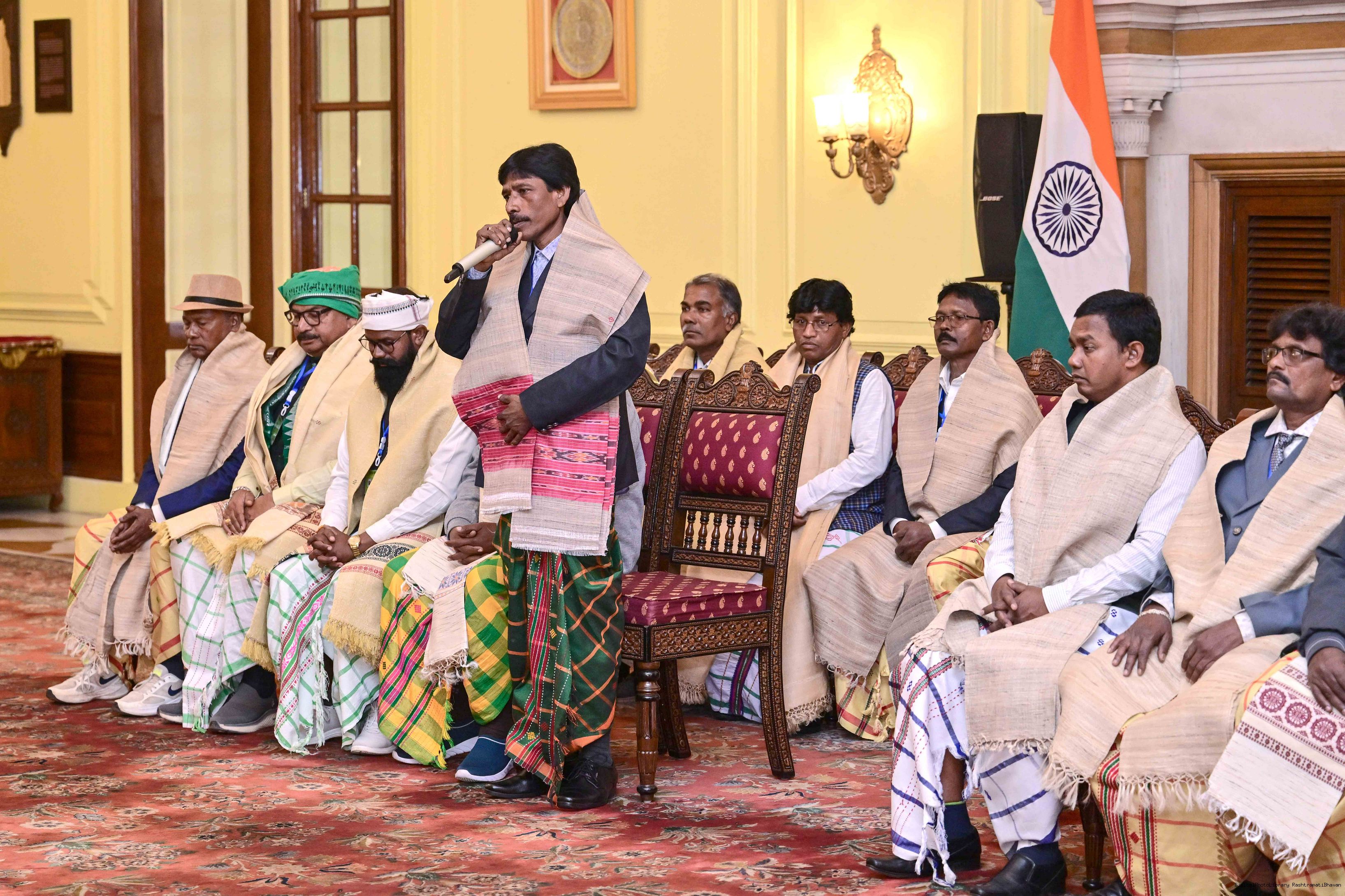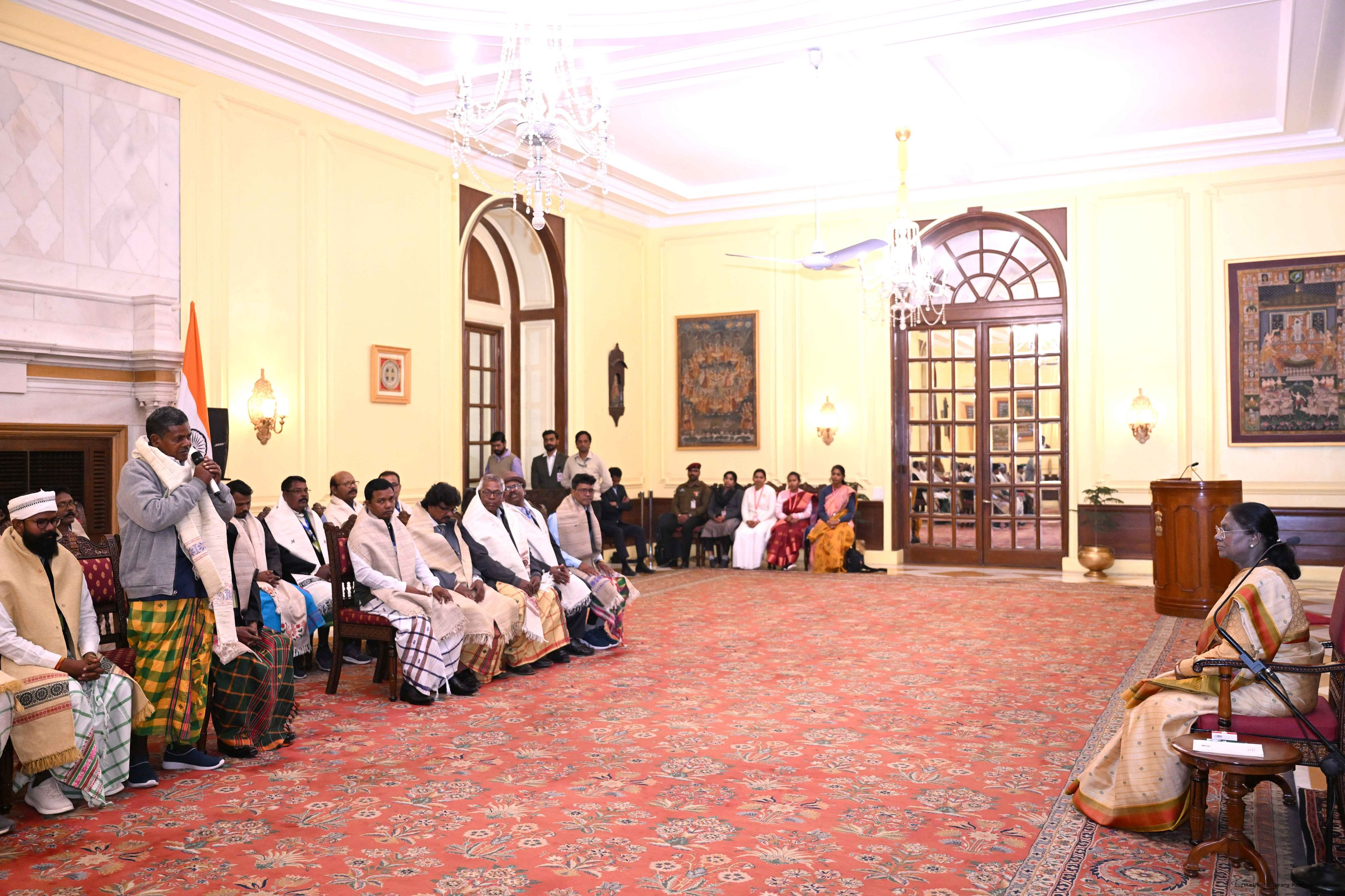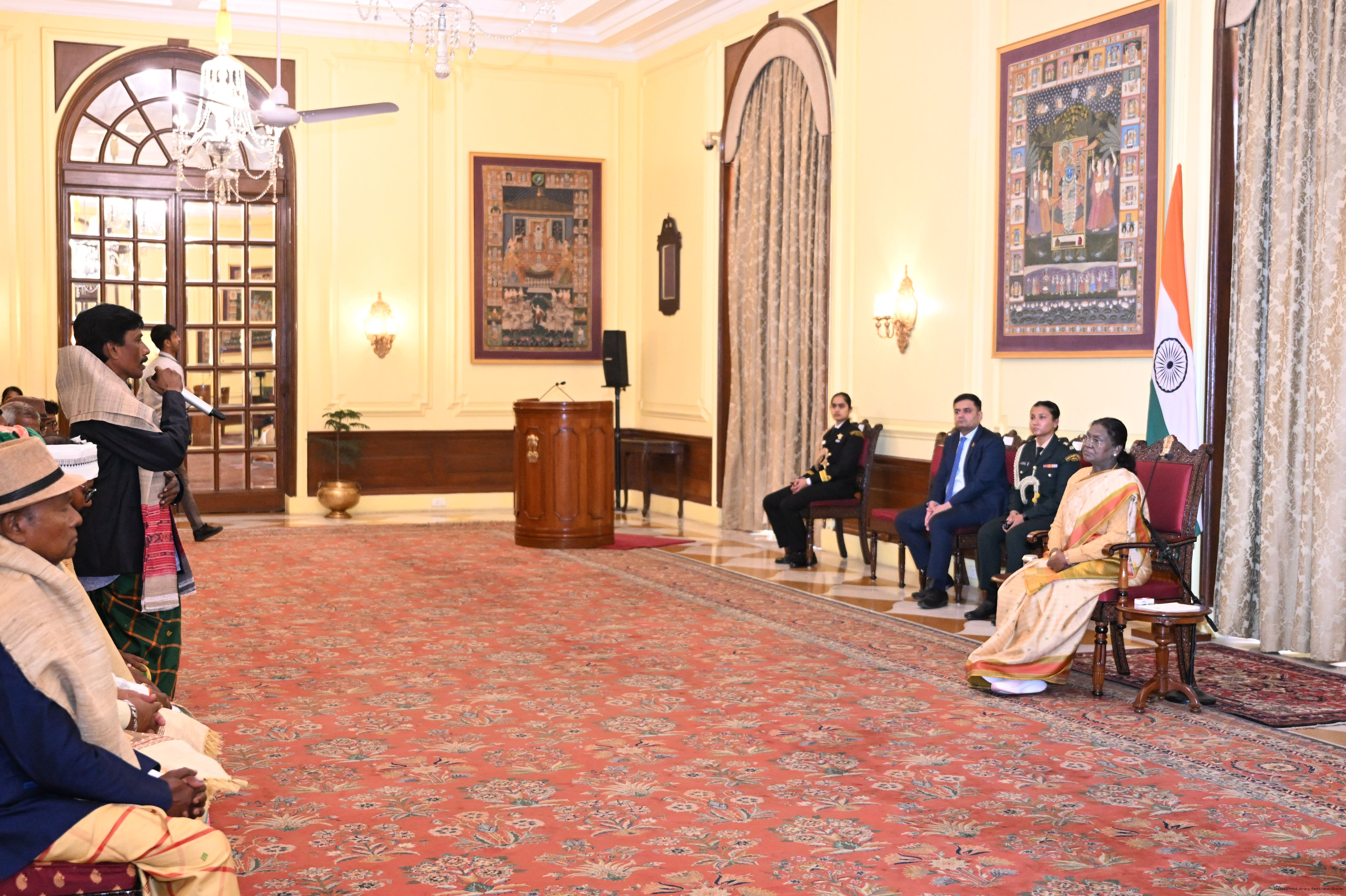 | Caption: | Shri Manoranjan Murmu, President, ASECA, Rairangpur, Odisha along with others meeting with the President of India, Smt. Droupadi Murmu at Rashtrapati Bhavan on December 10, 2025. |