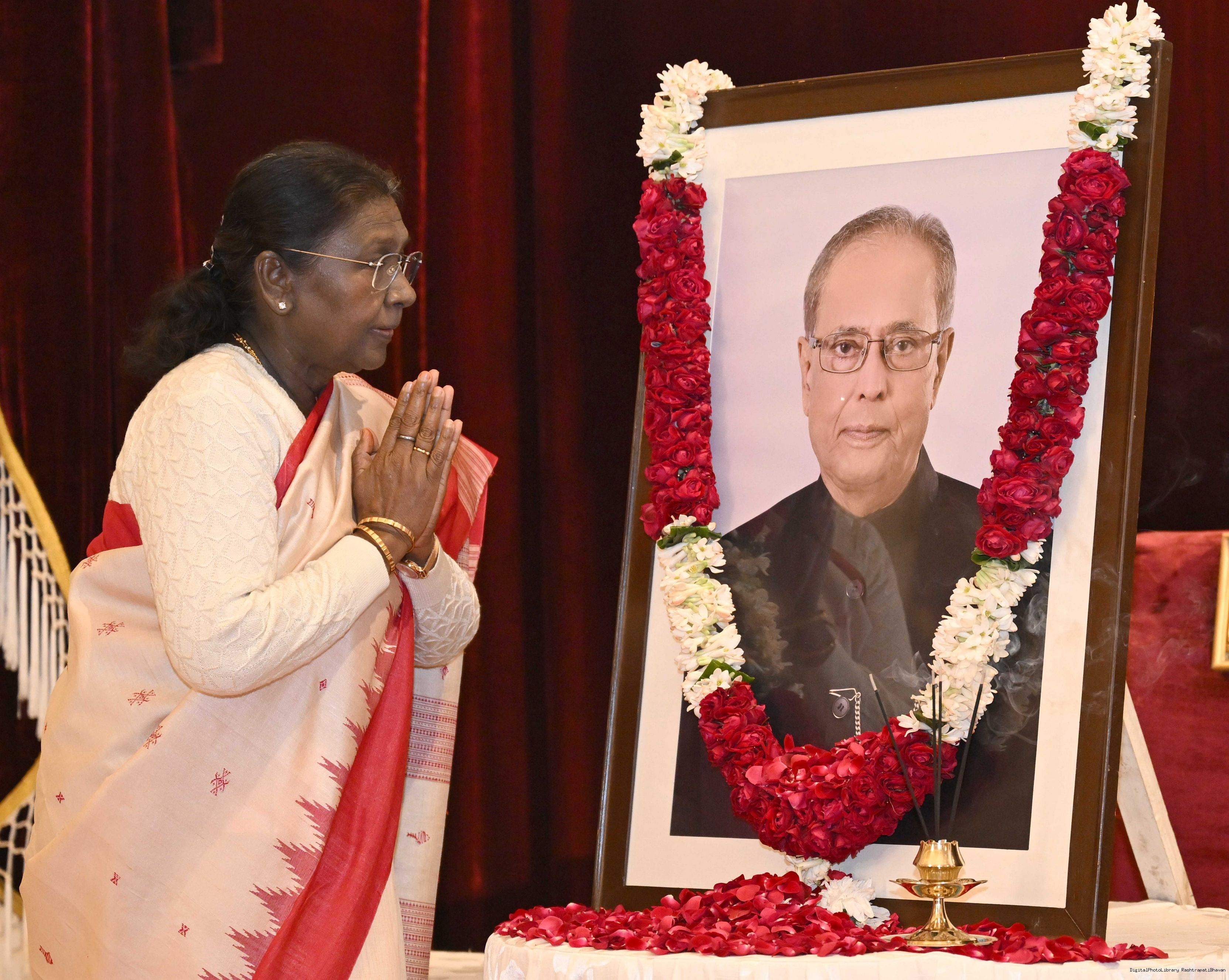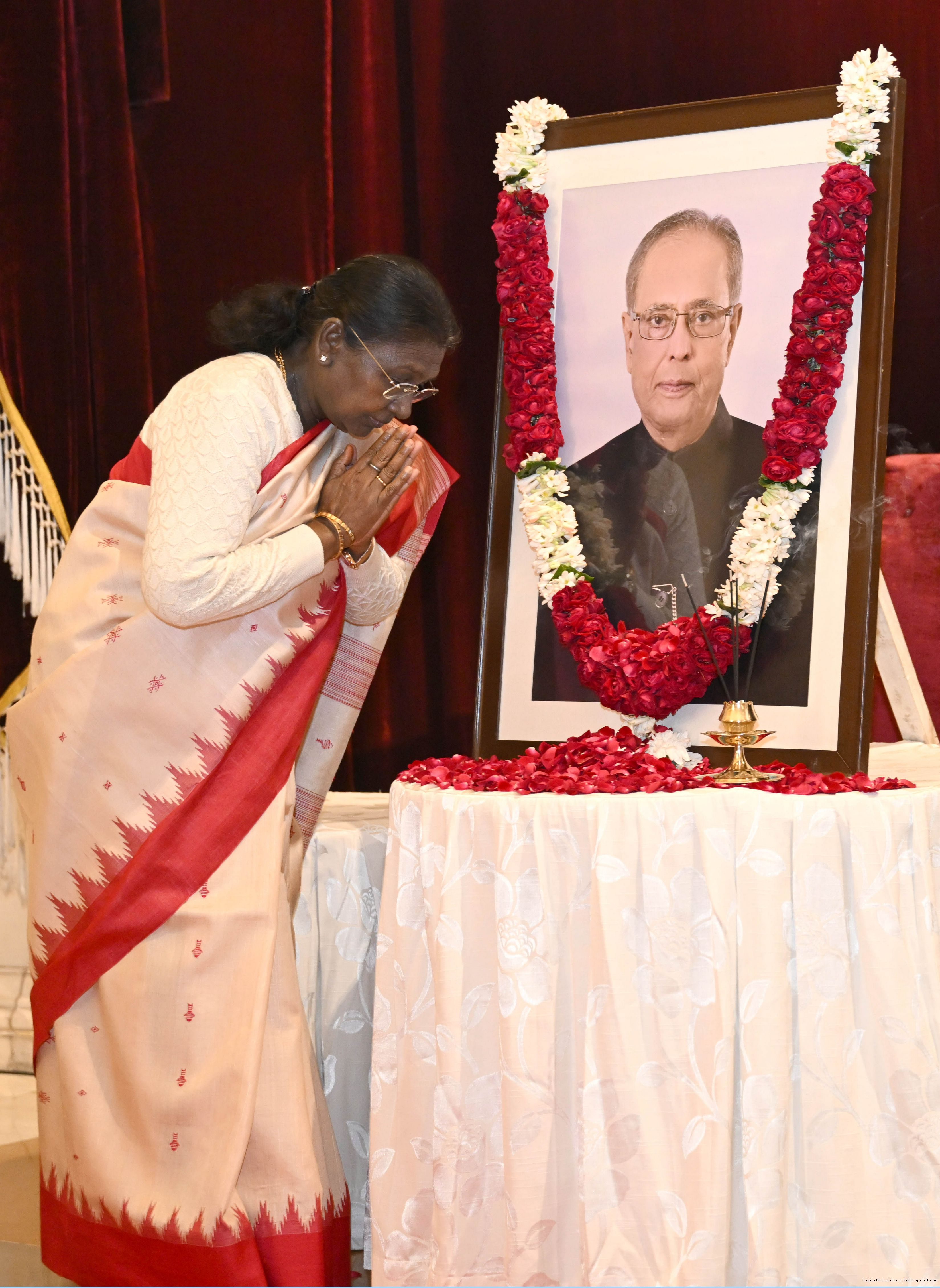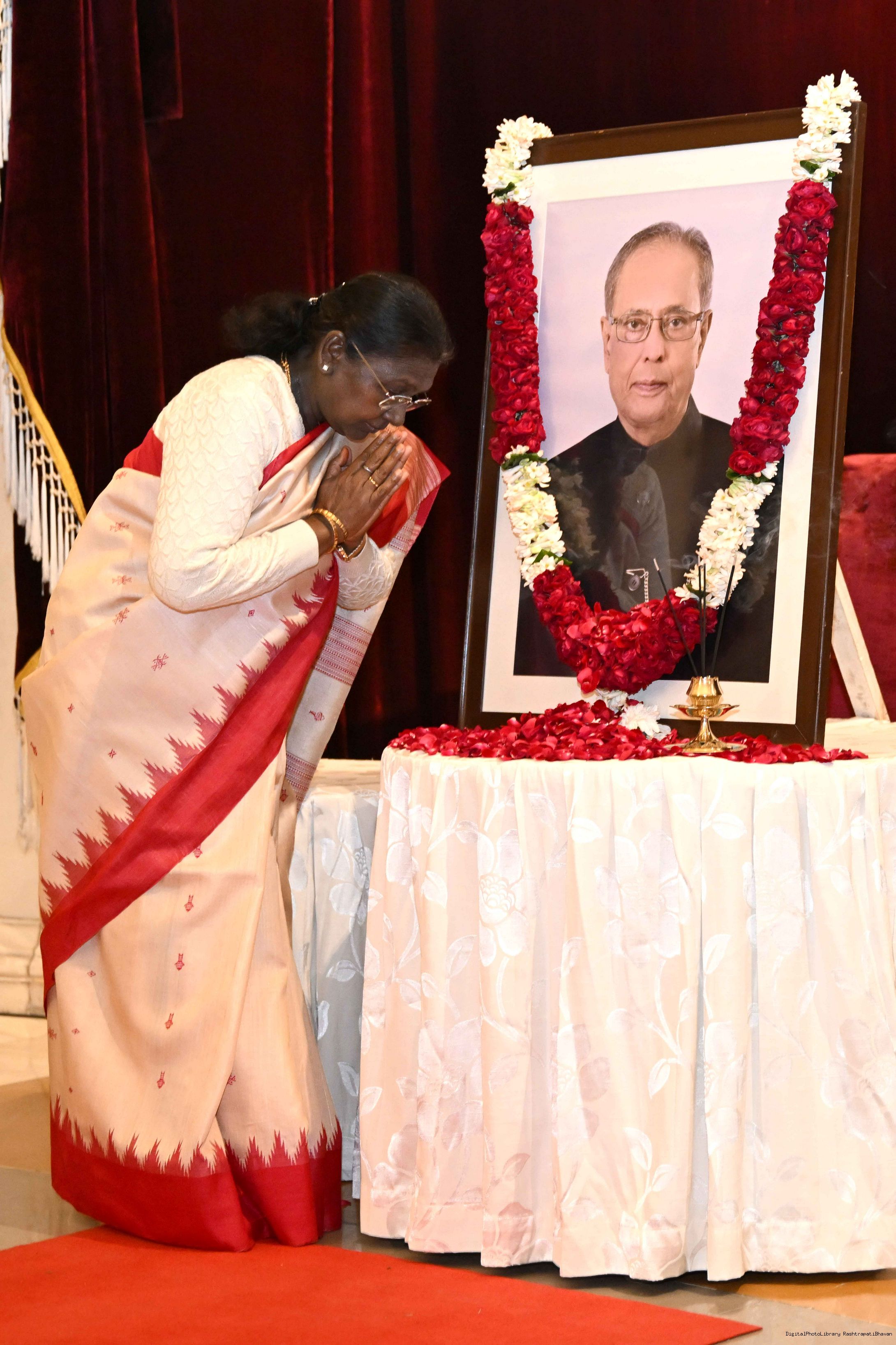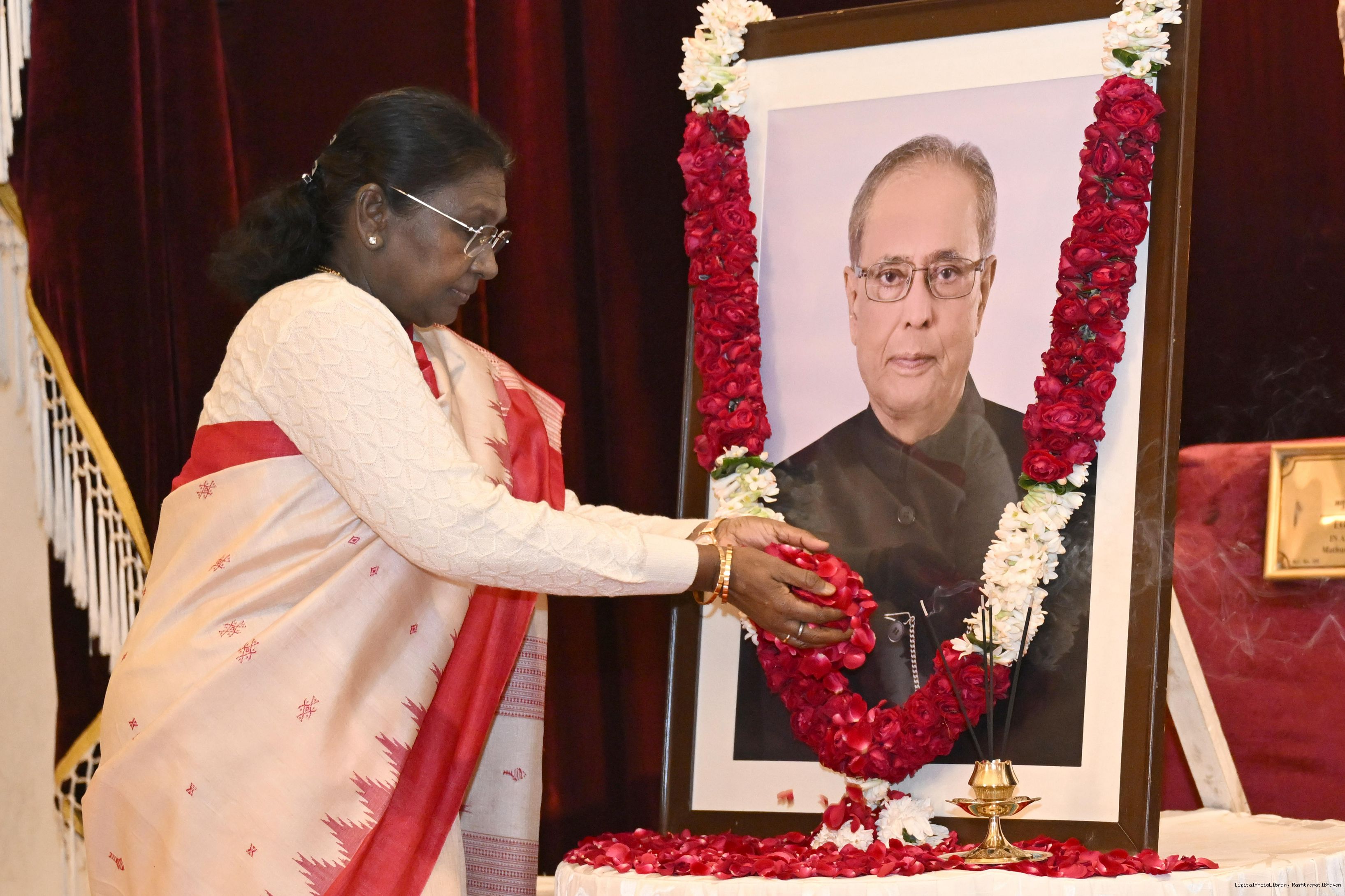 | Caption: | The President of India, Smt. Droupadi Murmu paid floral tributes to Shri Pranab Mukherjee, former President of India on his birth anniversary at Rashtrapati Bhavan on December 11, 2025. |