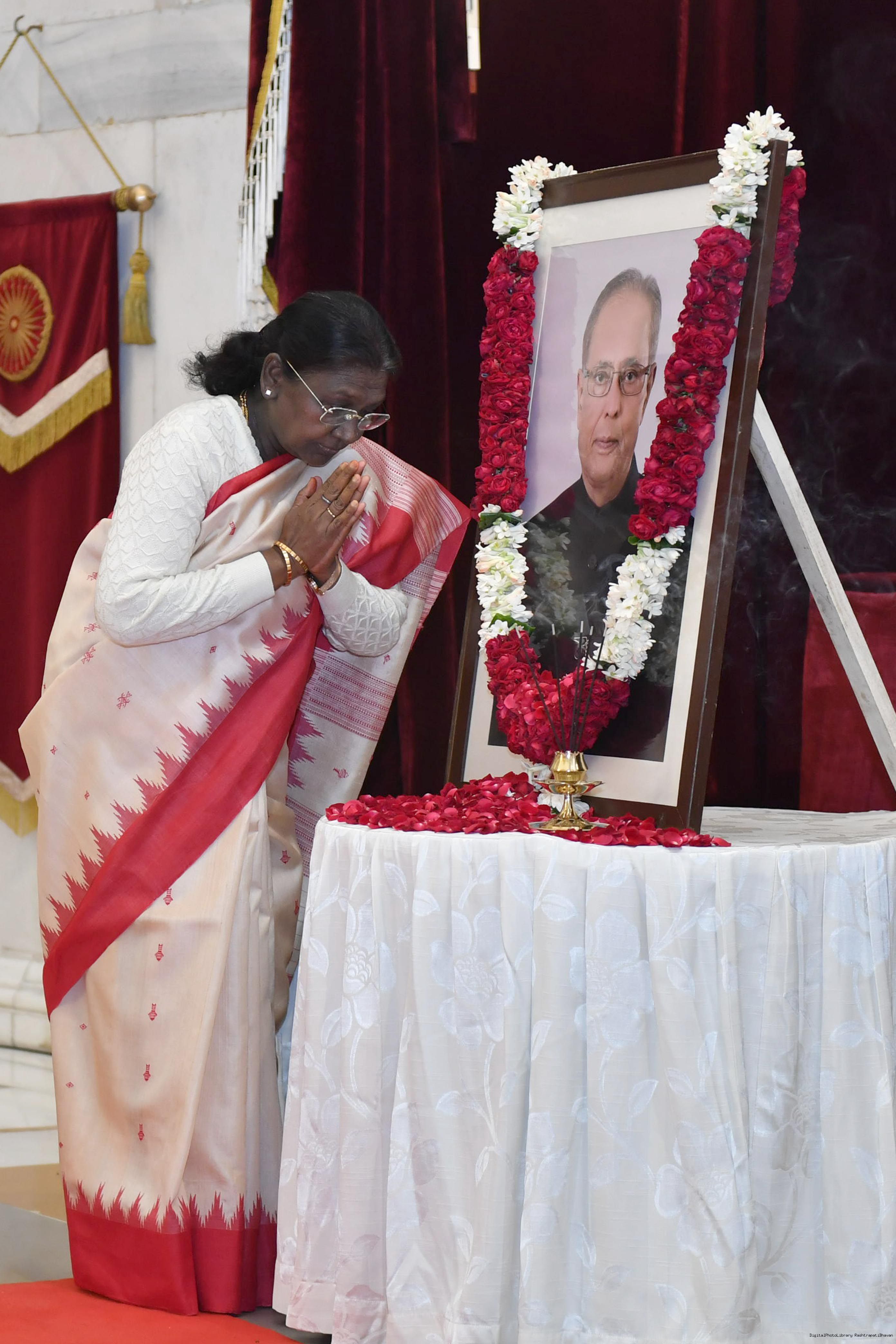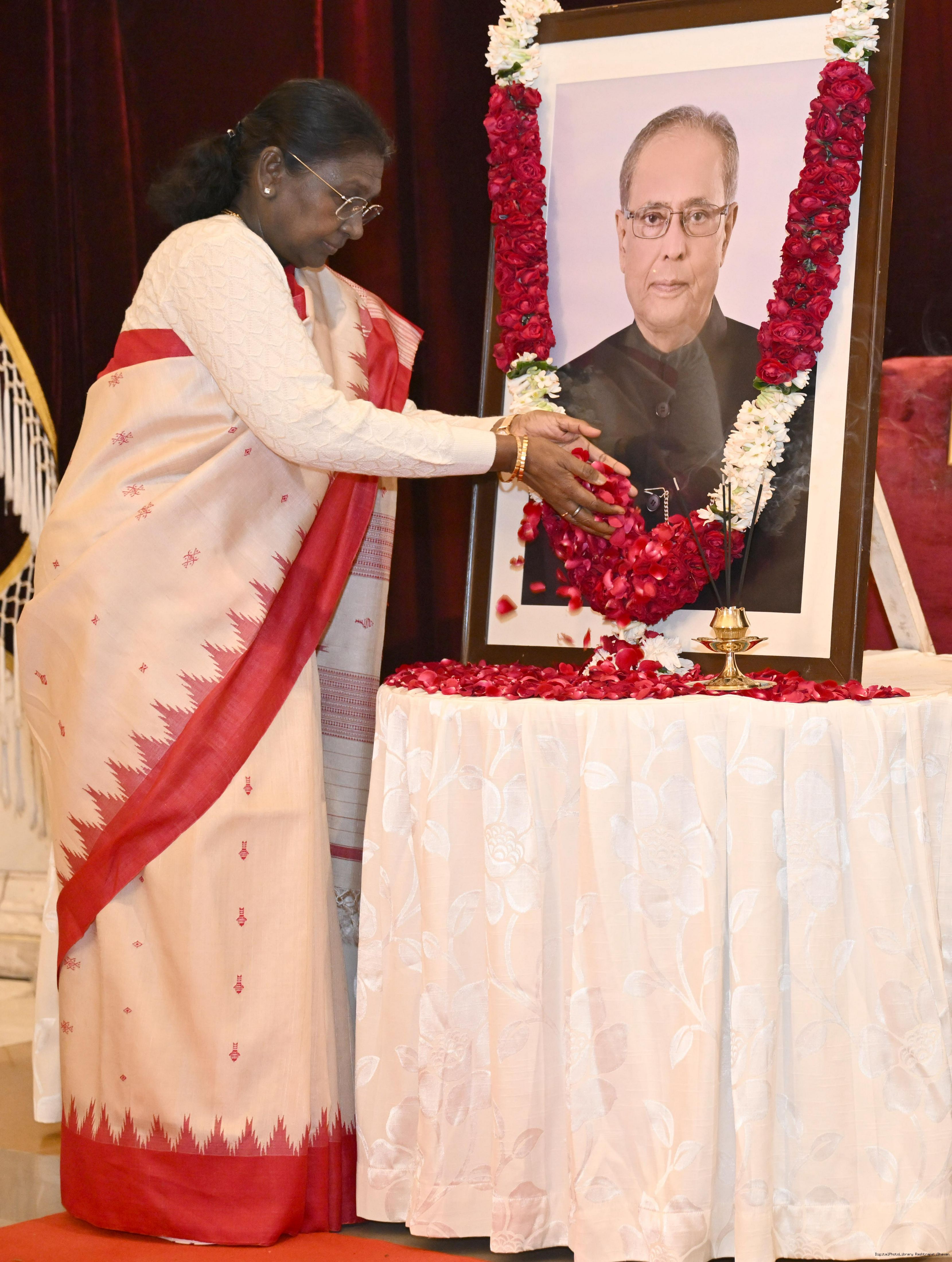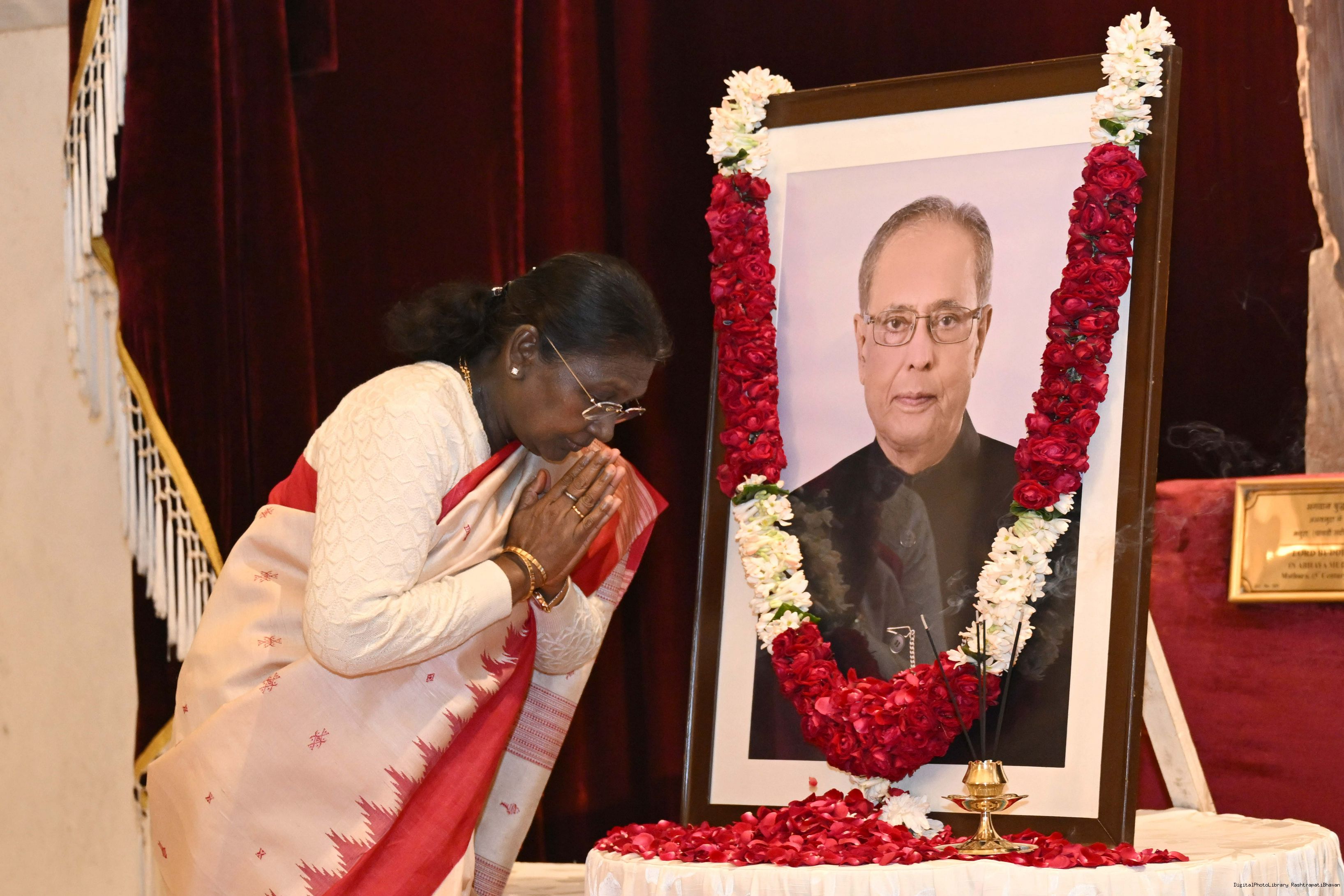 | Caption: | The President of India, Smt. Droupadi Murmu paid floral tributes to Shri Pranab Mukherjee, former President of India on his birth anniversary at Rashtrapati Bhavan on December 11, 2025. |