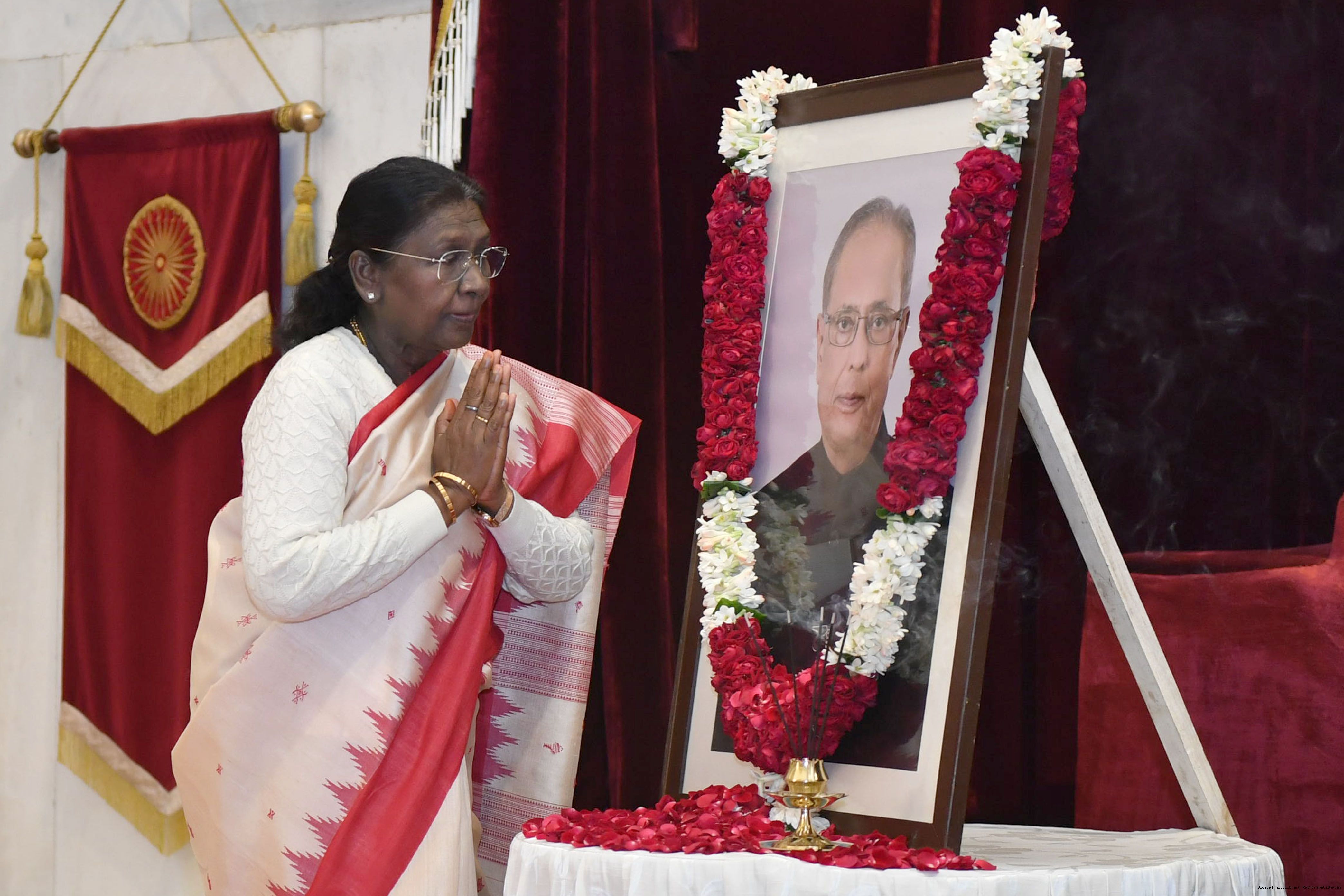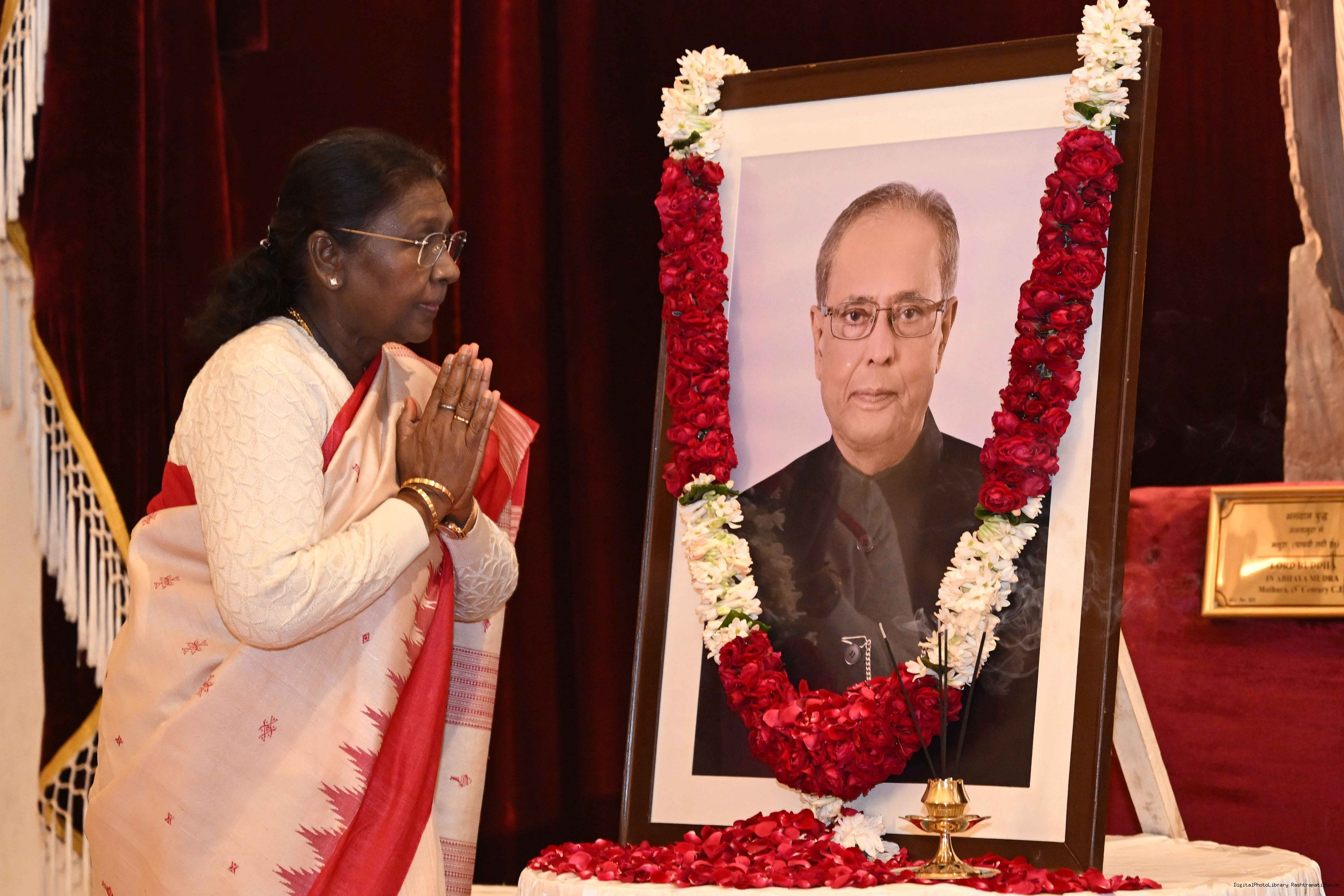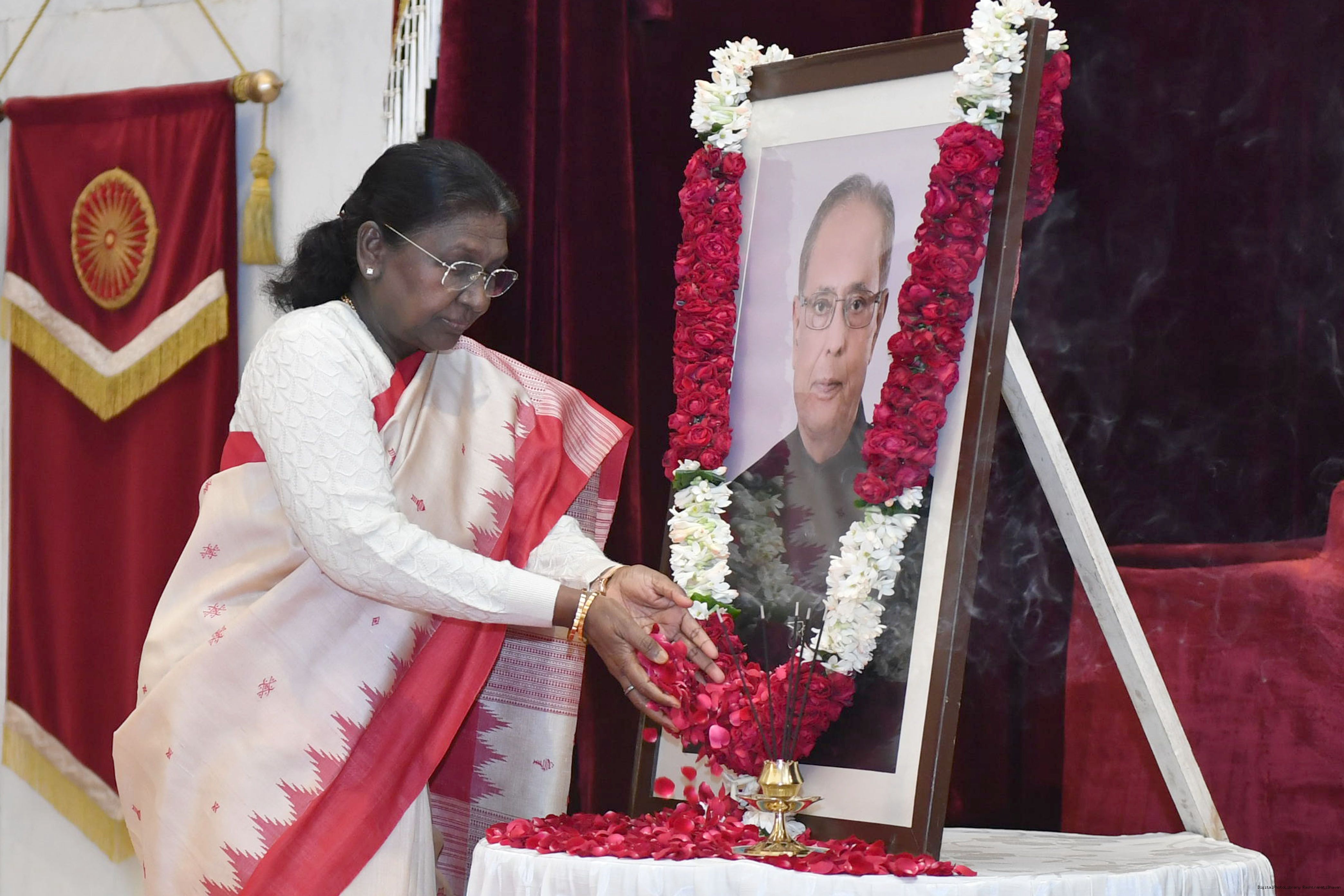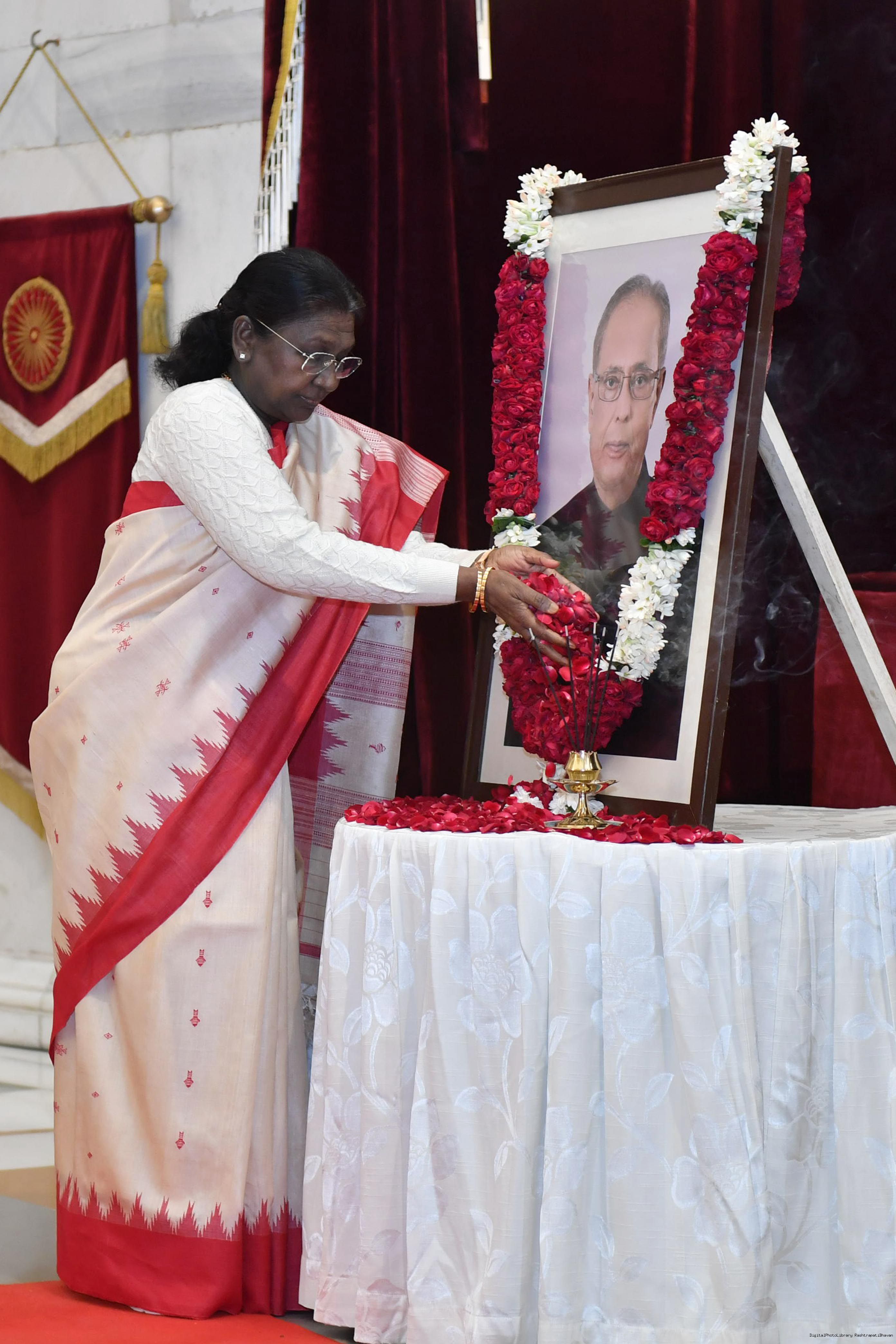 | Caption: | The President of India, Smt. Droupadi Murmu paid floral tributes to Shri Pranab Mukherjee, former President of India on his birth anniversary at Rashtrapati Bhavan on December 11, 2025. |