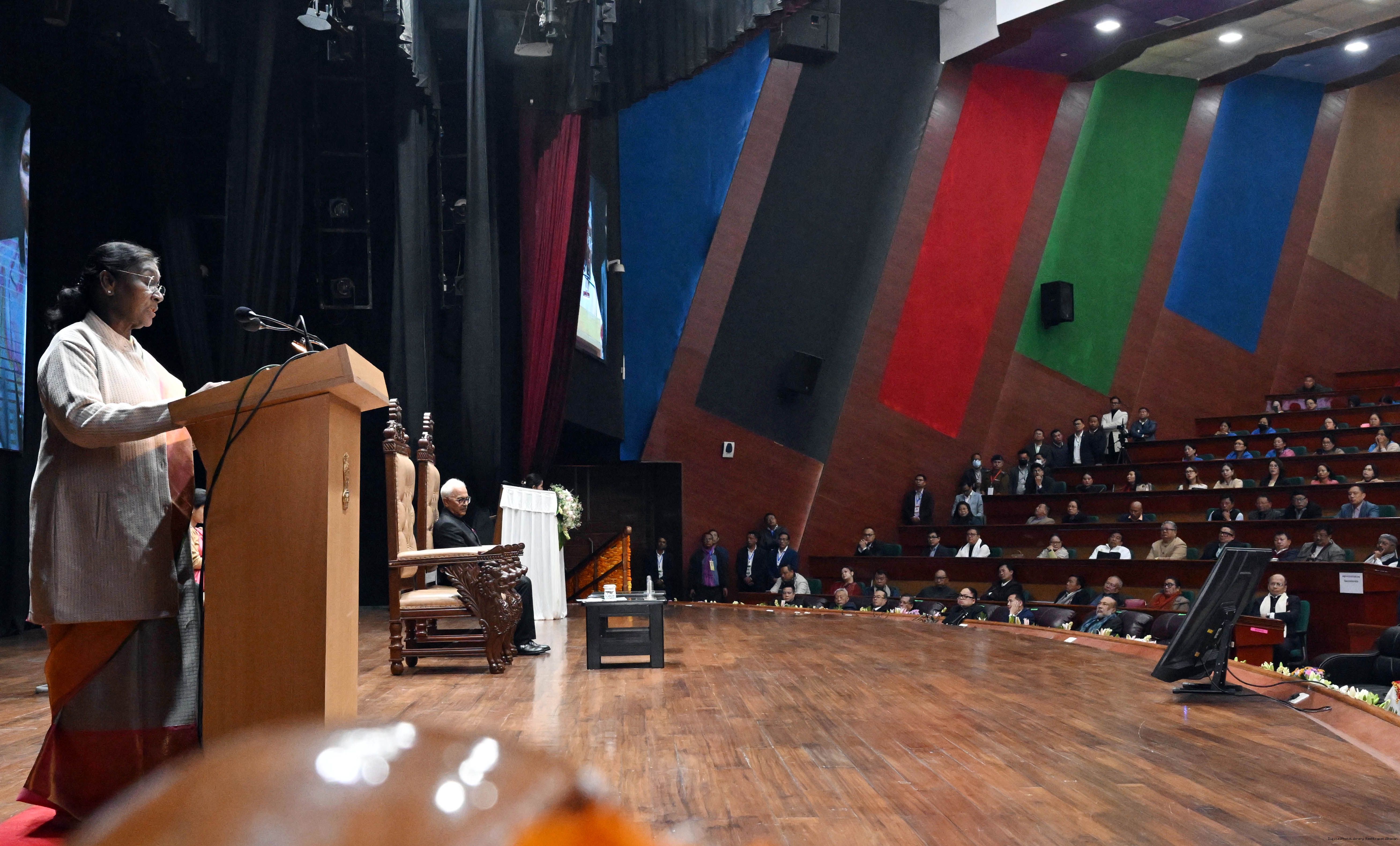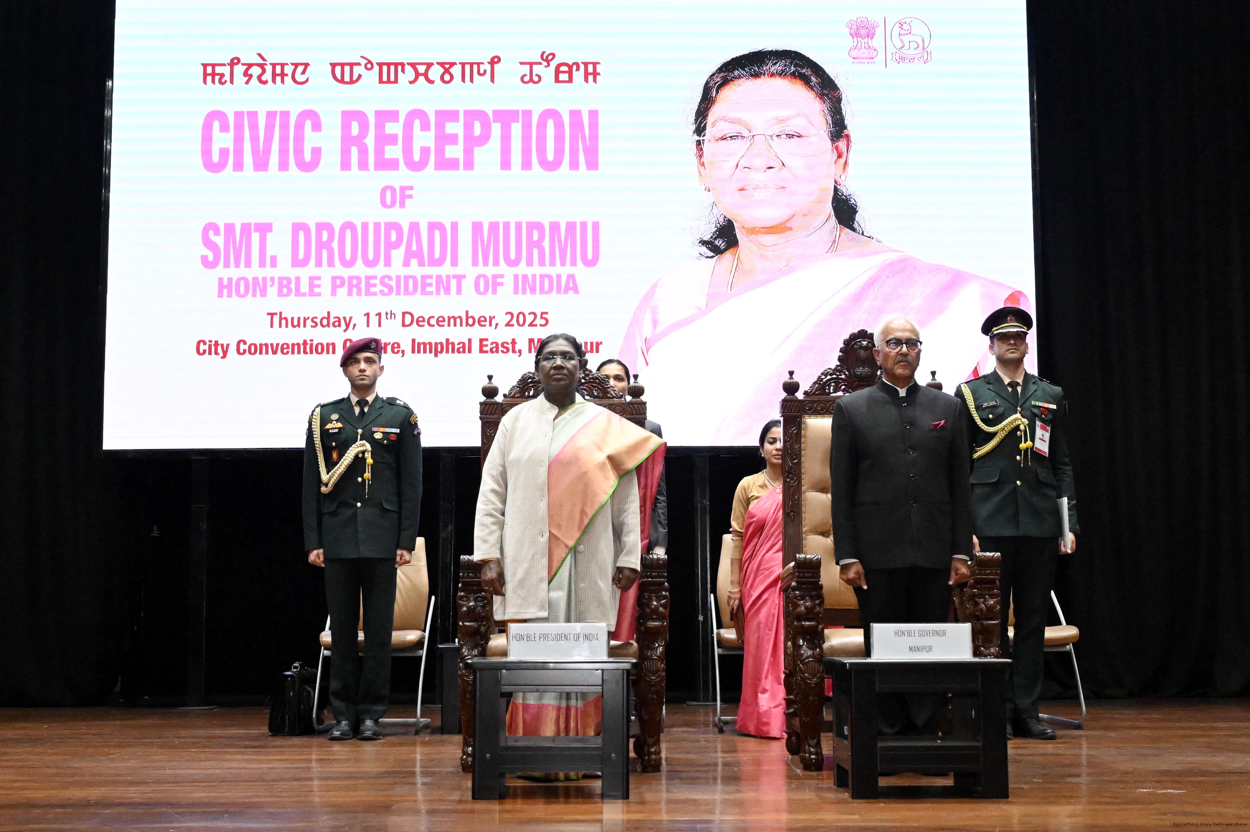 | Caption: | The President of India, Smt Droupadi Murmu, attended civic reception hosted by the government of Manipur in her honour at the City Convention Centre, Imphal on December 11, 2025. |