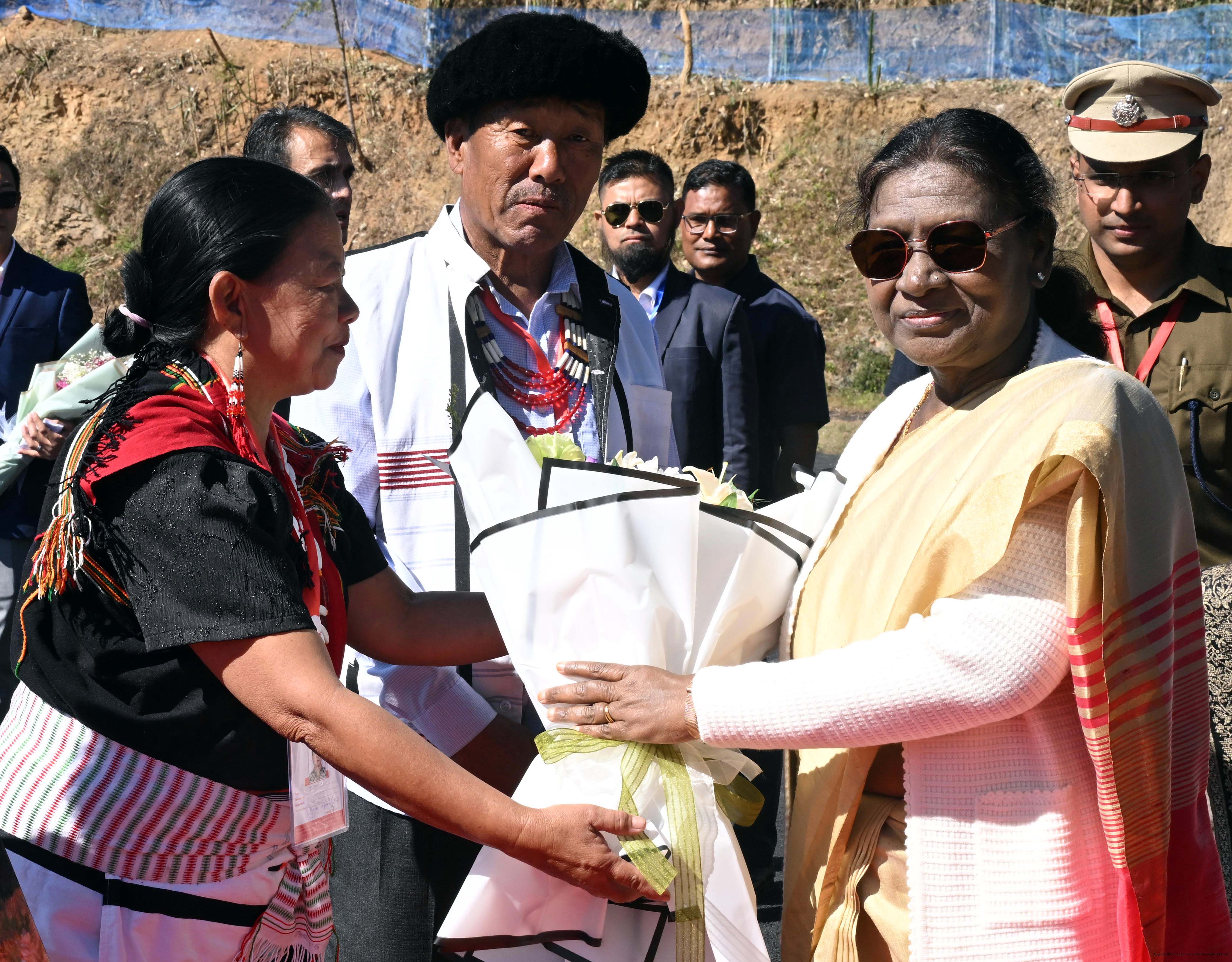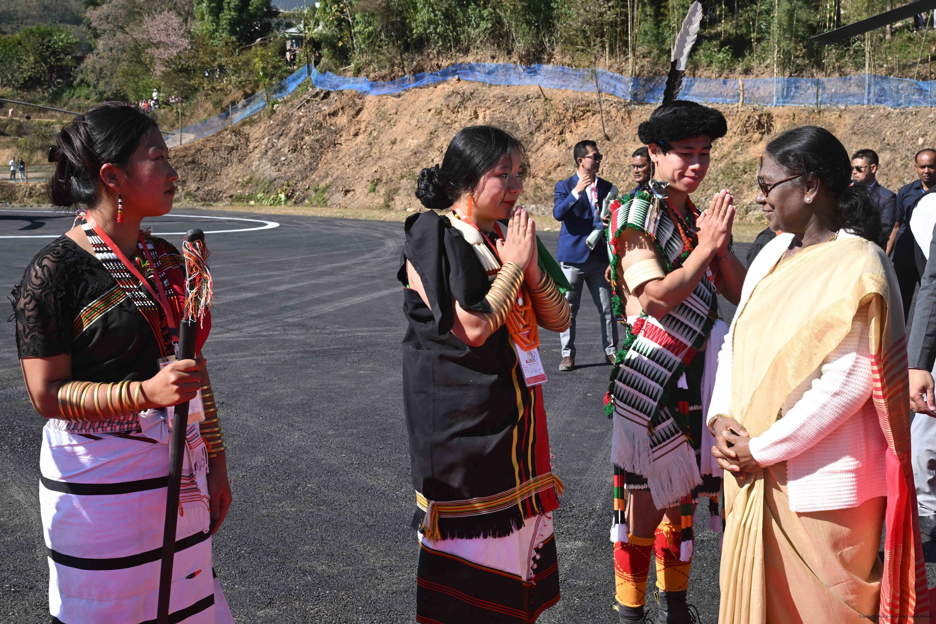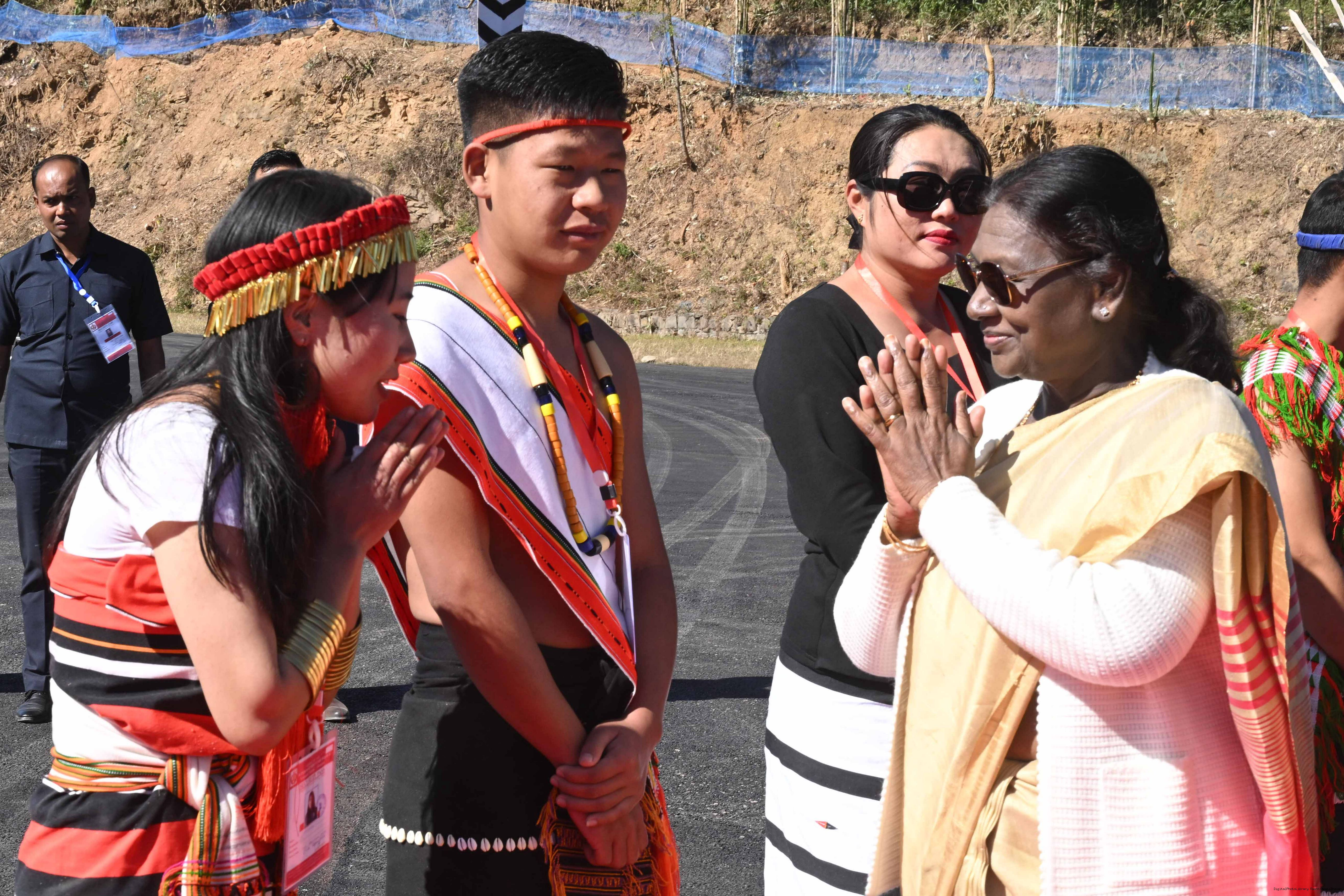 | Caption: | The Governor of Manipur, Shri Ajay Kumar Bhalla received the President of India, Smt. Droupadi Murmu at Taphou Naga Village Ground Helipad, Senapati on December 12, 2025. |