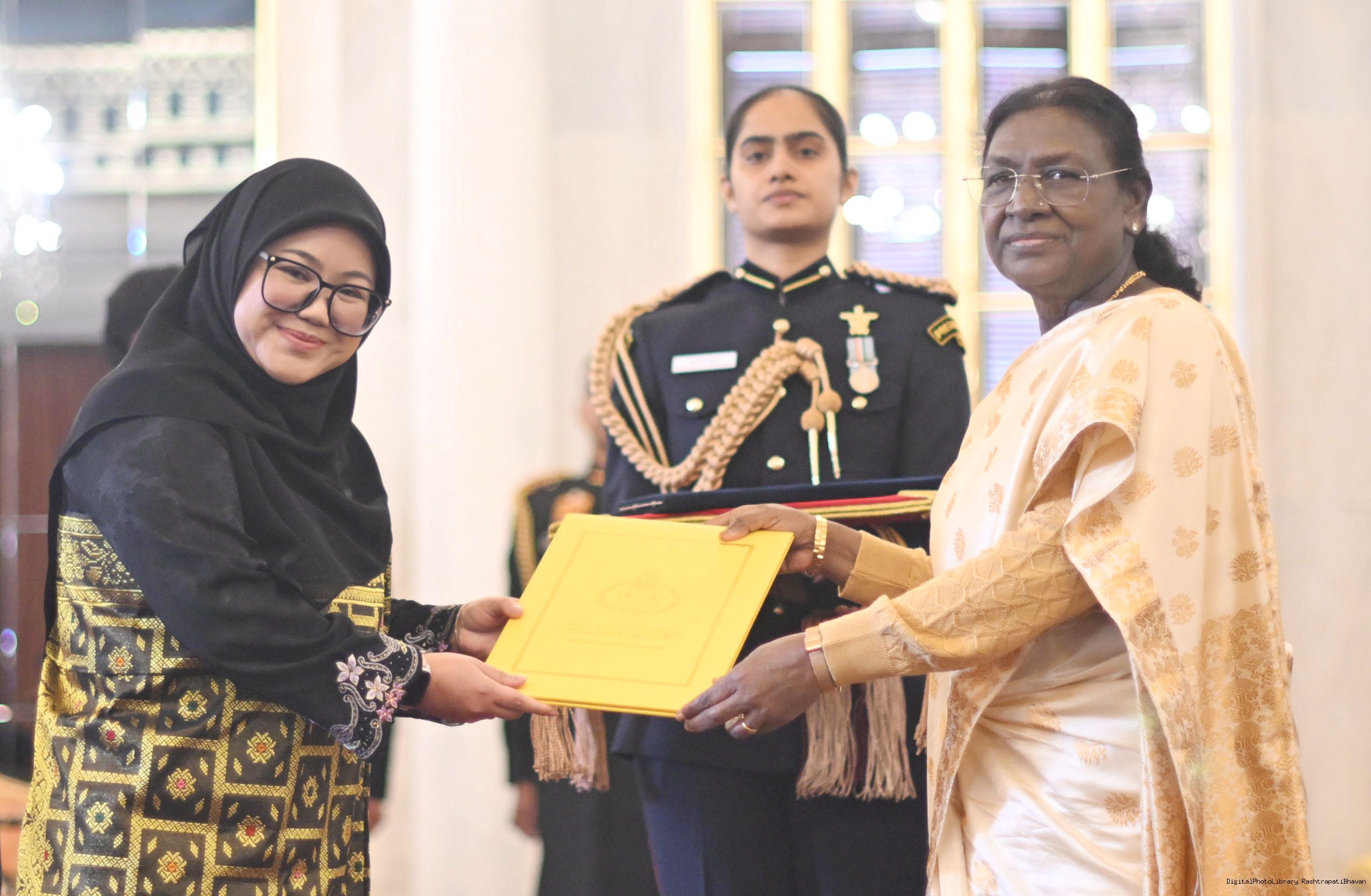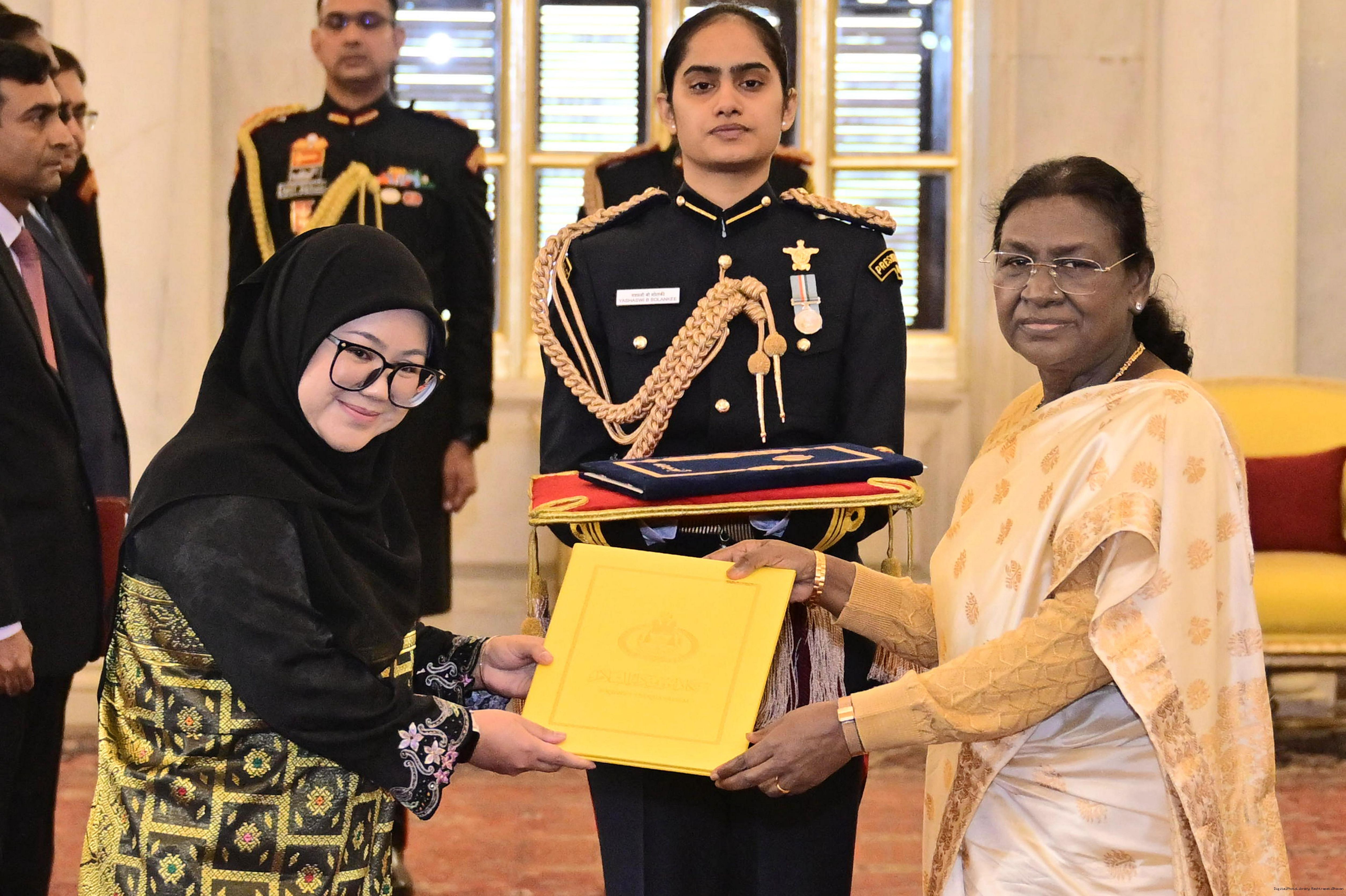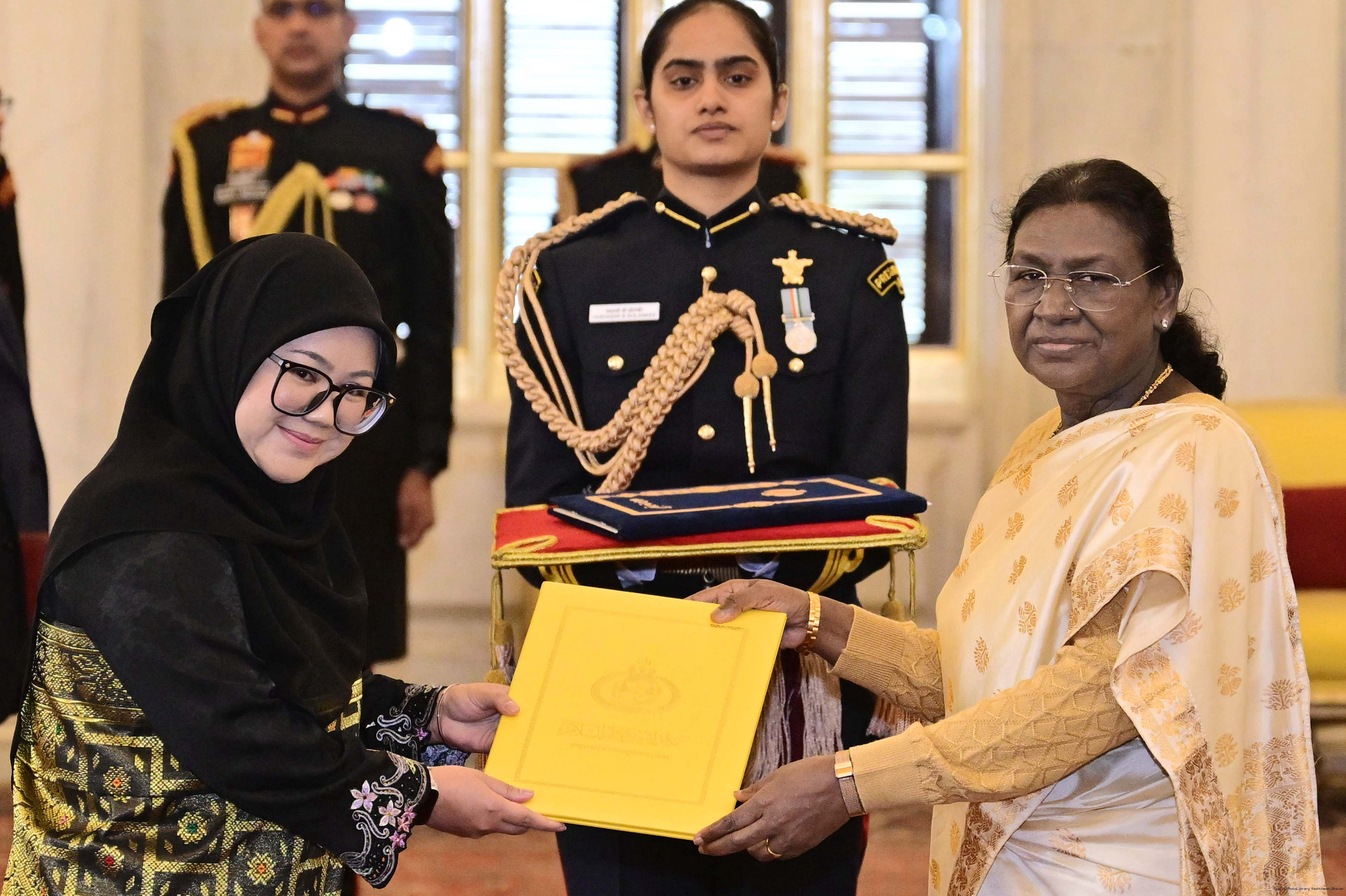 | Caption: | The High Commissioner designate of Brunei Darusslam, Mrs. Siti Arnyfaria Jaji Mohd. Jaini presenting her credentials to the President of India, Smt Droupadi Murmu at Rashtrapati Bhavan in New Delhi on December 15, 2025. |