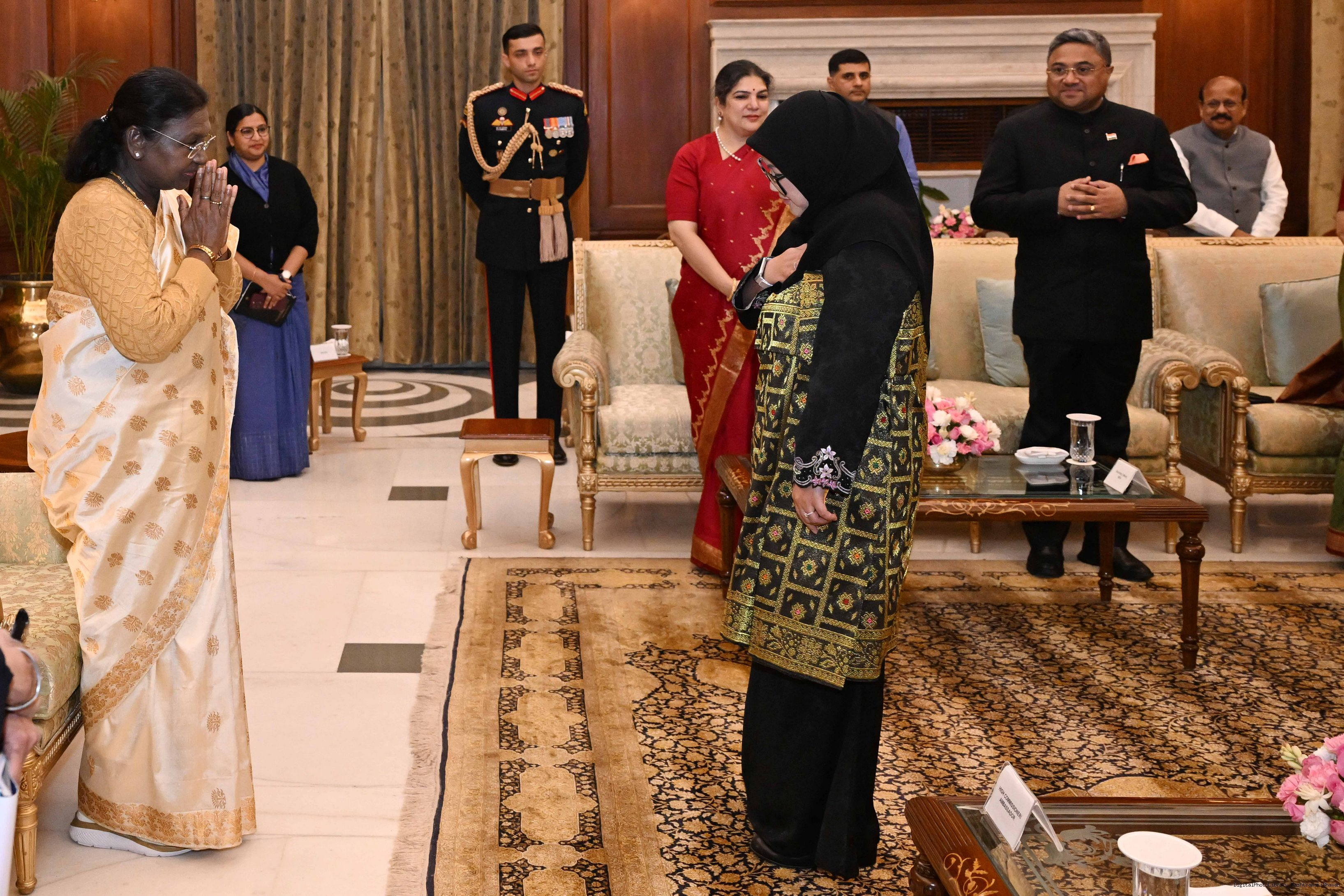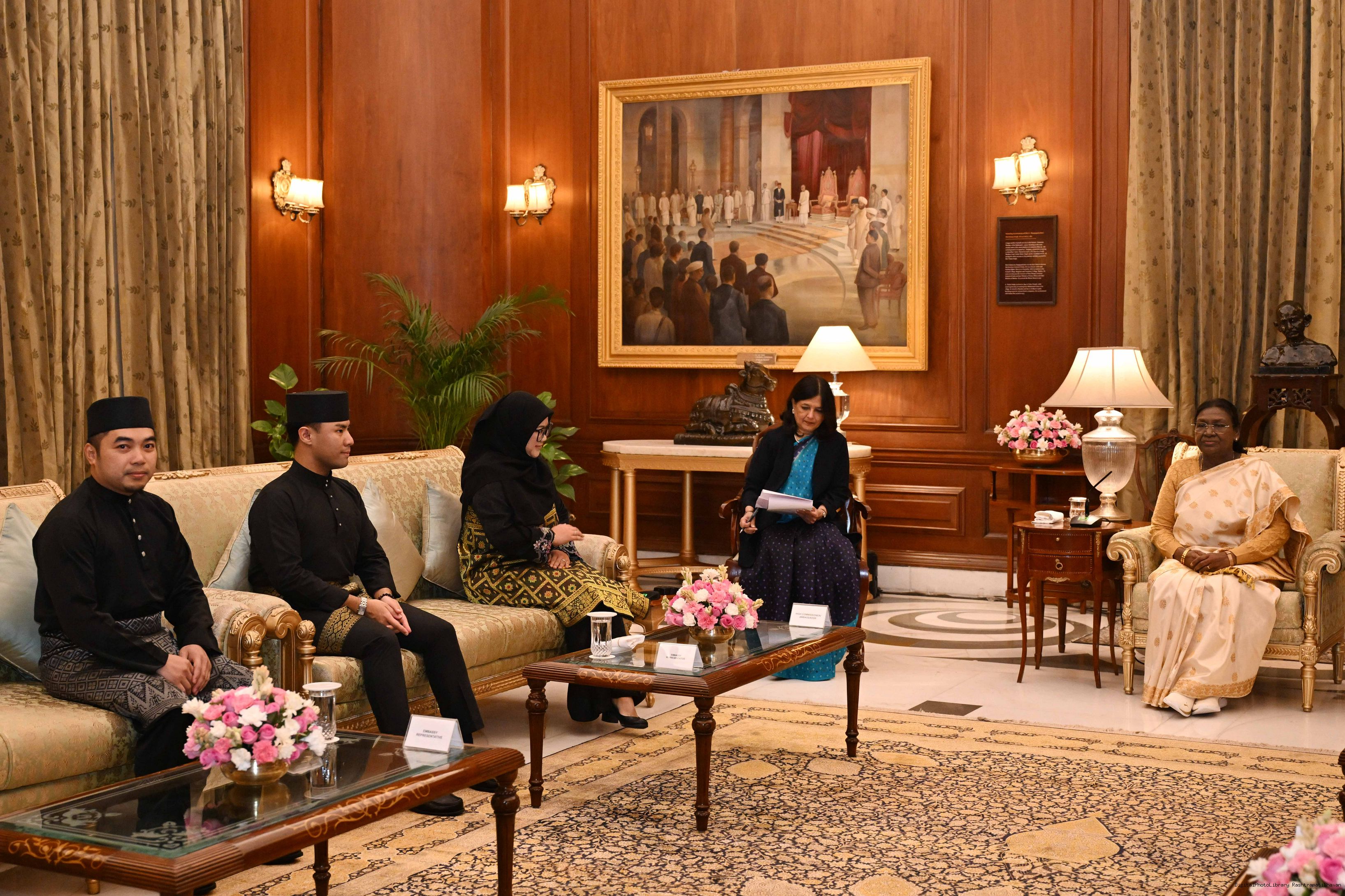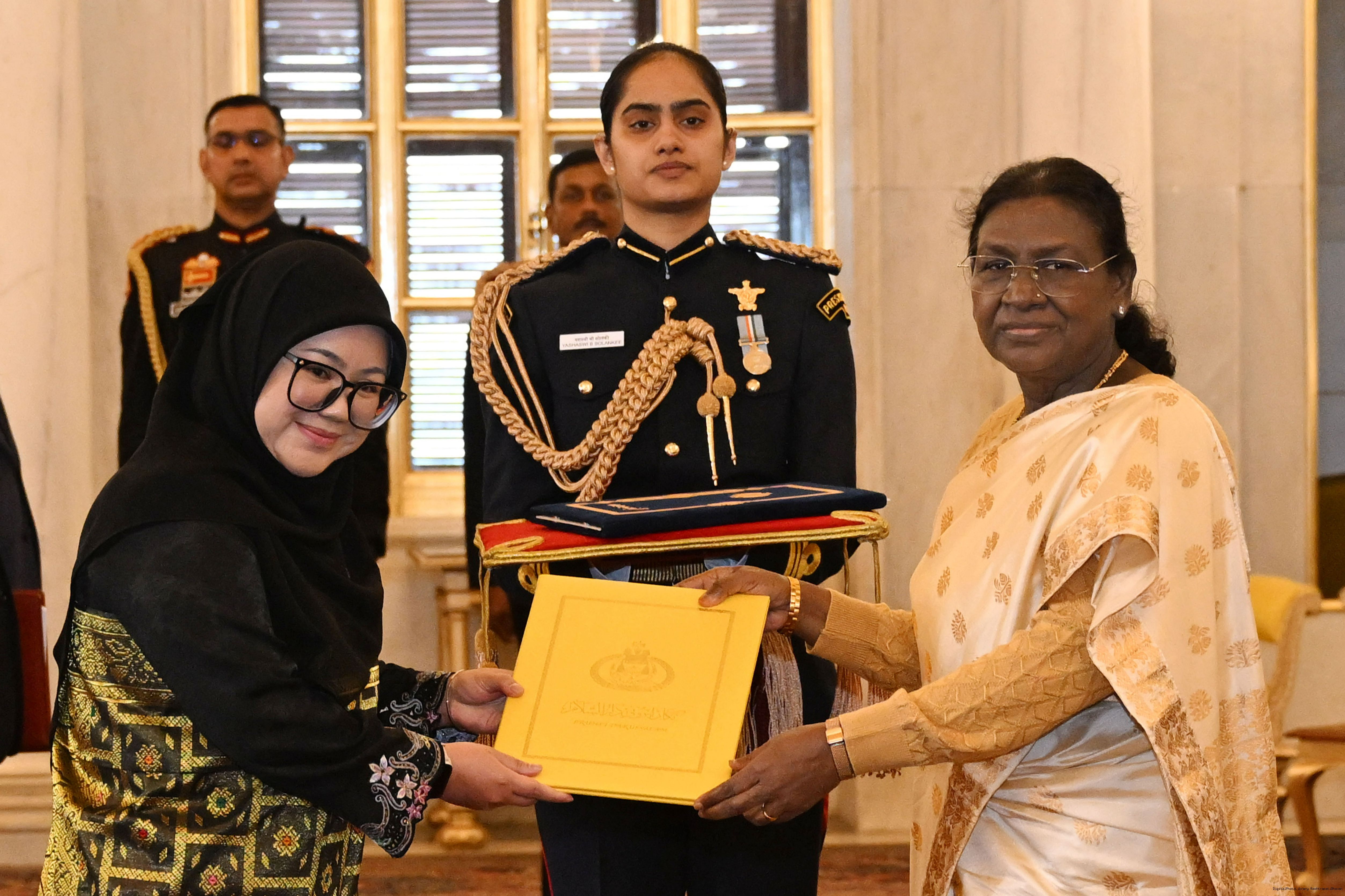 | Caption: | The High Commissioner designate of Brunei Darusslam, Mrs. Siti Arnyfaria Jaji Mohd. Jaini presenting her credentials to the President of India, Smt Droupadi Murmu at Rashtrapati Bhavan in New Delhi on December 15, 2025. |