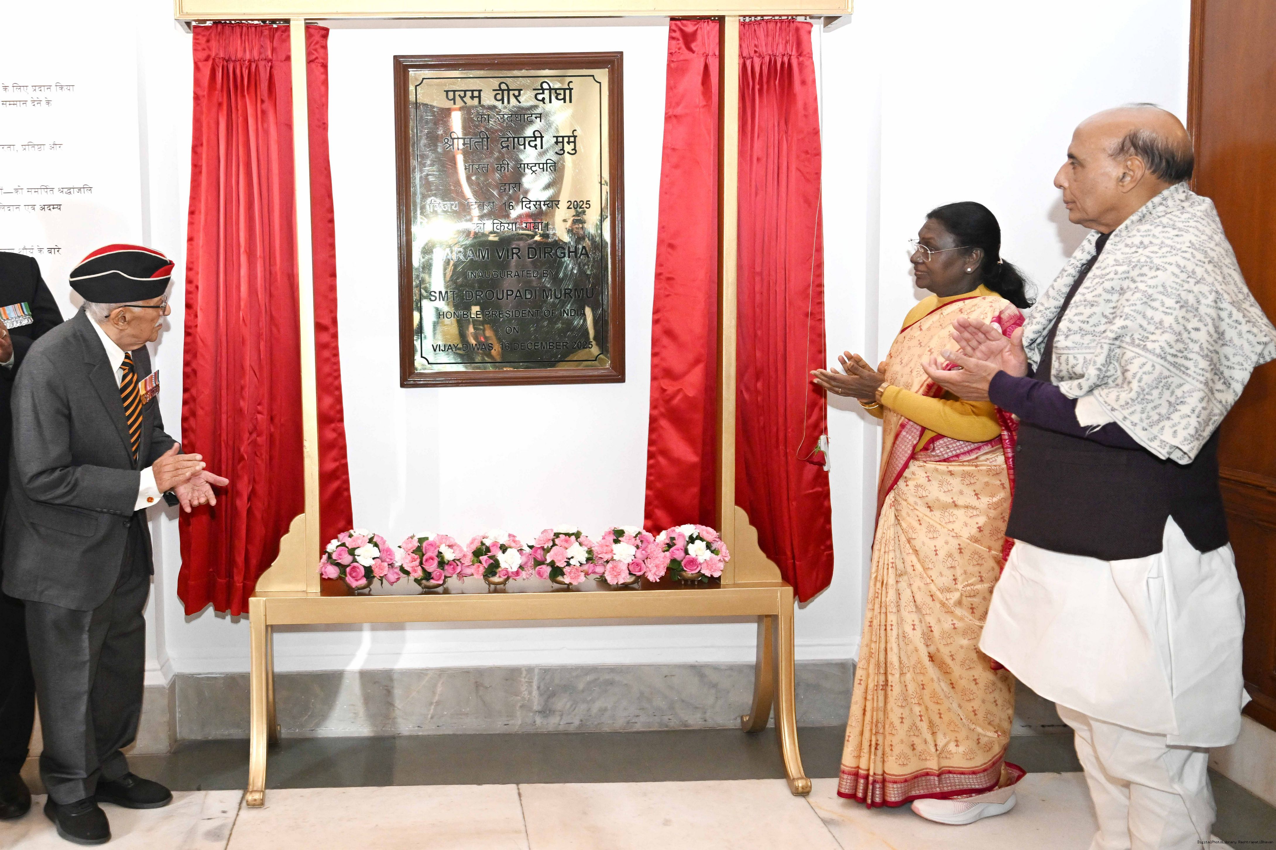 | Caption: | The President of India, Smt Droupadi Murmu, inaugurated the Param Vir Dirgha at Rashtrapati Bhavan on December 16, 2025. on the occasion of Vijay Diwas. |