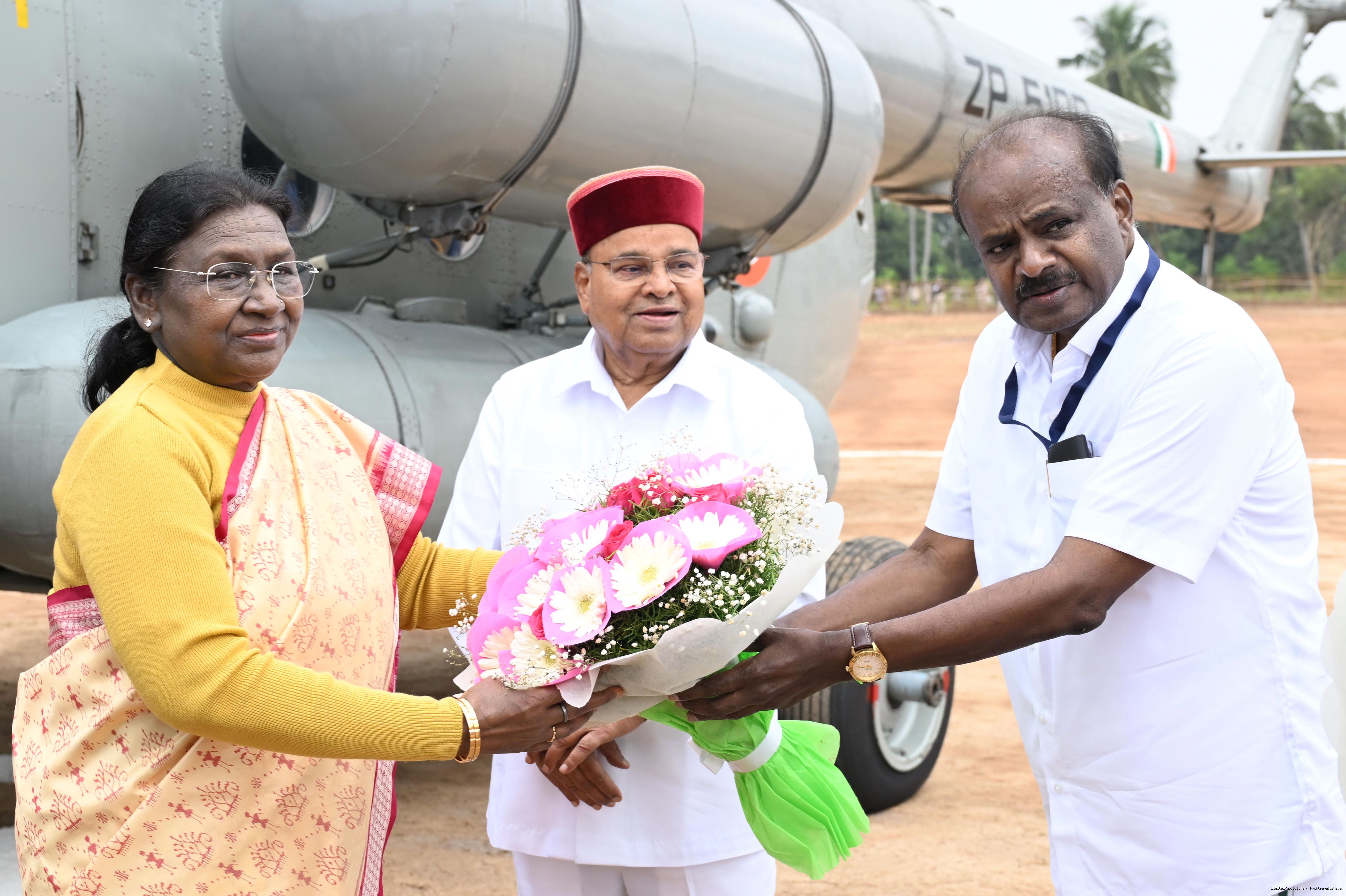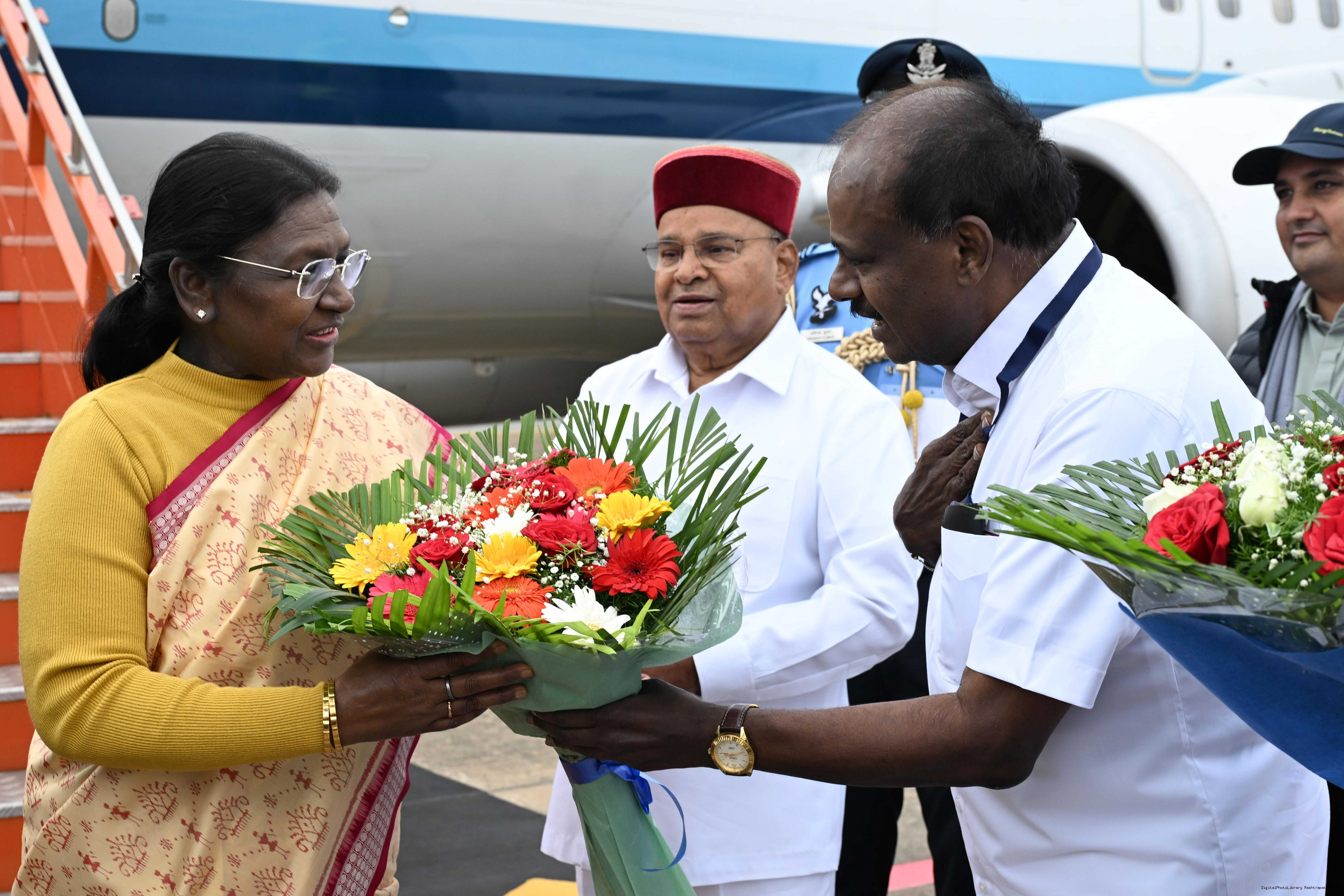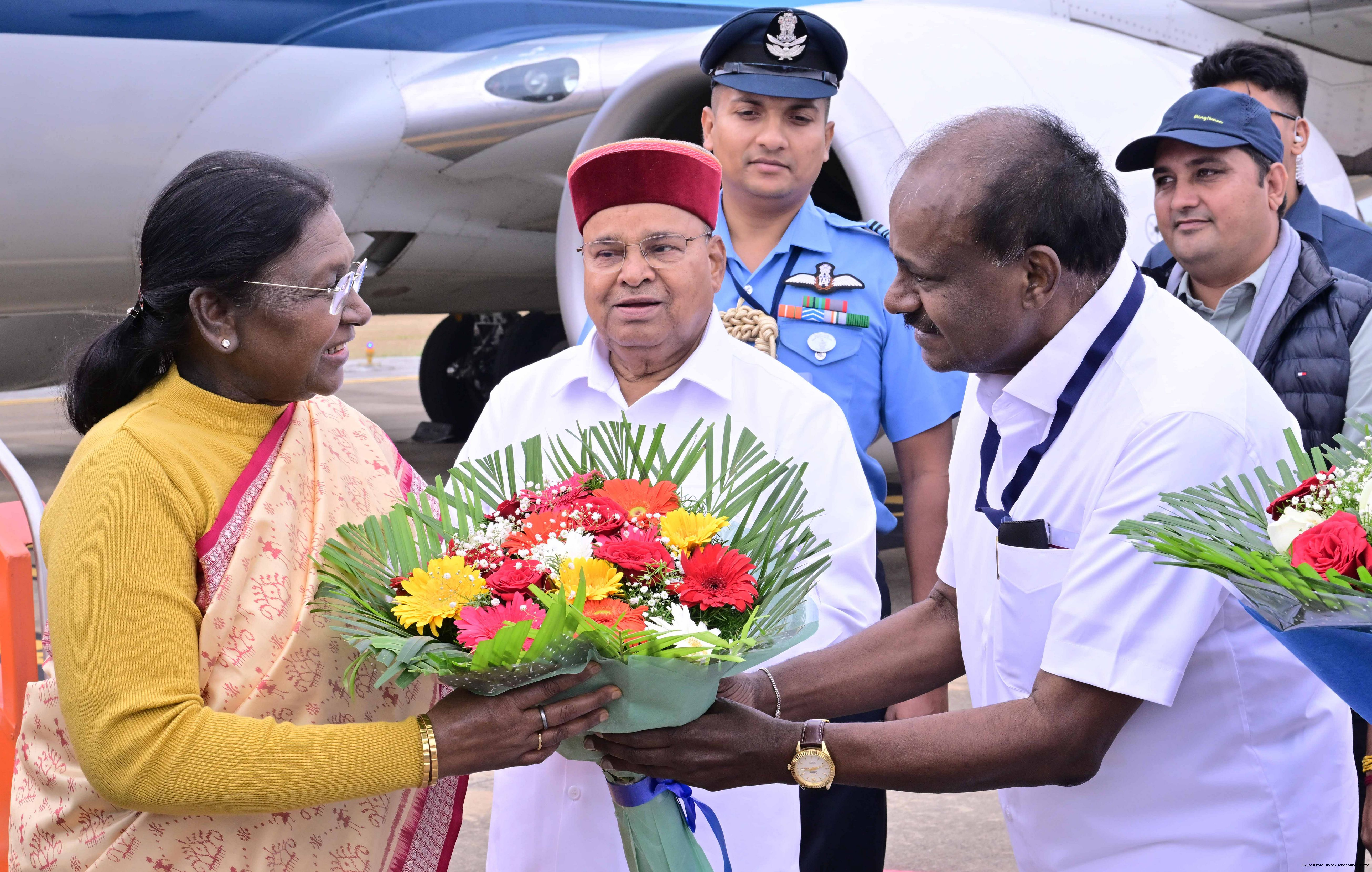 | Caption: | The Governor of Karnataka, Shri Thaawar Chand Gehlot and Union Minister for Heavy Industries and Steel, Shri H. D. Kumaraswamy received the President of India, Smt. Droupadi Murmu on her arrival at Mysuru, Karnataka on December 16, 2025. |
