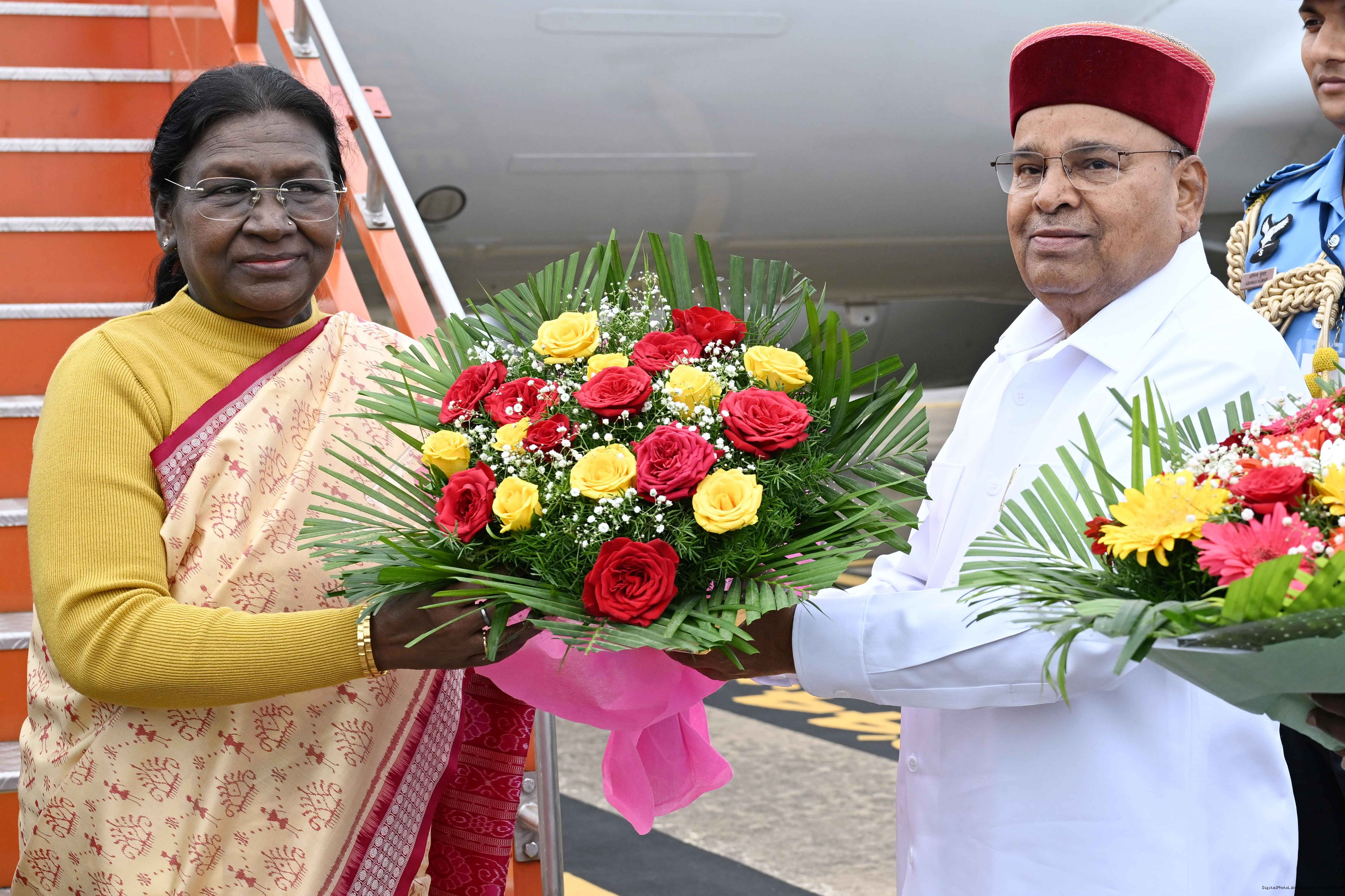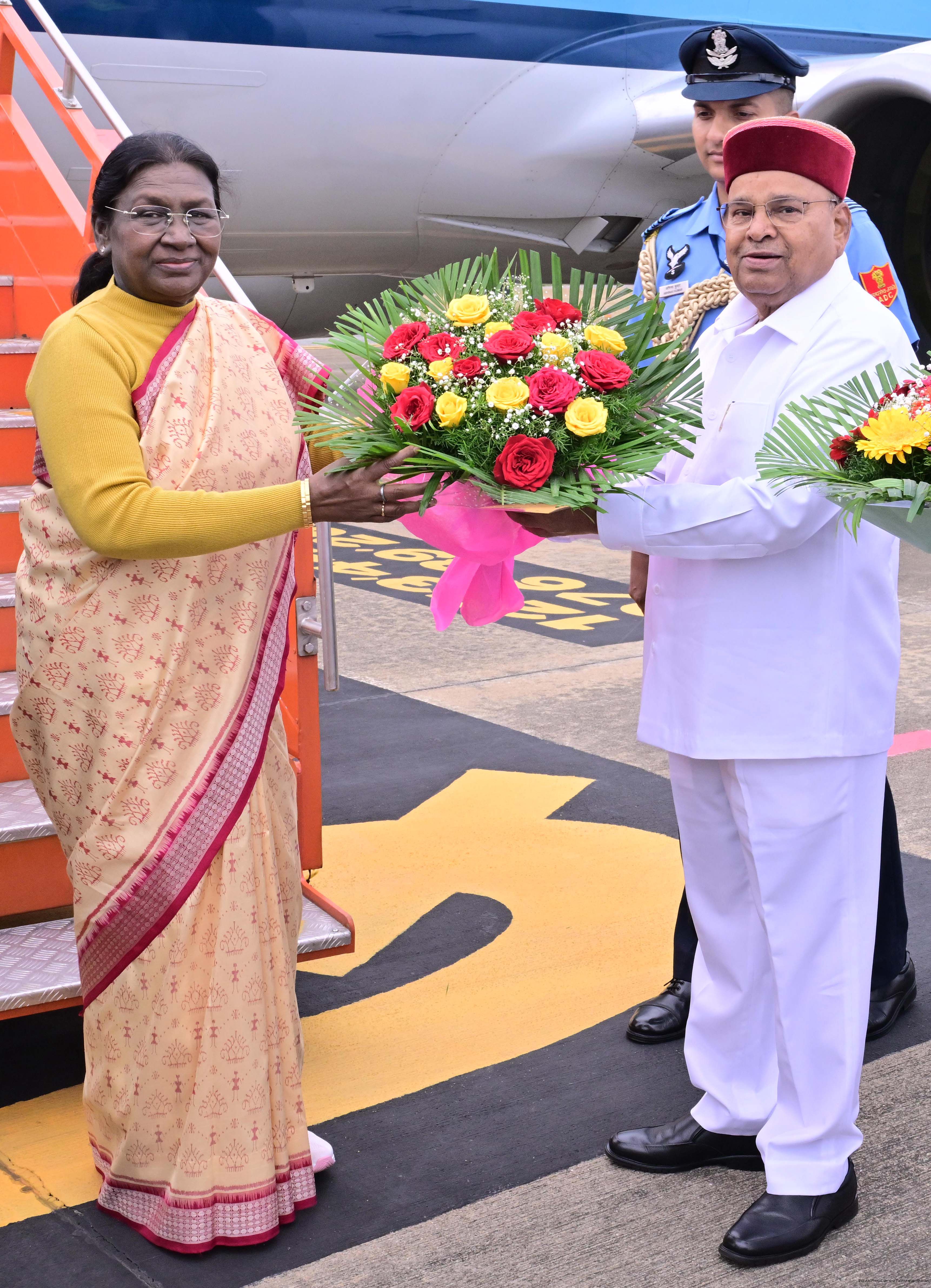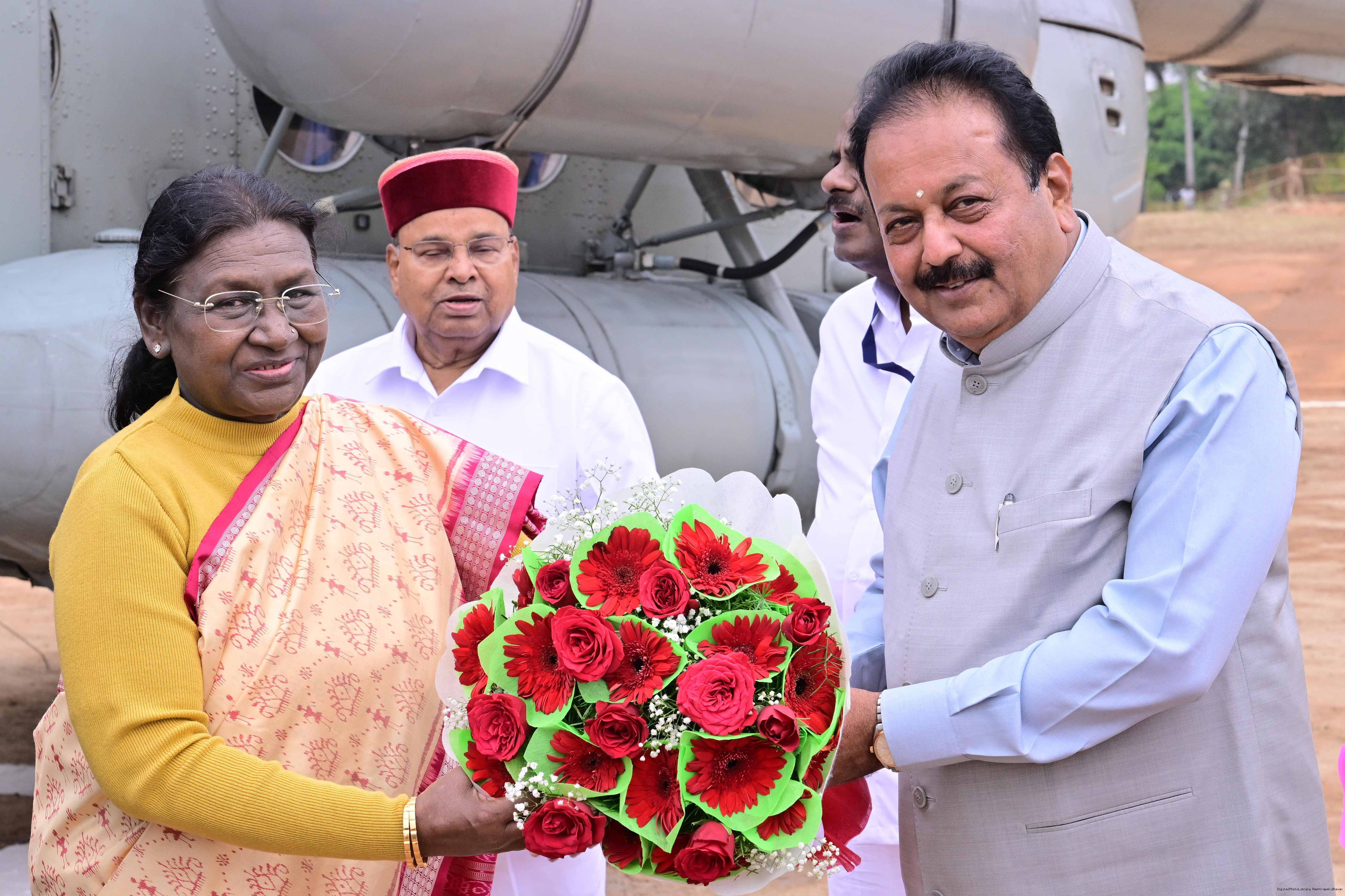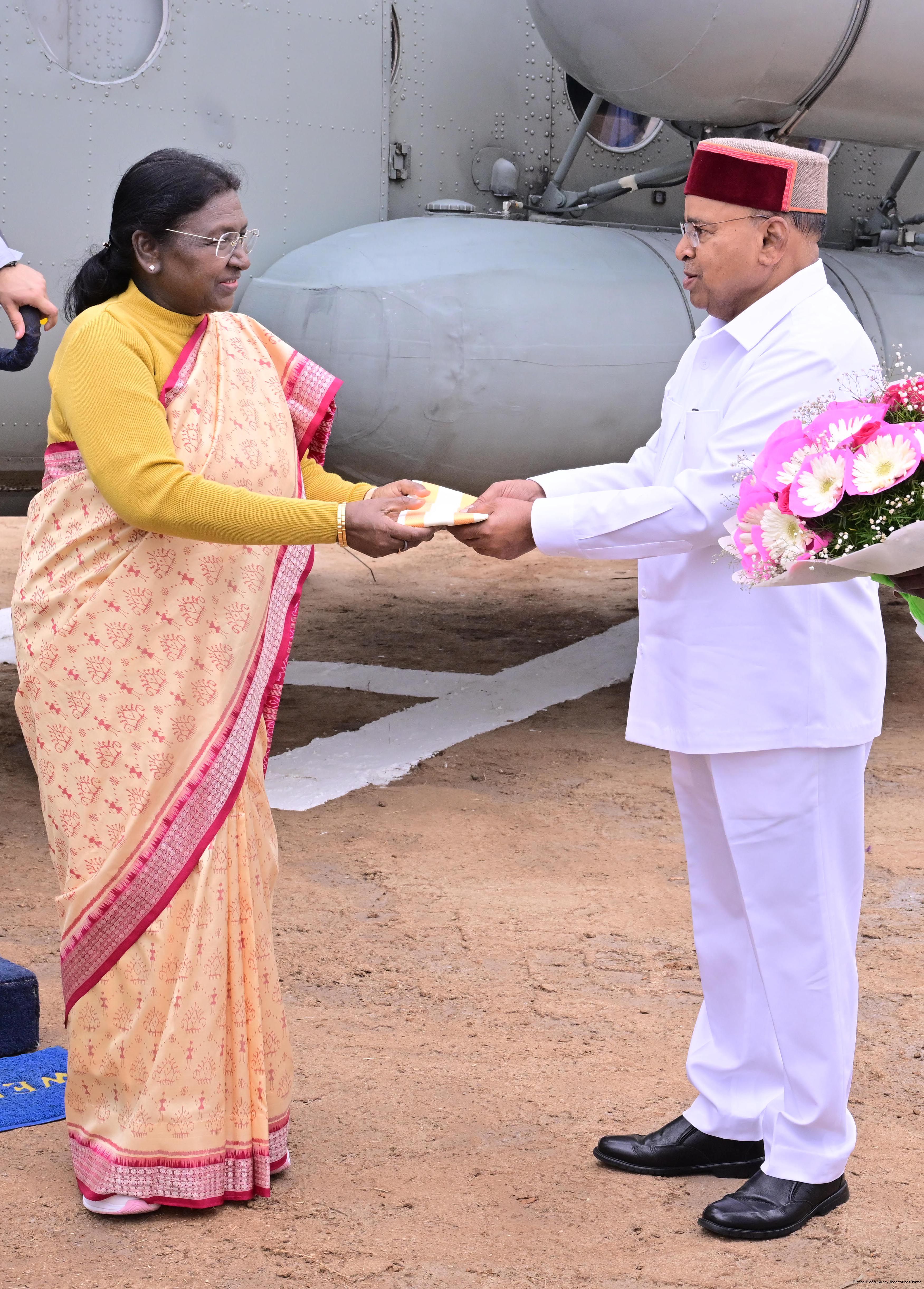 | Caption: | The Governor of Karnataka, Shri Thaawar Chand Gehlot and Union Minister for Heavy Industries and Steel, Shri H. D. Kumaraswamy received the President of India, Smt. Droupadi Murmu on her arrival at Mysuru, Karnataka on December 16, 2025. |