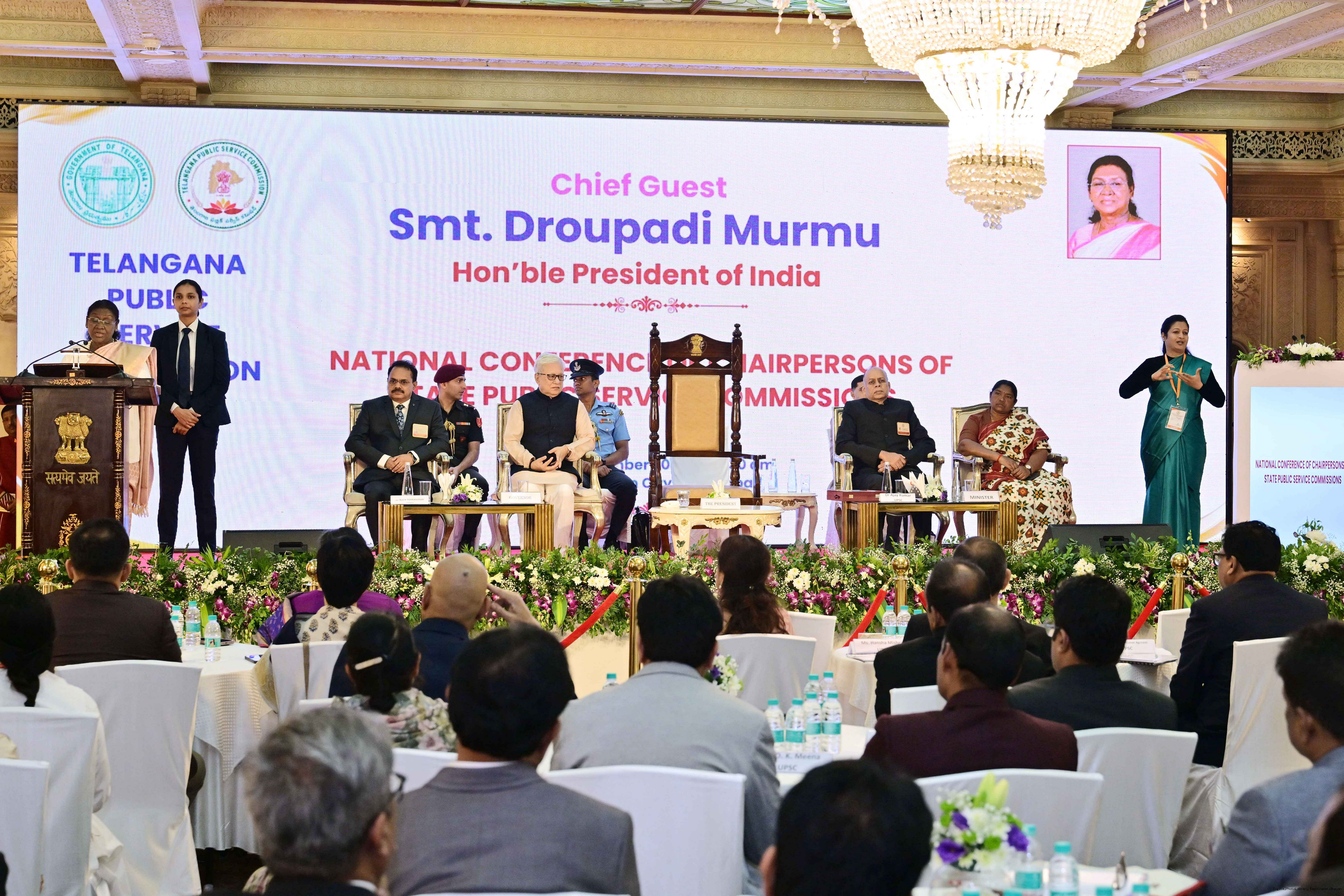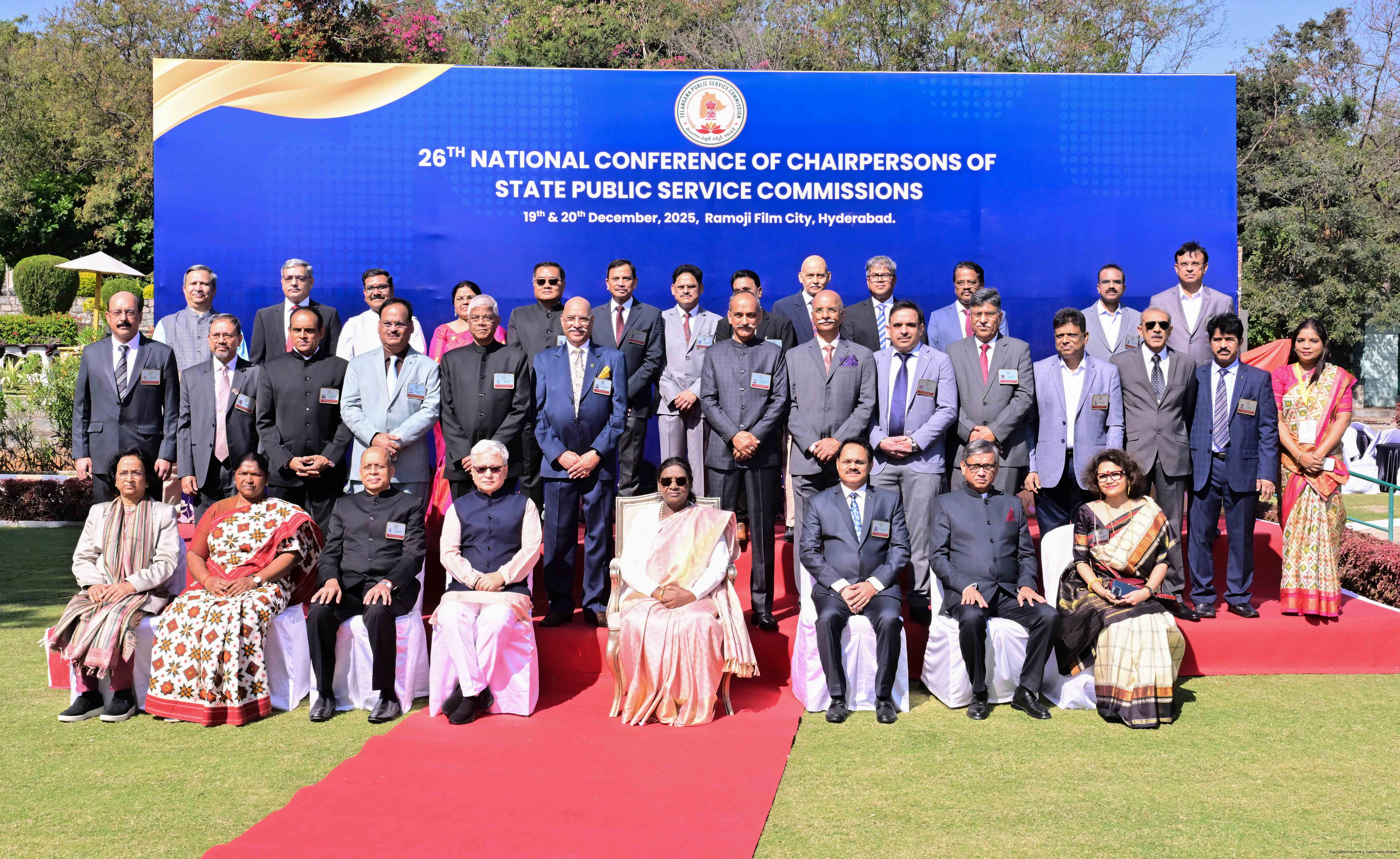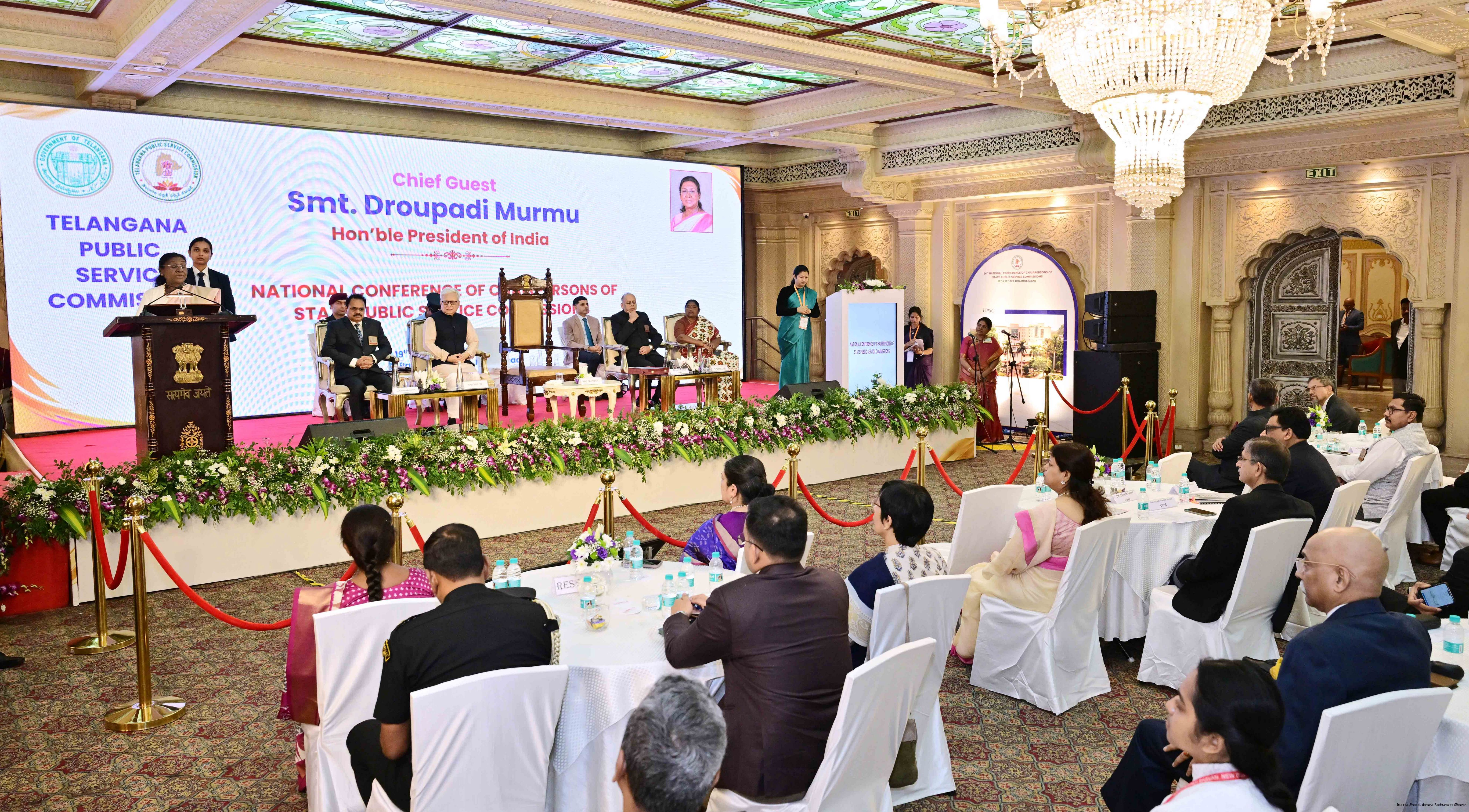 | Caption: | The President of India, Smt Droupadi Murmu, inaugurated the National Conference for the Chairpersons of Public Service Commissions, being organised by the Telangana Public Service Commission, at Hyderabad, Telangana on December 19, 2025. |