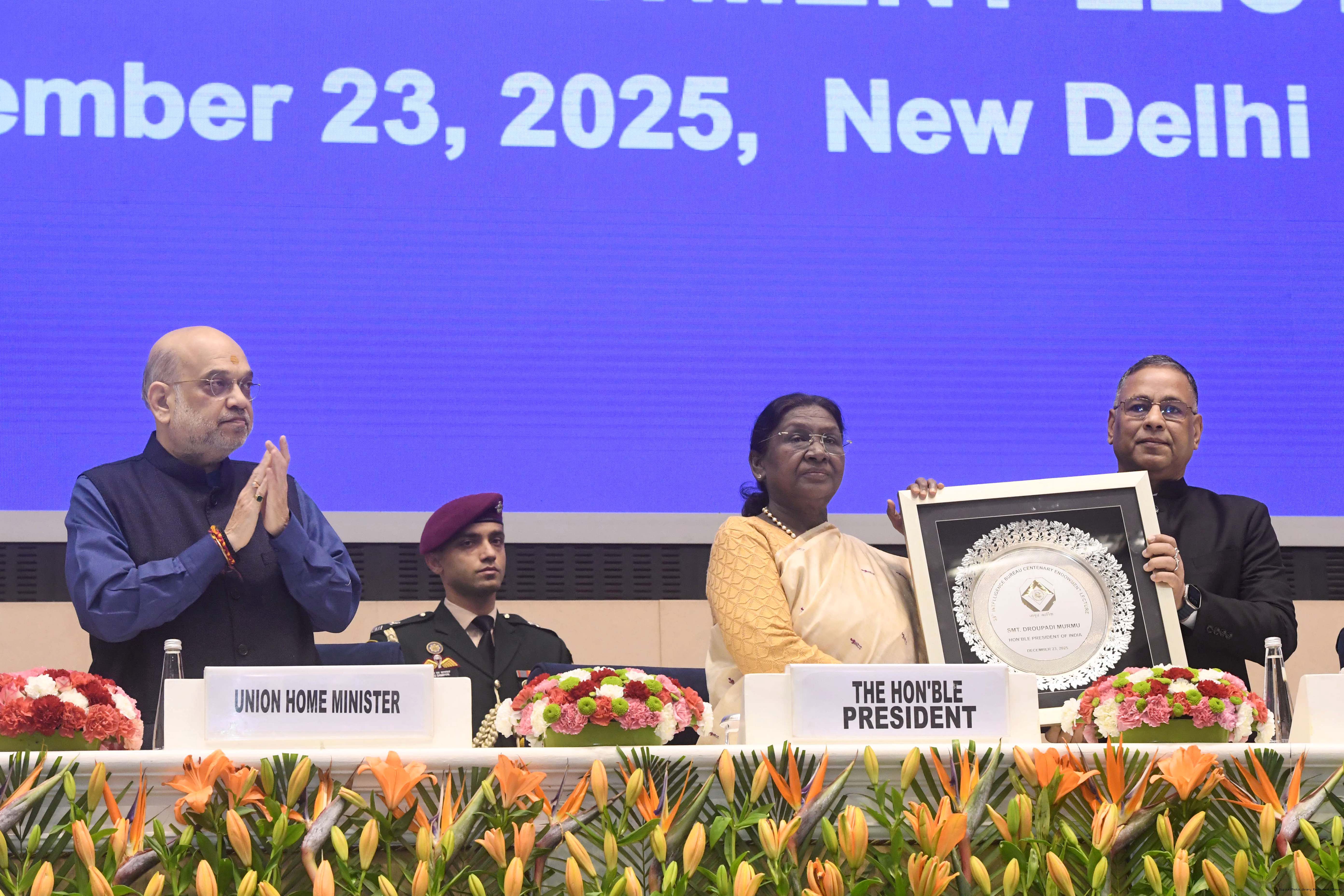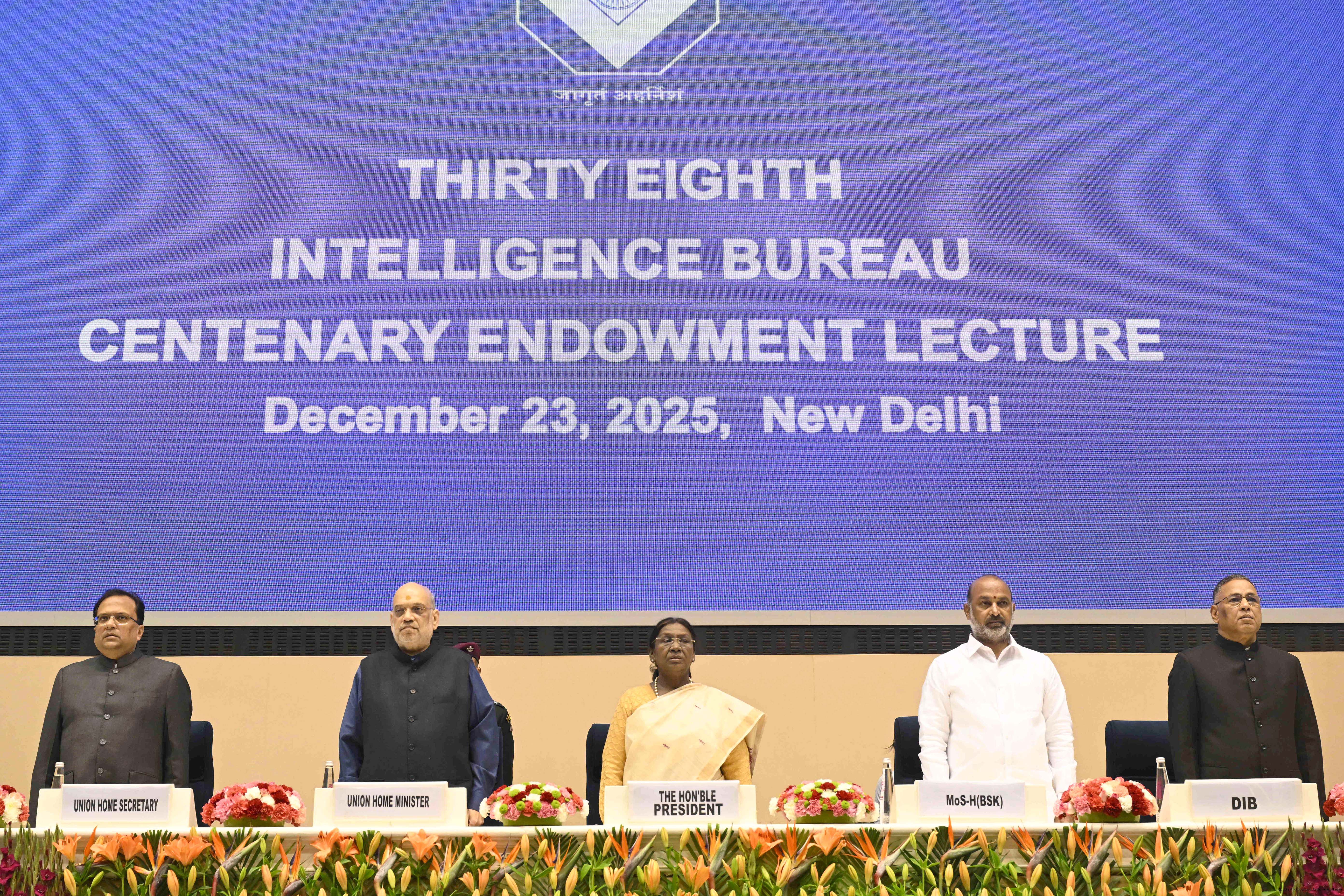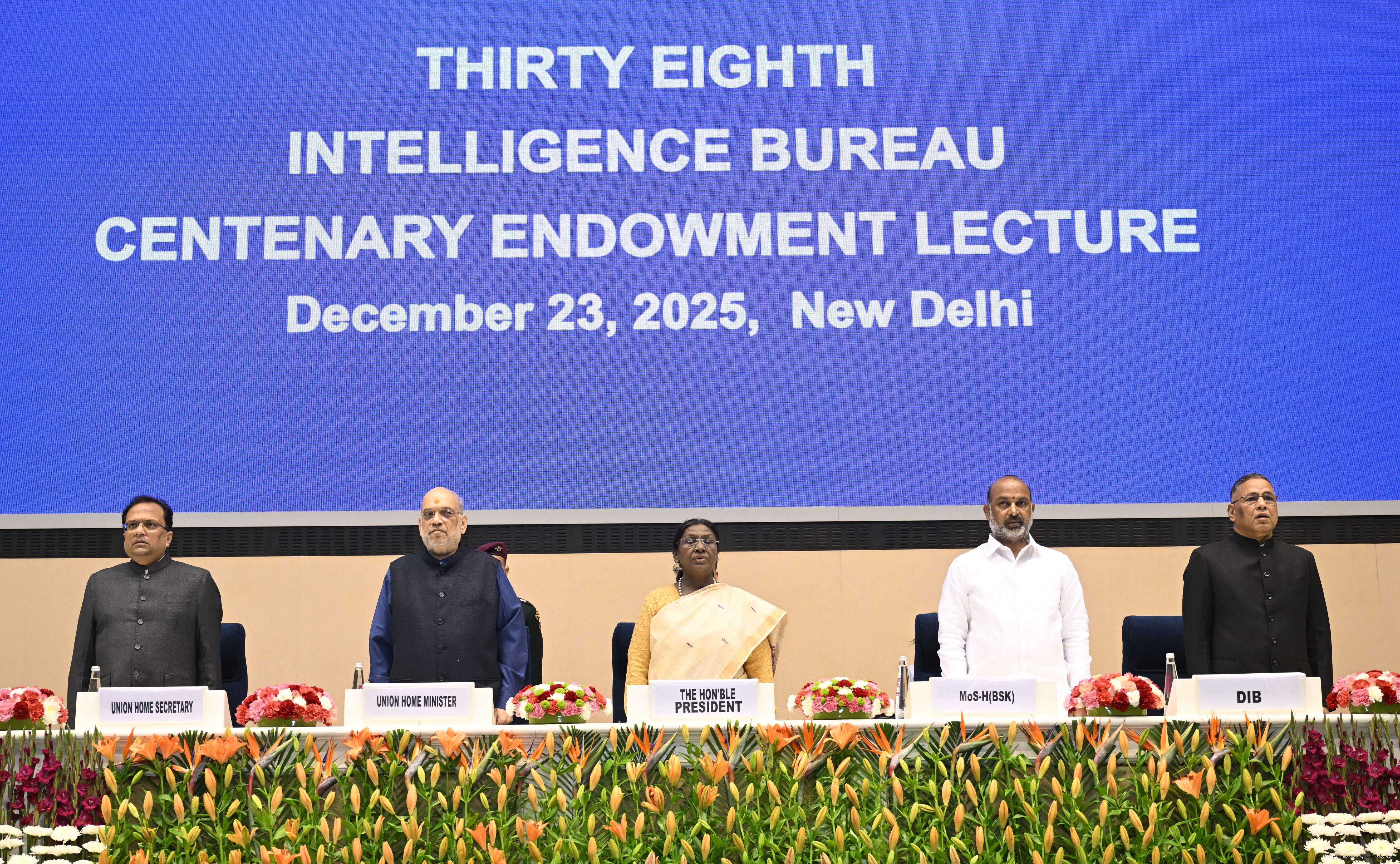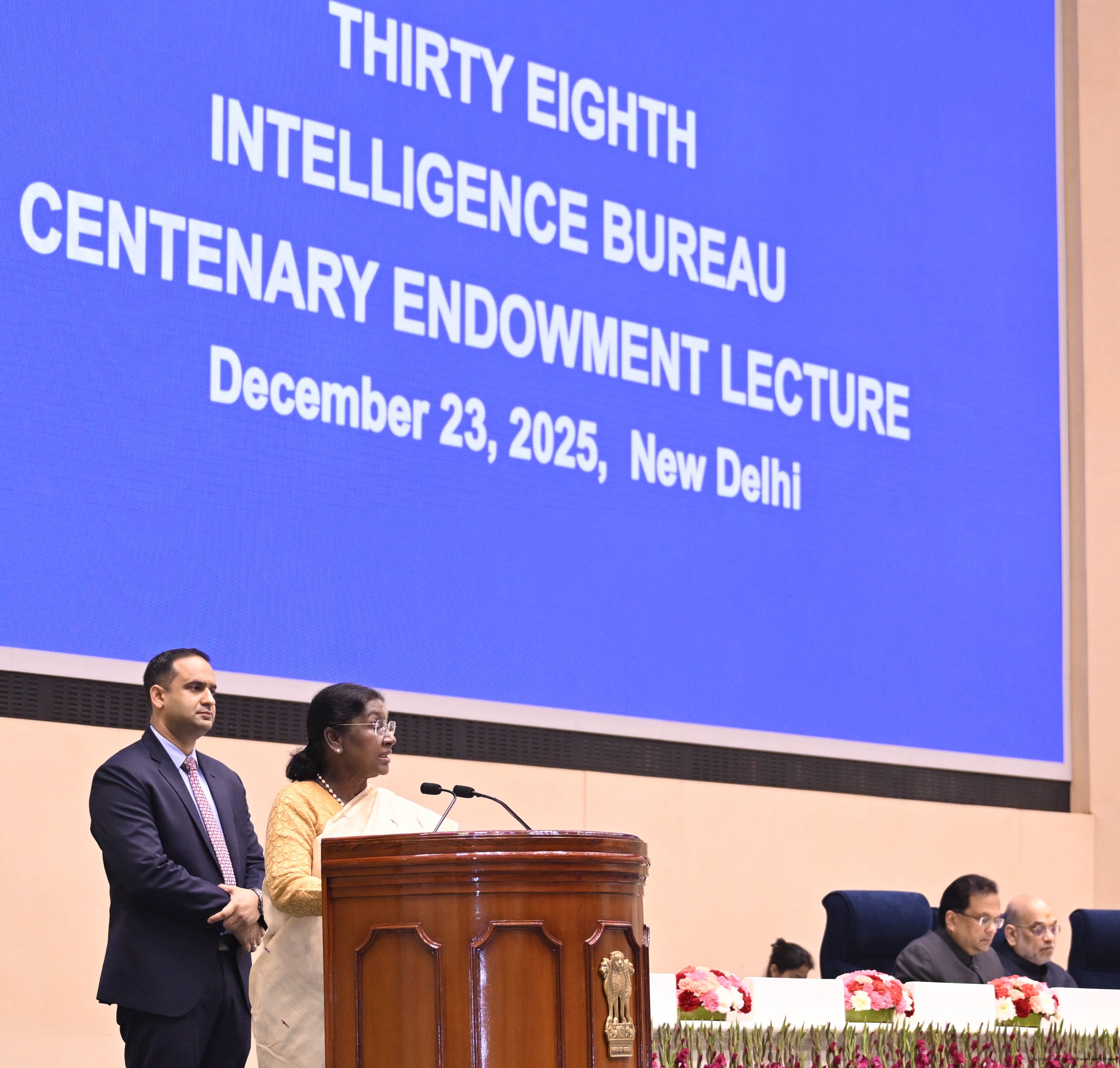 | Caption: | The President of India, Smt Droupadi Murmu, addressed the IB Centenary Endowment Lecture on the subject ‘People-Centric National Security: Community Participation in Building Viksit Bharat’ in New Delhi on December 23, 2025. |
