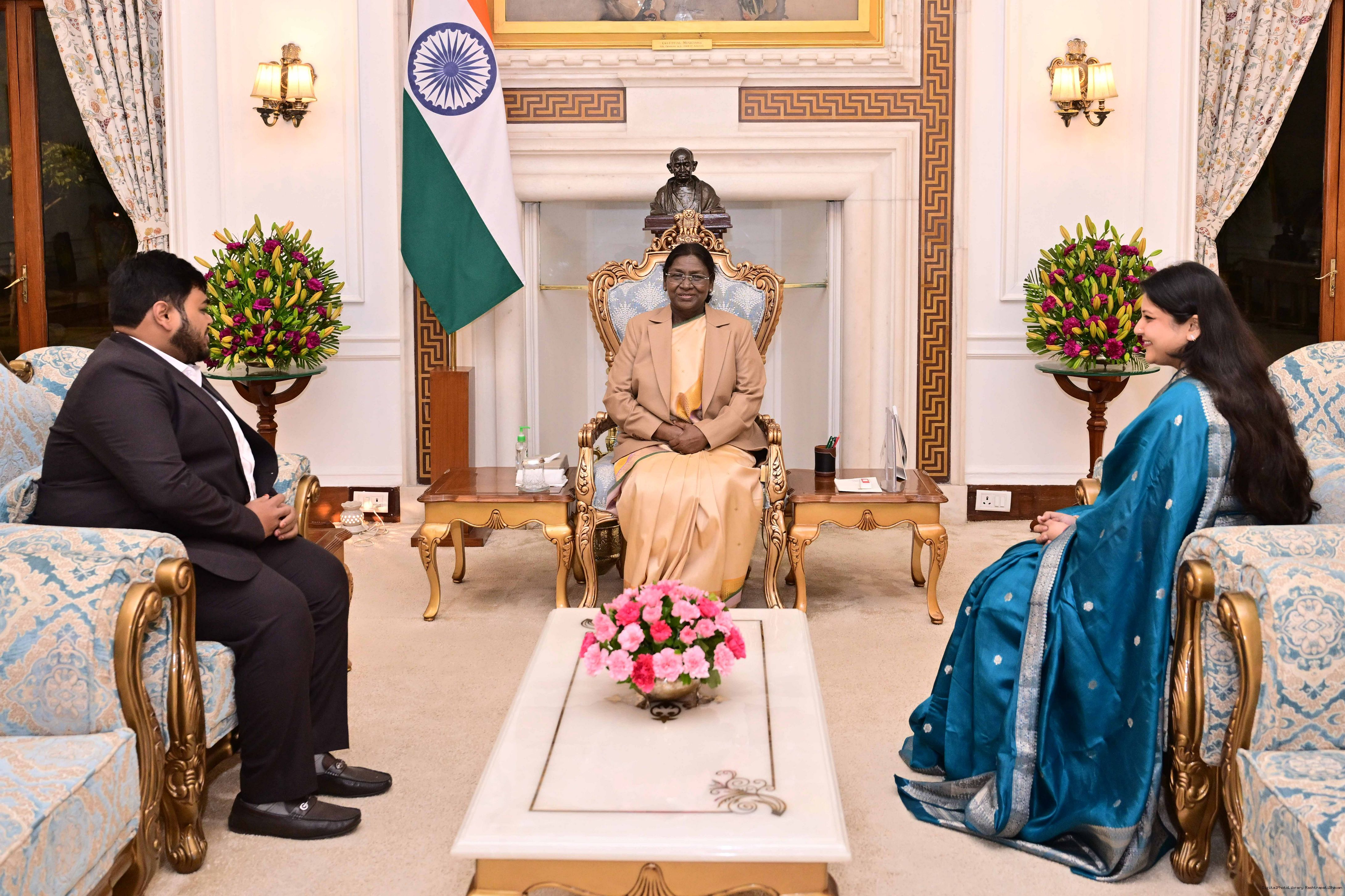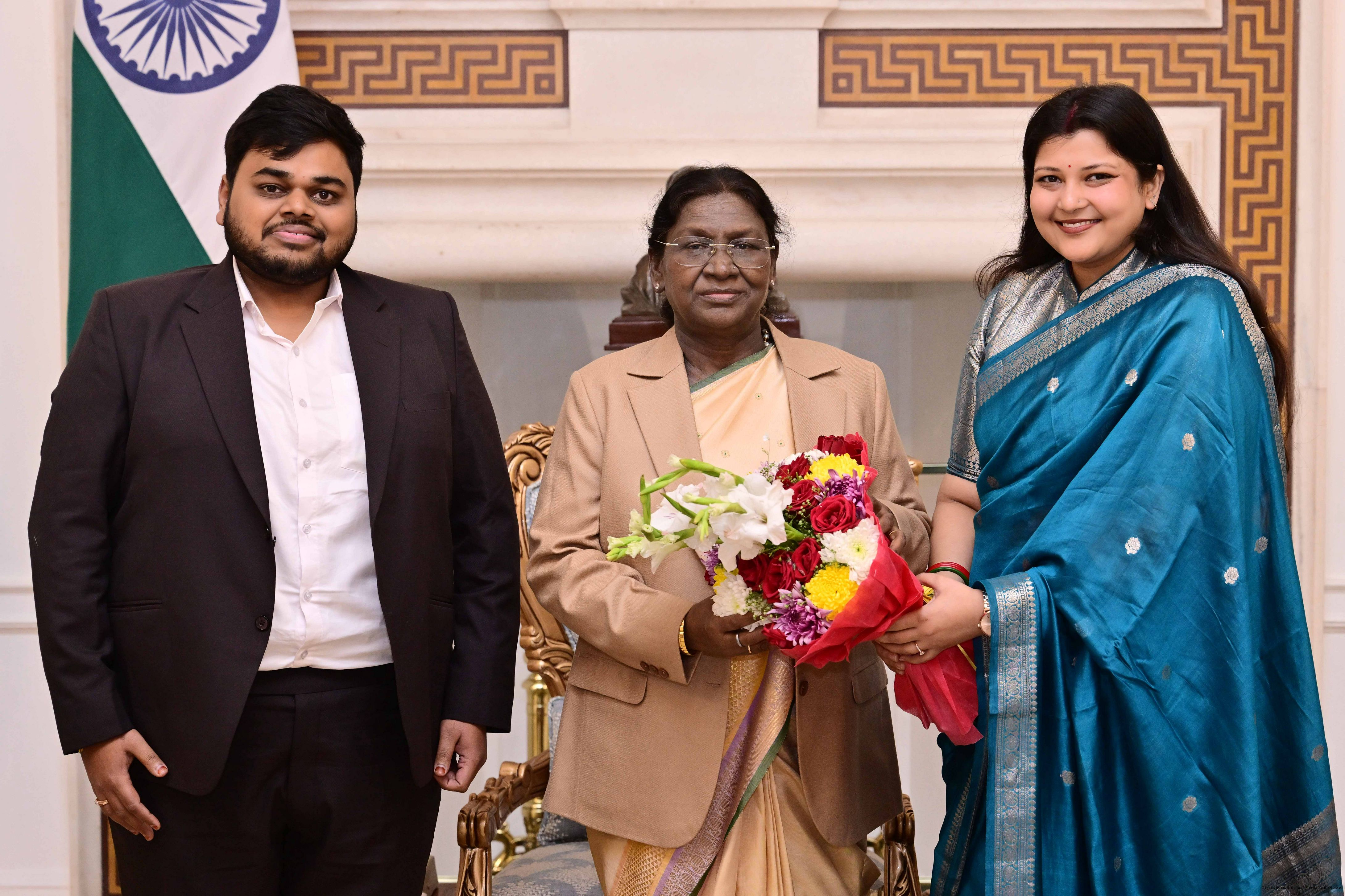 | Caption: | Shri Pallav Dhandhania and Smt. Aditi Agarwal from Rairangpur meeting with the President of India, Smt Droupadi Murmu at Rashtrapati Bhavan on December 23, 2025. |