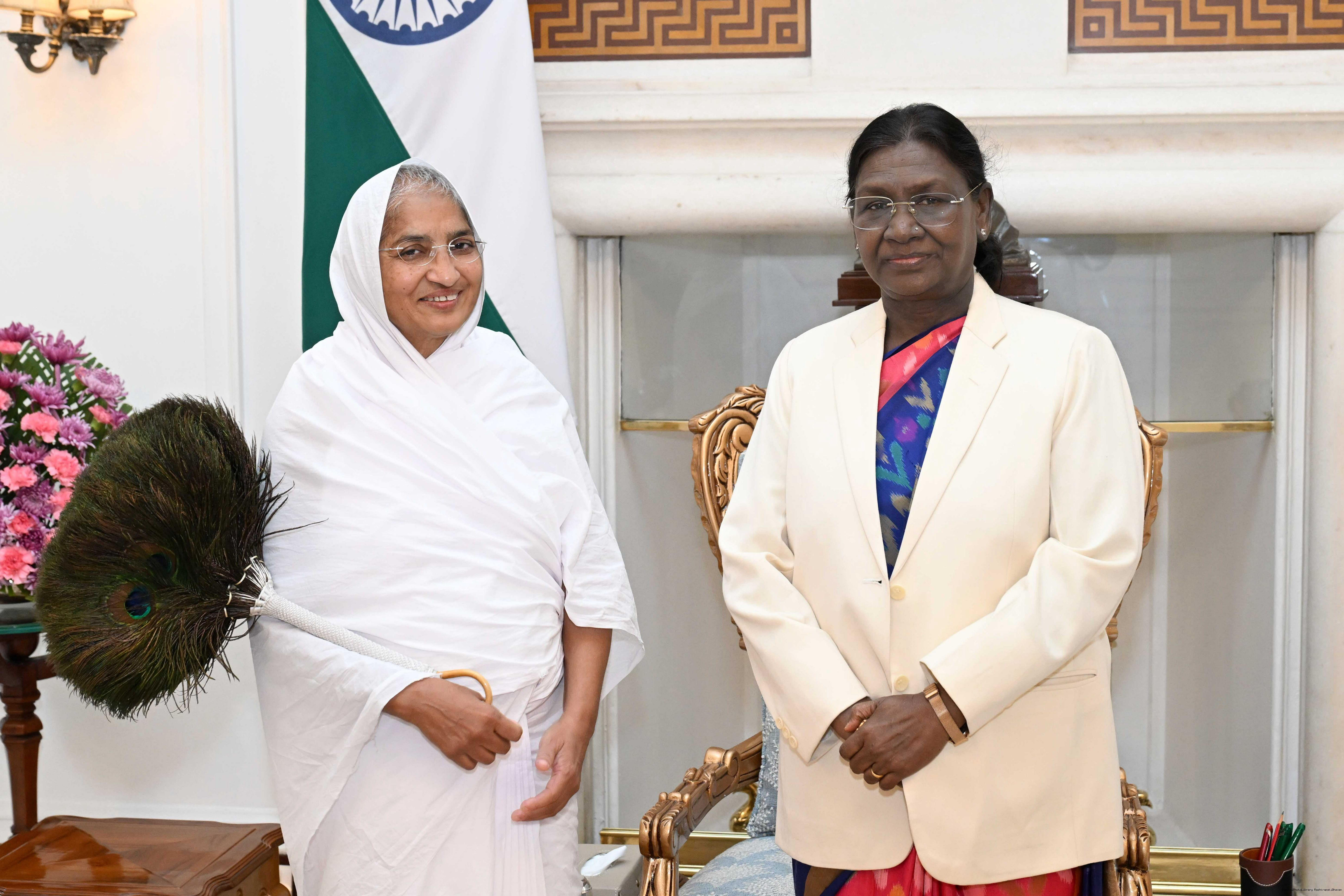 | Caption: | Shri Vijender Gupta, Speaker, Delhi Legislative Assembly along with Aryika Shri Purnamati Mataji meeting with the President of India, Smt. Droupadi Murmu at Rashtrapati Bhavan on December 24, 2025. |