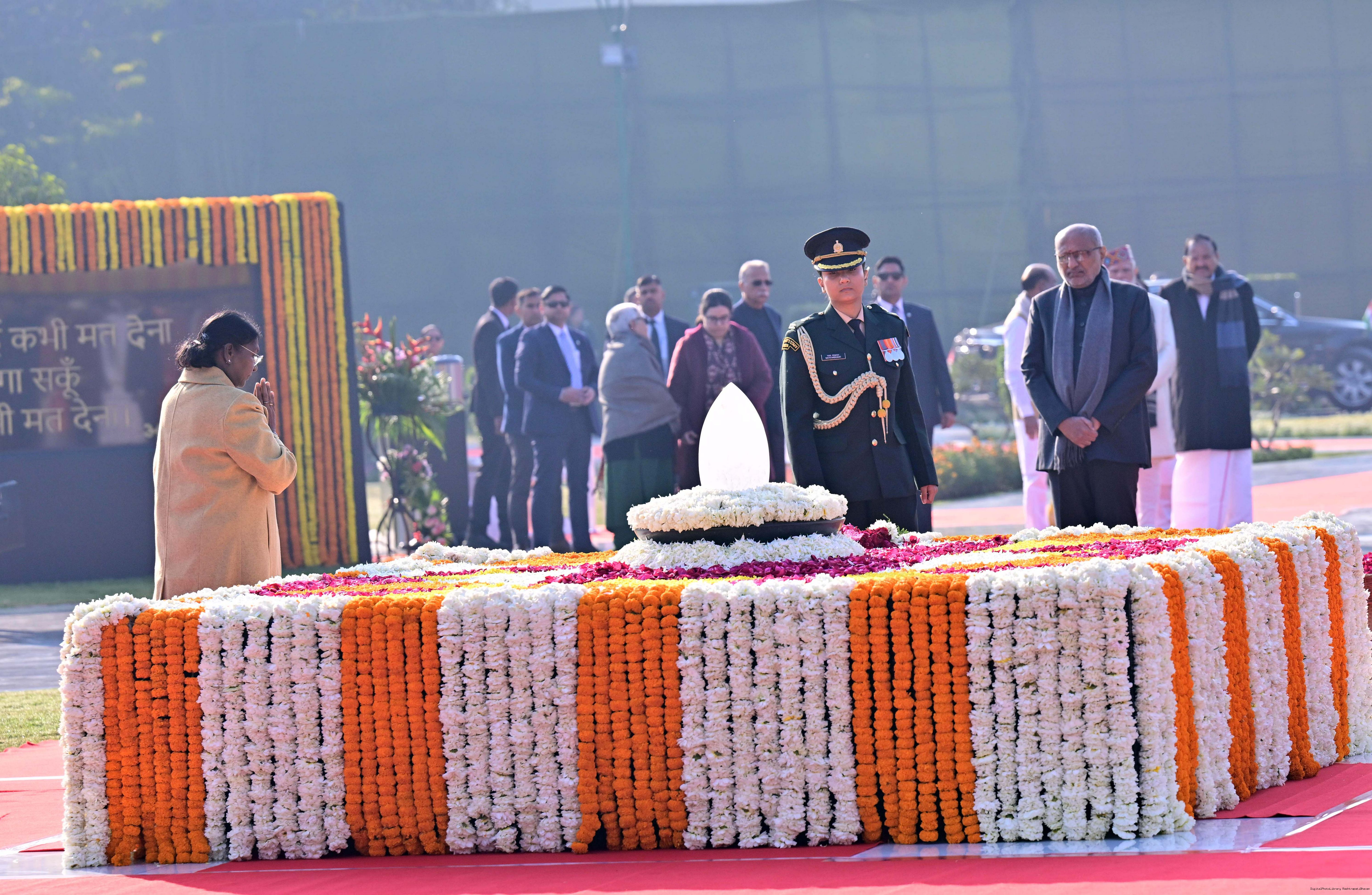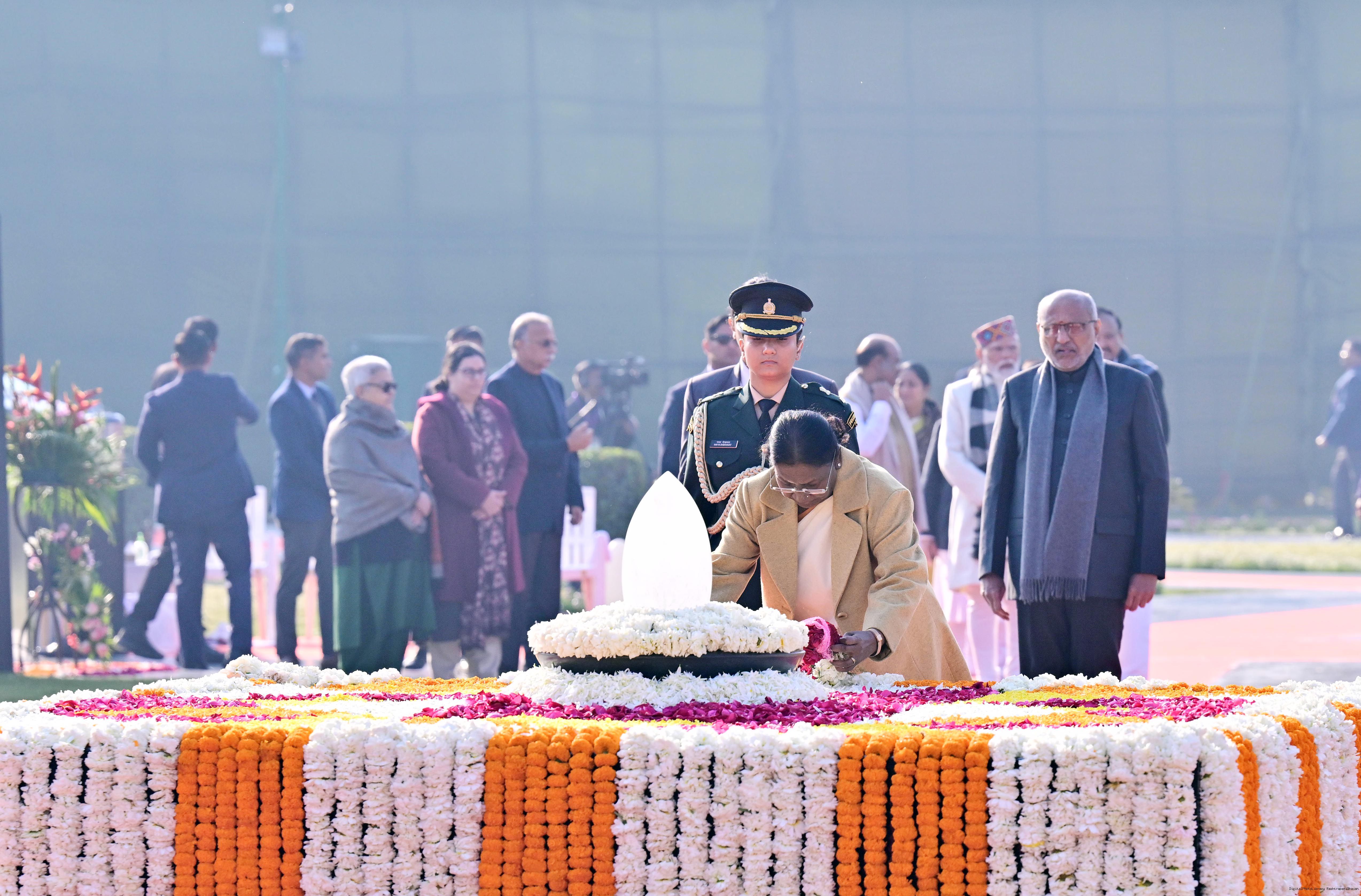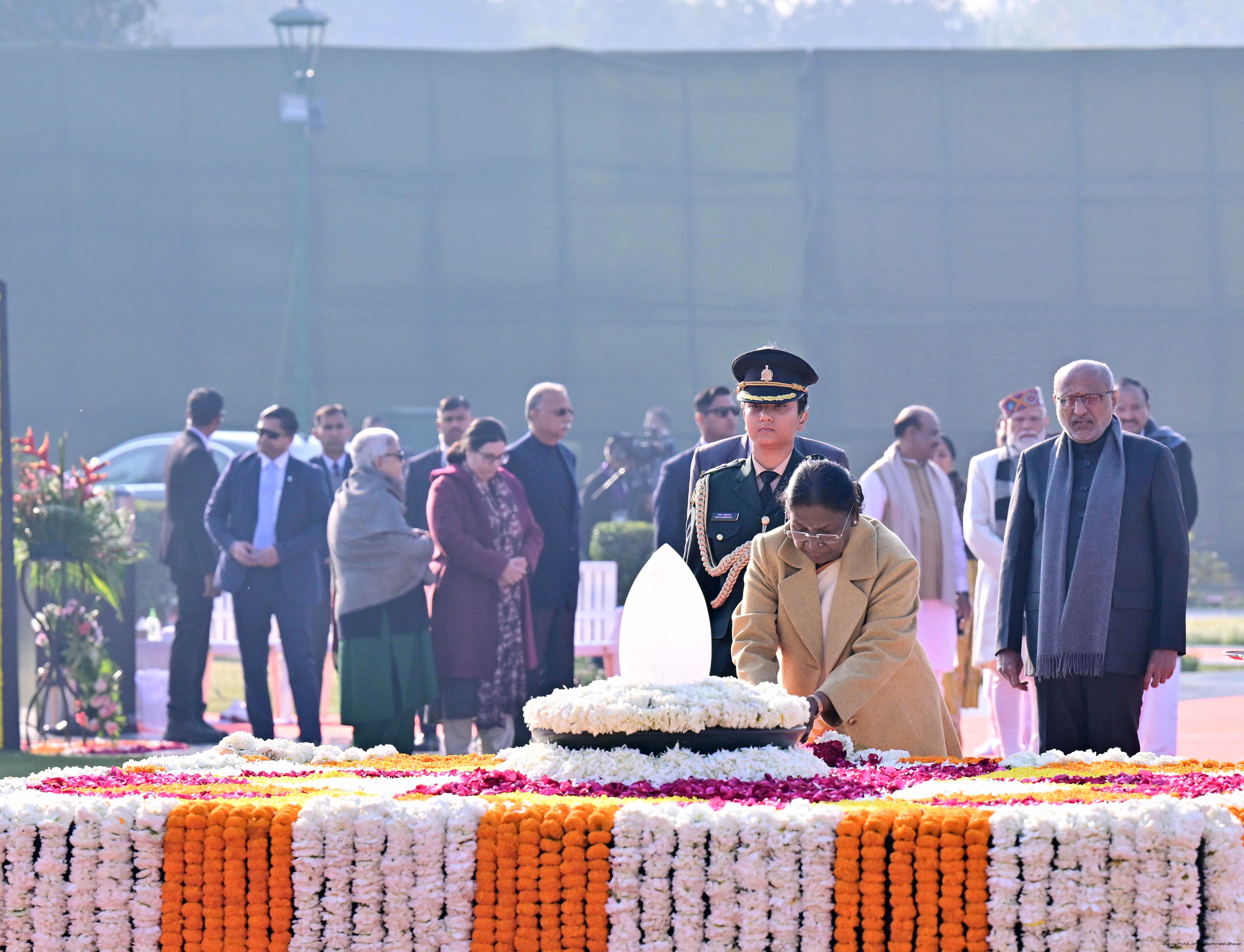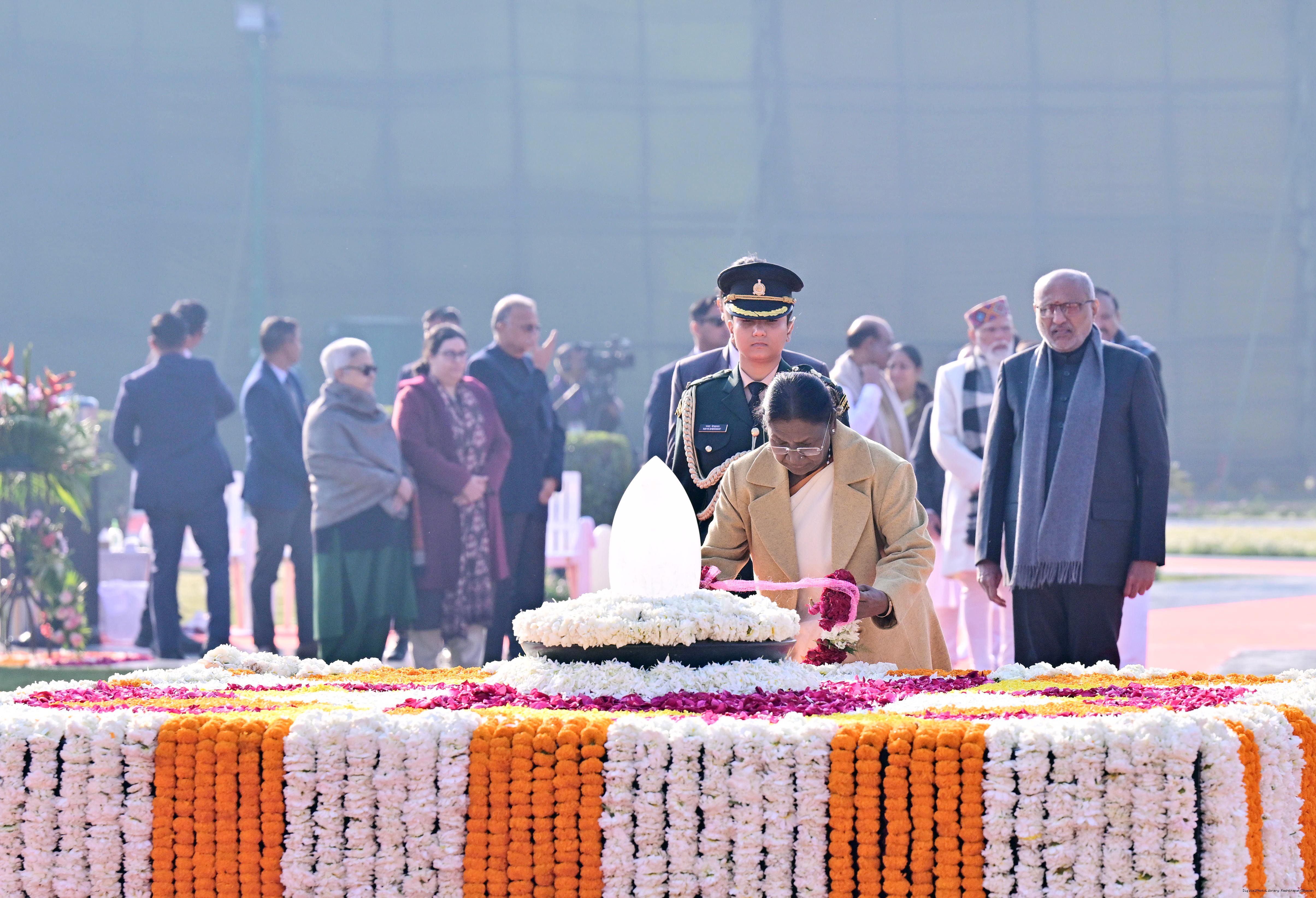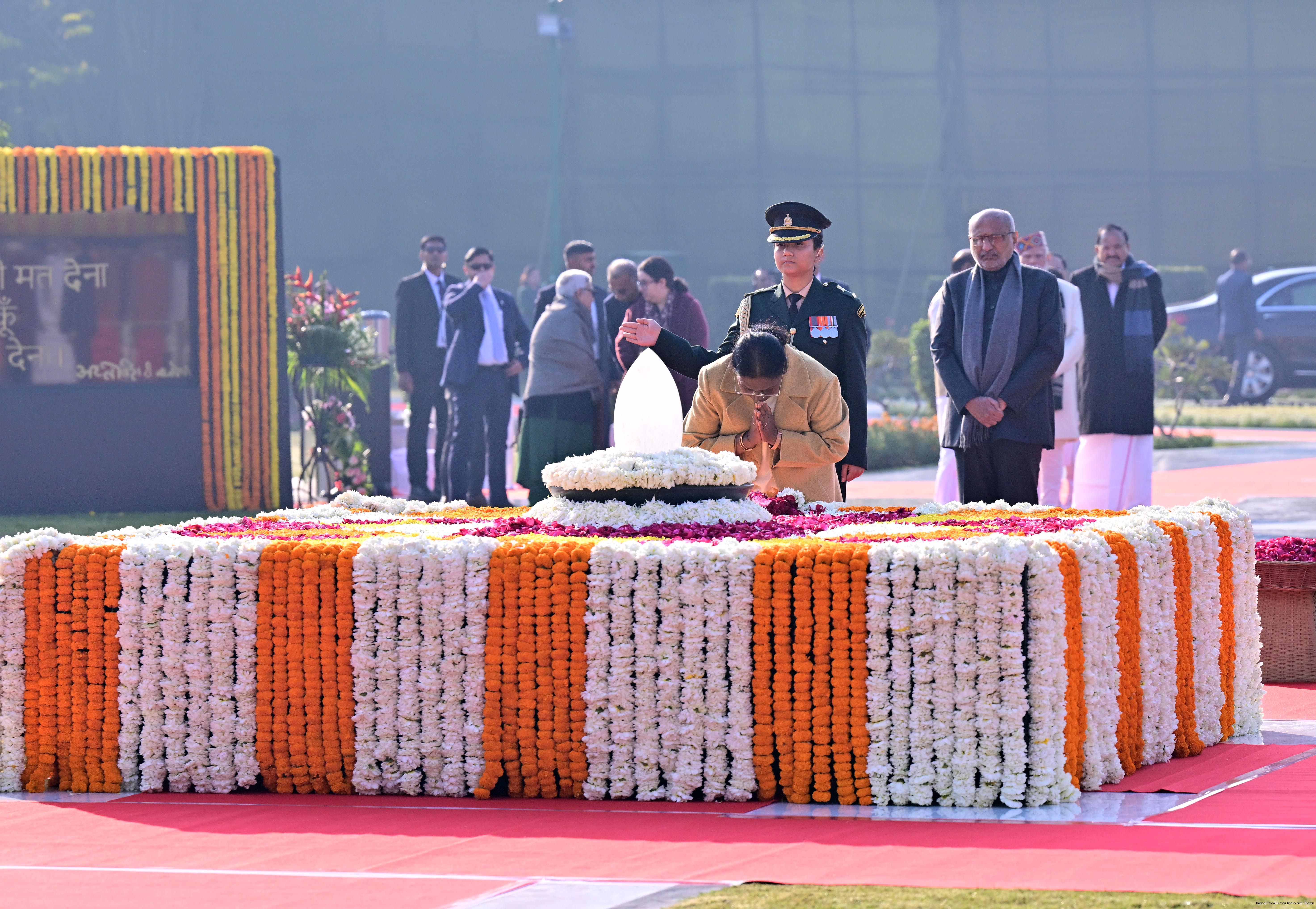 | Caption: | The President of India, Smt. Droupadi Murmu paid floral tributes to former Prime Minister of India Shri Atal Bihari Vajpayee on his birth anniversary at his Samadhi 'Sadaiv Atal' in New Delhi on December 25, 2025. |