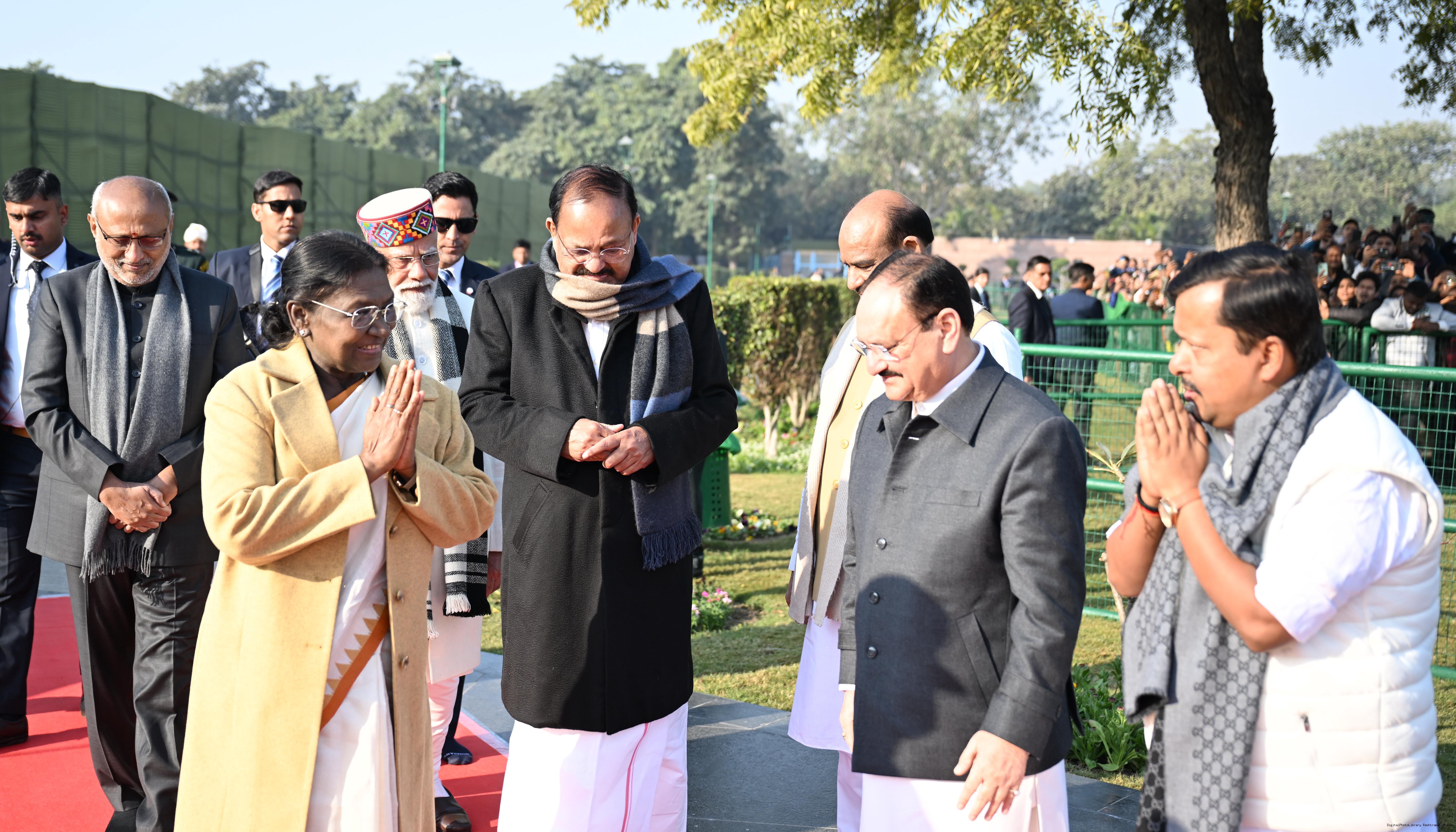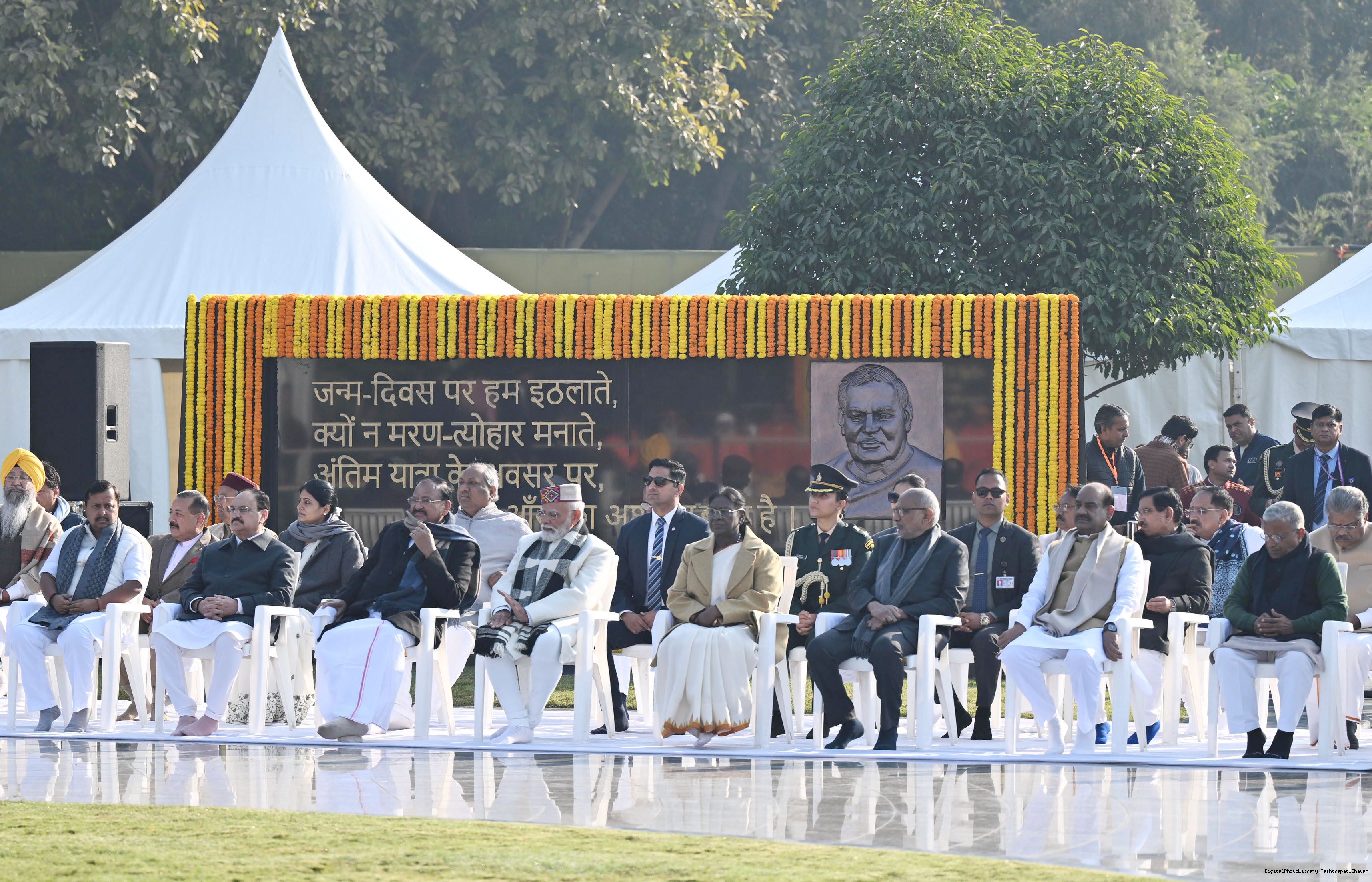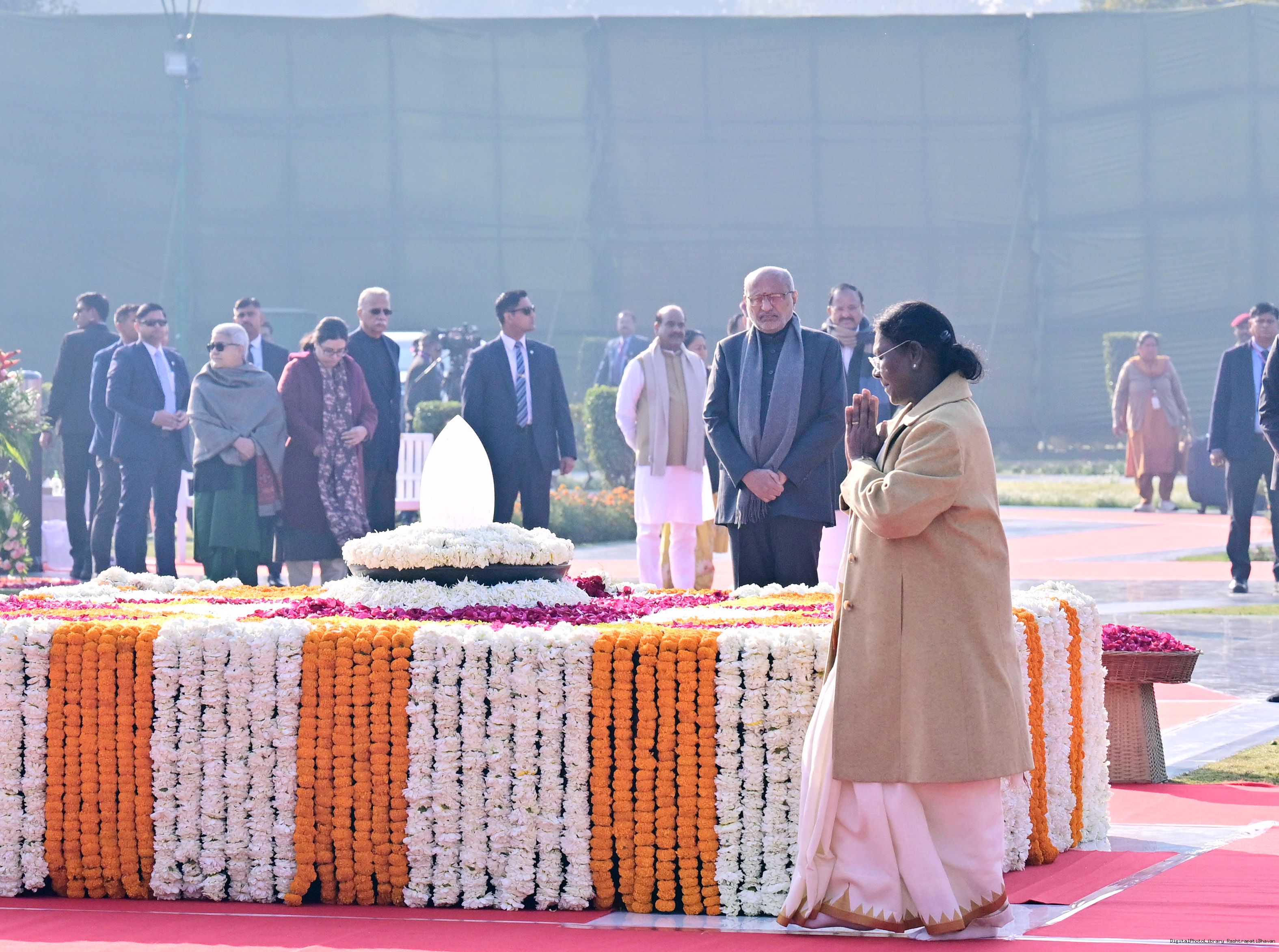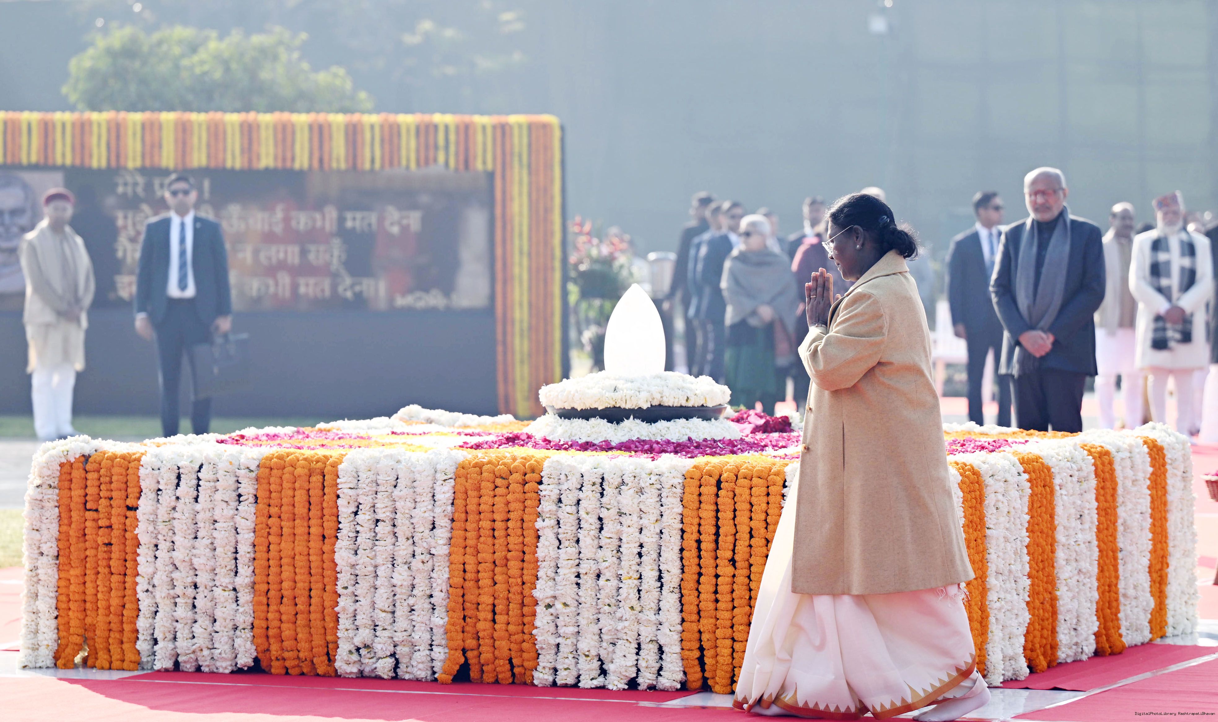 | Caption: | The President of India, Smt. Droupadi Murmu paid floral tributes to former Prime Minister of India Shri Atal Bihari Vajpayee on his birth anniversary at his Samadhi 'Sadaiv Atal' in New Delhi on December 25, 2025. |
