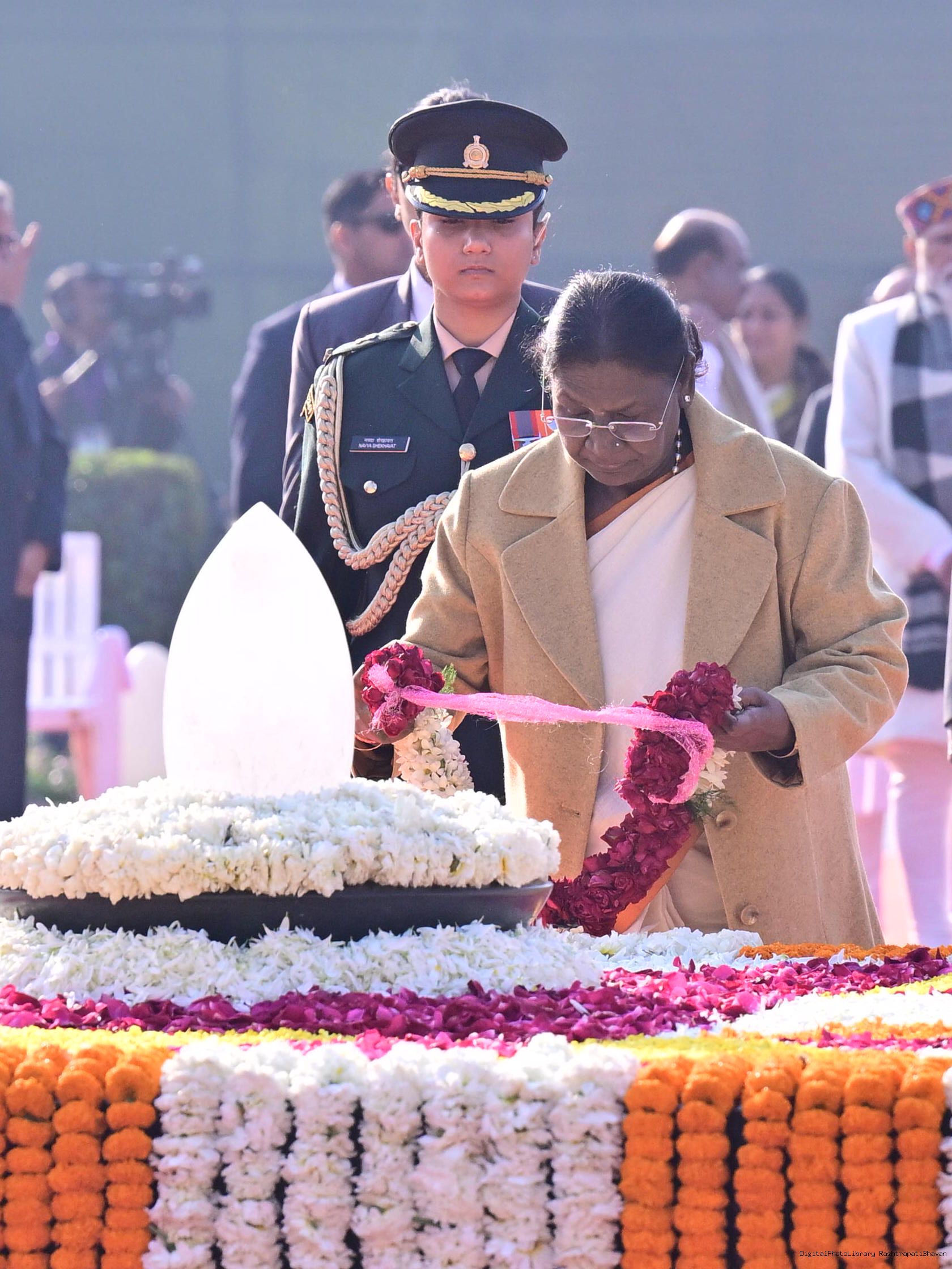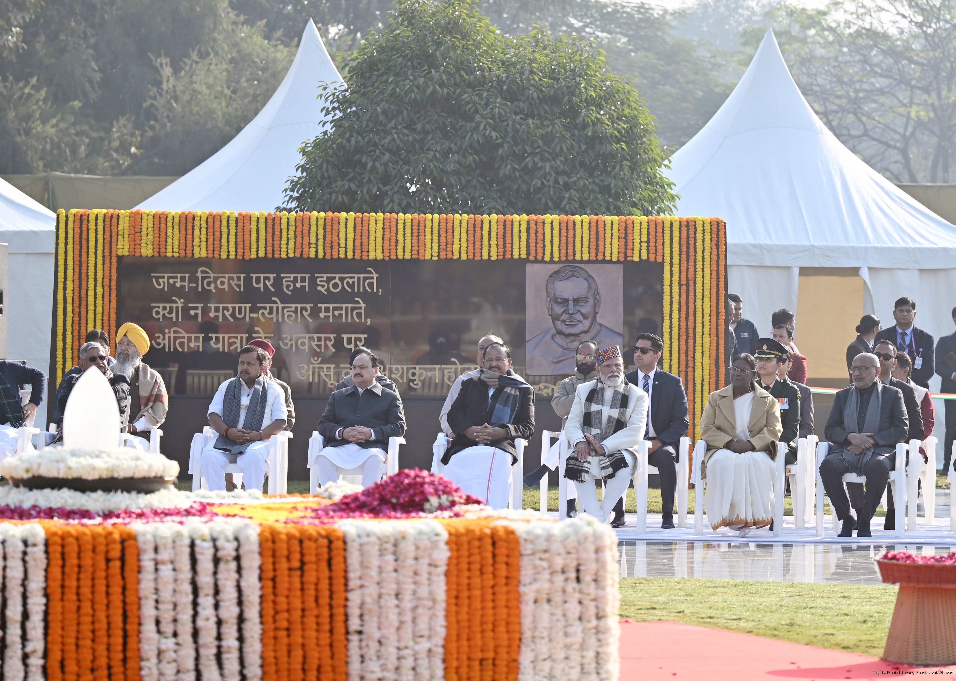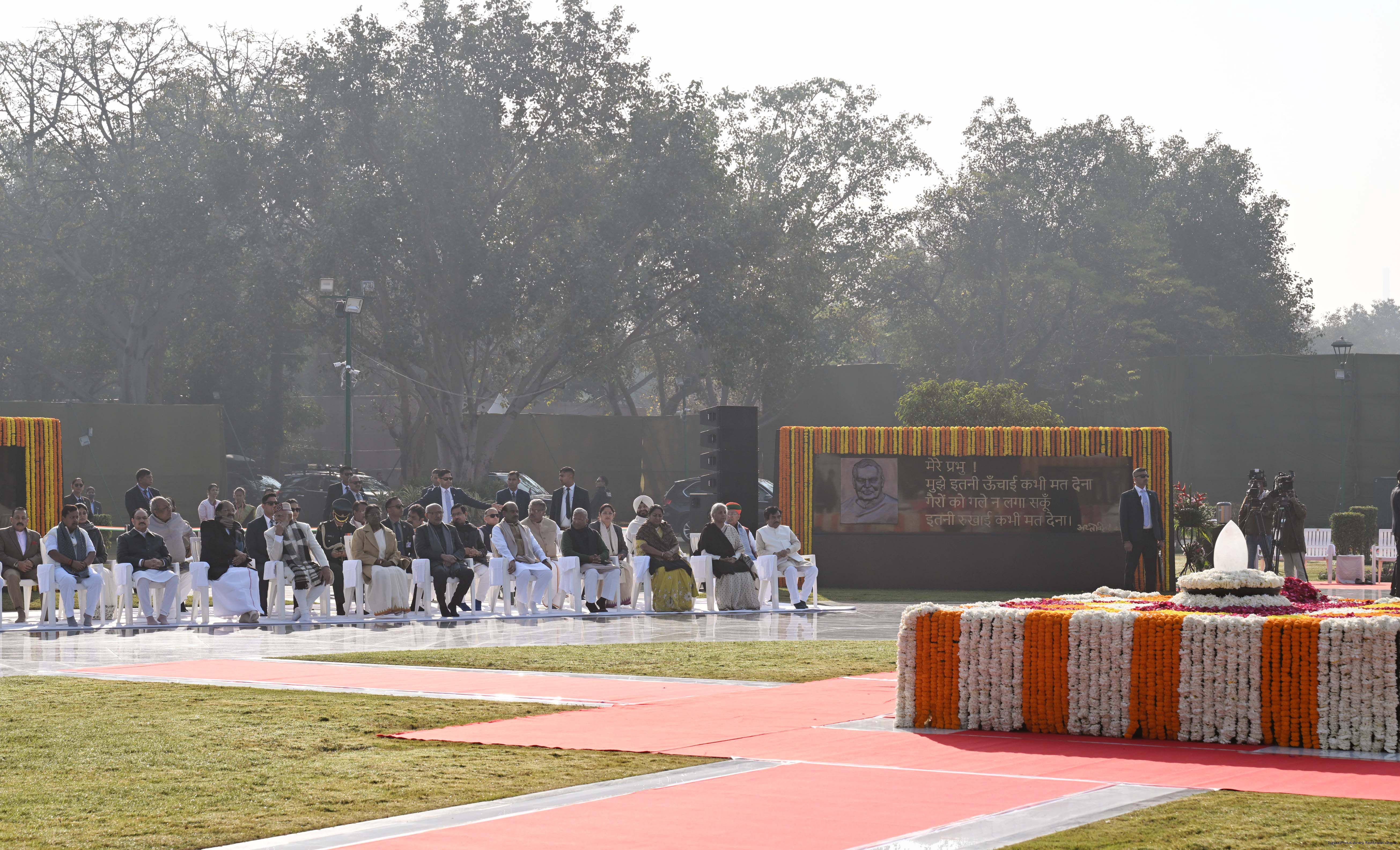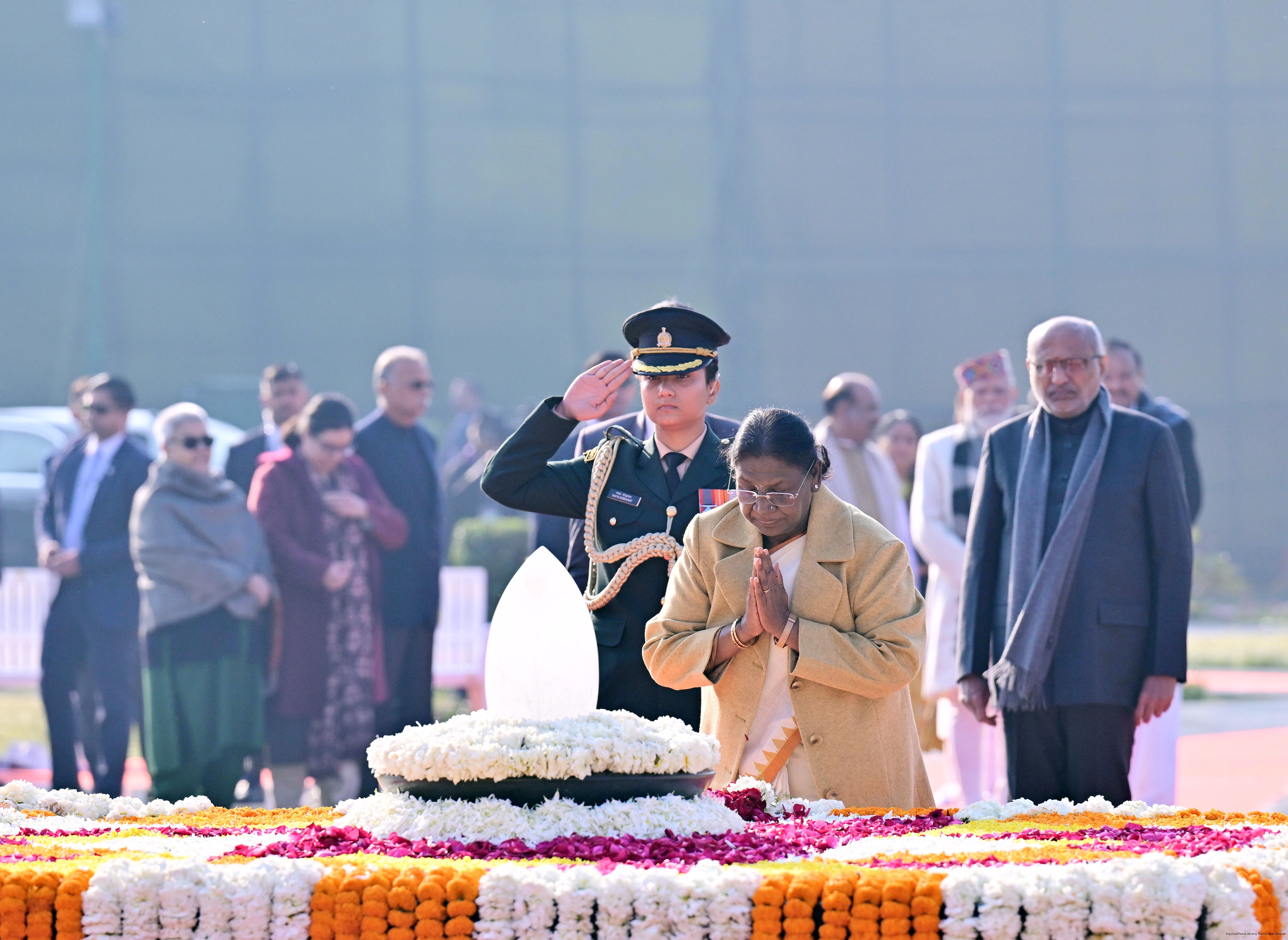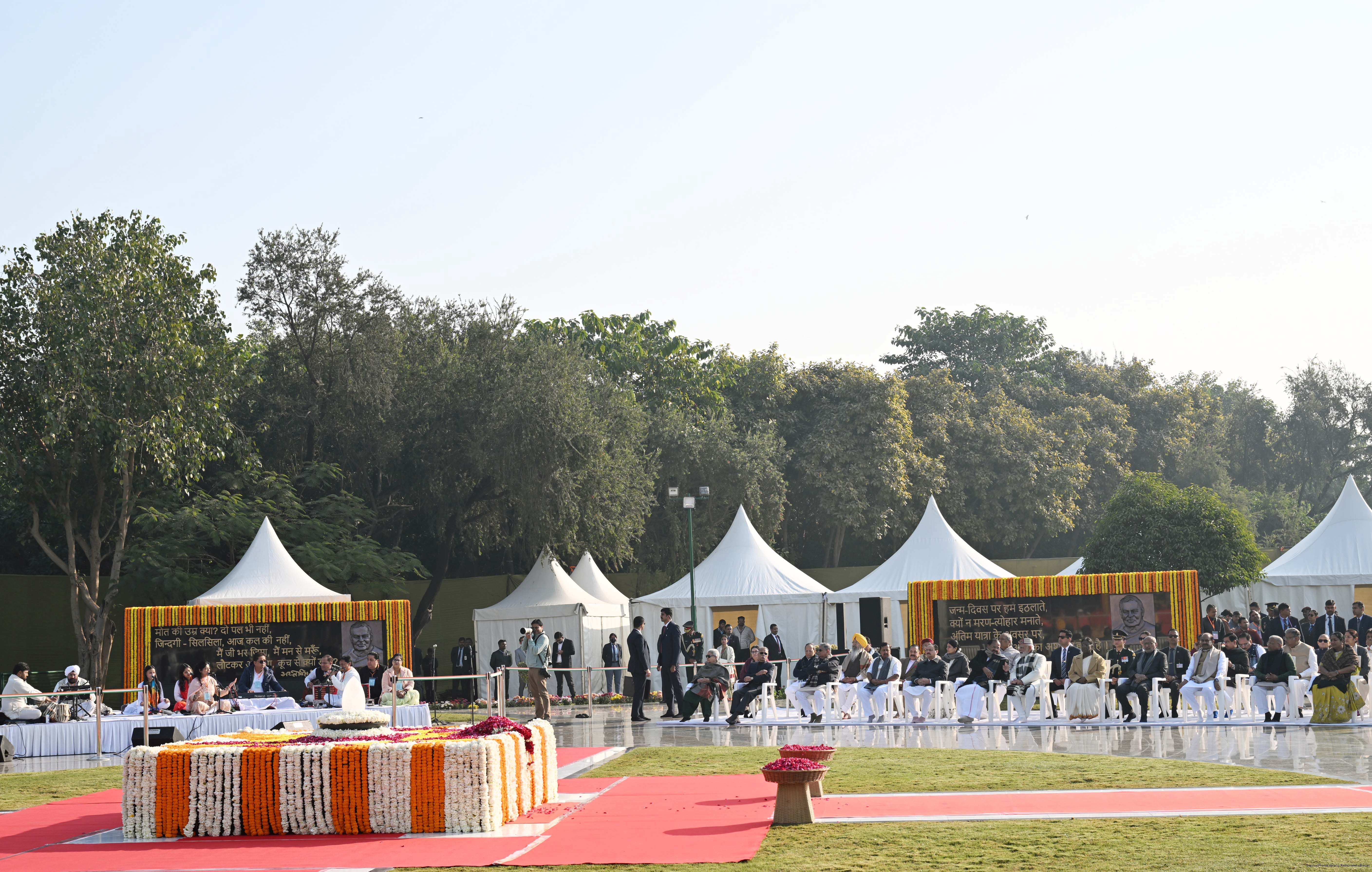 | Caption: | The President of India, Smt. Droupadi Murmu paid floral tributes to former Prime Minister of India Shri Atal Bihari Vajpayee on his birth anniversary at his Samadhi 'Sadaiv Atal' in New Delhi on December 25, 2025. |