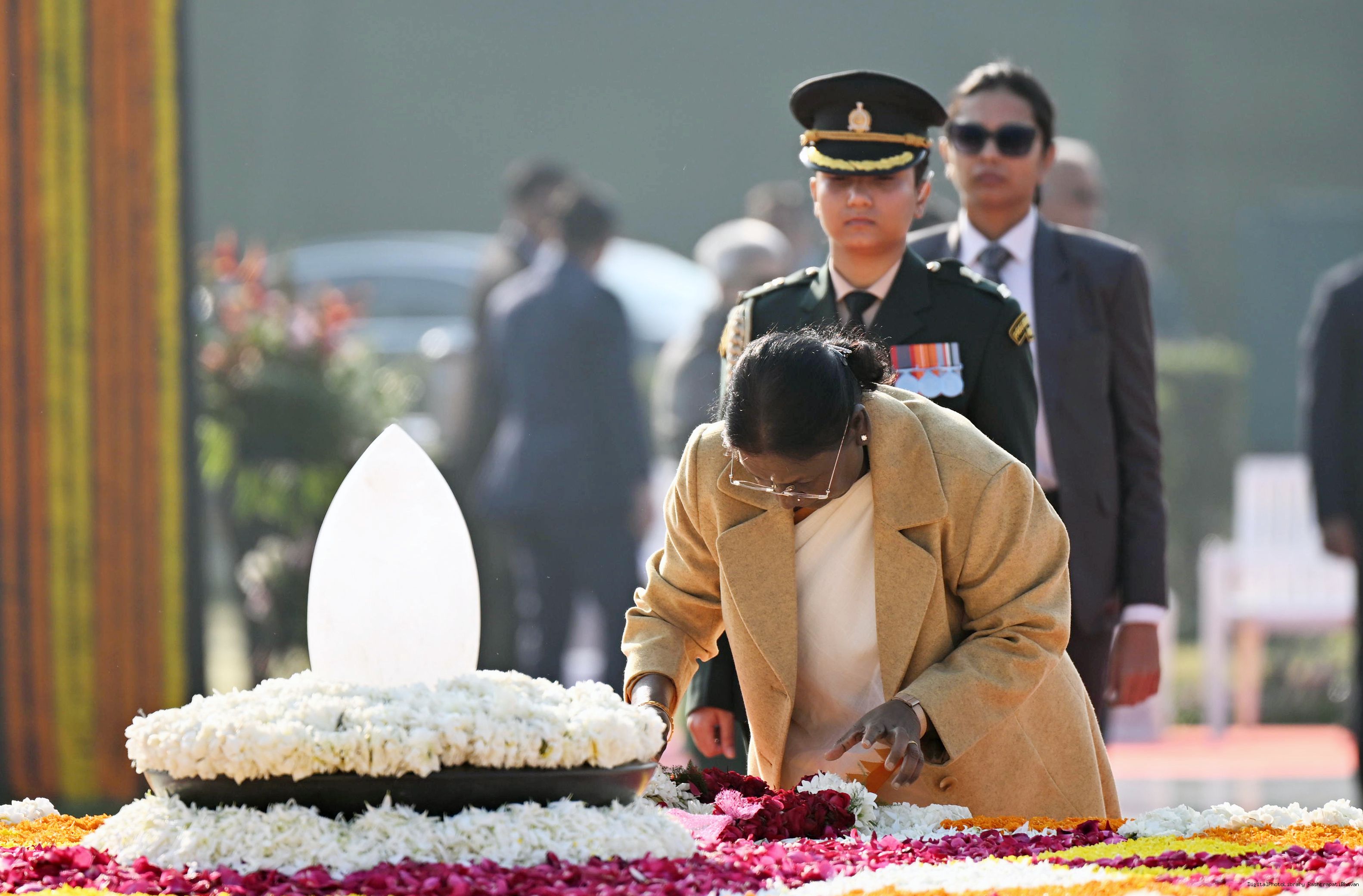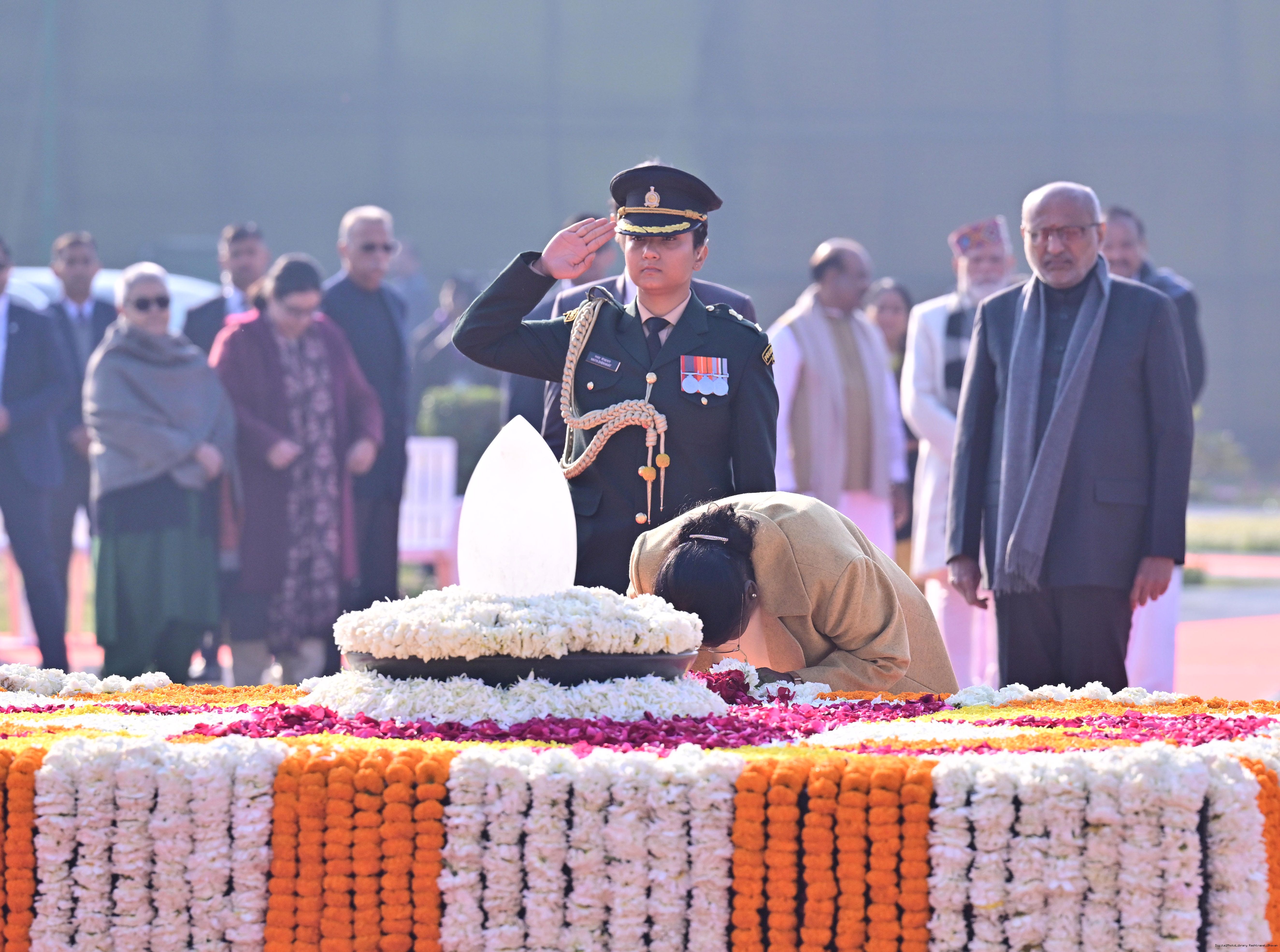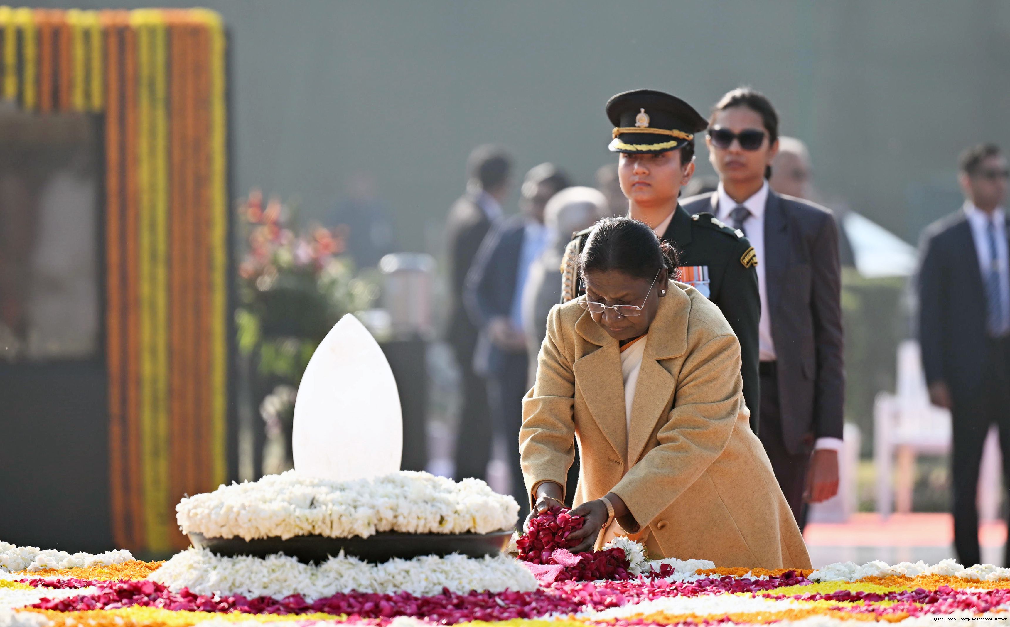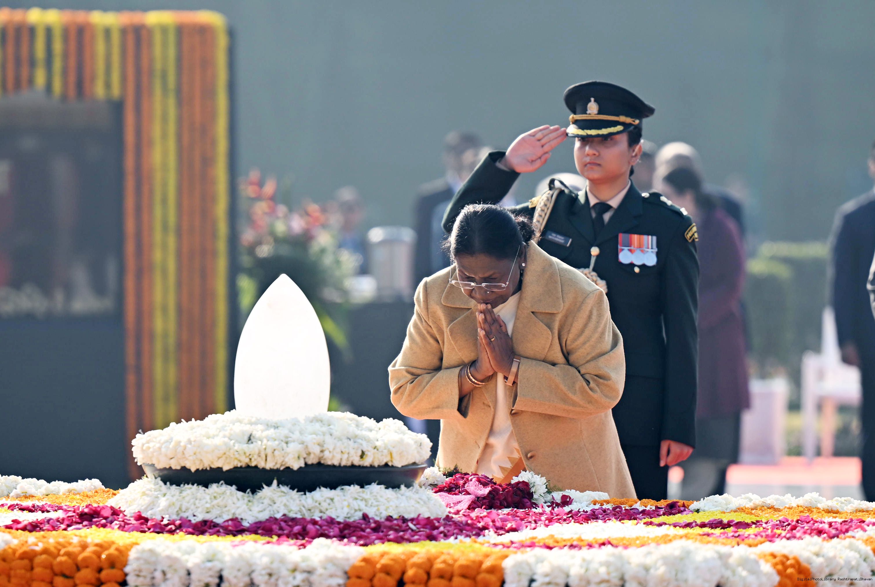 | Caption: | The President of India, Smt. Droupadi Murmu paid floral tributes to former Prime Minister of India Shri Atal Bihari Vajpayee on his birth anniversary at his Samadhi 'Sadaiv Atal' in New Delhi on December 25, 2025. |