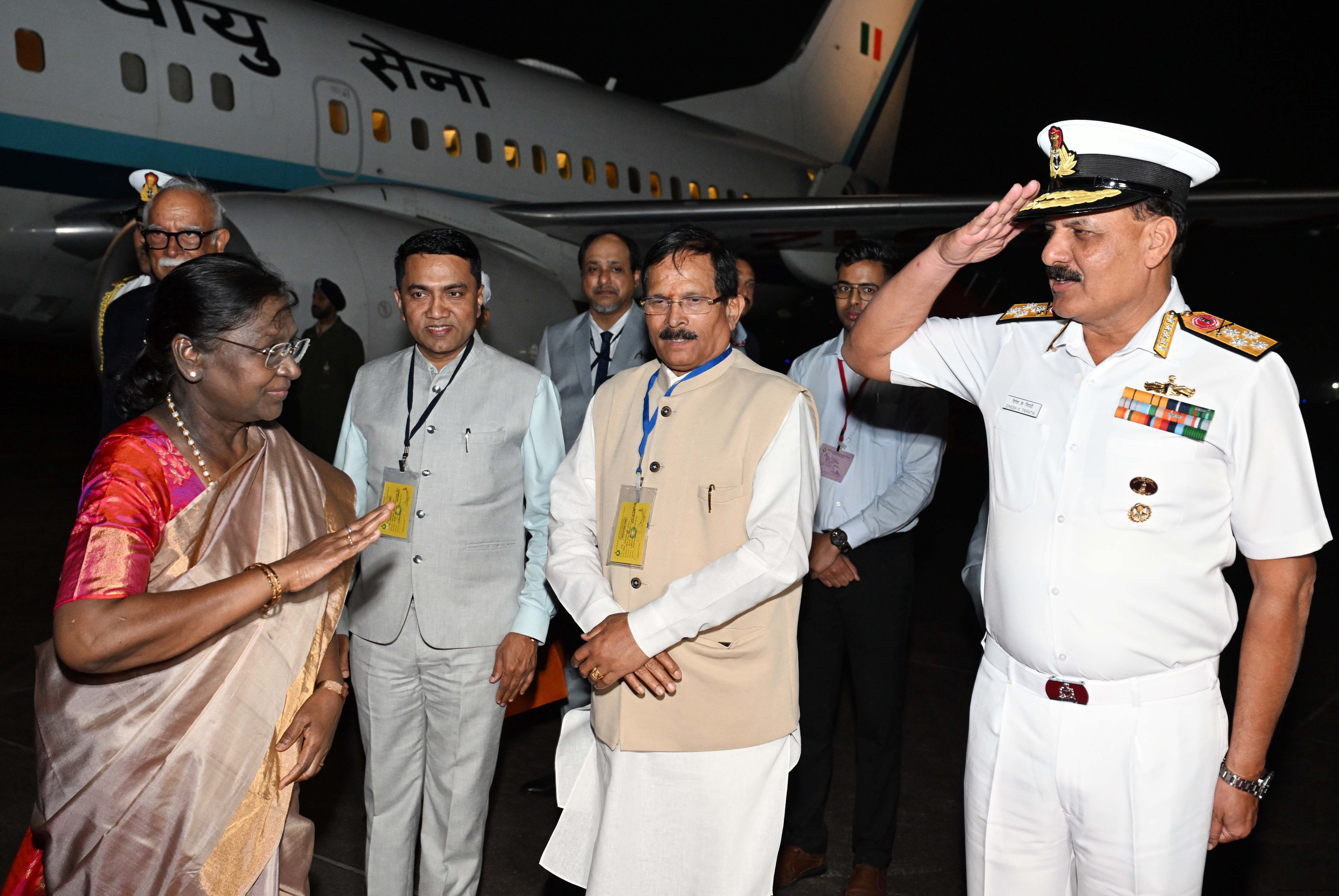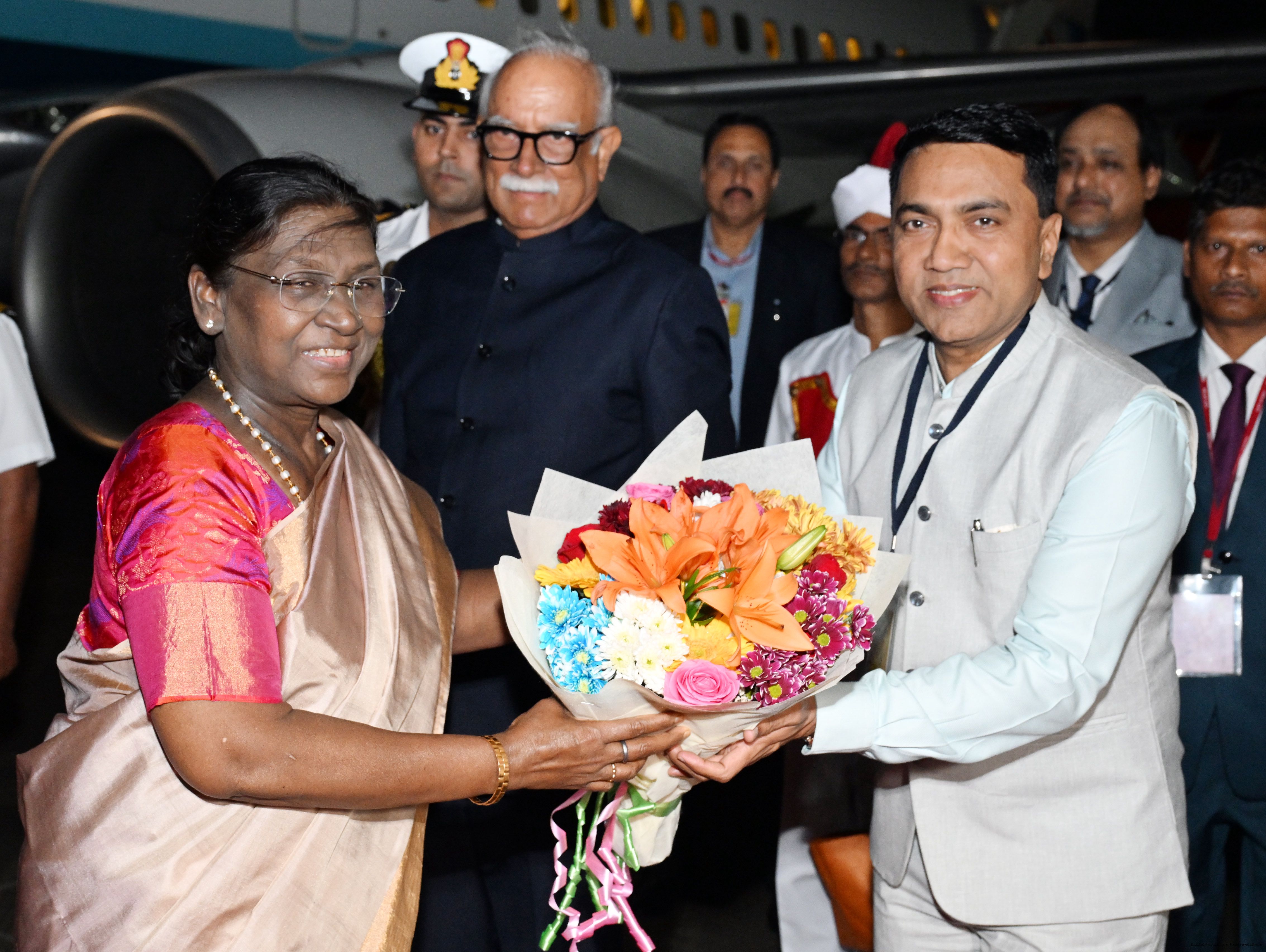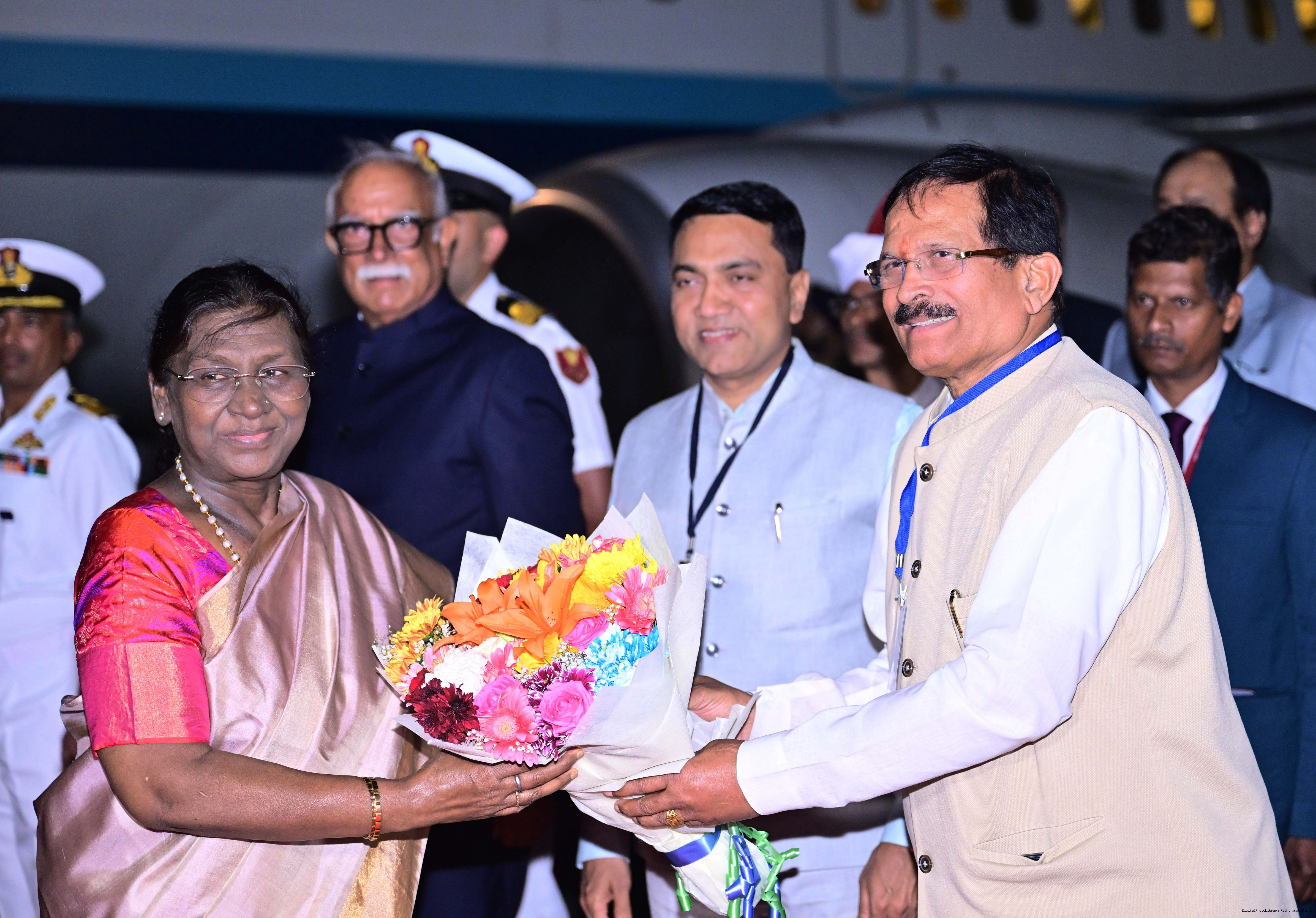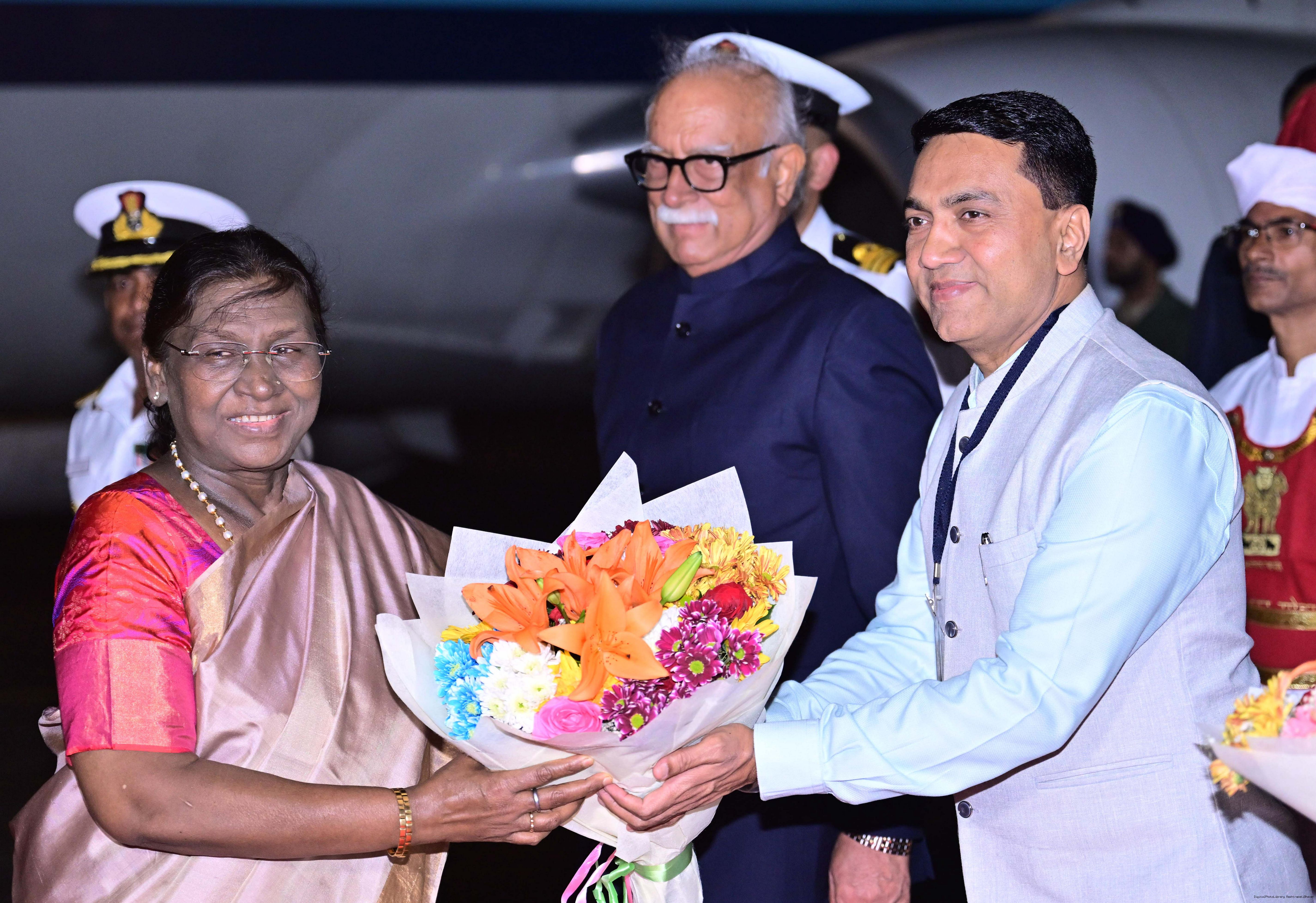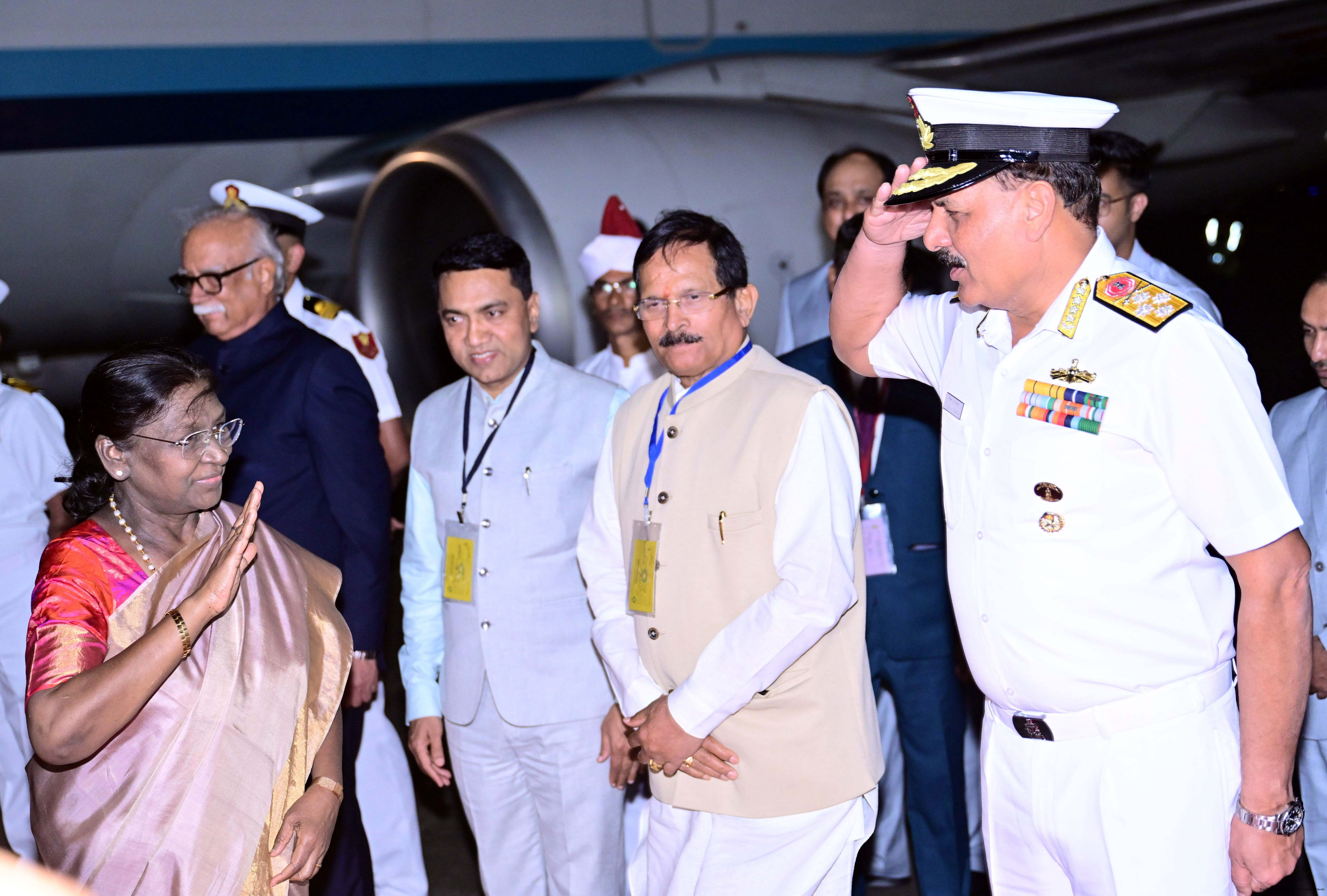 The Governor of Goa, Shri Pusapati Ashok Gajapathi Raju, Chief Minister Dr. Pramod Sawant, Union Minister of State for Power and New and Renewable Energy Shri Shripad Yesso Naik and Chief of the Naval Staff Admiral Dinesh K. Tripathi received the President of India, Smt. Droupadi Murmu on her arrival at Dabolim airport, Goa on December 27, 2025. |