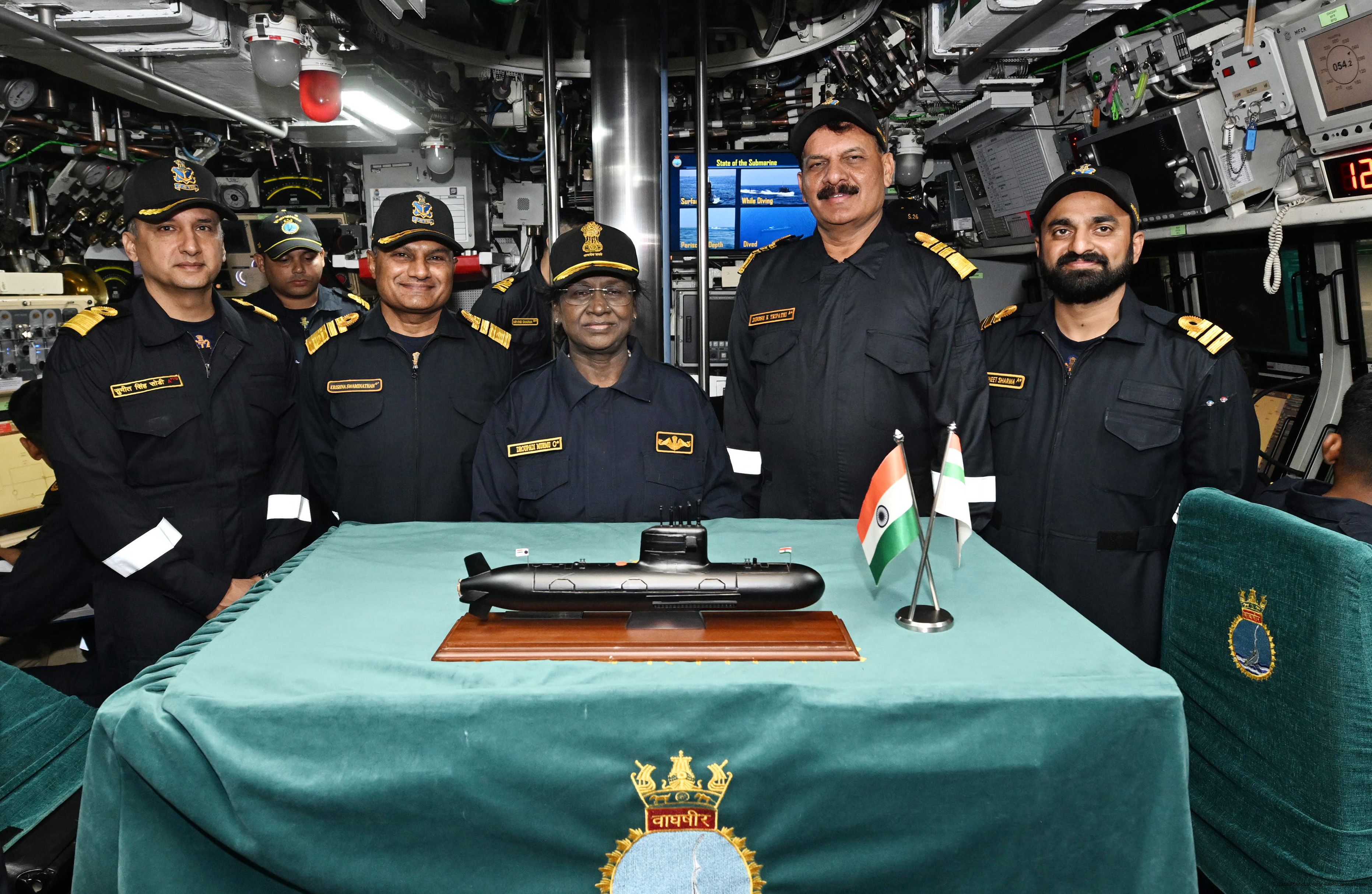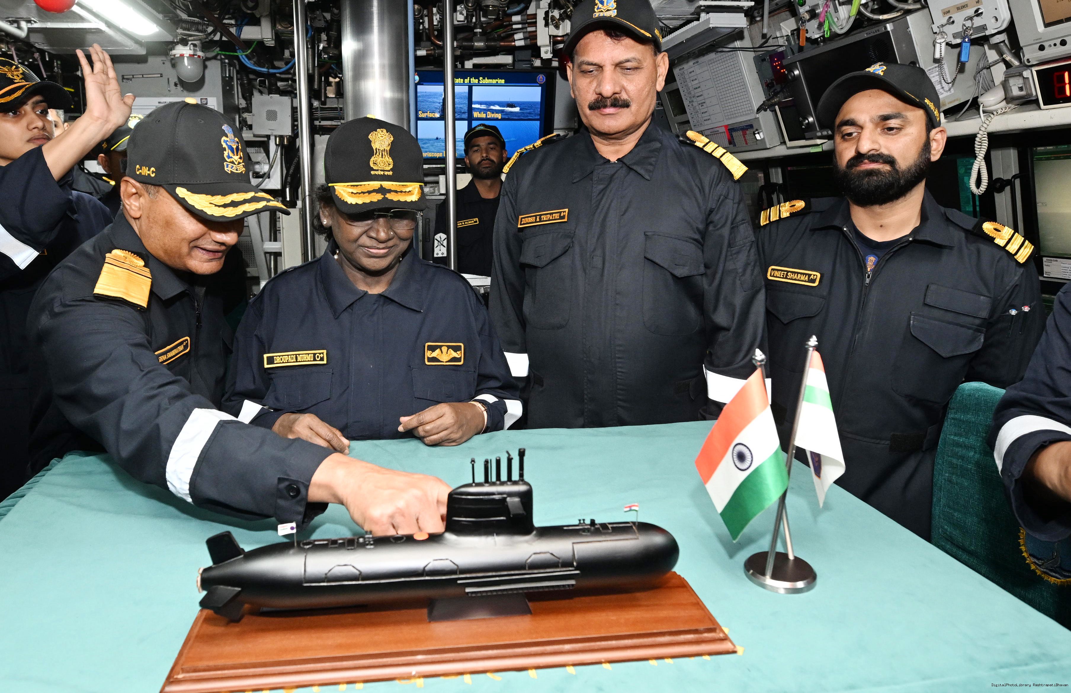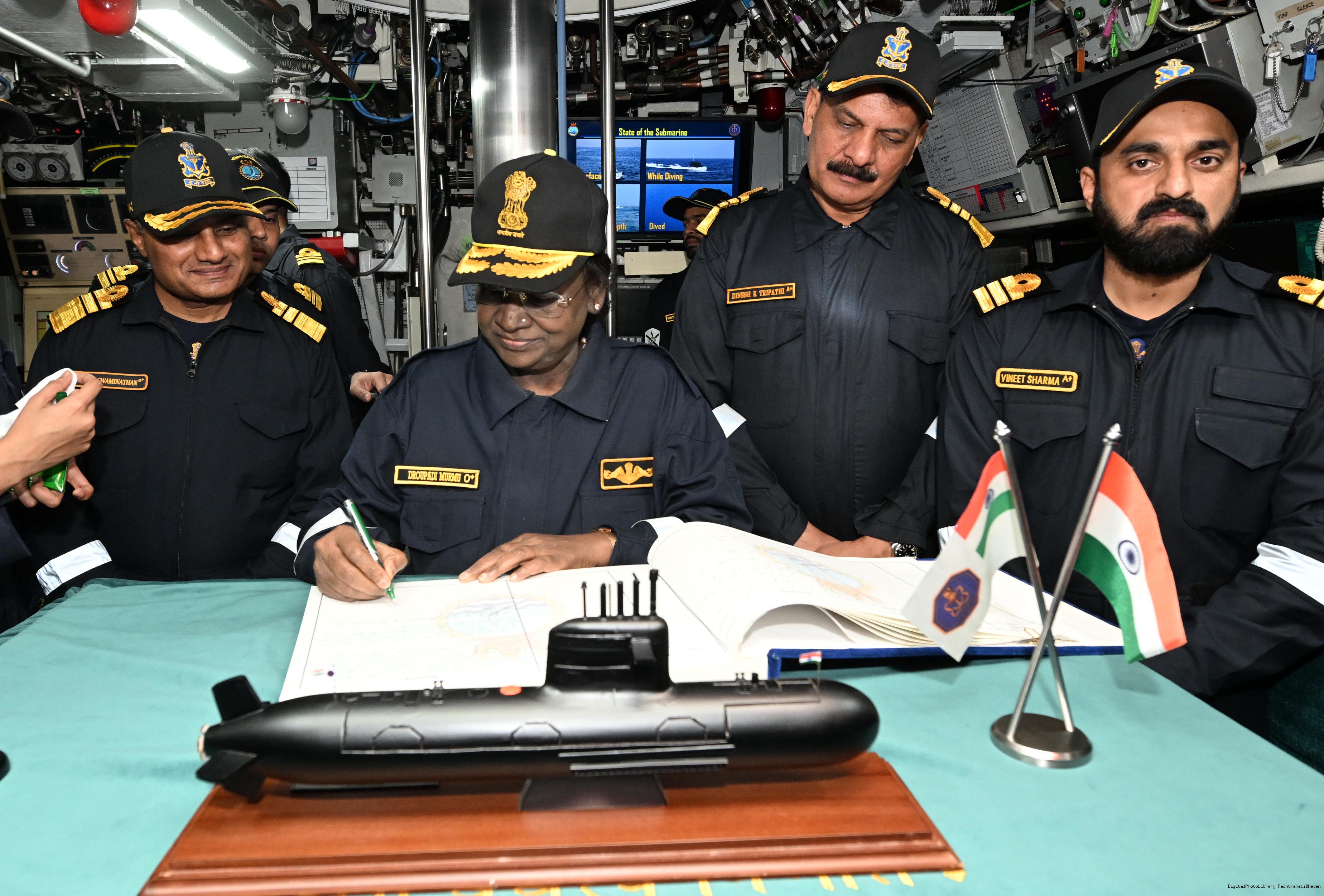 | Caption: | The President of India, Smt Droupadi Murmu undertook a dived sortie onboard Submarine – INS Vaghsheer on Western Seaboard at Karwar Naval Harbour, Karnataka on December 28, 2025. |