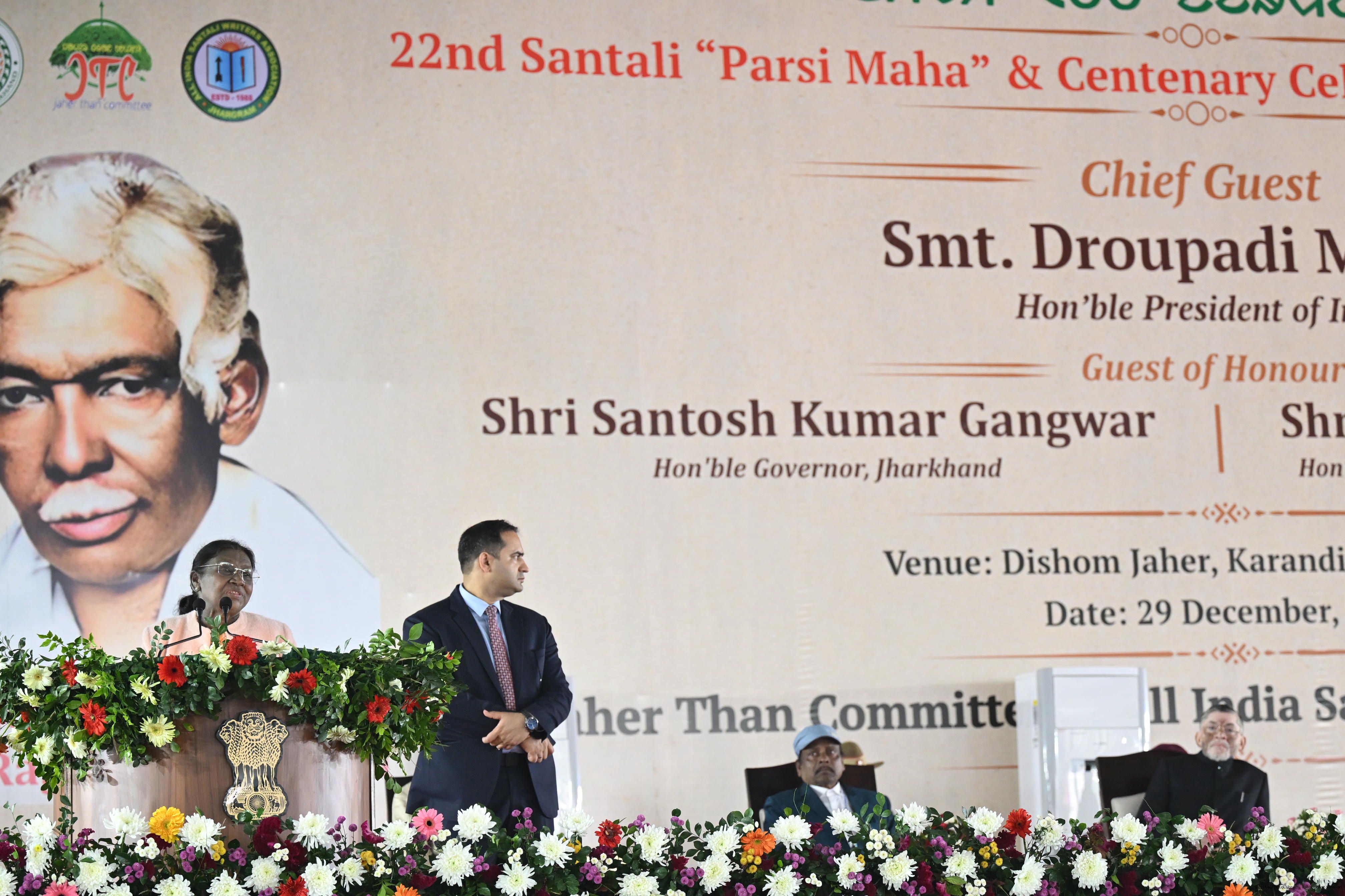 | Caption: | The President of India, Smt Droupadi Murmu addressed the closing ceremony of the 22nd Parsi Maha and the centenary celebrations of Ol Chiki at Jamshedpur, Jharkhand on December 29, 2025. |