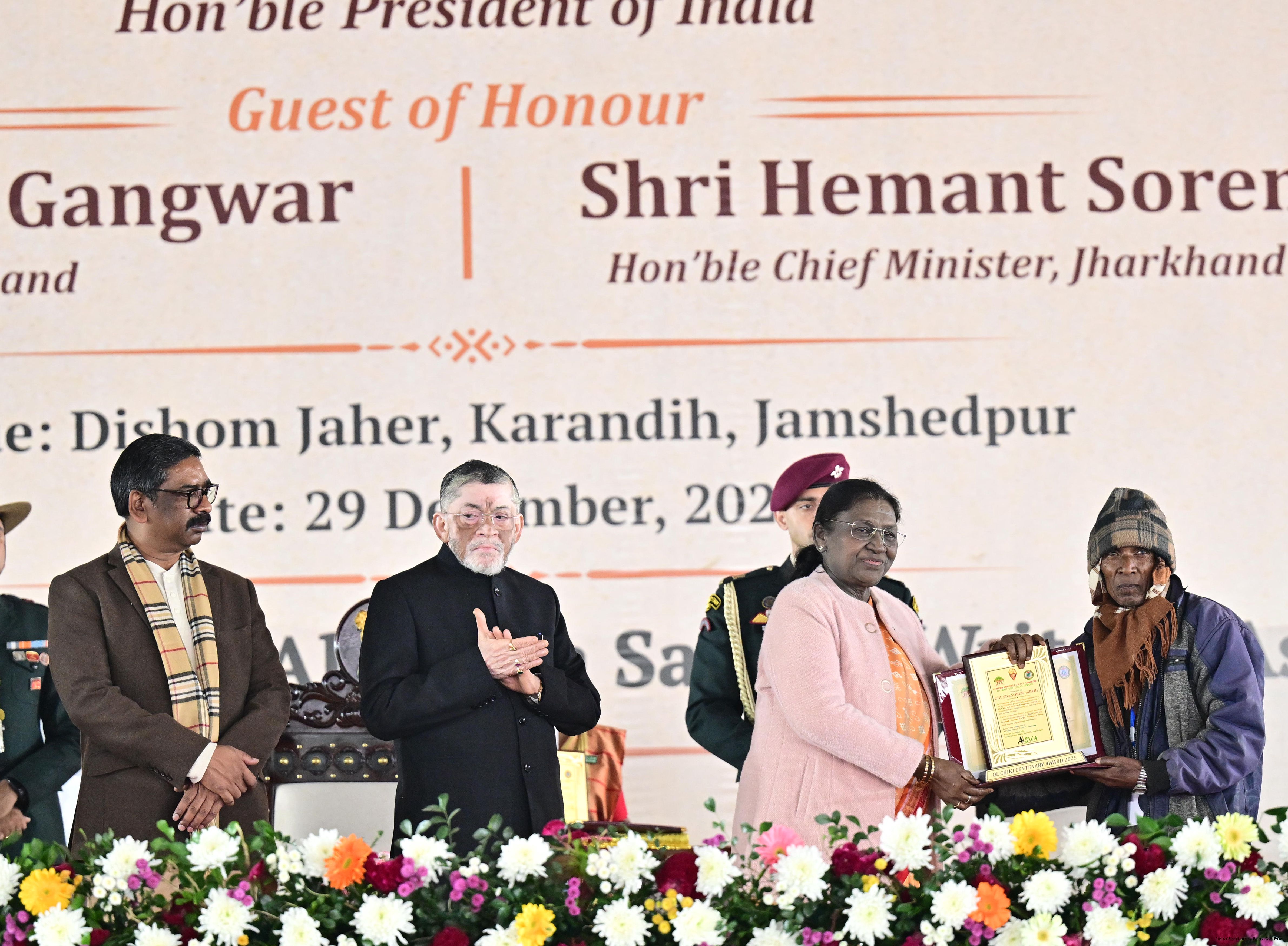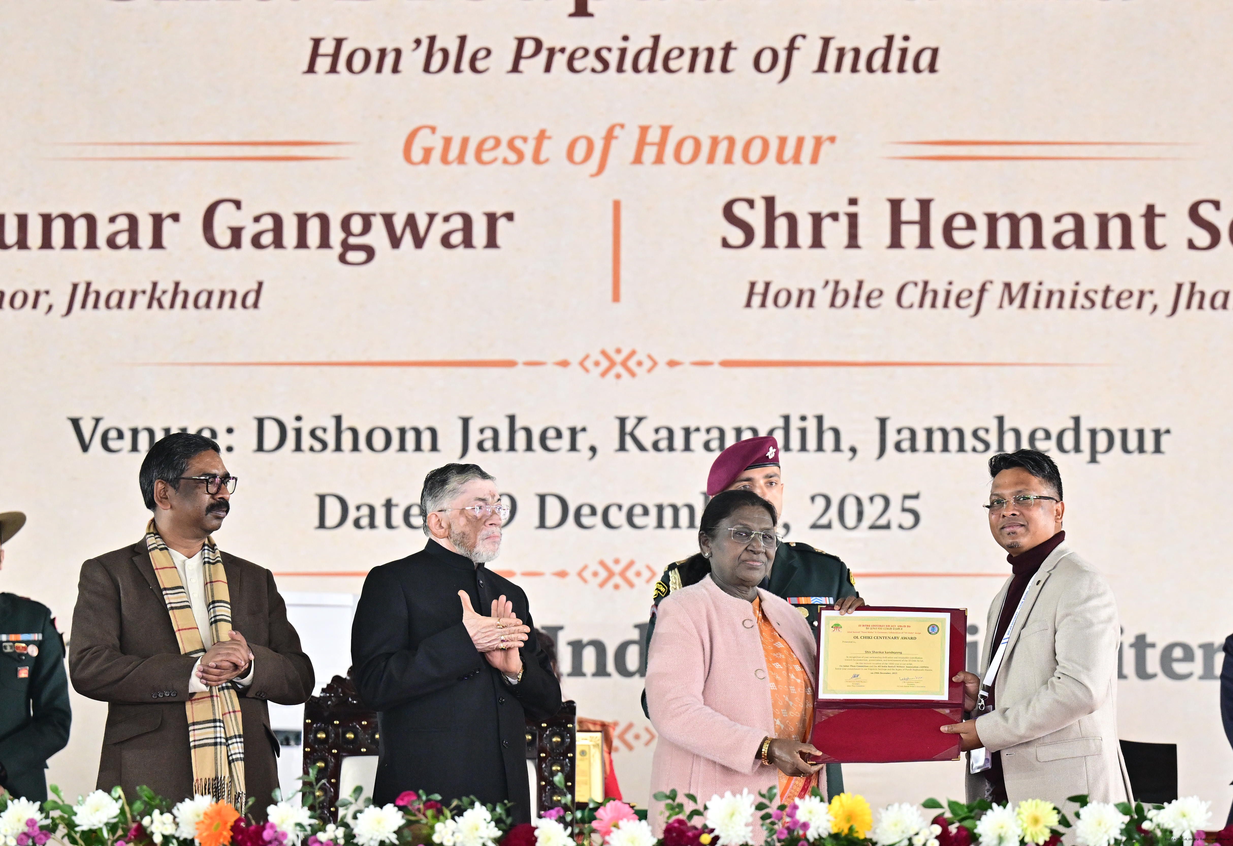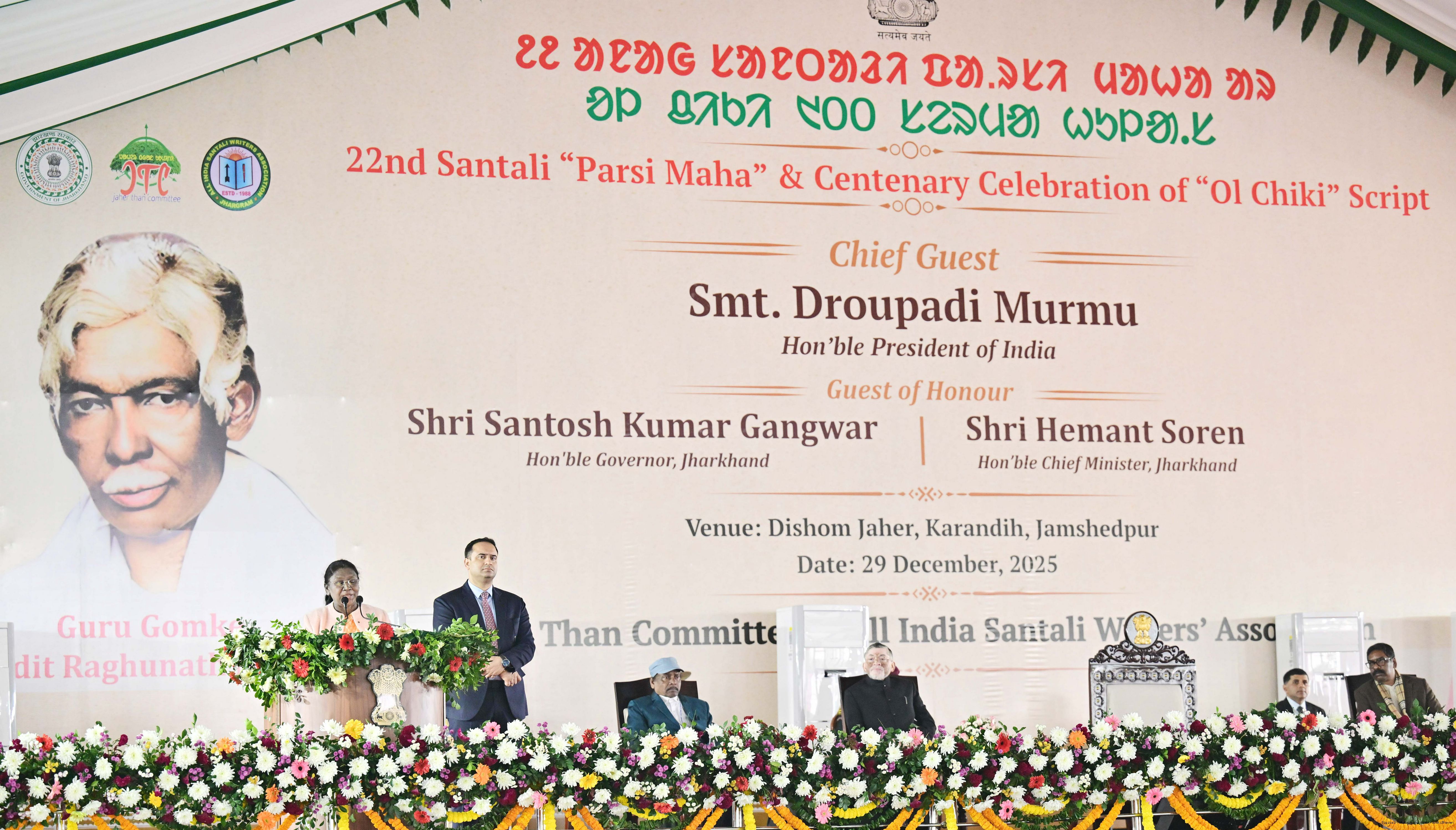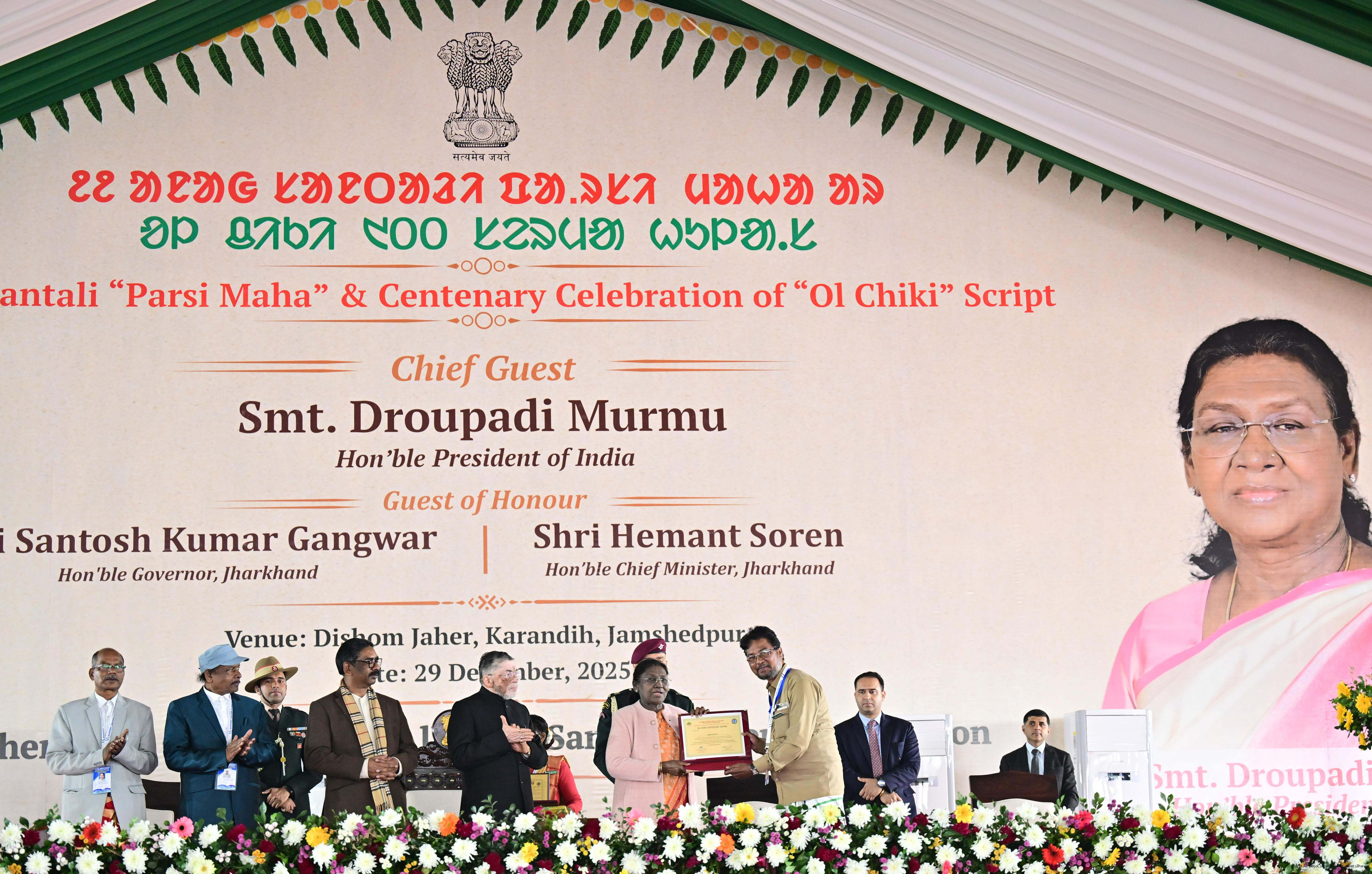 | Caption: | The President of India, Smt Droupadi Murmu addressed the closing ceremony of the 22nd Parsi Maha and the centenary celebrations of Ol Chiki at Jamshedpur, Jharkhand on December 29, 2025. |