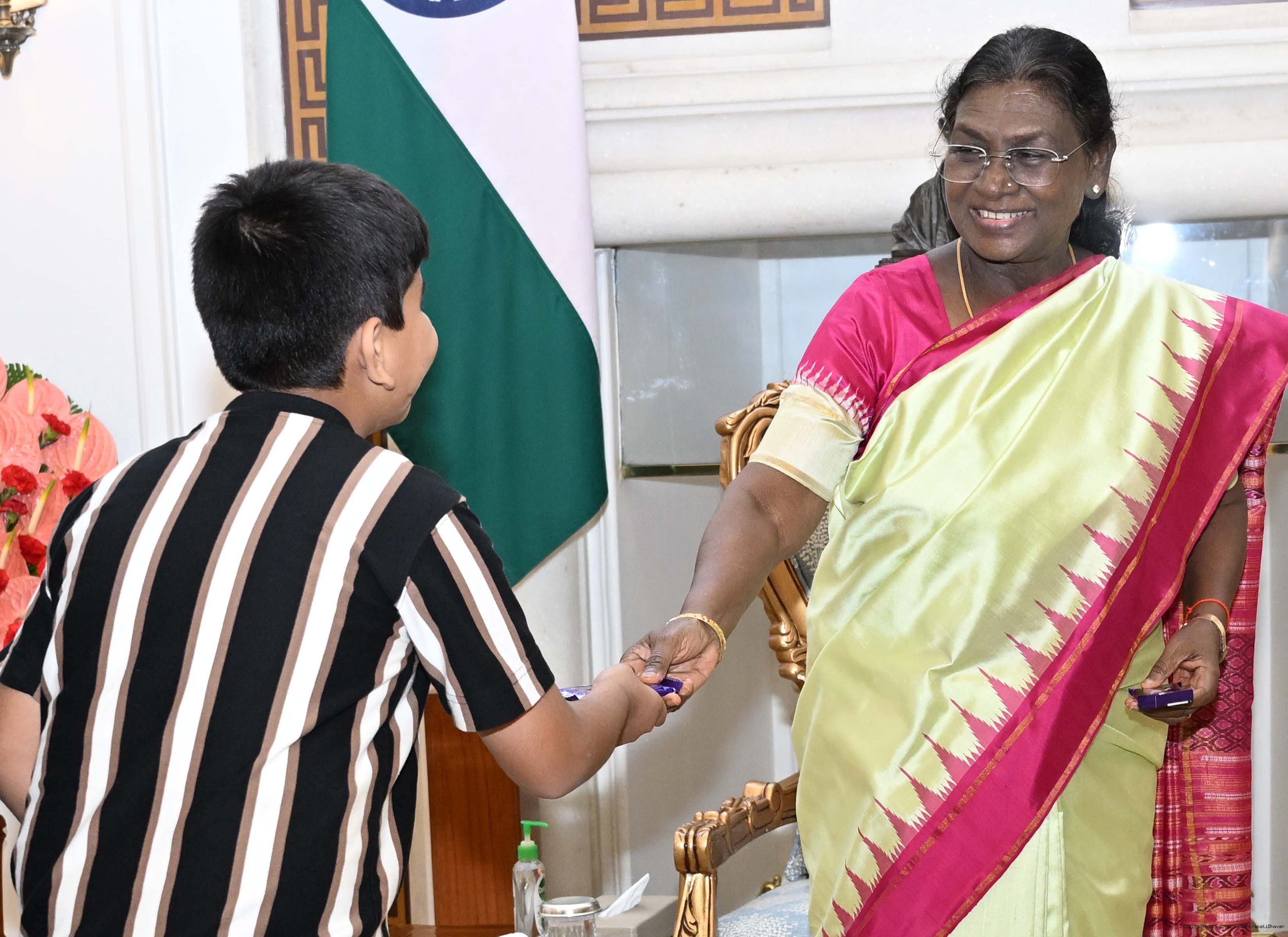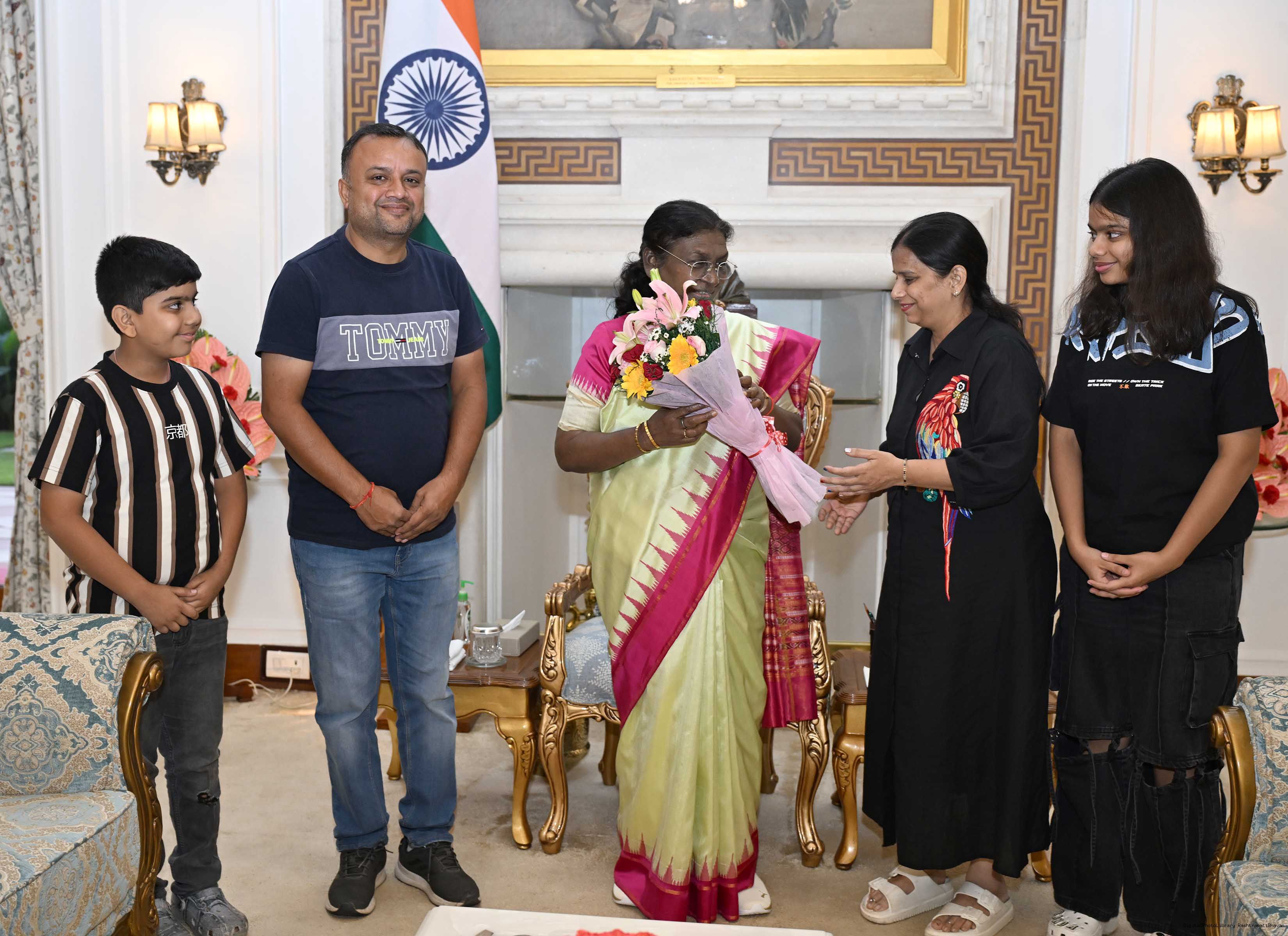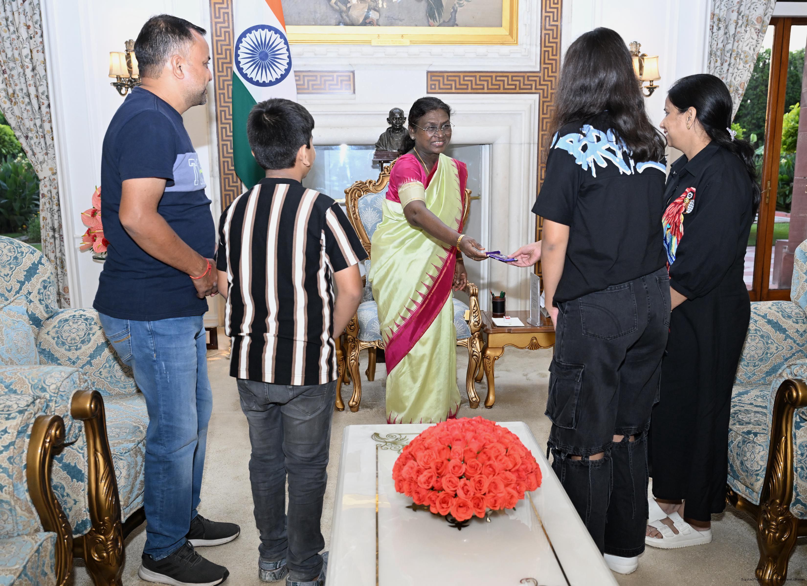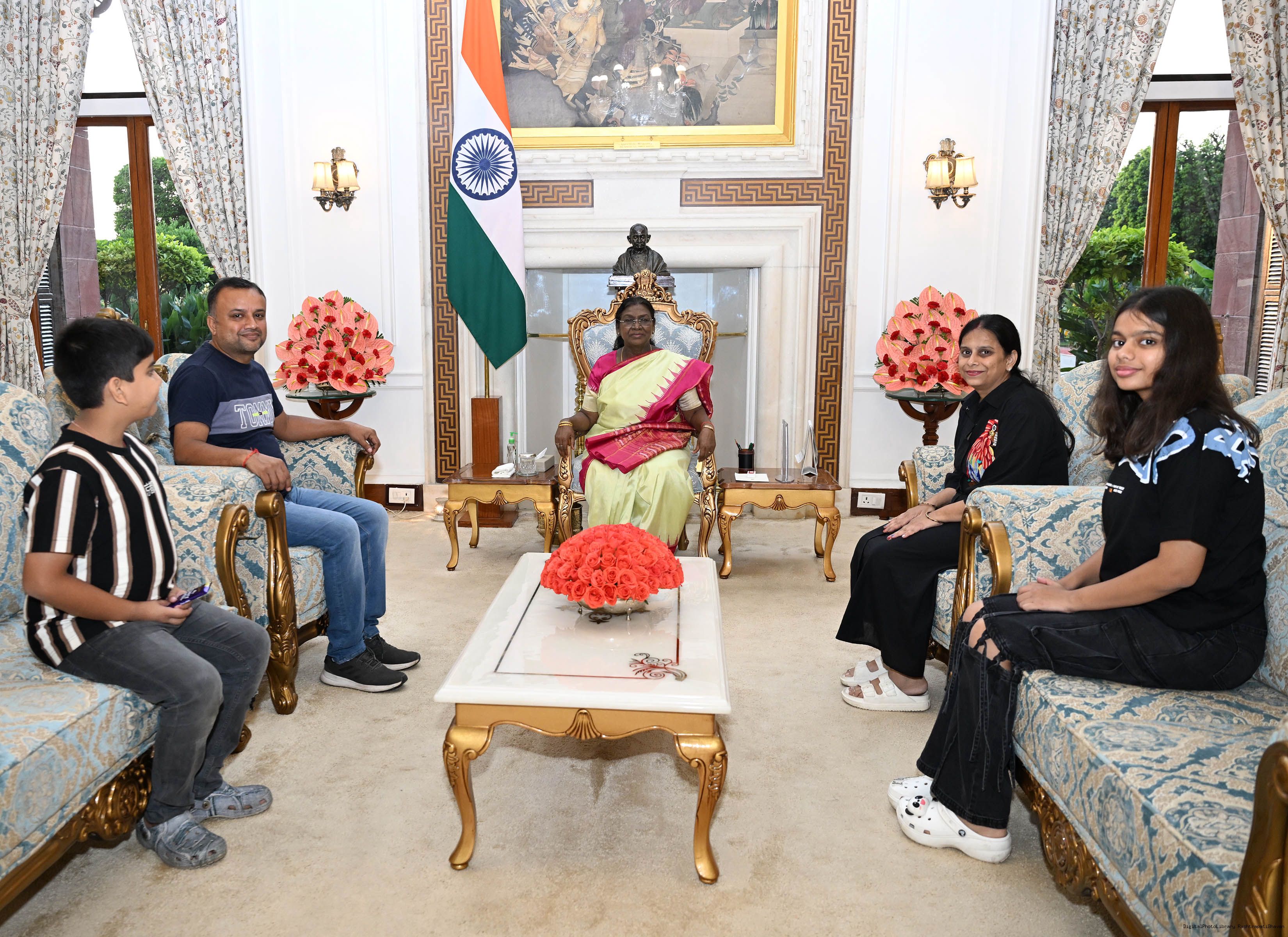 | Caption: | Smt. Khushbu Agarwal from Rairangpur, Mayurbhanj, Odisha along with Family members meeting with the President of India, Smt. Droupadi Murmu at Rashtrapati Bhavan on September 23, 2025. |