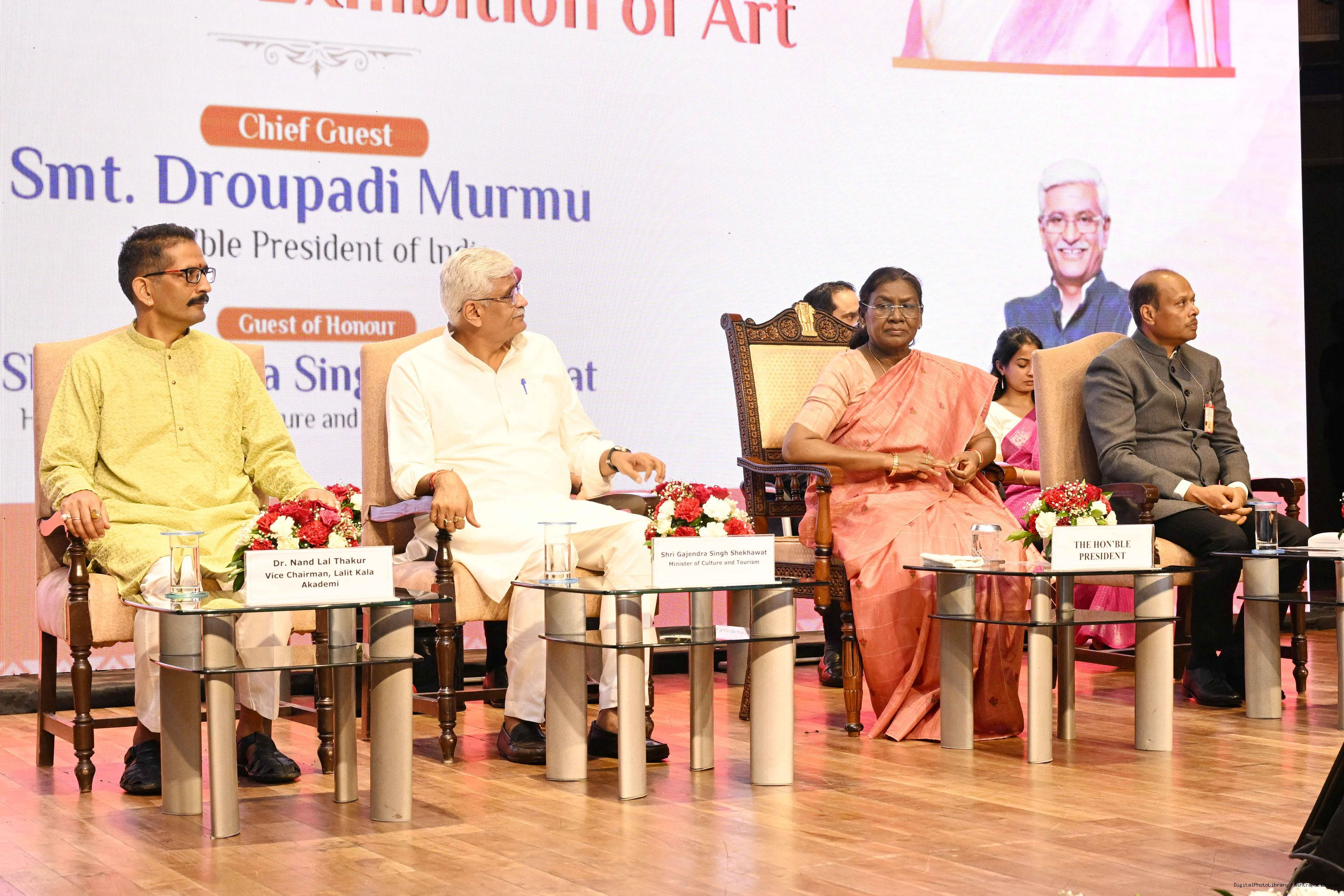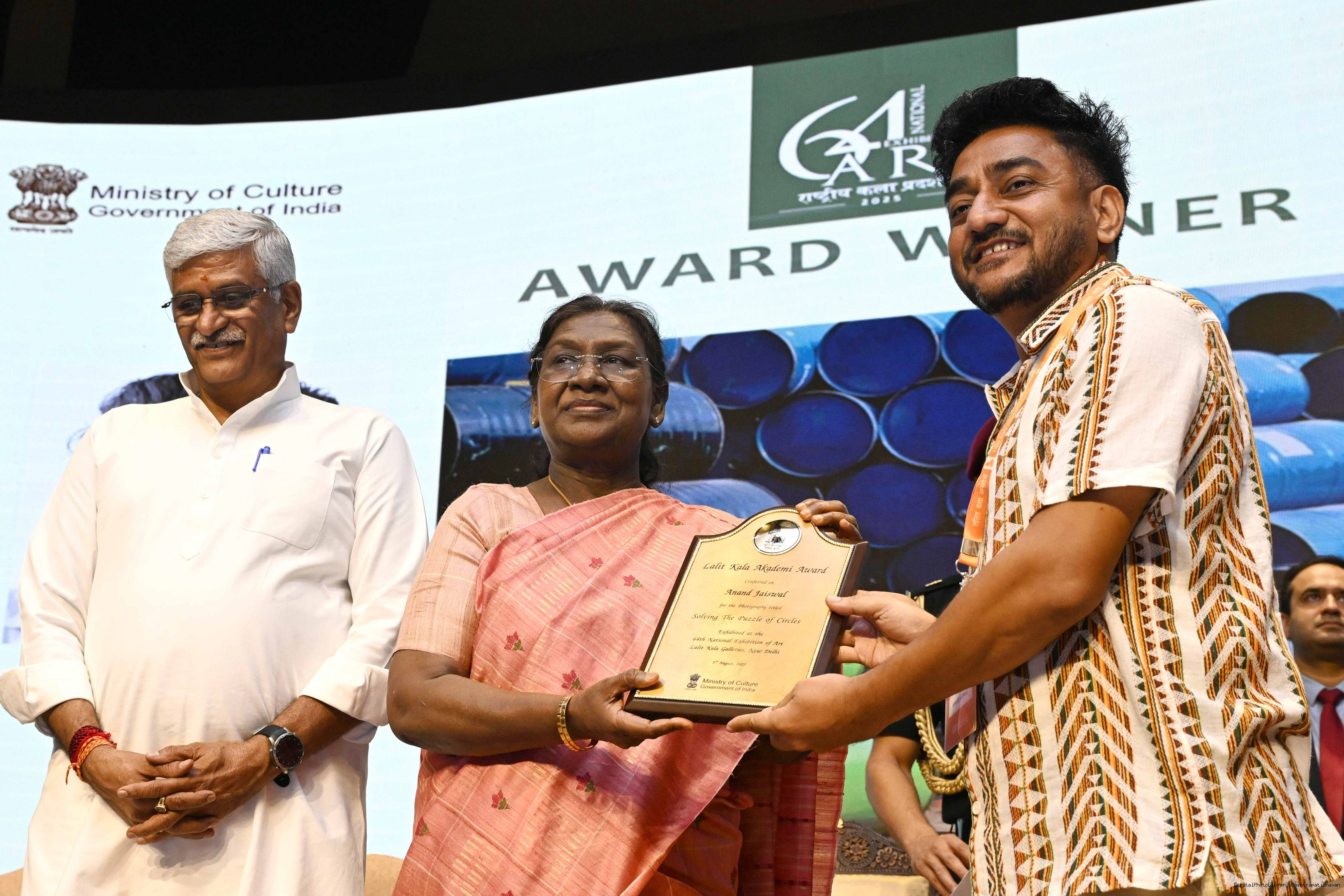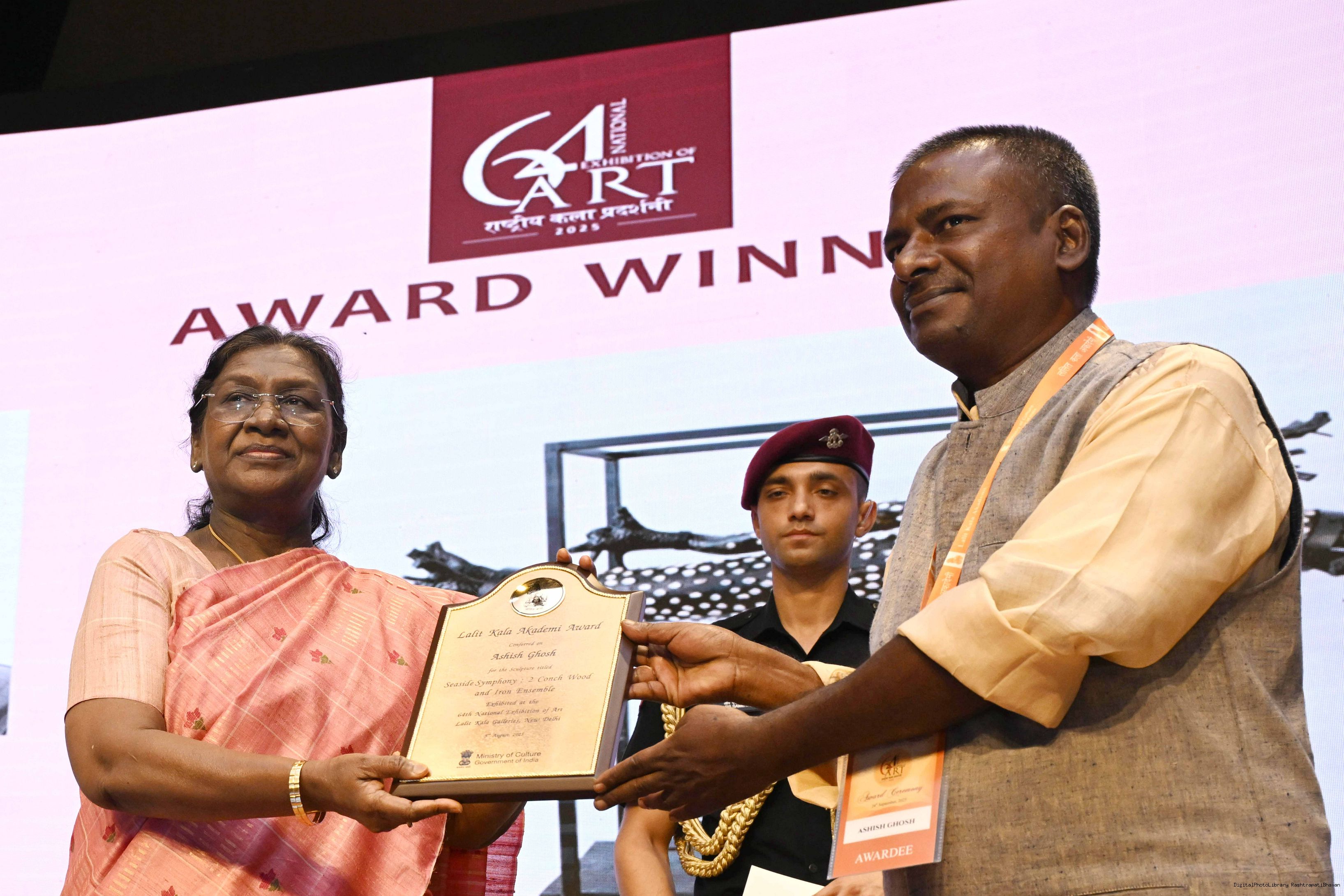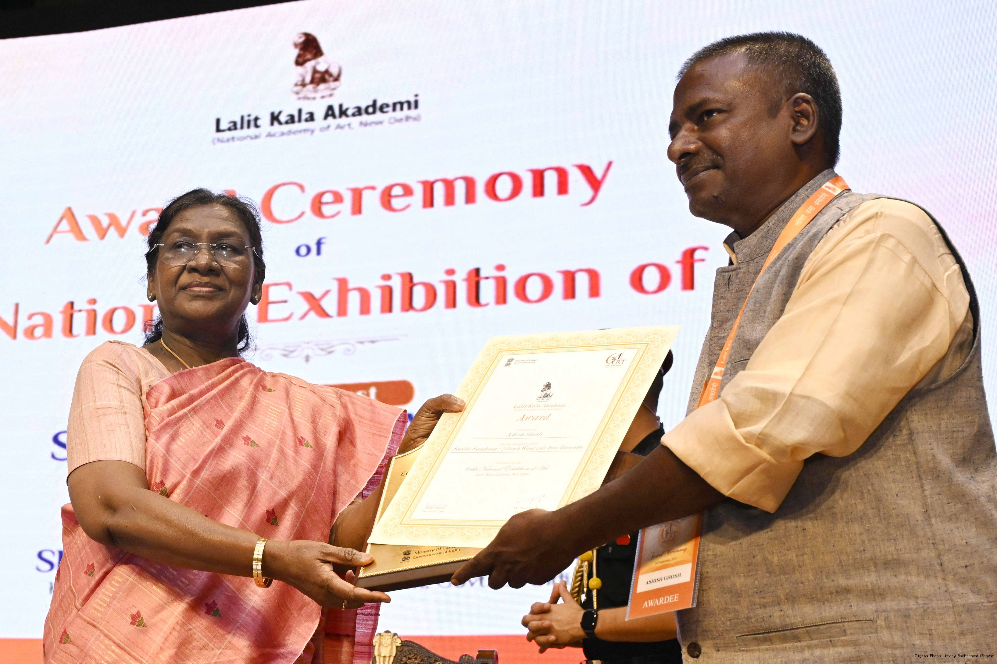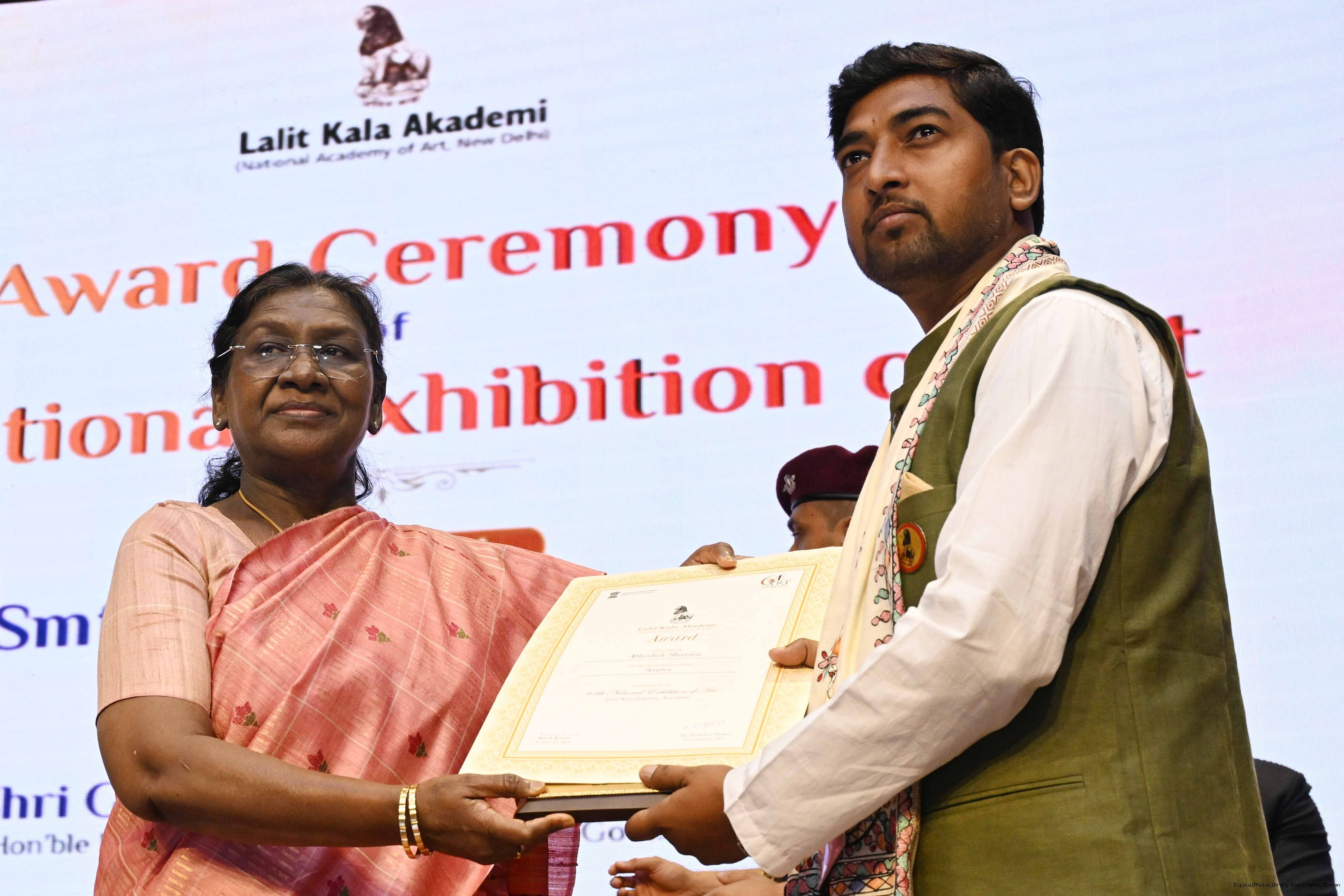 | Caption: | The President of India, Smt Droupadi Murmu, graced the award ceremony of the 64th National Exhibition of Art, organised by the Lalit Kala Akademi, in New Delhi on September 24, 2025. |