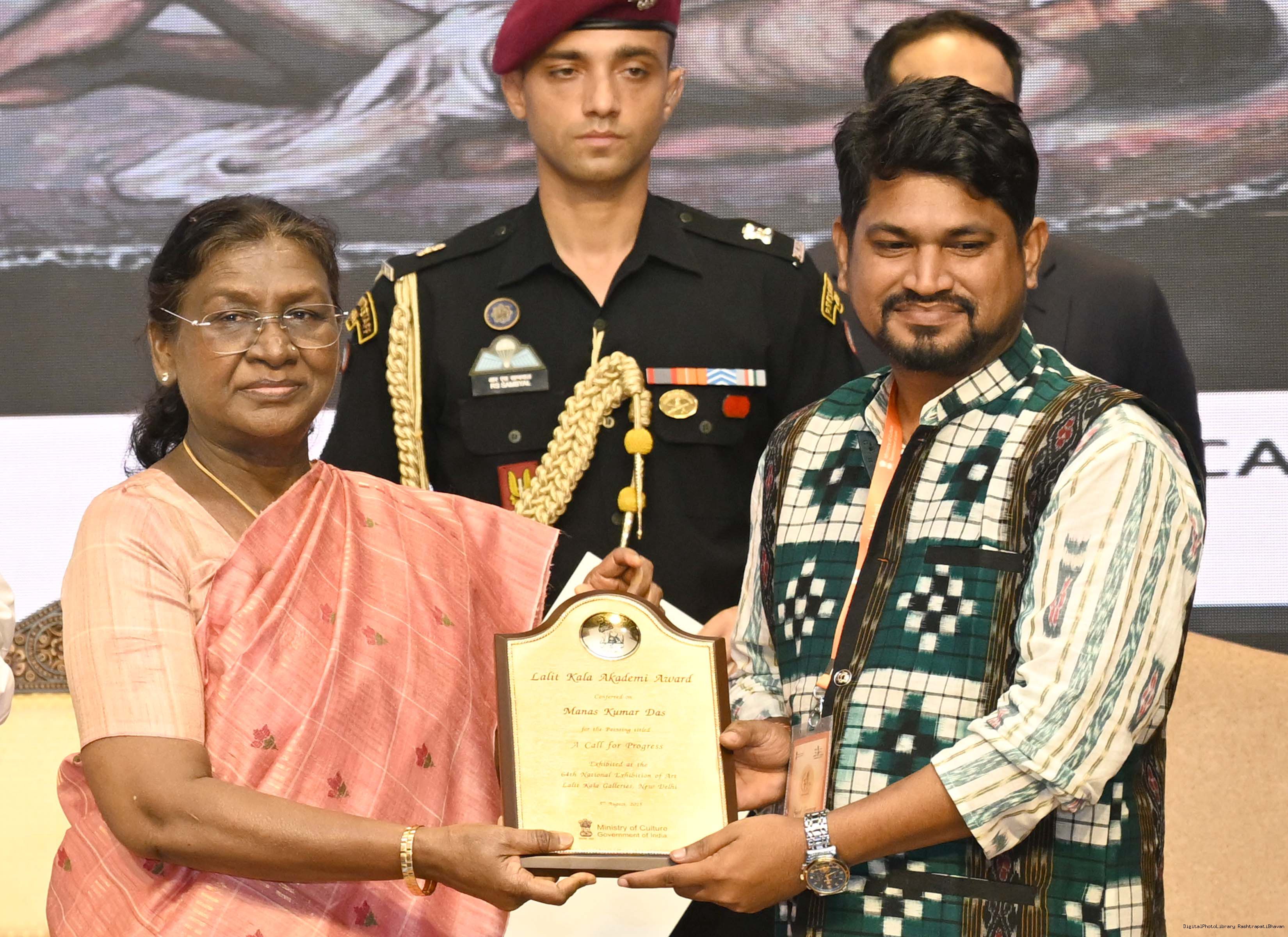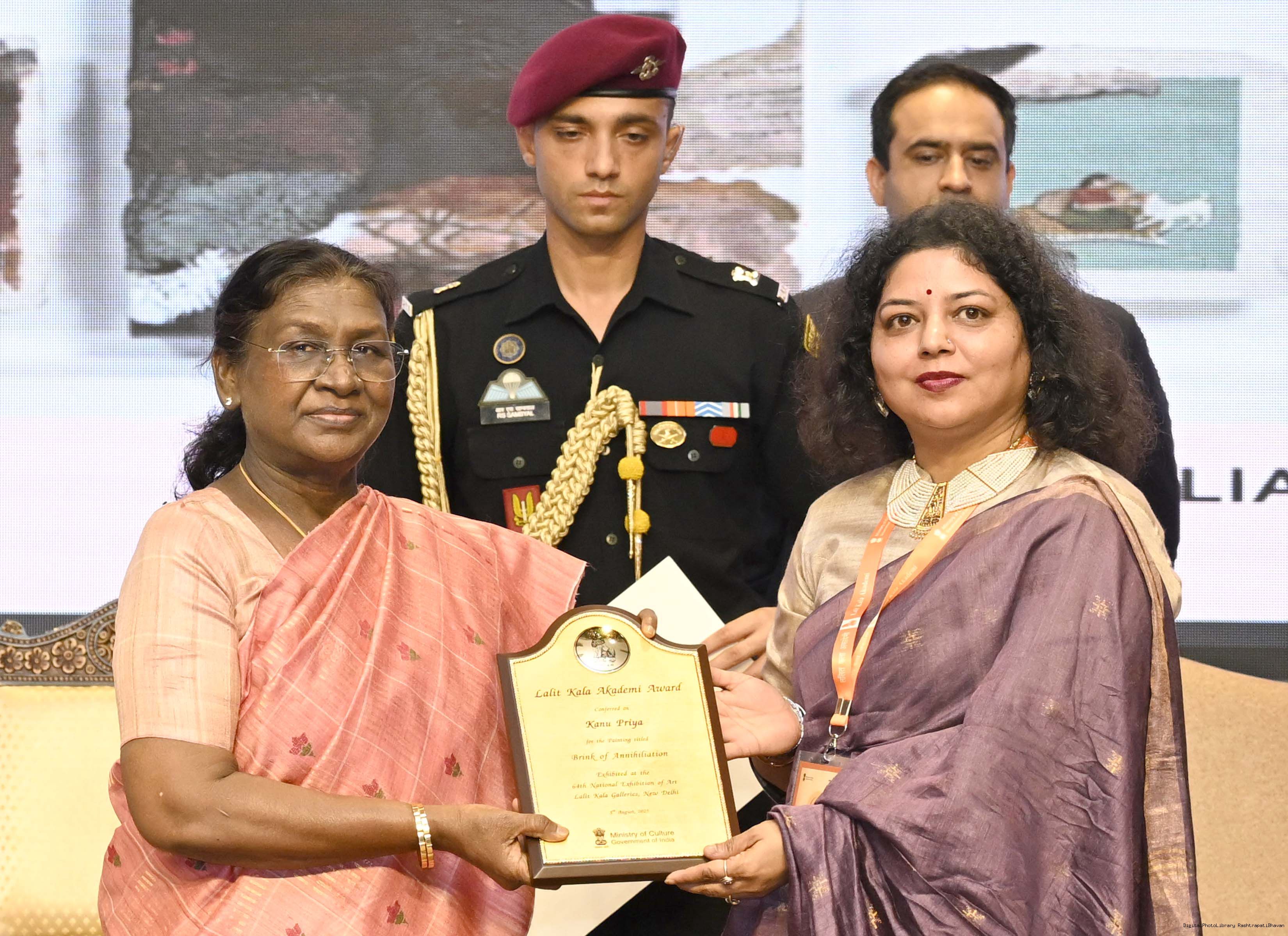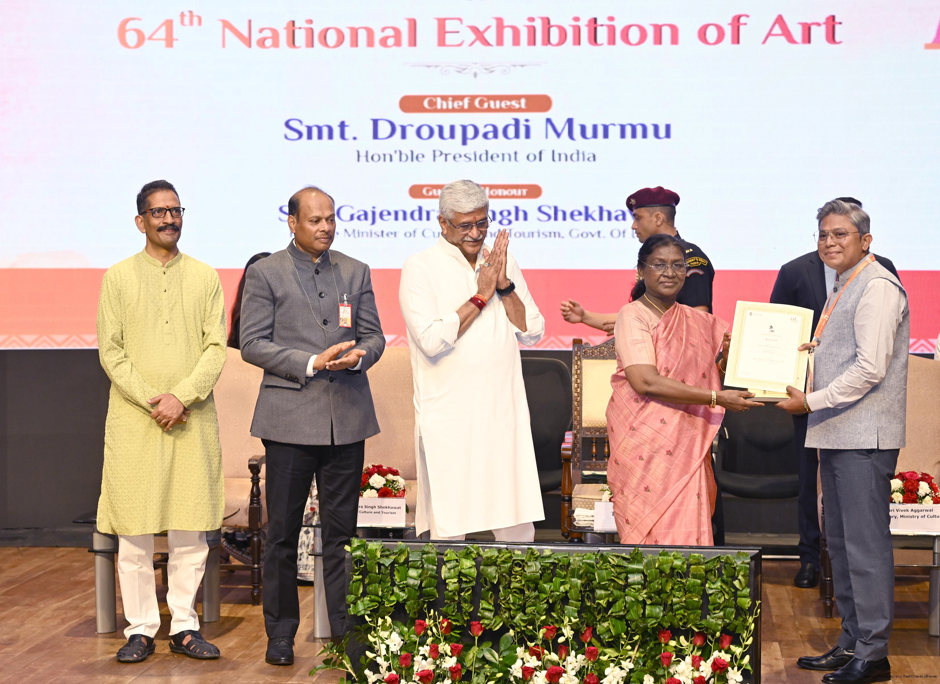 | Caption: | The President of India, Smt Droupadi Murmu, graced the award ceremony of the 64th National Exhibition of Art, organised by the Lalit Kala Akademi, in New Delhi on September 24, 2025. |