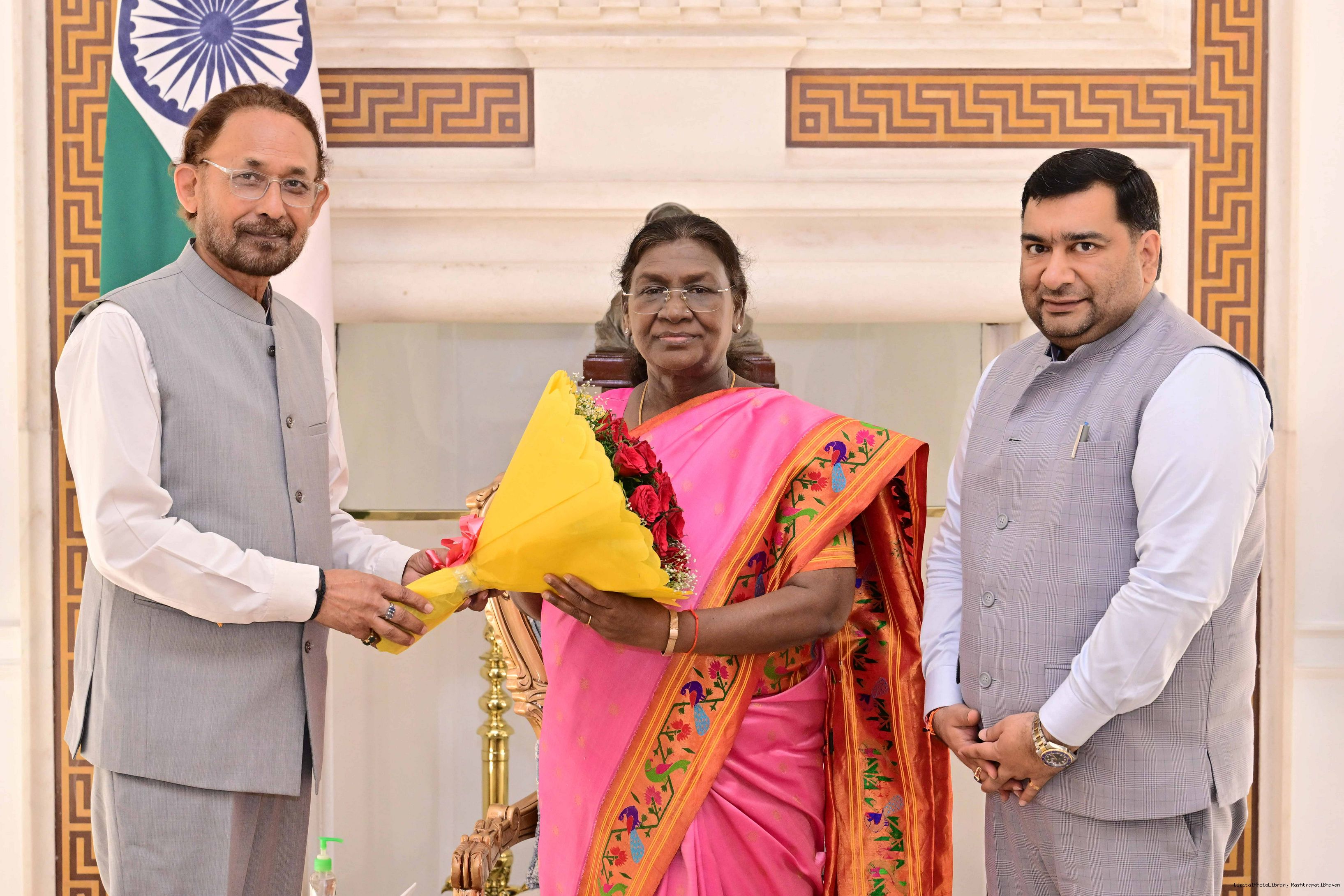 | Caption: | Prof. M.P Sinha, former VC, SKMU along with Shri Prashant Jain meeting with the President of India, Smt Droupadi Murmu at Rashtrapati Bhavan on September 24, 2025. |