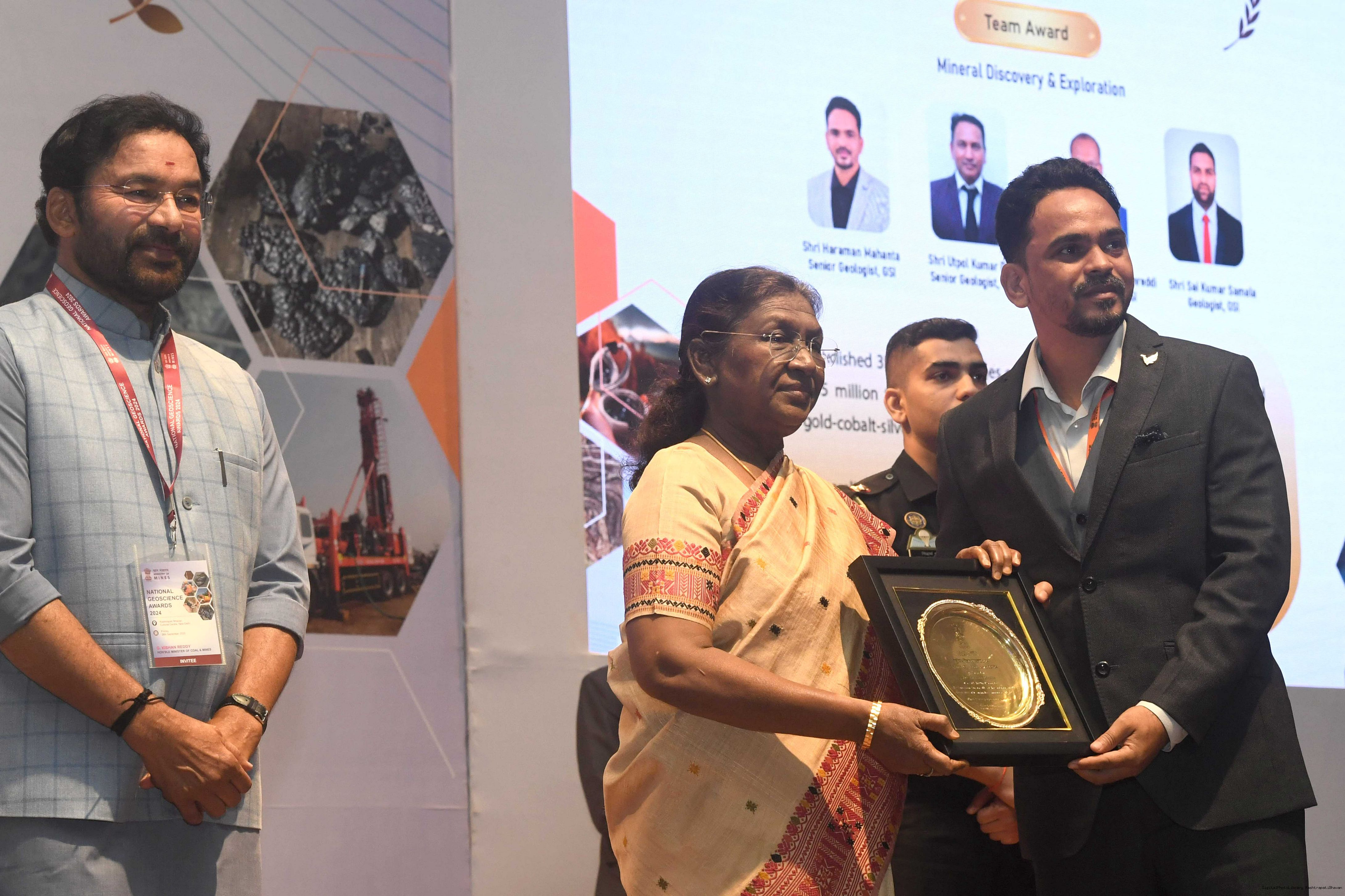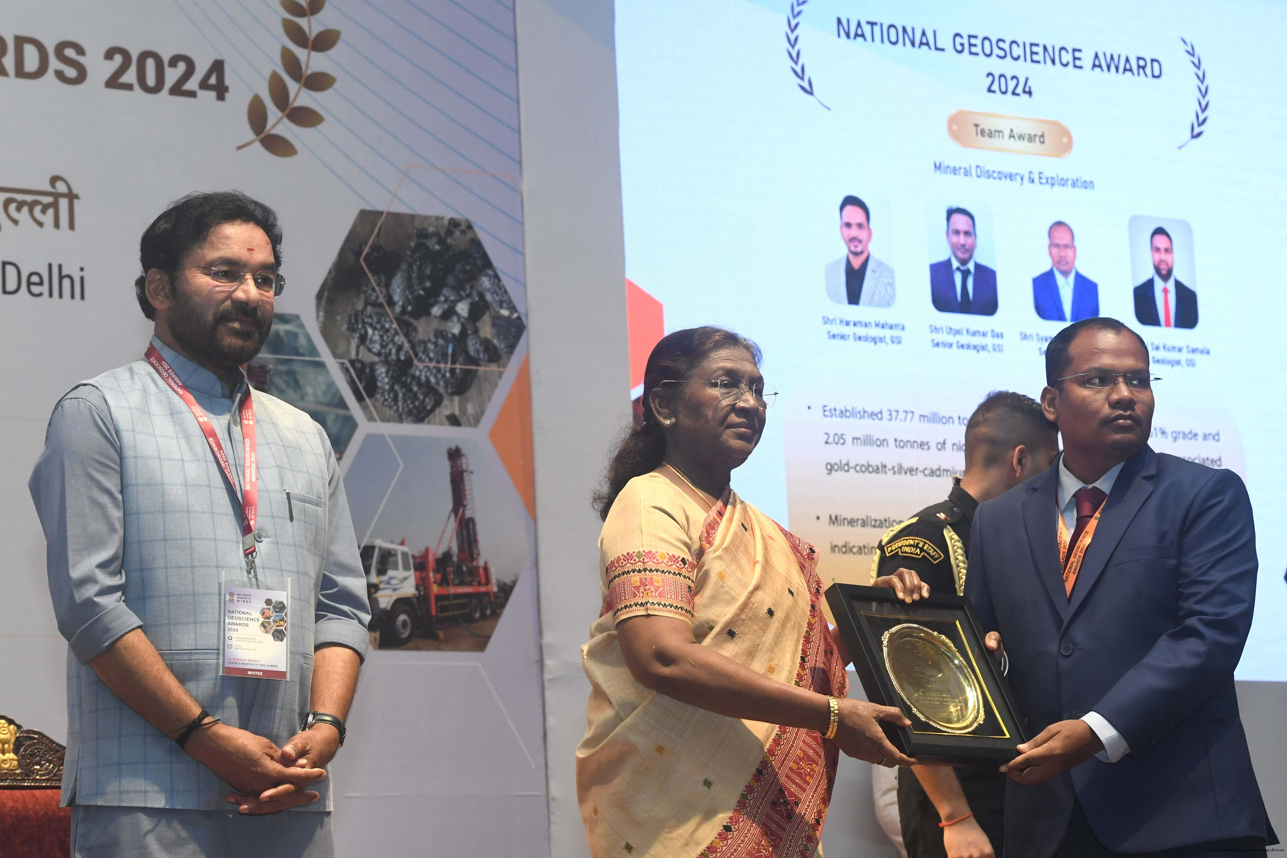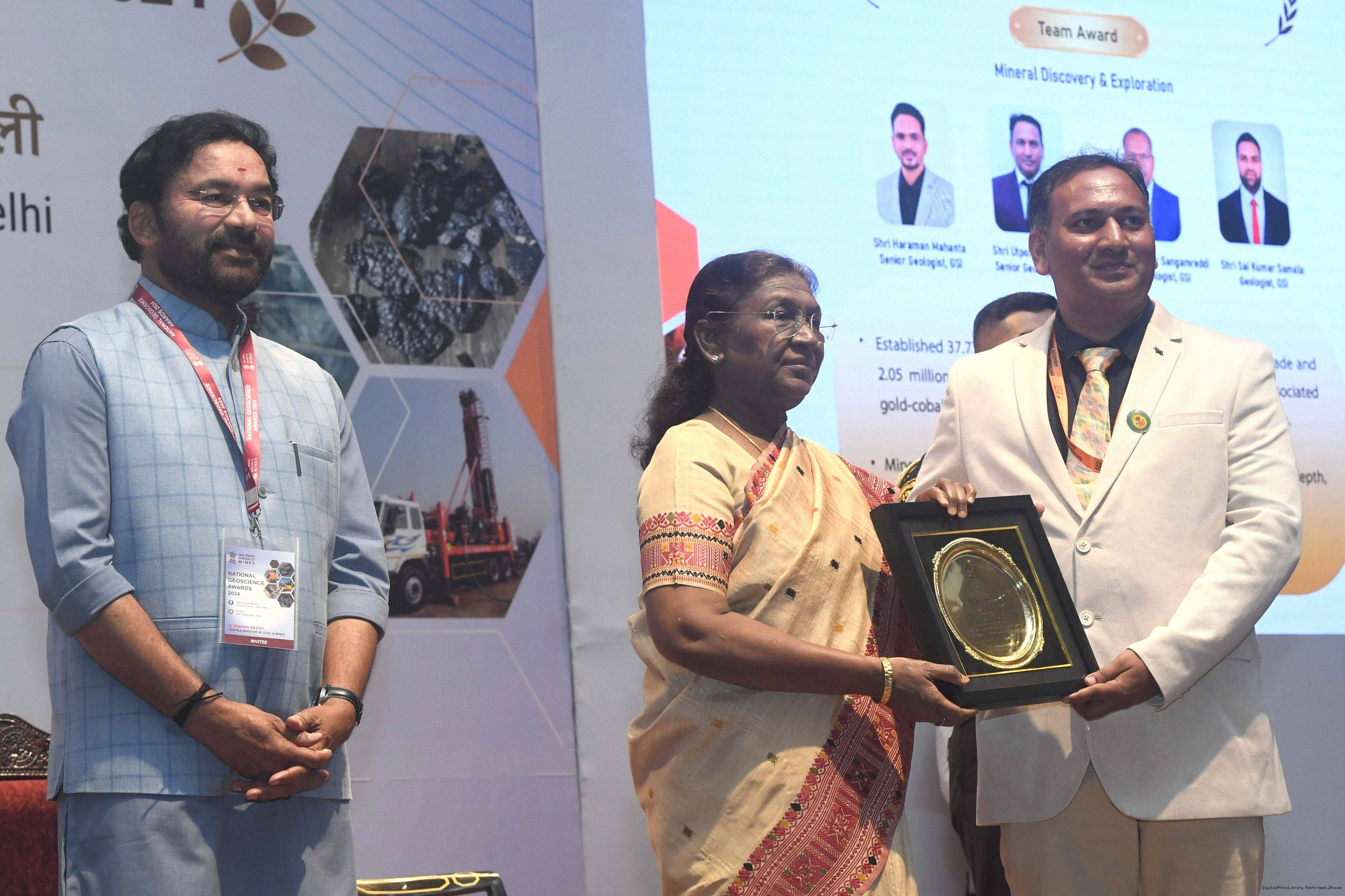 | Caption: | The President of India, Smt Droupadi Murmu, presented the National Geoscience Awards-2024 for outstanding contributions in the field of Geoscience at a ceremony held at Rashtrapati Bhavan Cultural Centre on September 26, 2025. |
