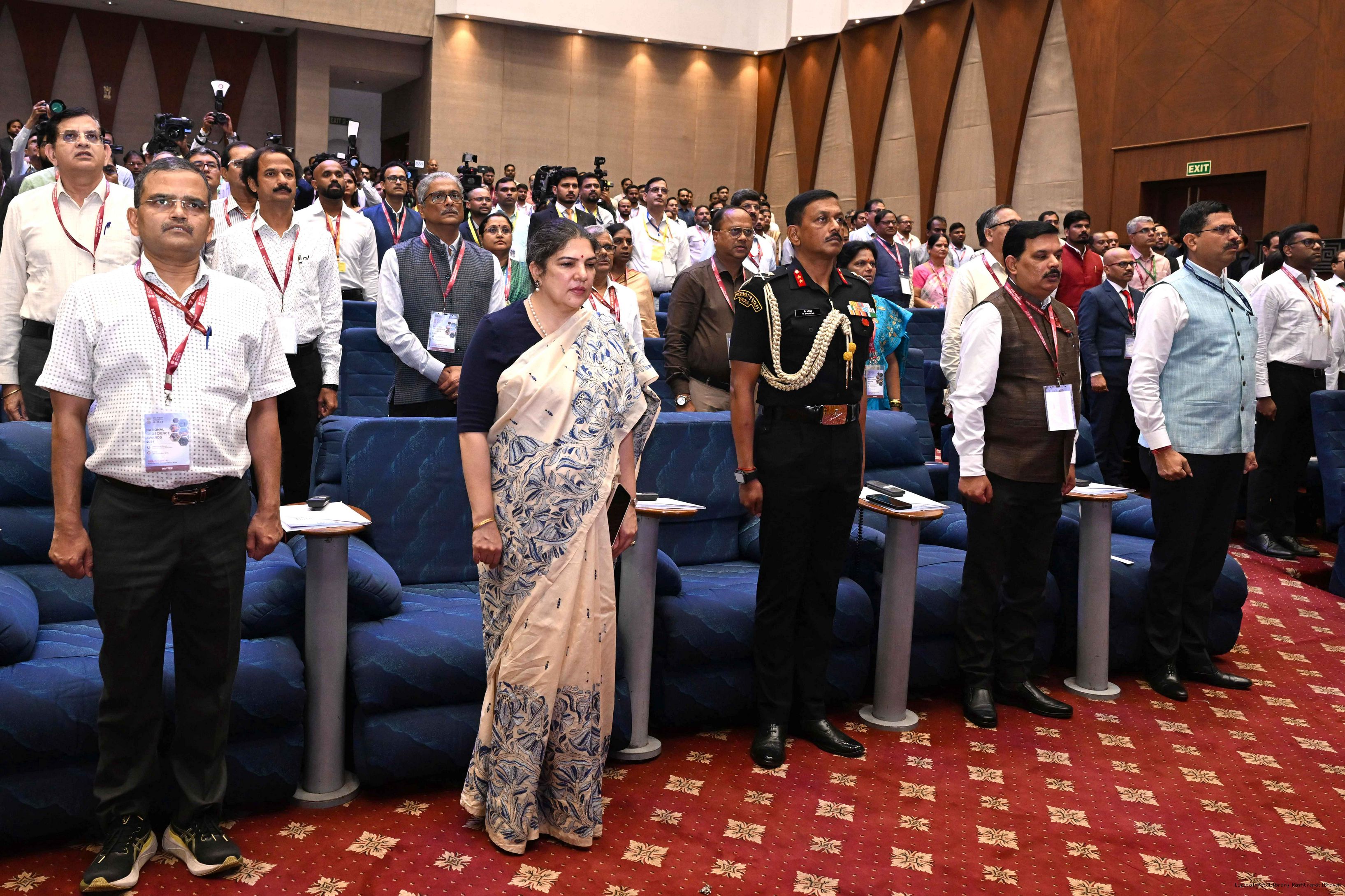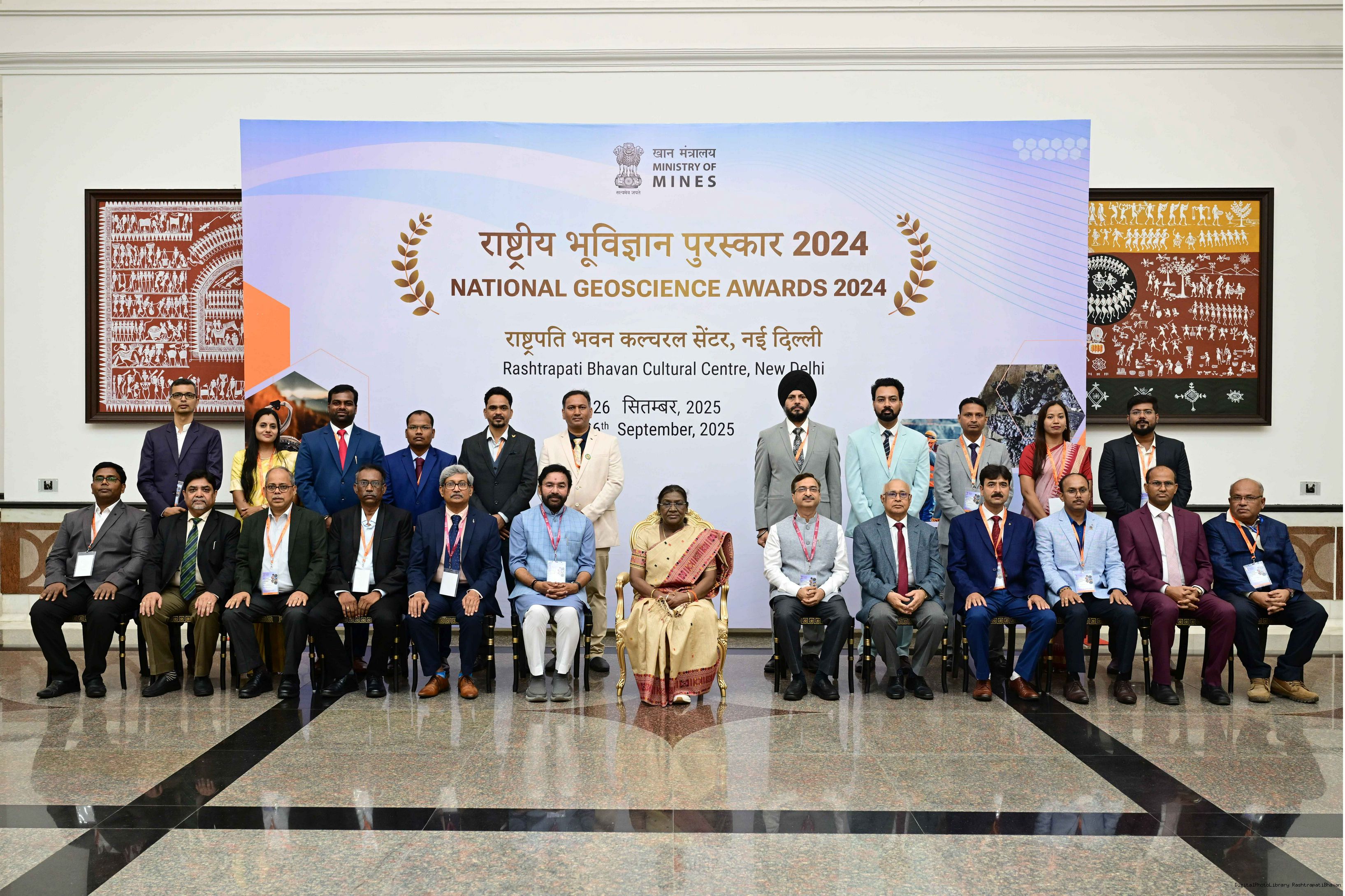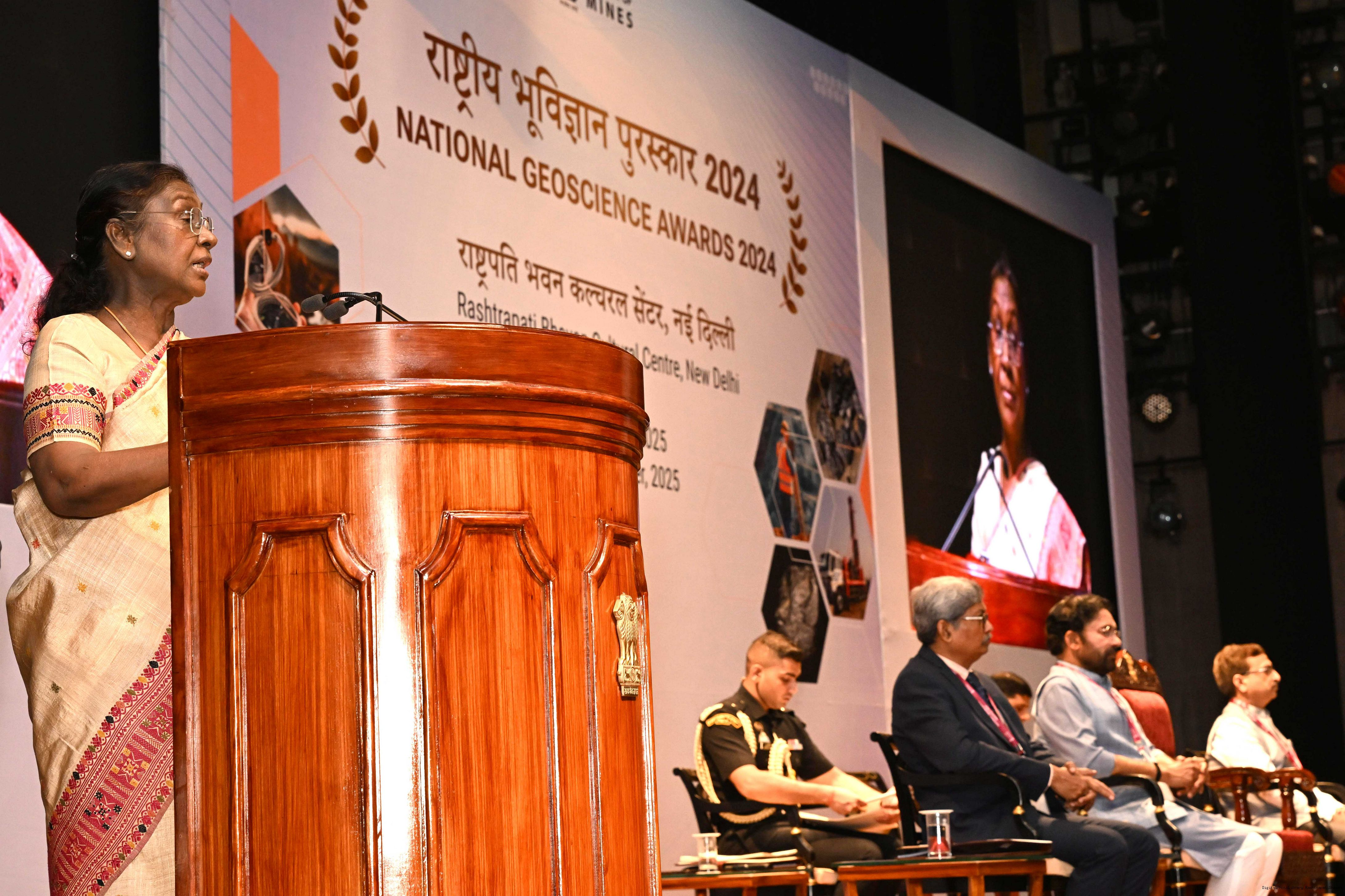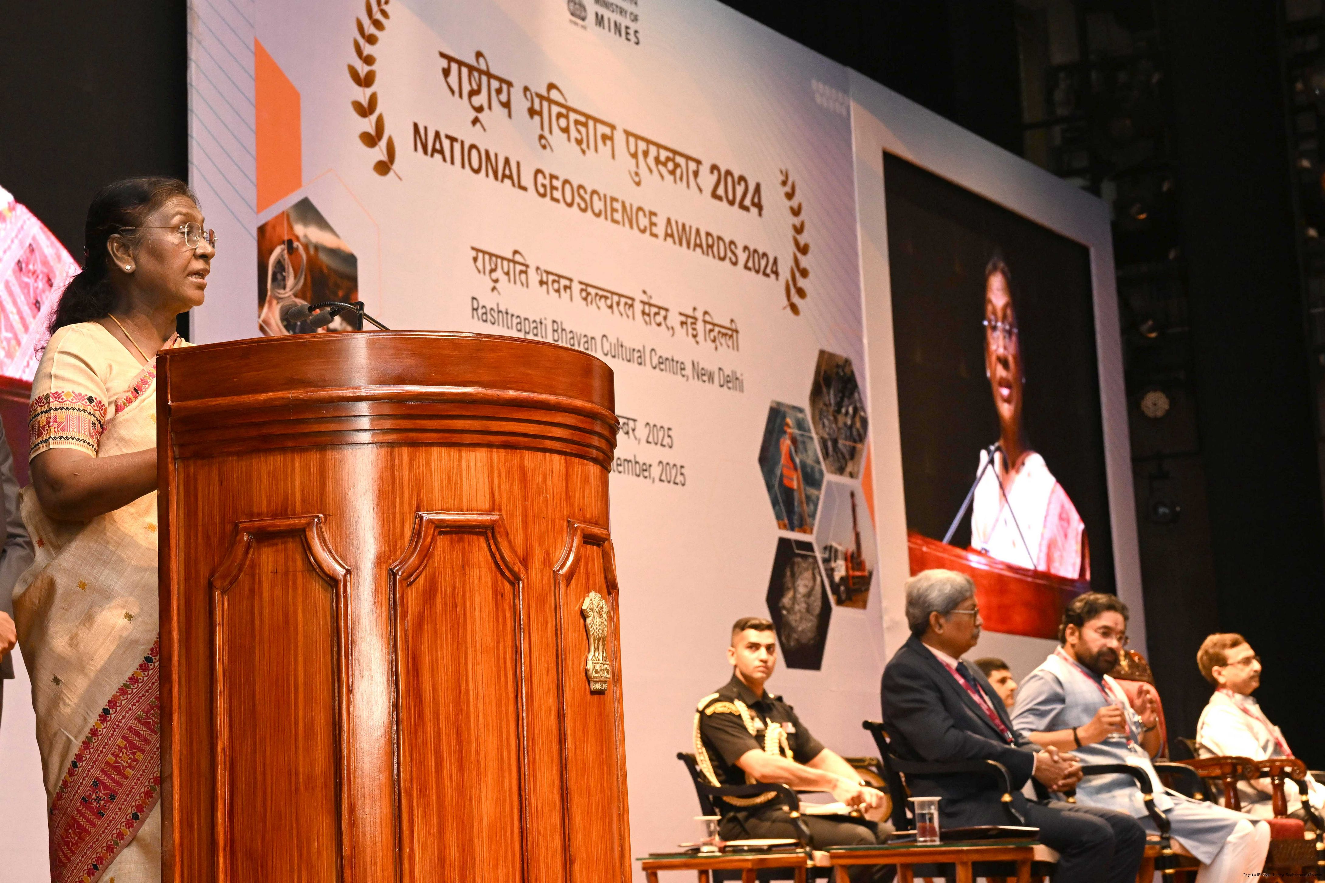 | Caption: | The President of India, Smt Droupadi Murmu, presented the National Geoscience Awards-2024 for outstanding contributions in the field of Geoscience at a ceremony held at Rashtrapati Bhavan Cultural Centre on September 26, 2025. |