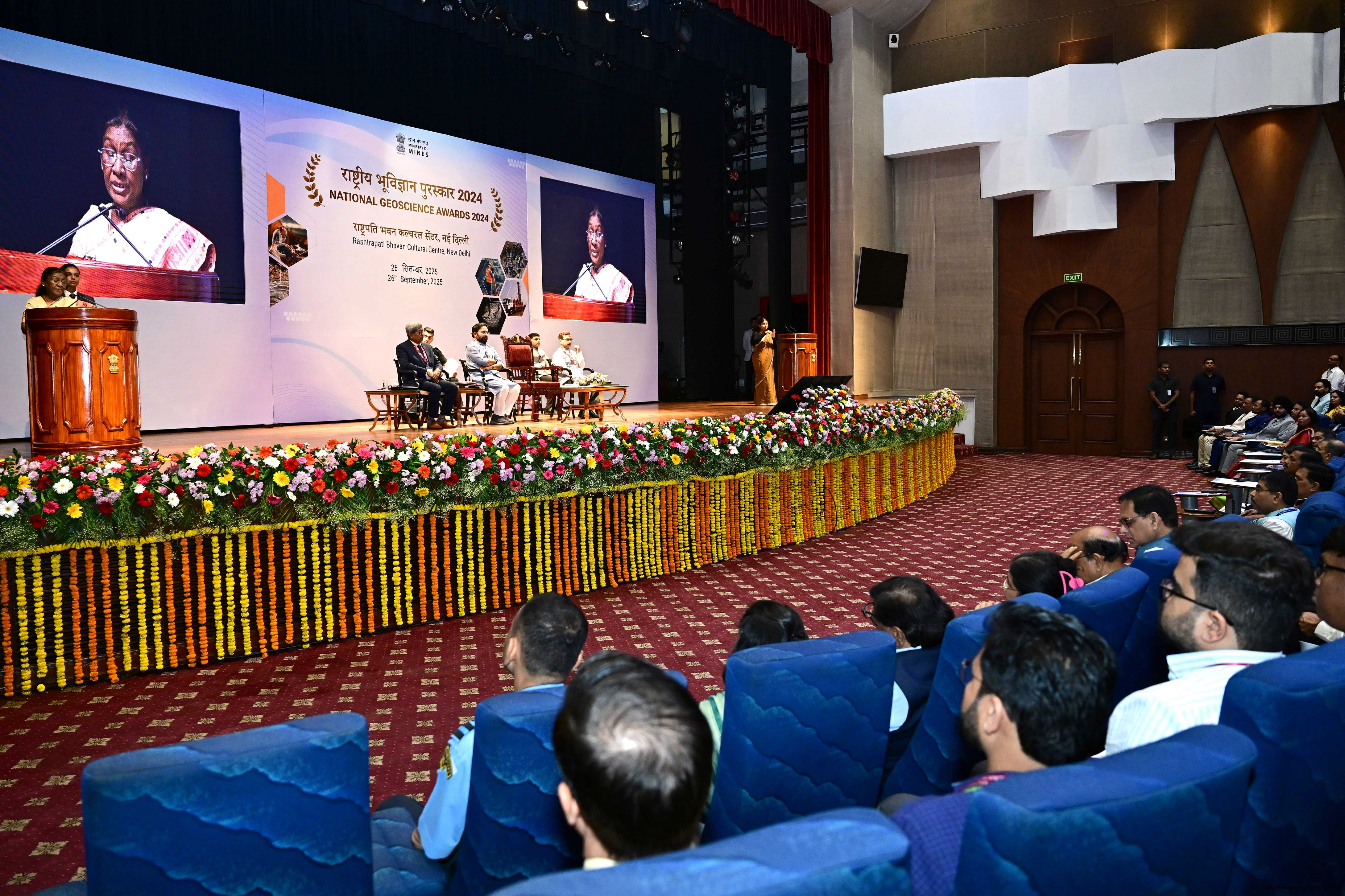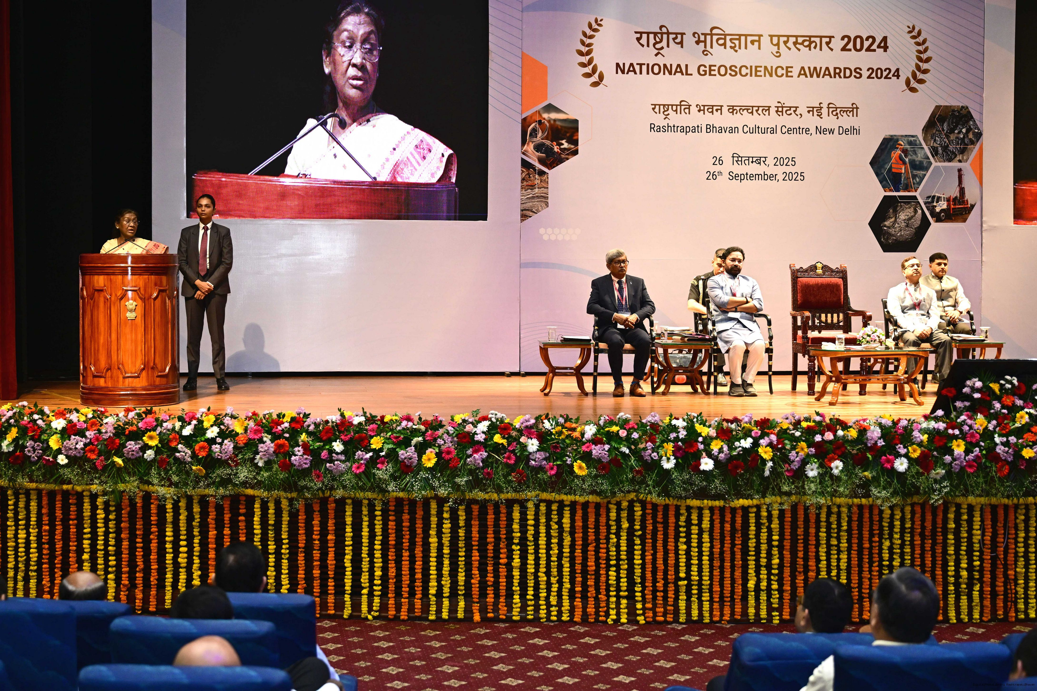 | Caption: | The President of India, Smt Droupadi Murmu, presented the National Geoscience Awards-2024 for outstanding contributions in the field of Geoscience at a ceremony held at Rashtrapati Bhavan Cultural Centre on September 26, 2025. |