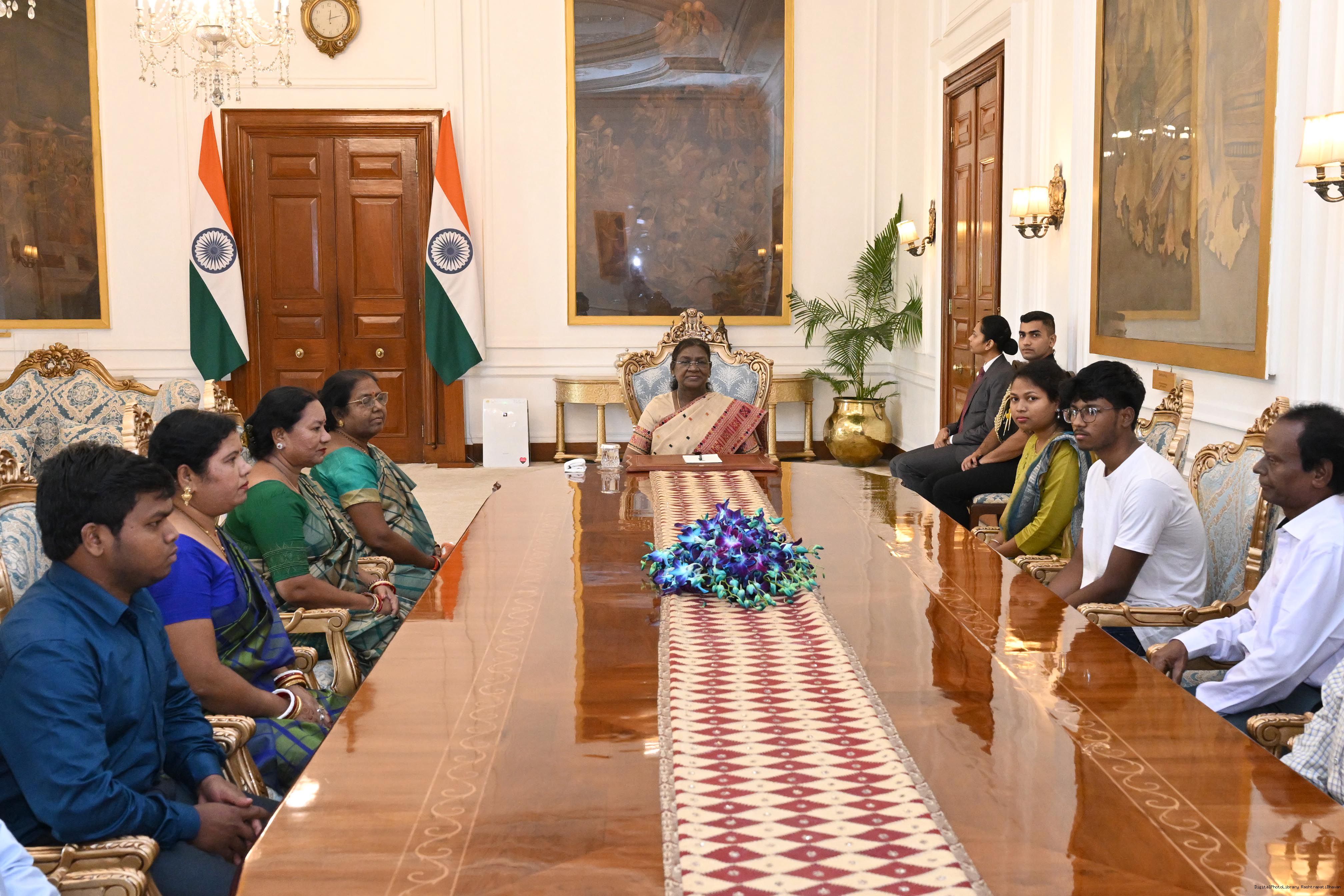 | Caption: | Srimati Kisku from Rairangpur along with Shri Jaktu Besra and others meeting with the President of India, Smt. Droupadi Murmu at Rashtrapati Bhavan on September 26, 2025. |