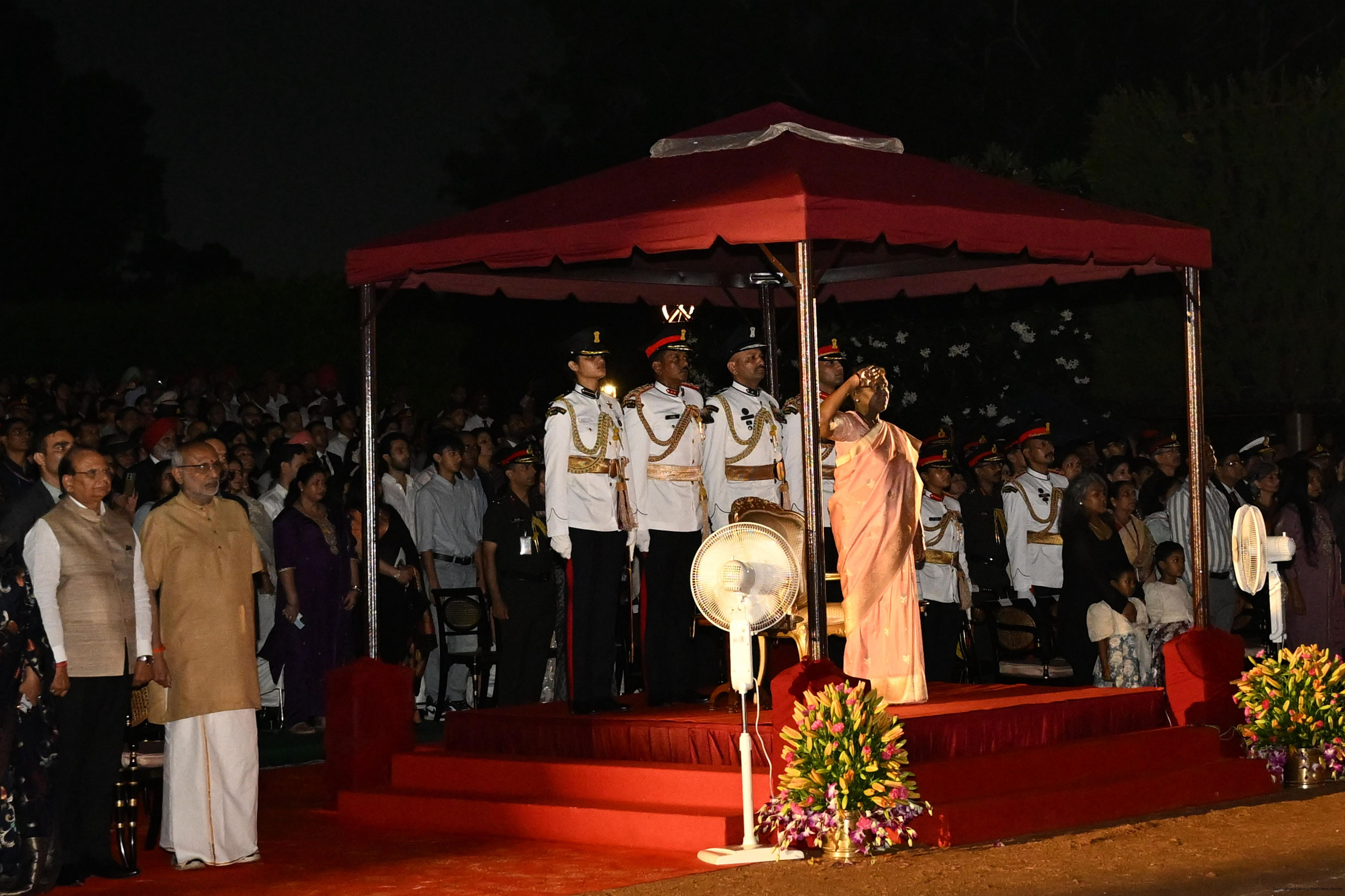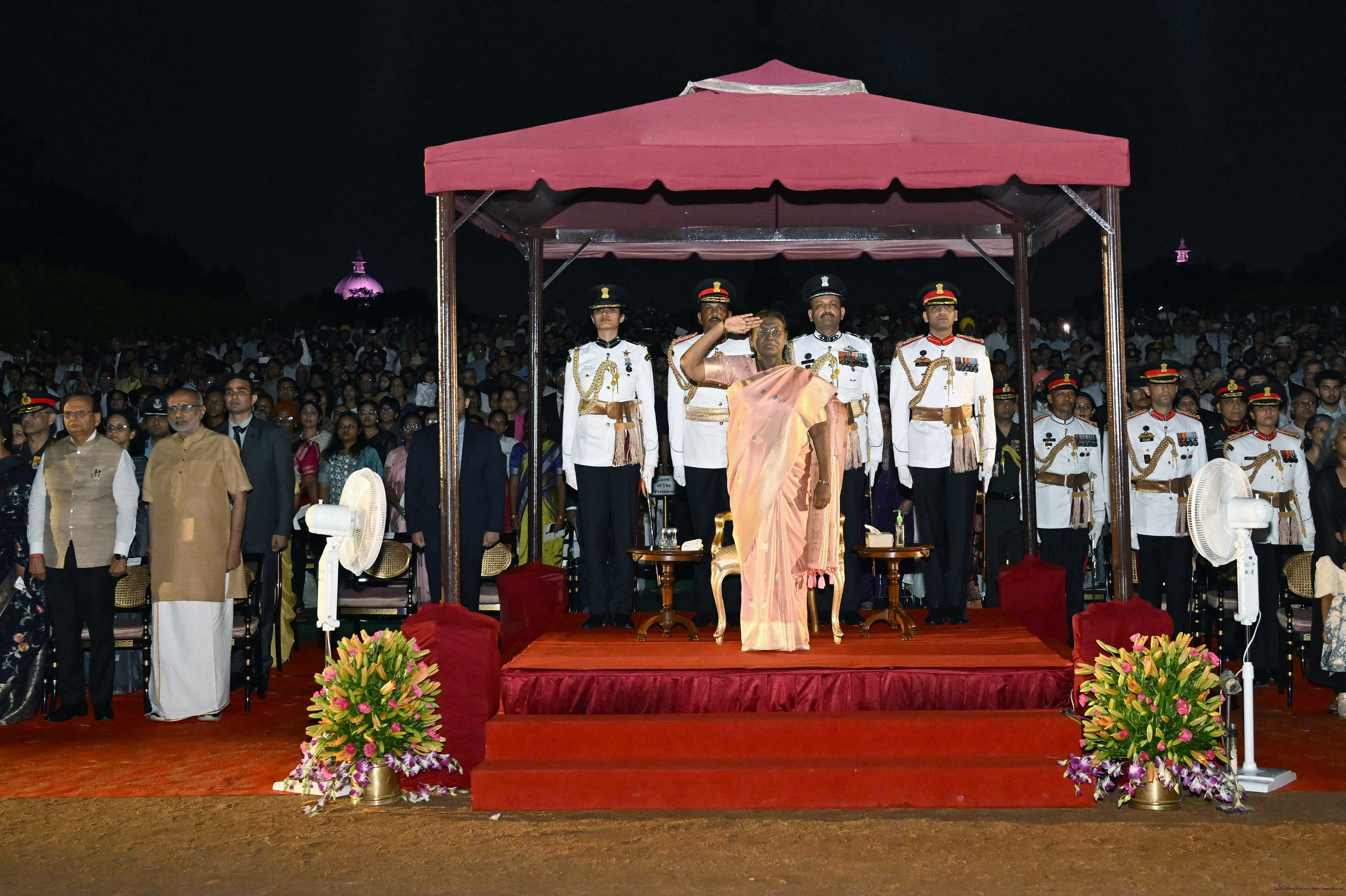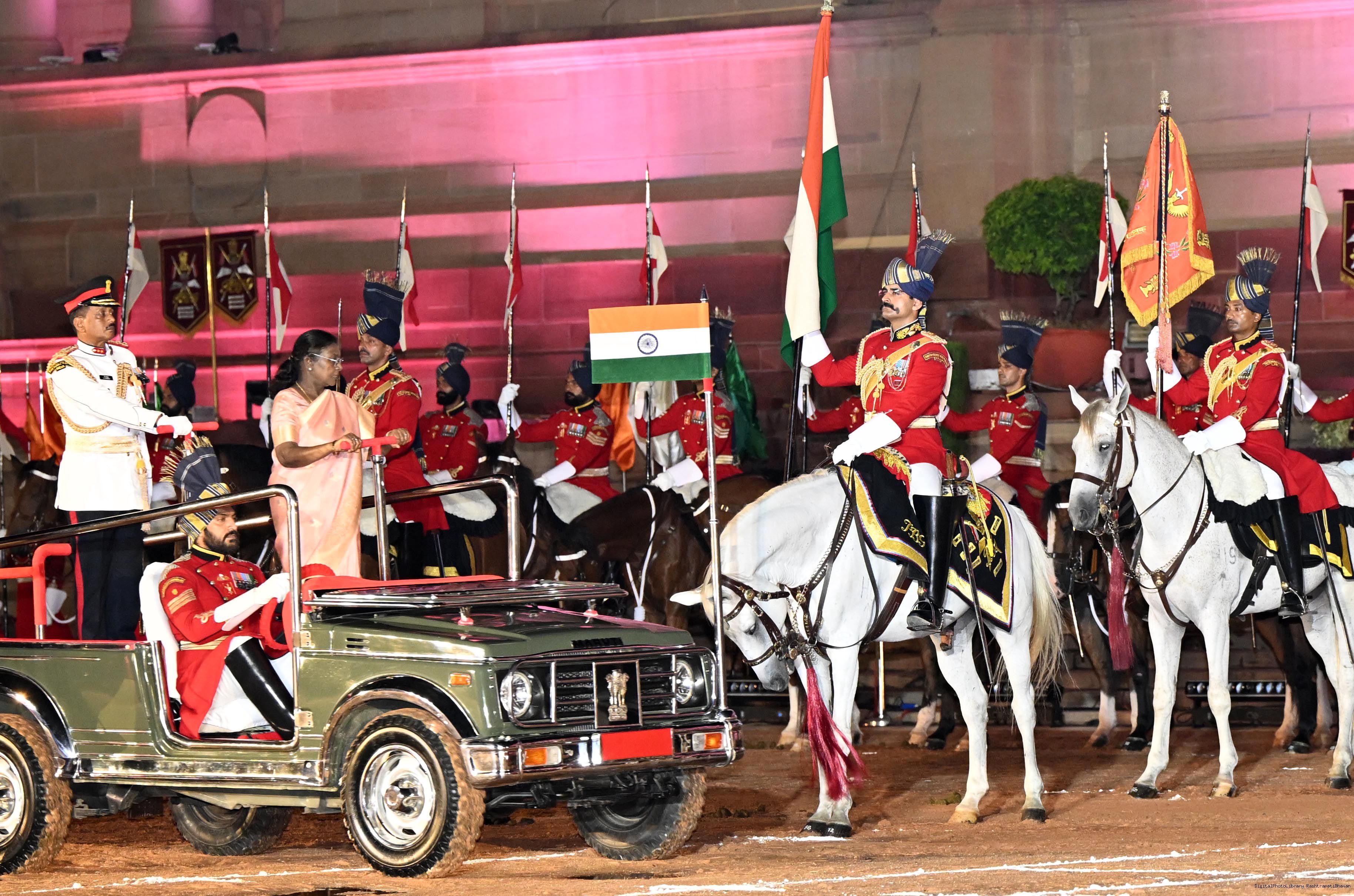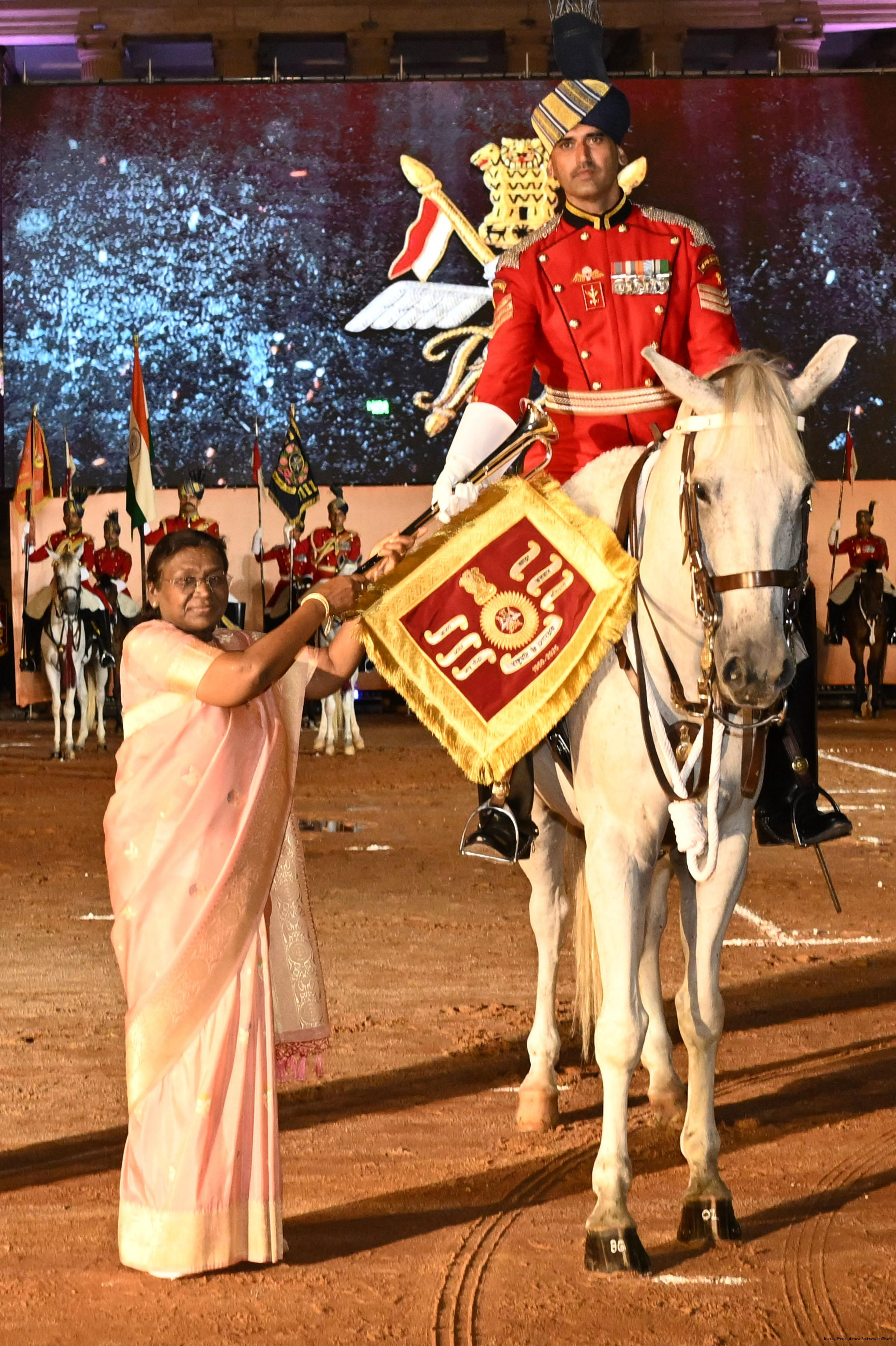 | Caption: | The President of India, Smt. Droupadi Murmu, presented the diamond jubilee Silver Trumpet and Trumpet Banner to the President’s Bodyguard (PBG) at a ceremony held at Rashtrapati Bhavan on September 30, 2025, in recognition of 75 years of glorious service since the designation as the PBG in 1950. |