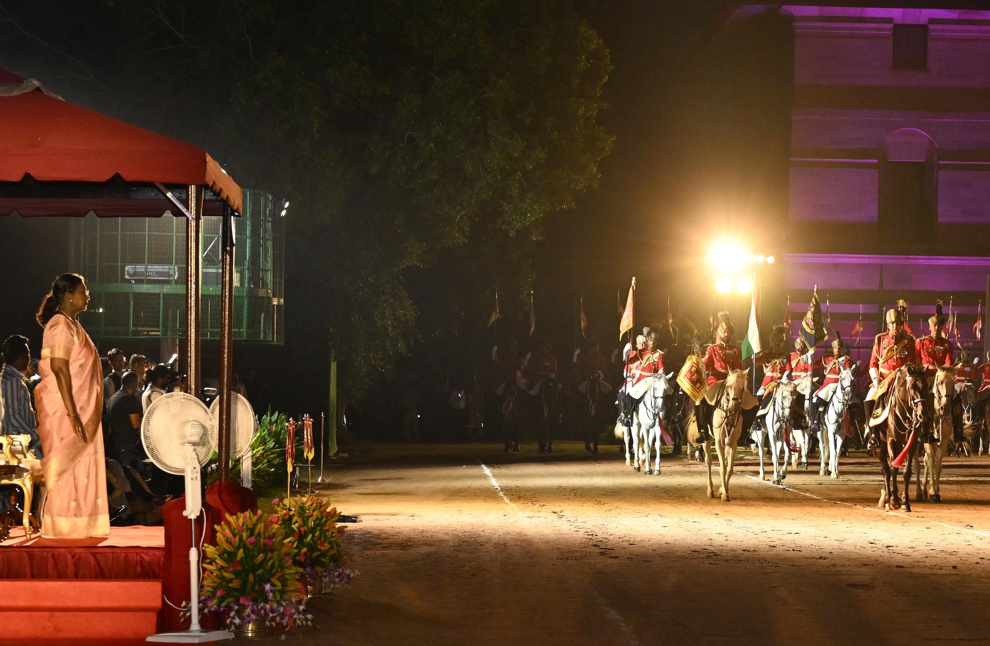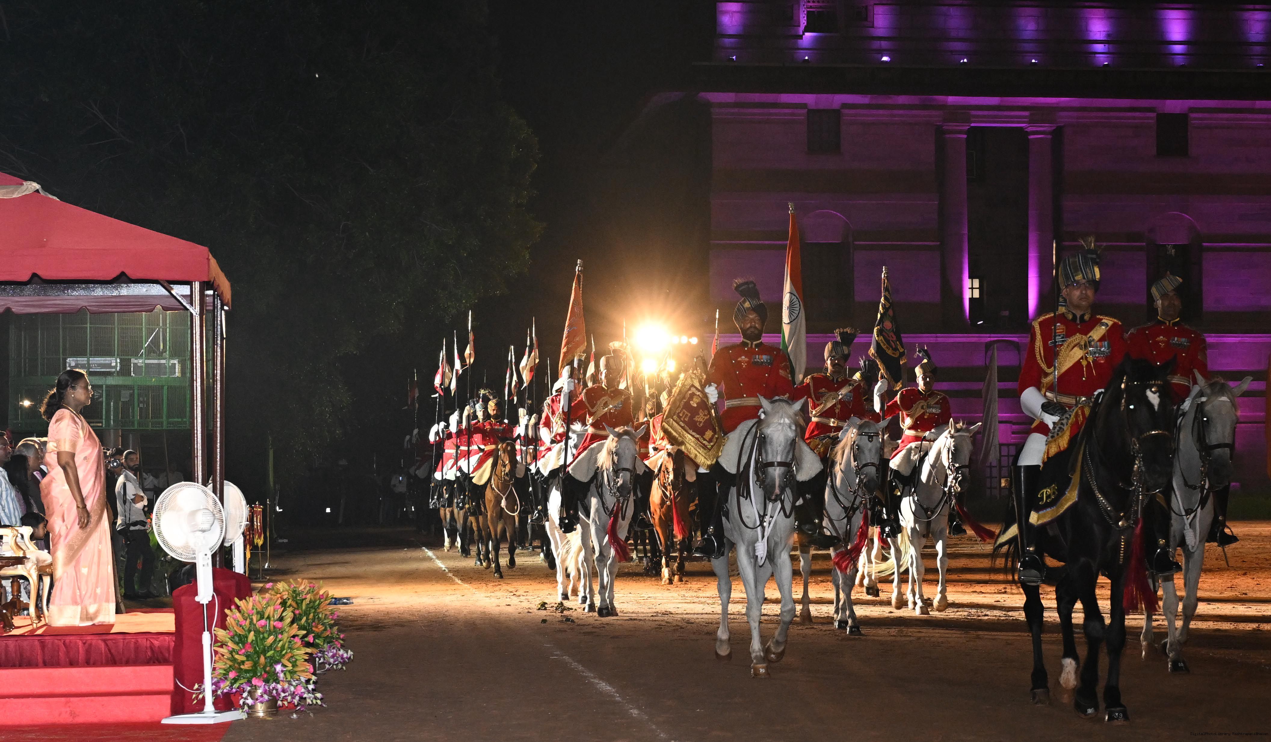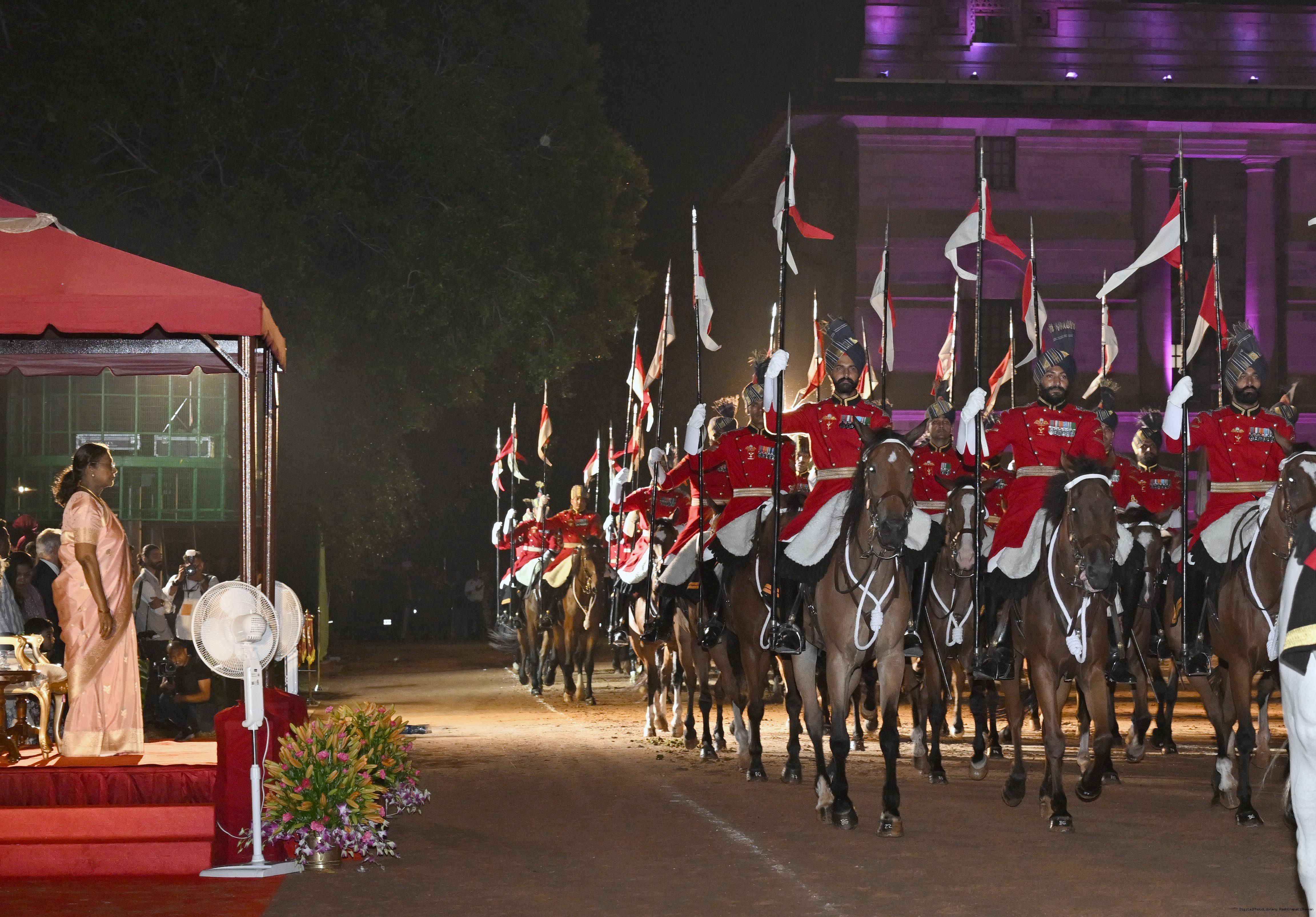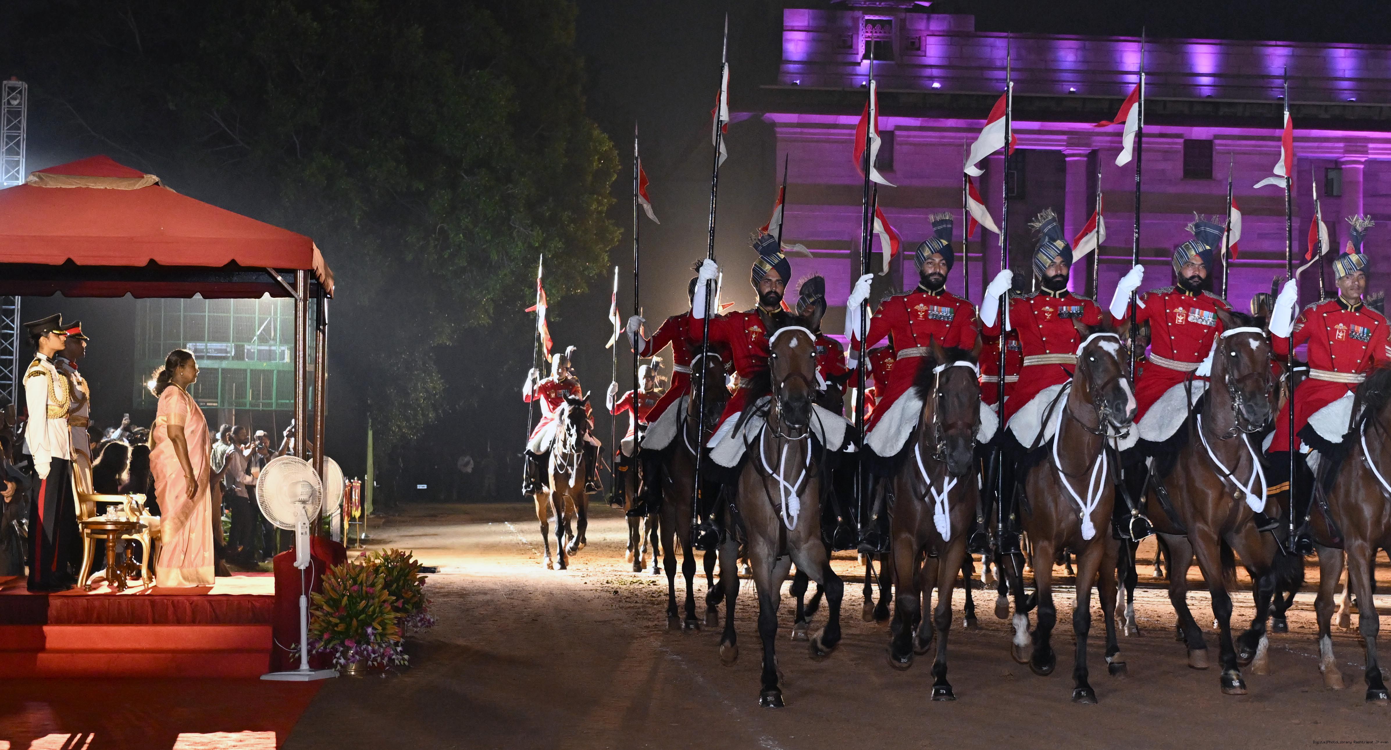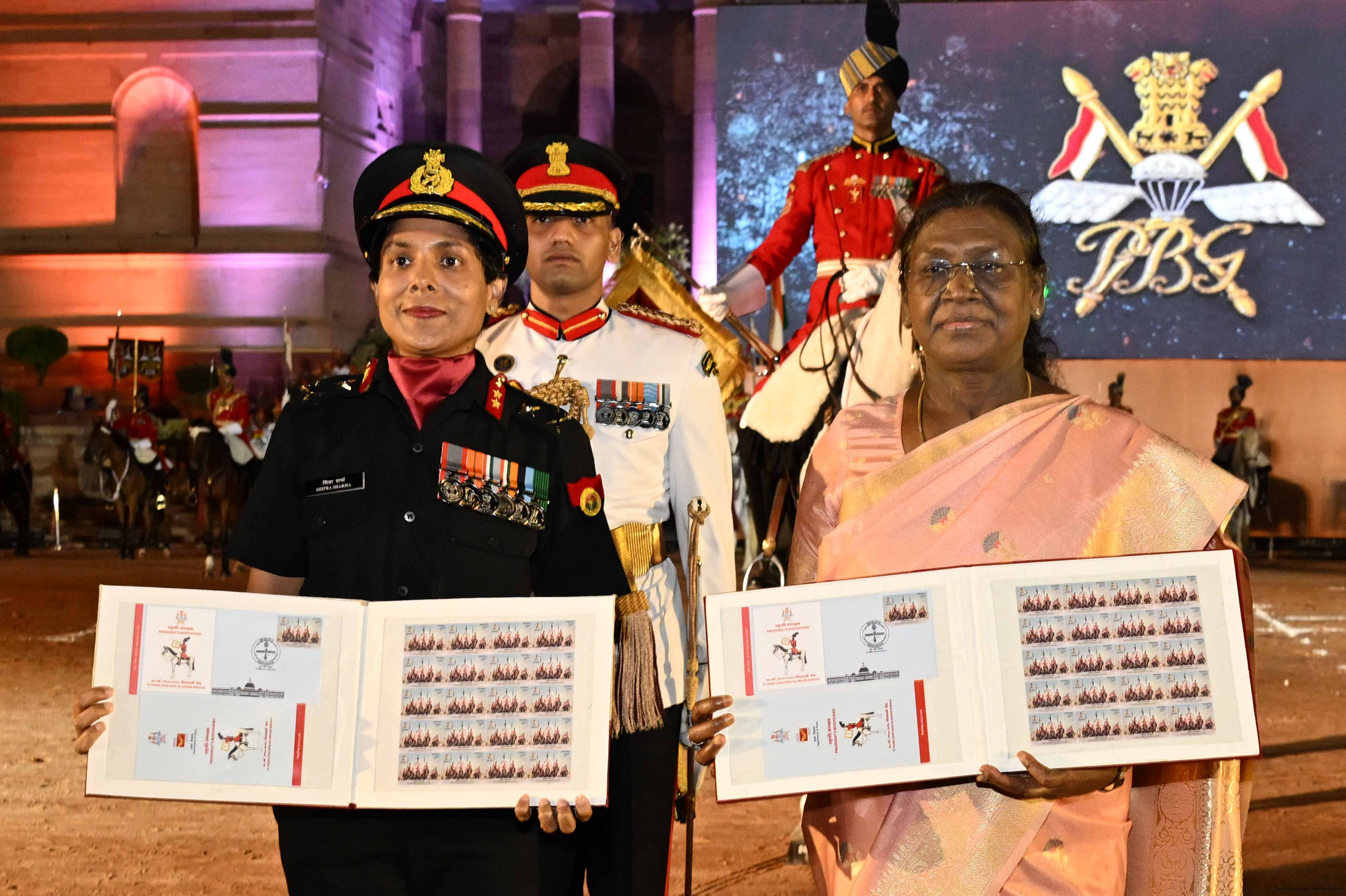 | Caption: | The President of India, Smt. Droupadi Murmu, presented the diamond jubilee Silver Trumpet and Trumpet Banner to the President’s Bodyguard (PBG) at a ceremony held at Rashtrapati Bhavan on September 30, 2025, in recognition of 75 years of glorious service since the designation as the PBG in 1950. |