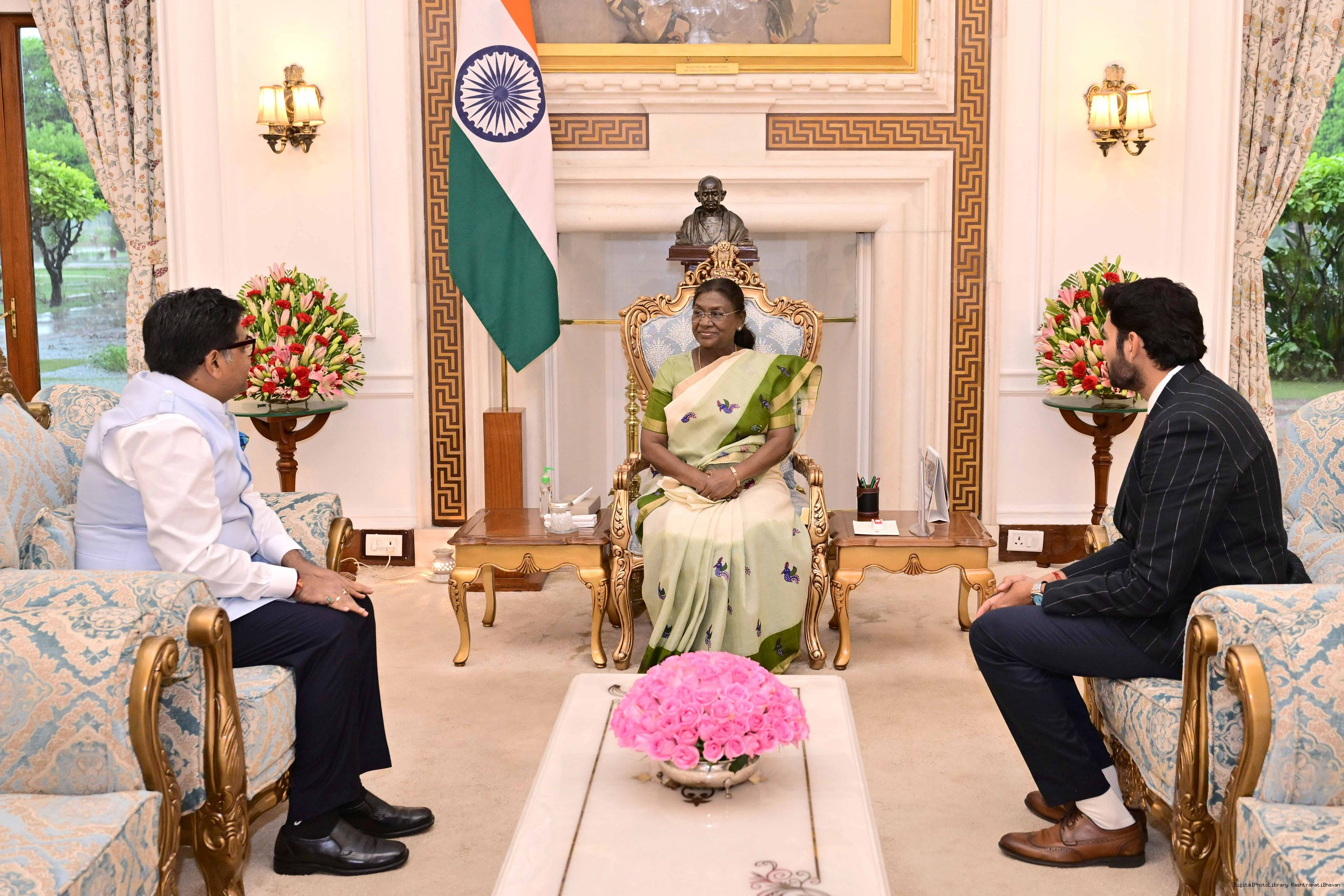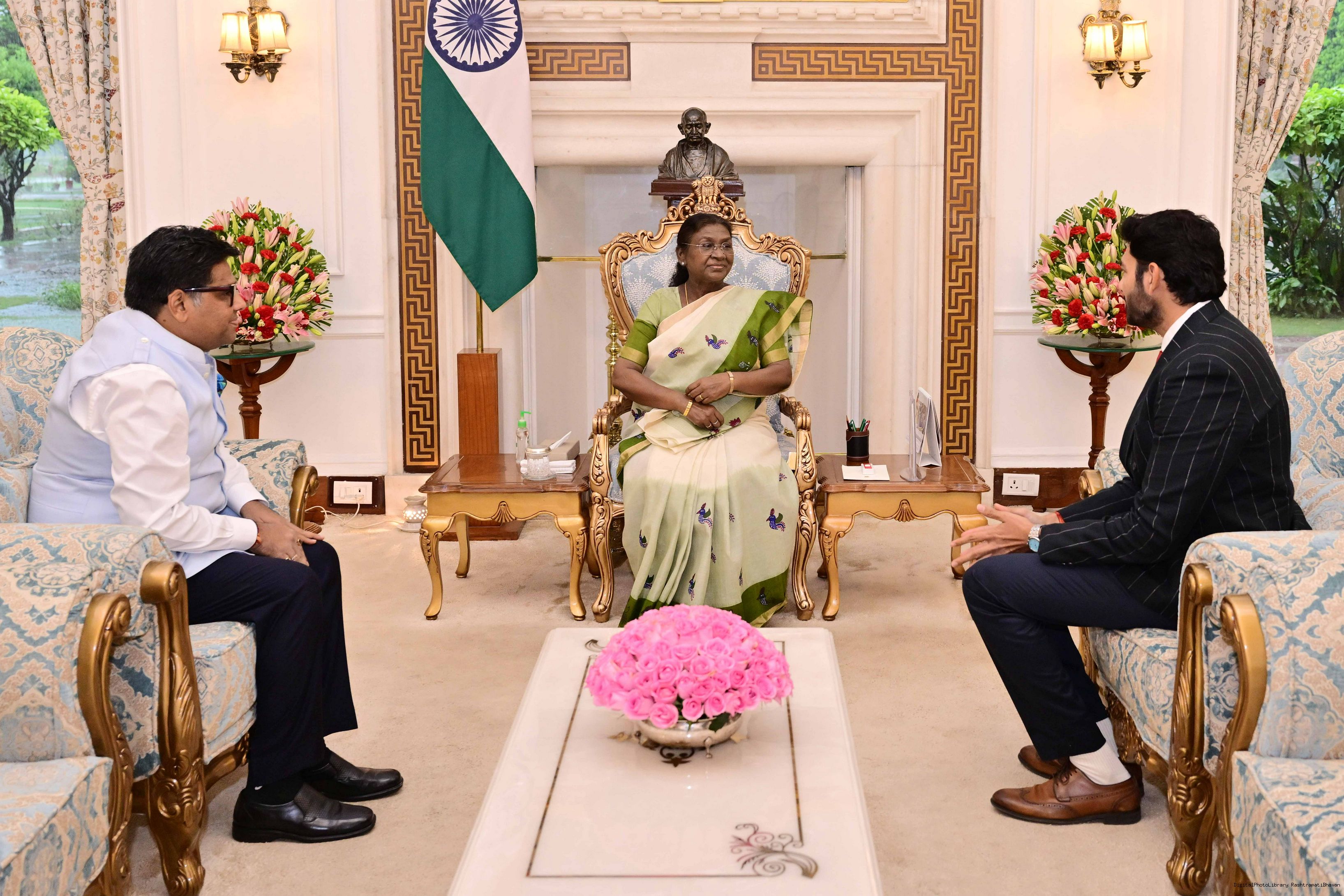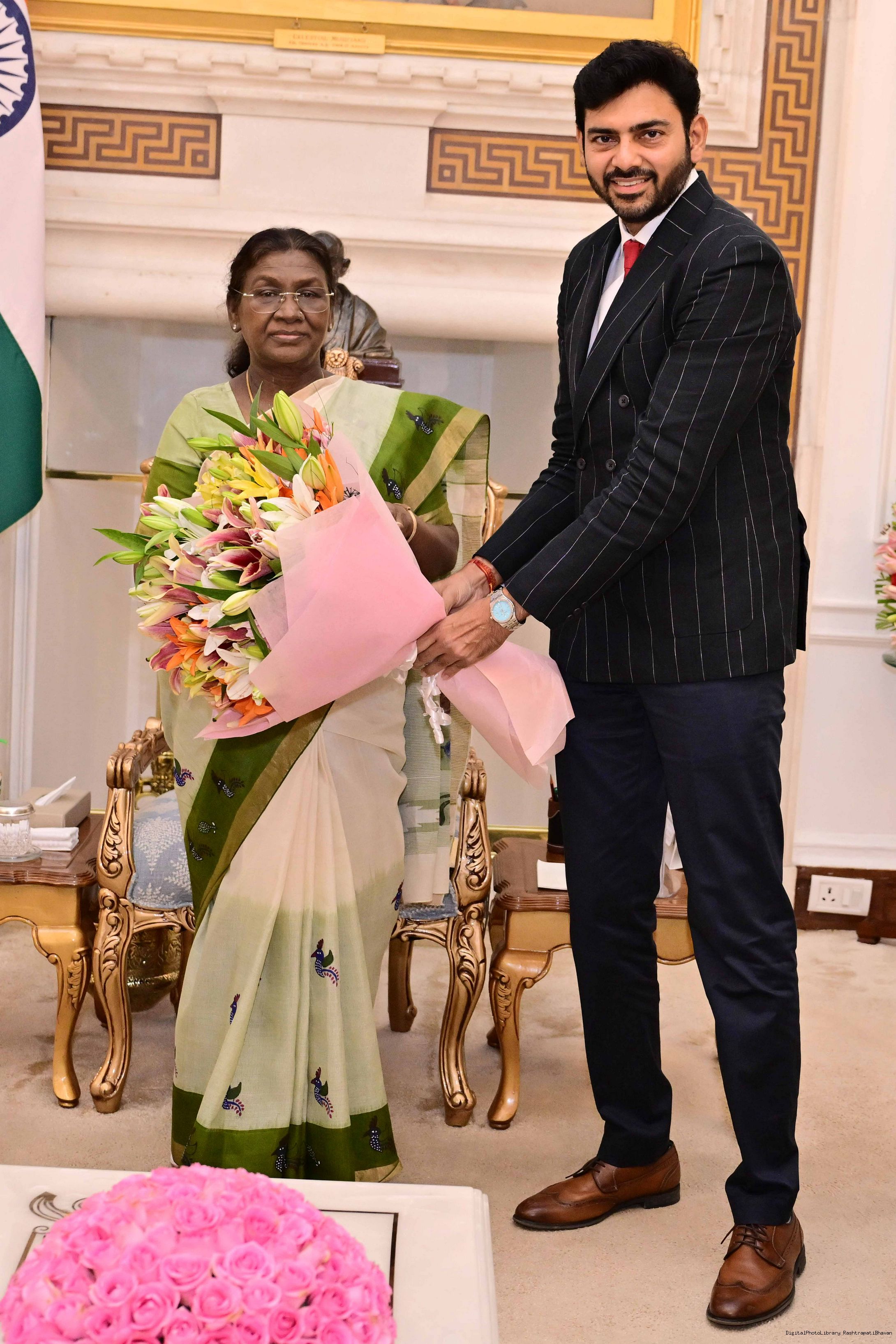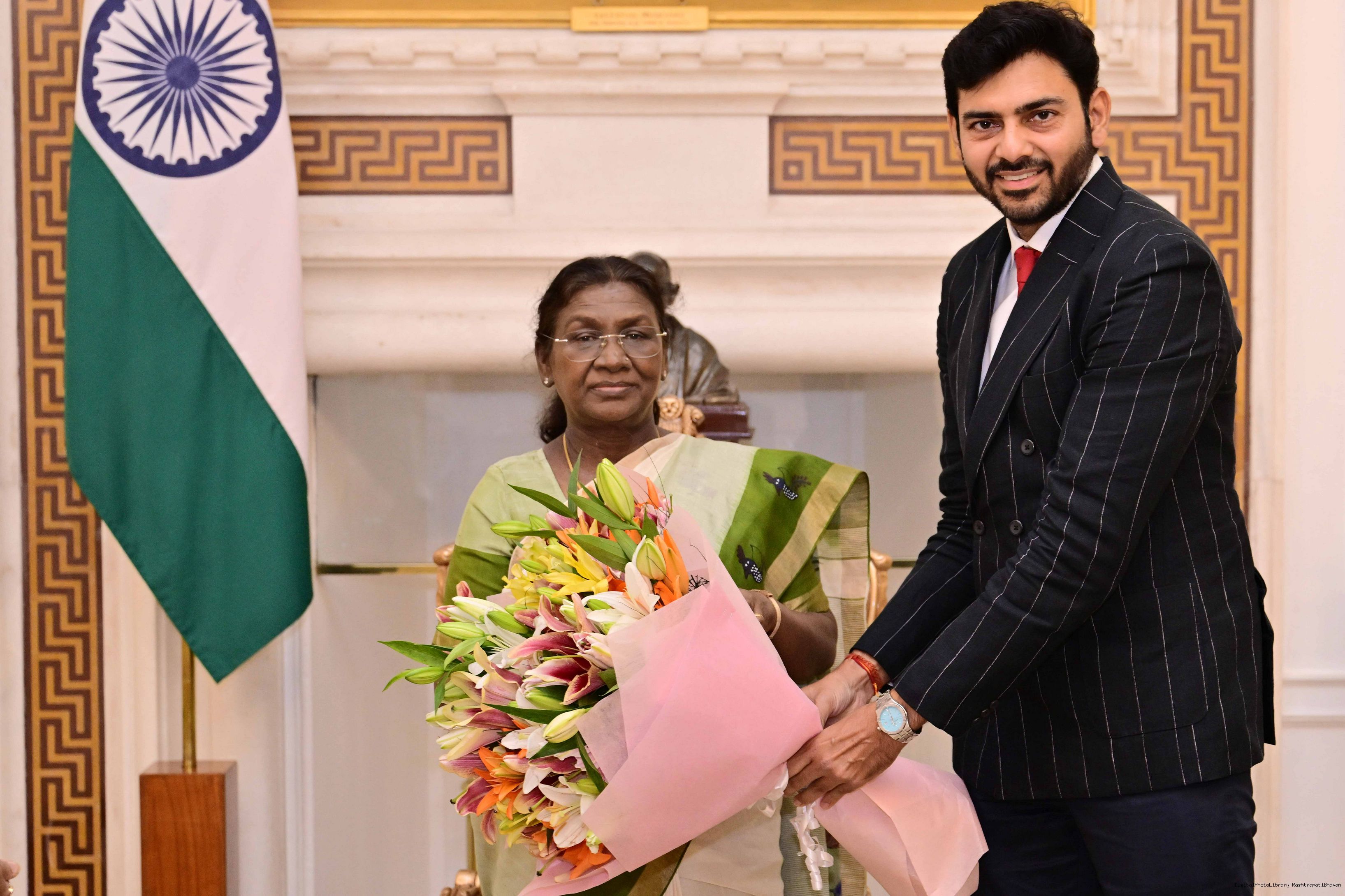 | Caption: | Shri Sourav Mishra from Rairangpur along with Shri Brij Bhushan Agarwal meeting the President of India, Smt. Droupadi Murmu at Rashtrapati Bhavan on September 30, 2025. |