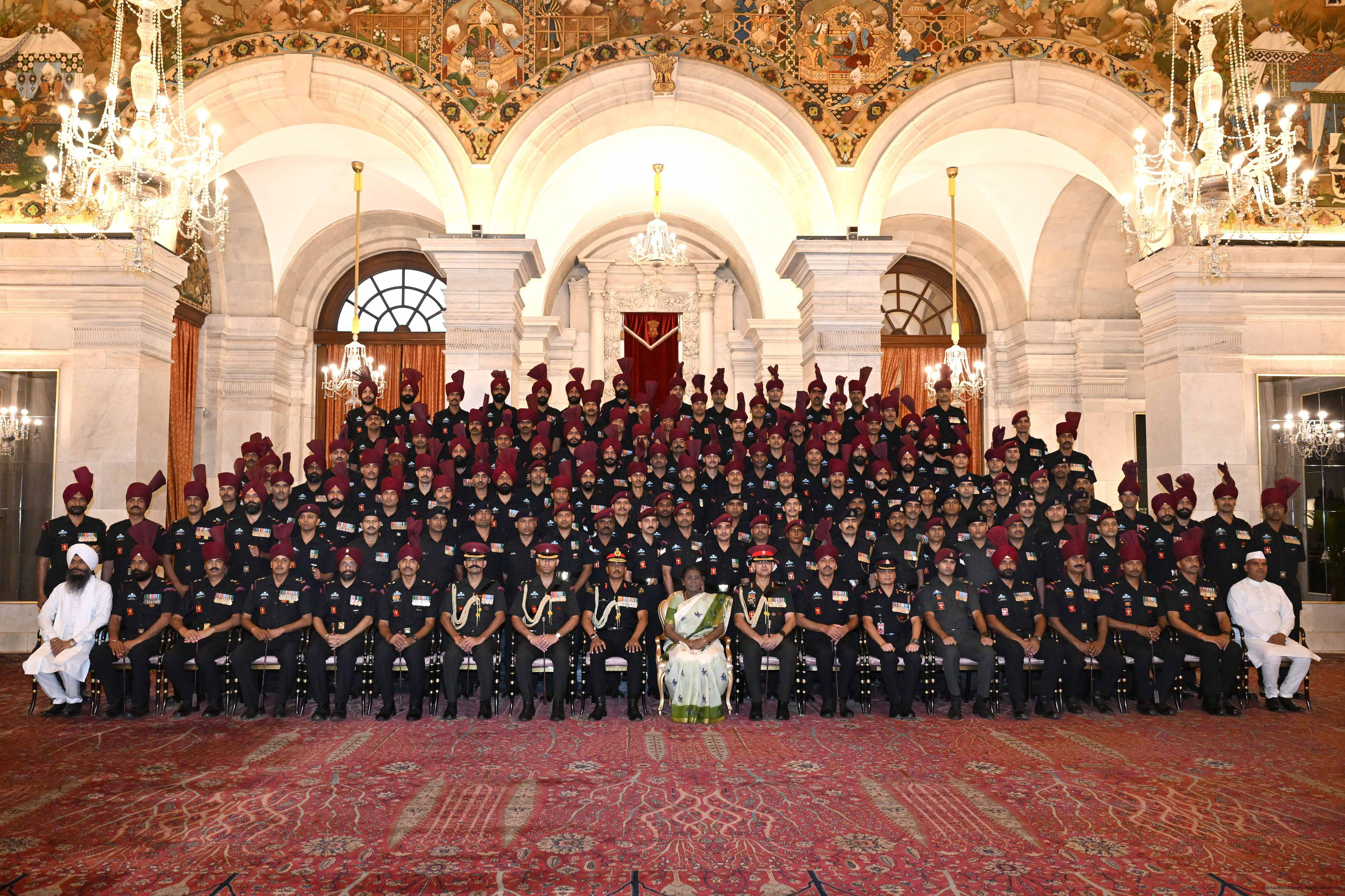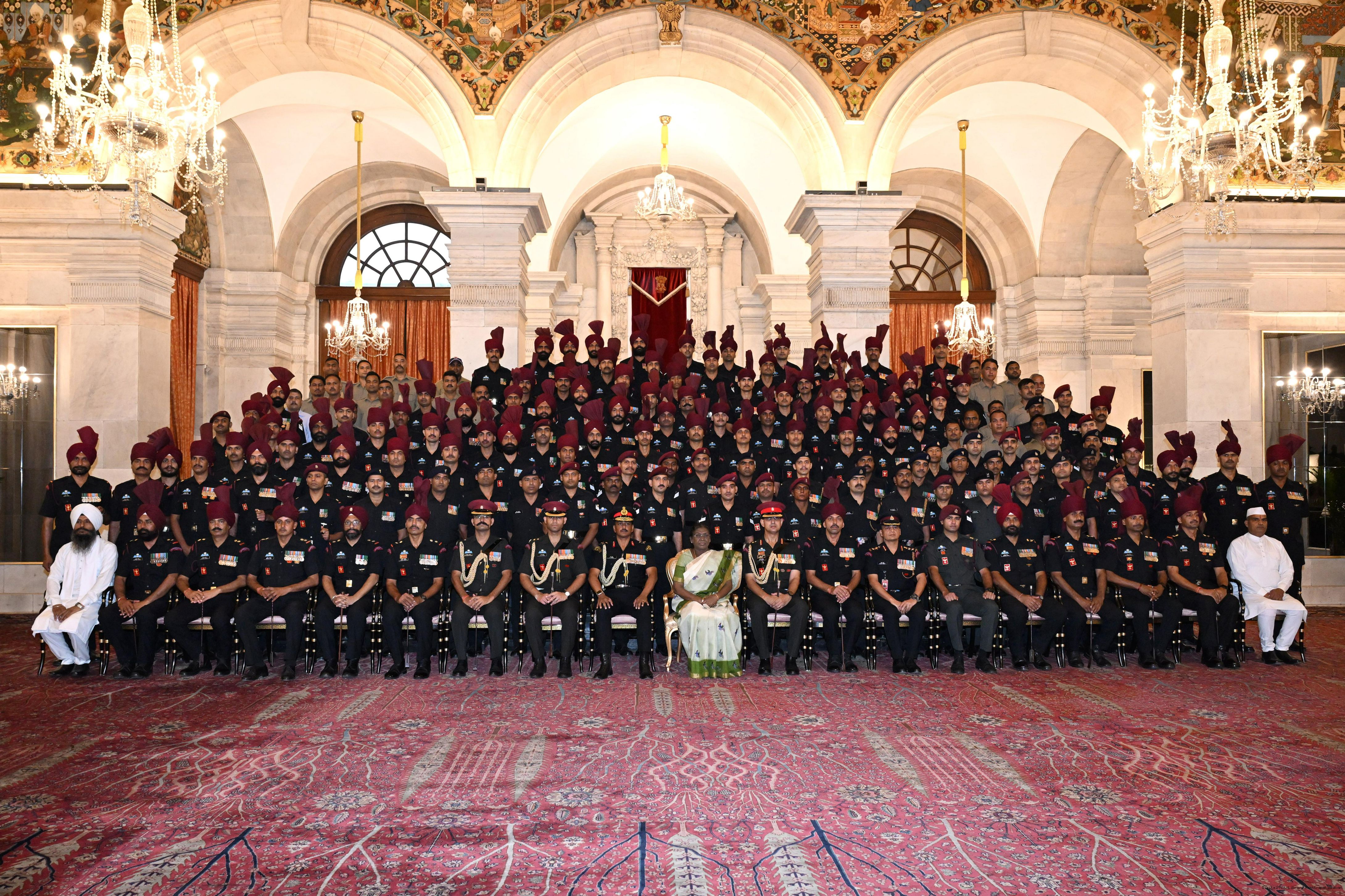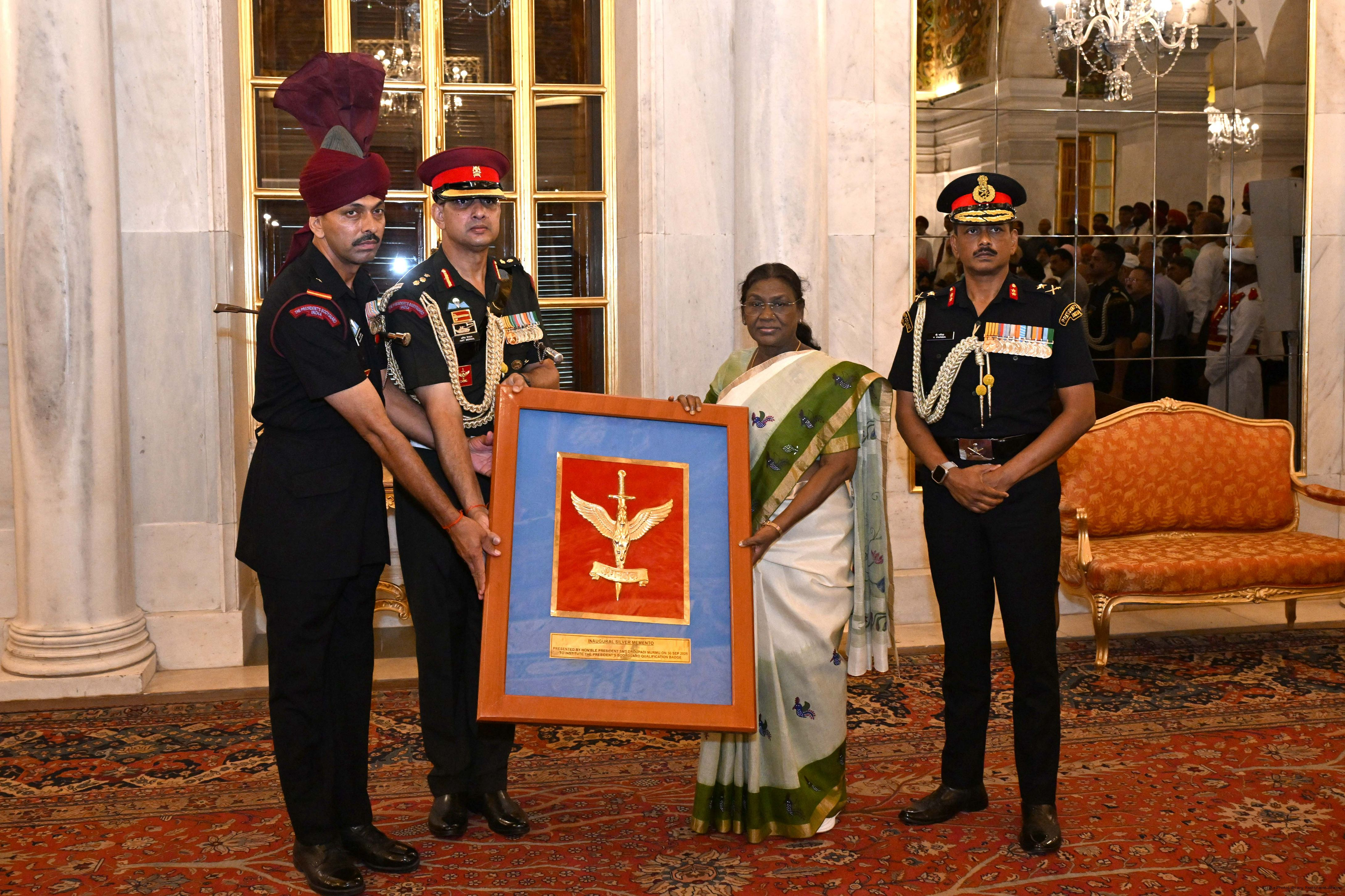 | Caption: | The President of India, Smt. Droupadi Murmu met and posing a group photograph with PBG personnel on the occasion of 75 years of being designated 'The President's Bodyguards' at Rashtrapati Bhavan on September 30, 2025. |