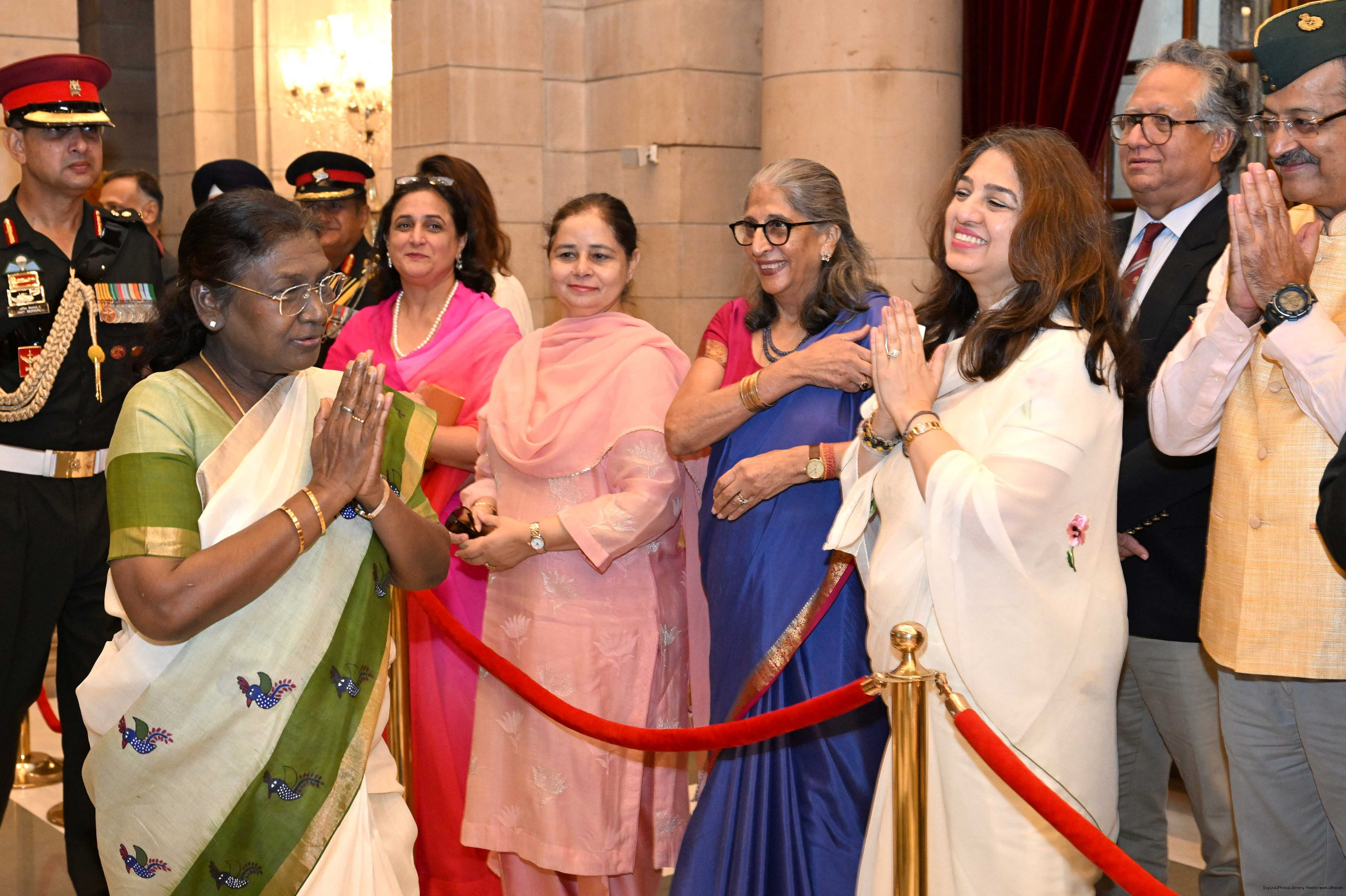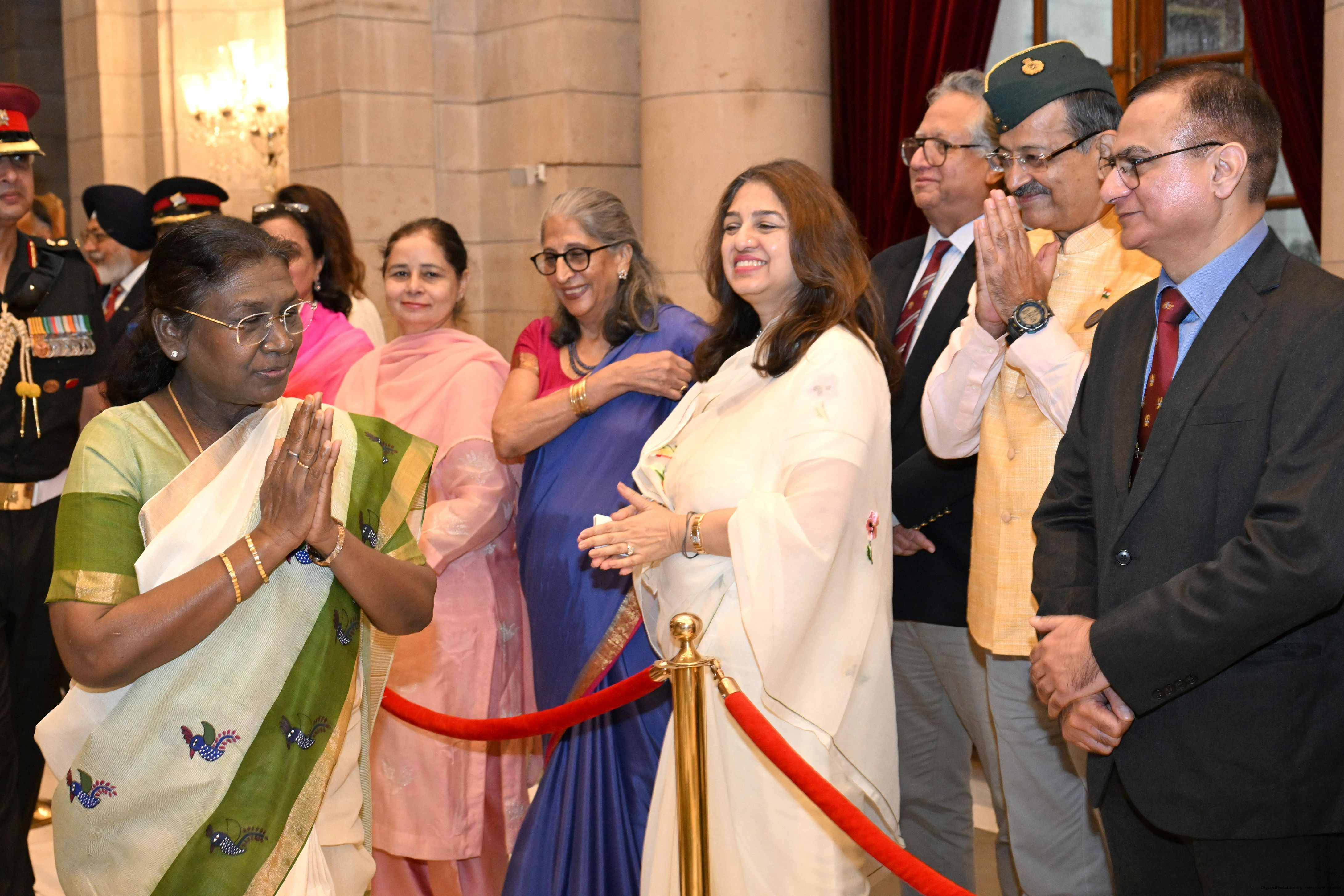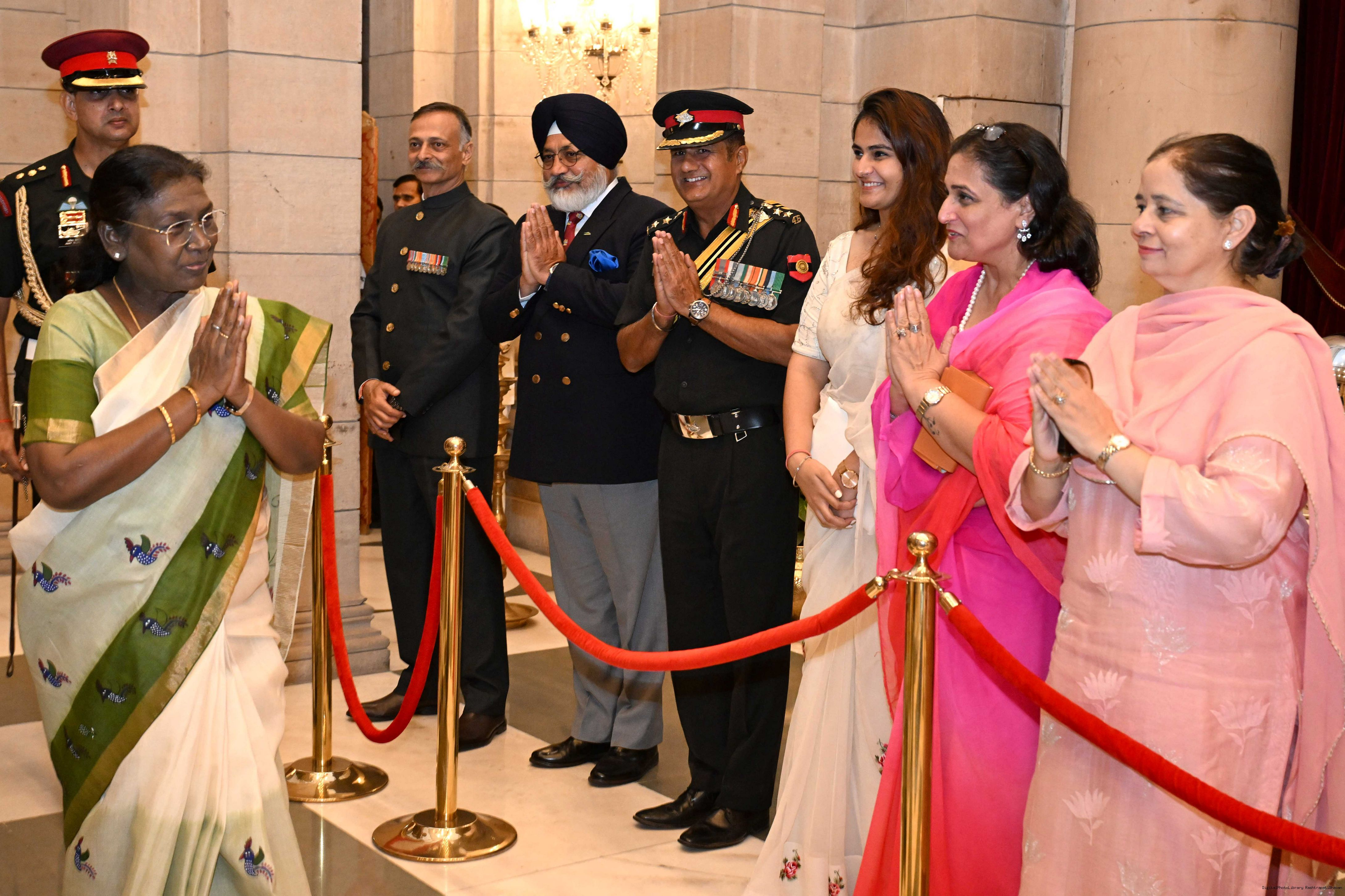 | Caption: | The President of India, Smt. Droupadi Murmu met and posing a group photograph with PBG personnel on the occasion of 75 years of being designated 'The President's Bodyguards' at Rashtrapati Bhavan on September 30, 2025. |