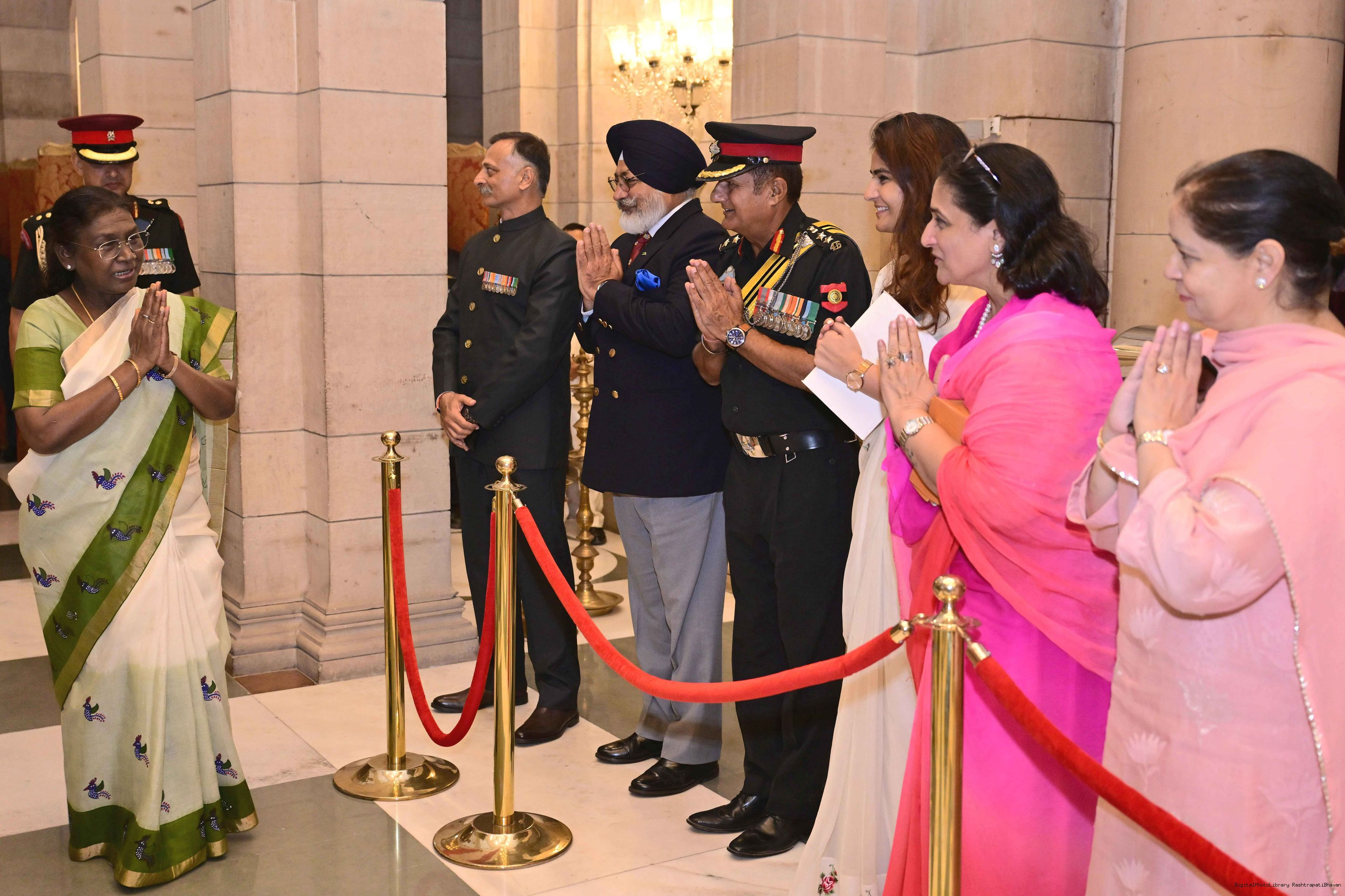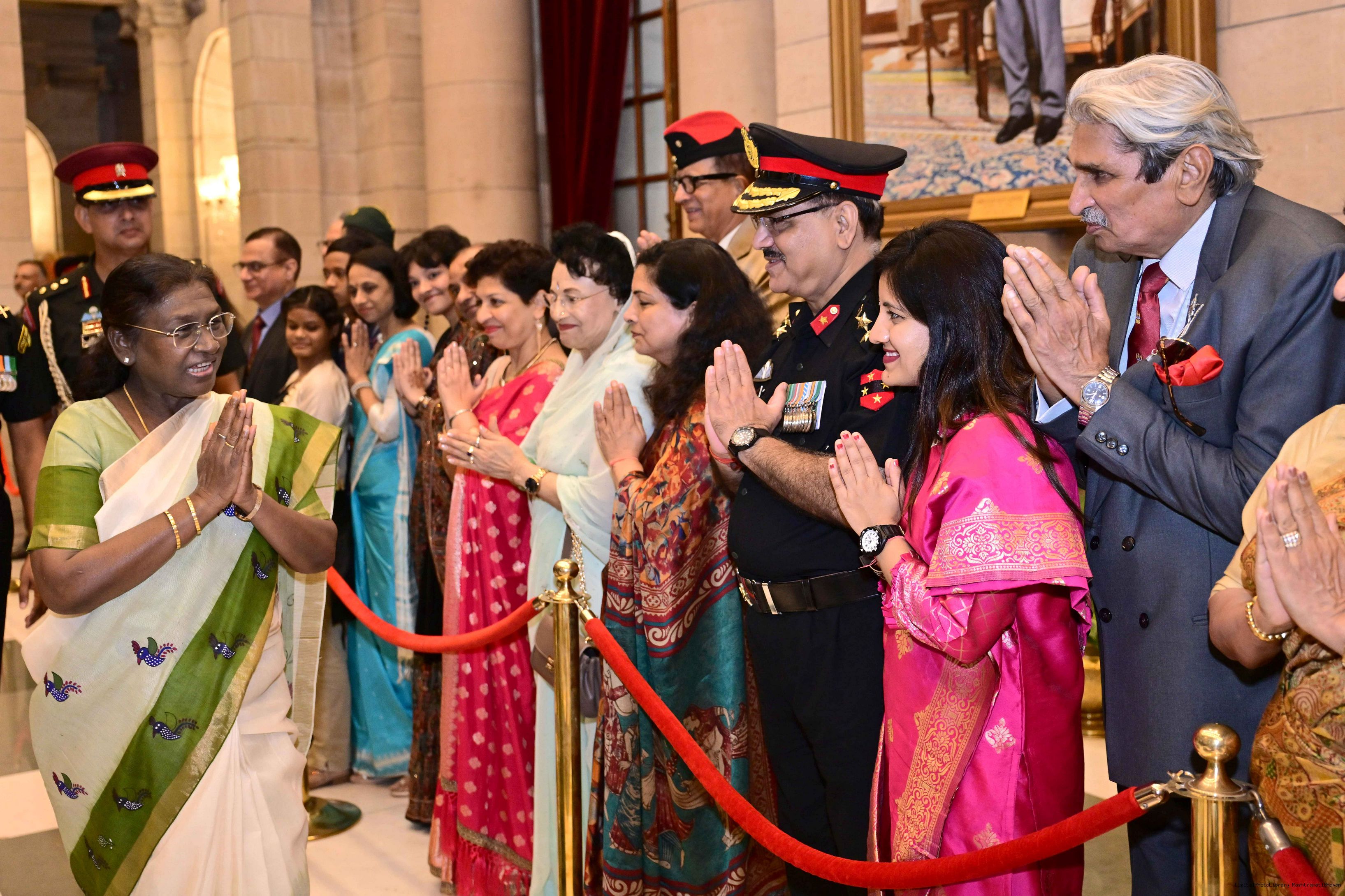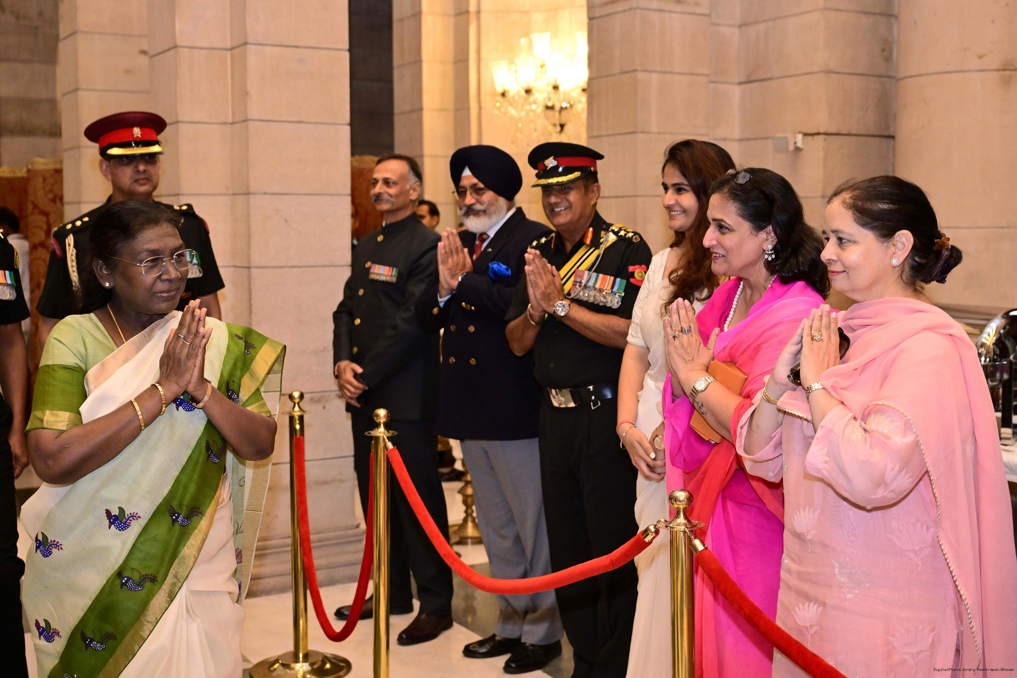| Caption: | The President of India, Smt. Droupadi Murmu met and posing a group photograph with PBG personnel on the occasion of 75 years of being designated 'The President's Bodyguards' at Rashtrapati Bhavan on September 30, 2025. |