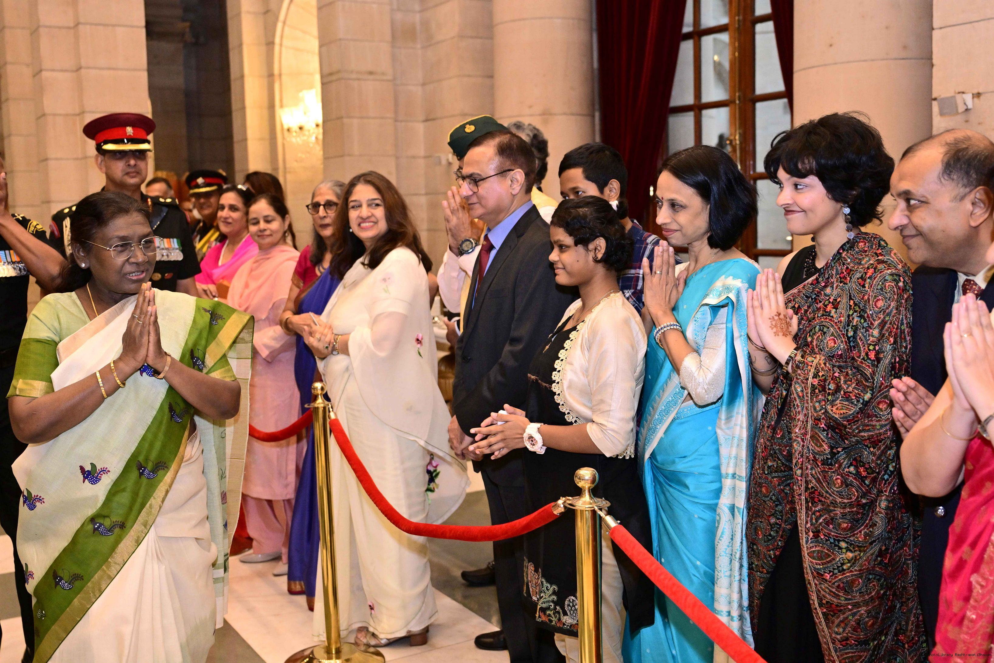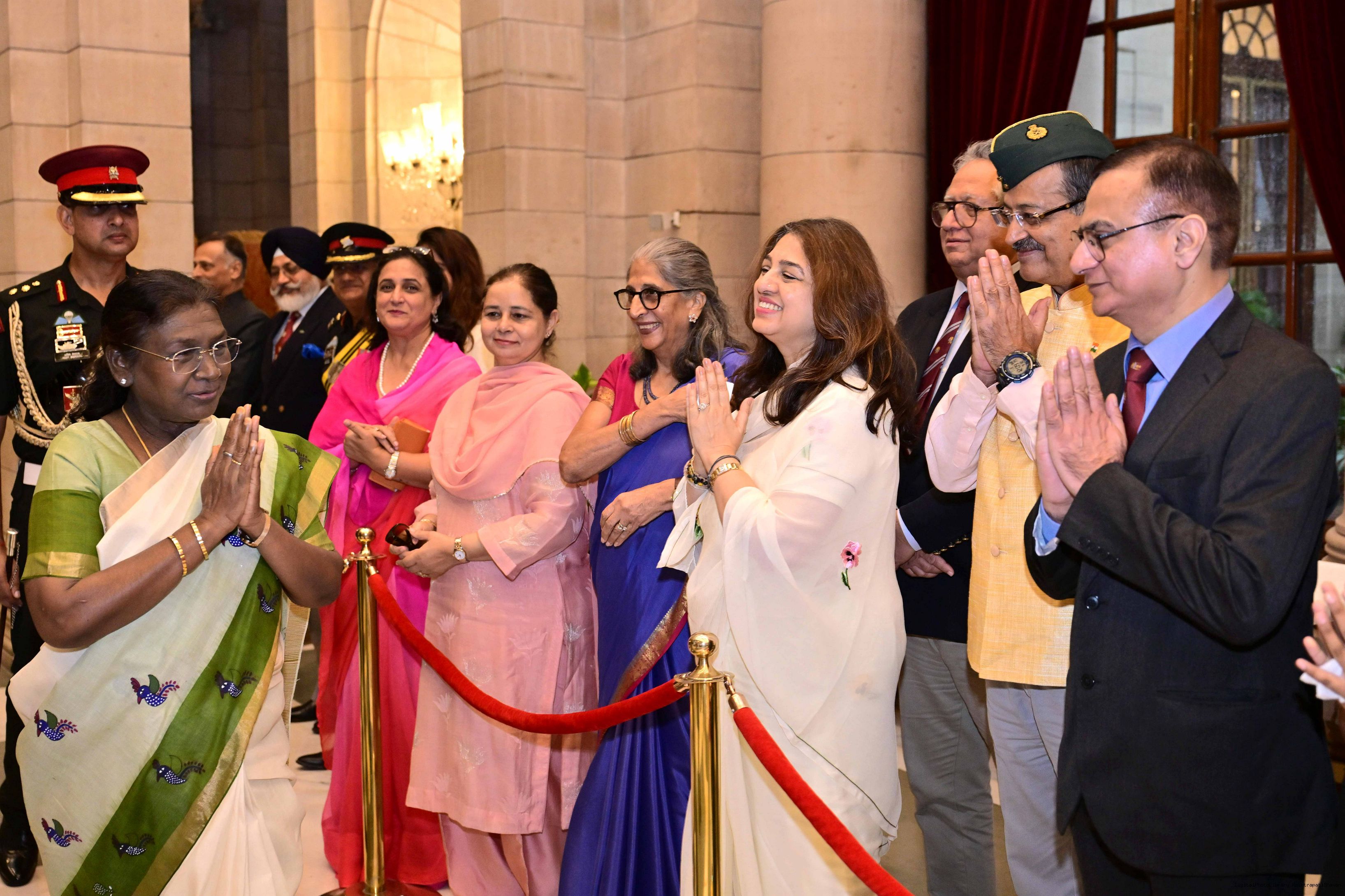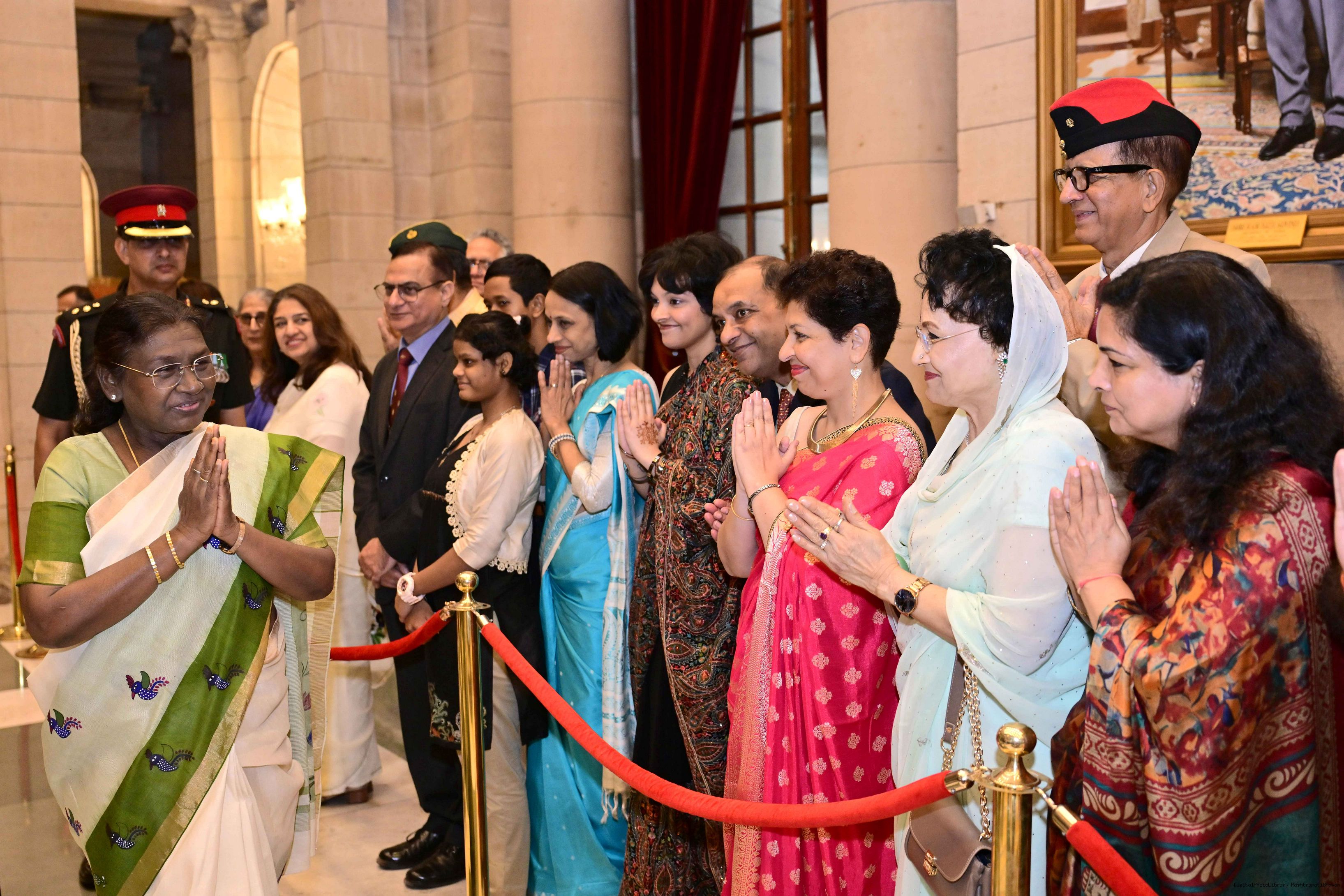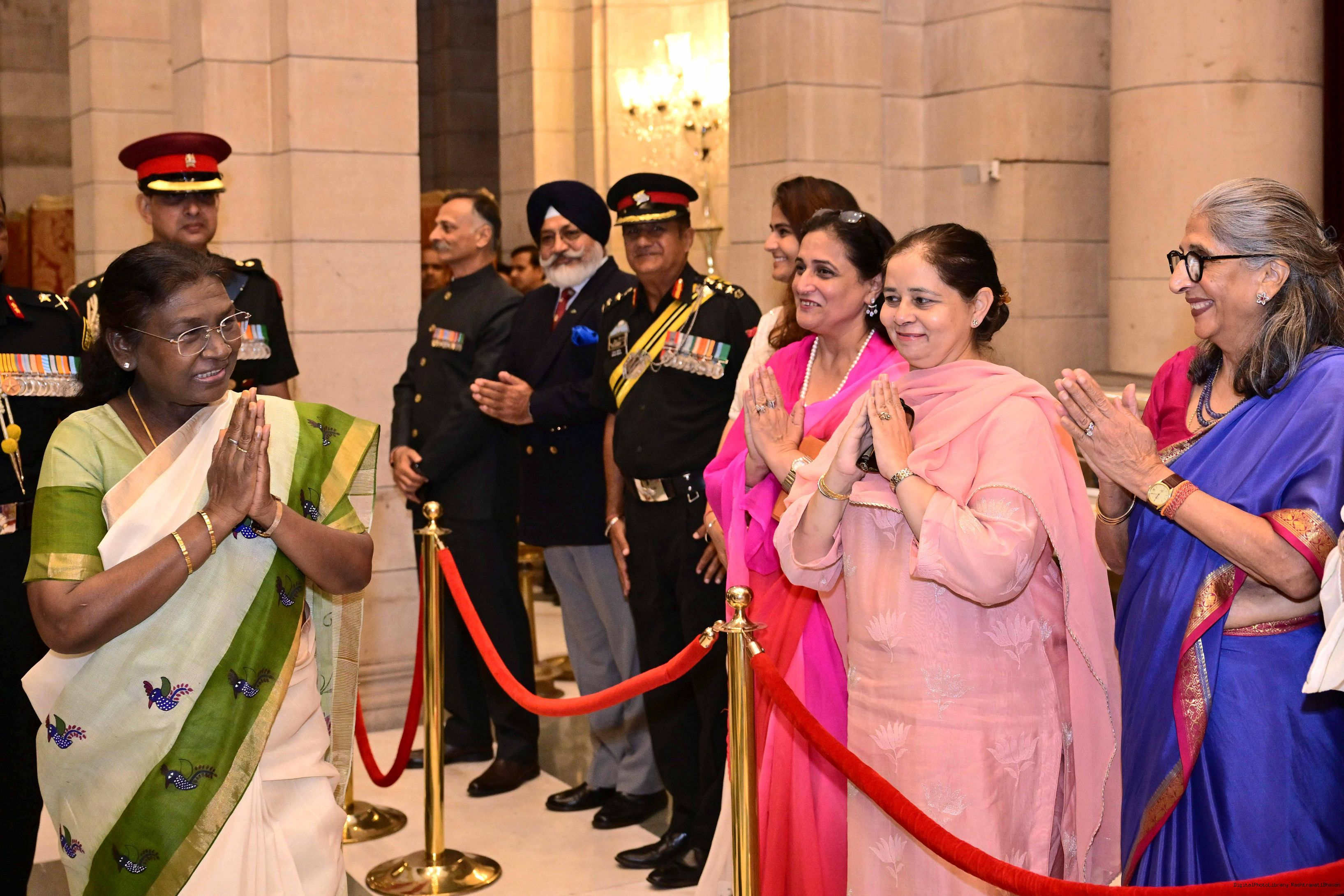 | Caption: | The President of India, Smt. Droupadi Murmu met and posing a group photograph with PBG personnel on the occasion of 75 years of being designated 'The President's Bodyguards' at Rashtrapati Bhavan on September 30, 2025. |