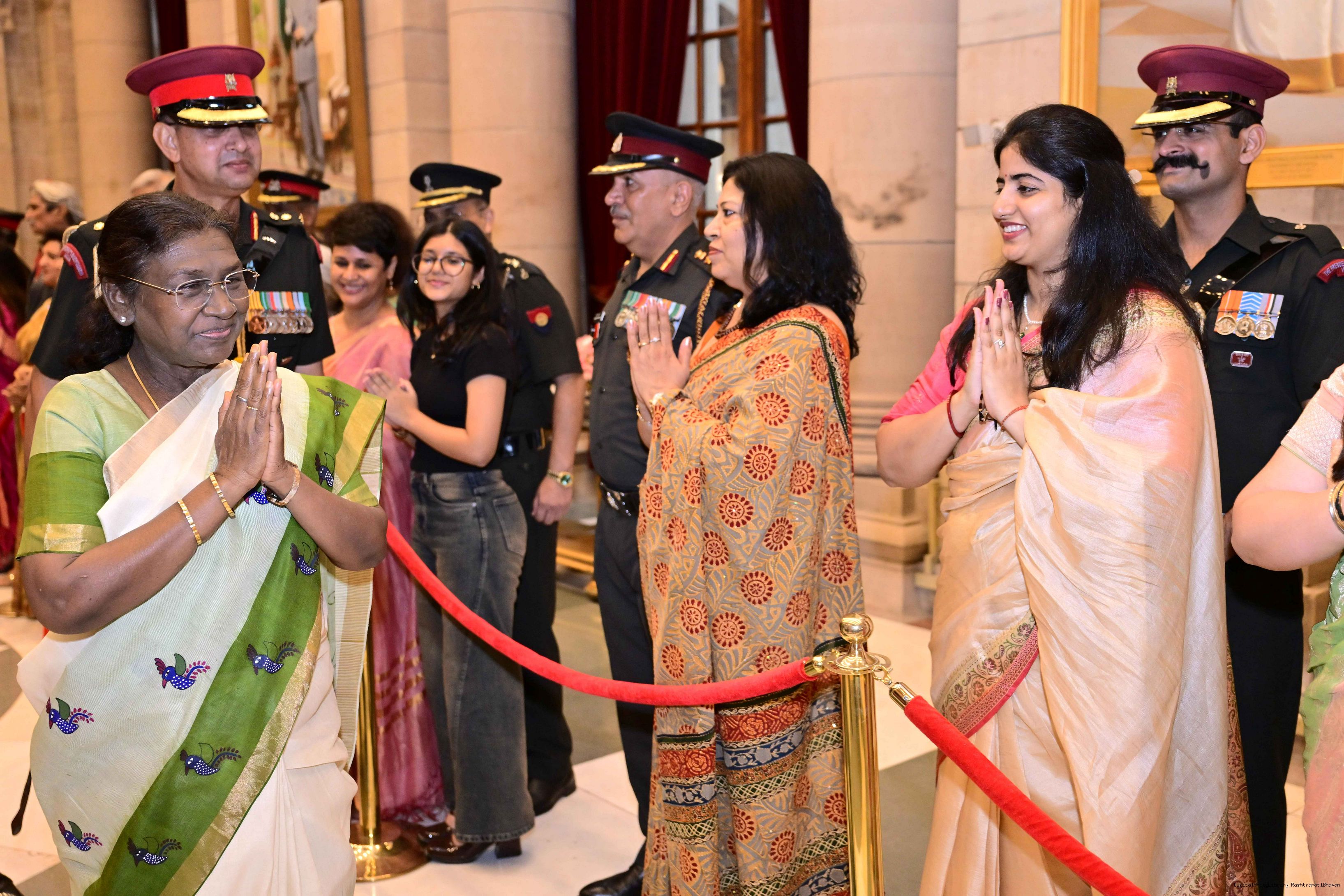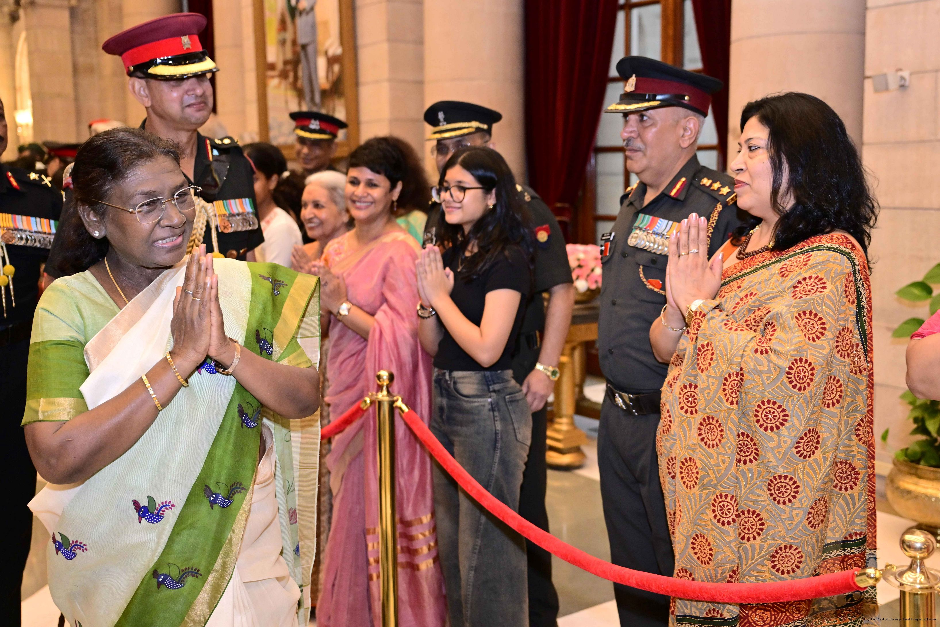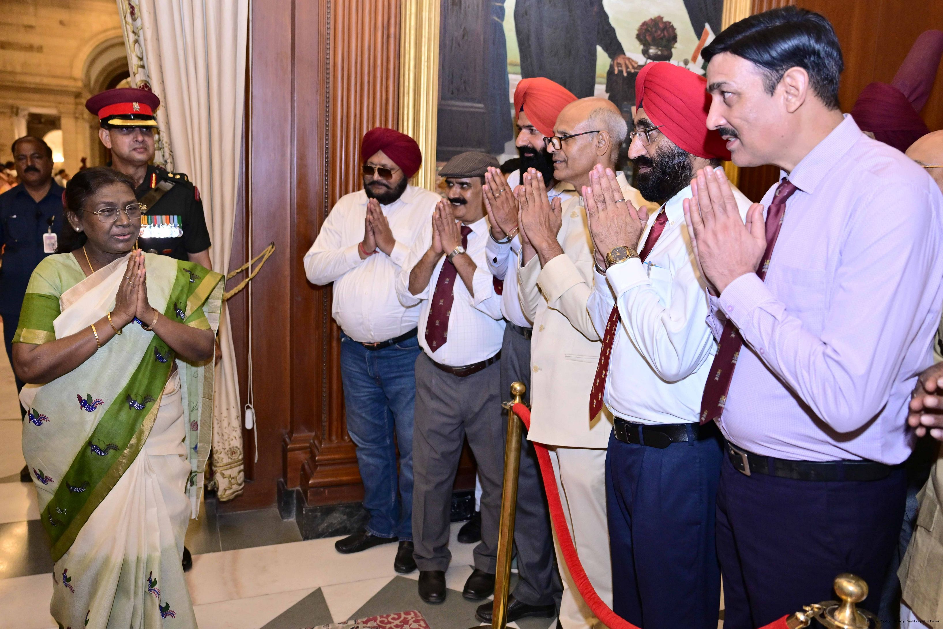 | Caption: | The President of India, Smt. Droupadi Murmu met and posing a group photograph with PBG personnel on the occasion of 75 years of being designated 'The President's Bodyguards' at Rashtrapati Bhavan on September 30, 2025. |