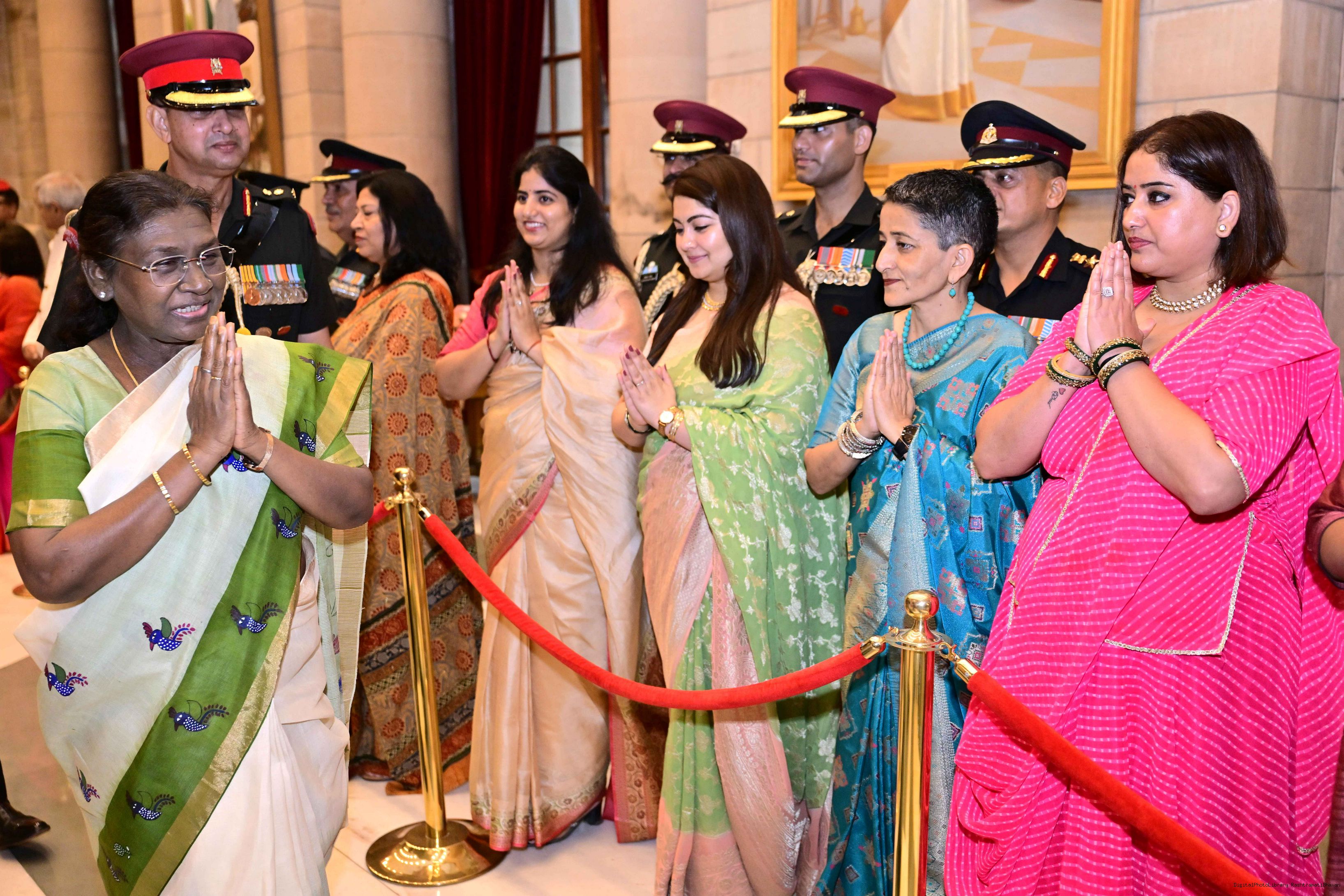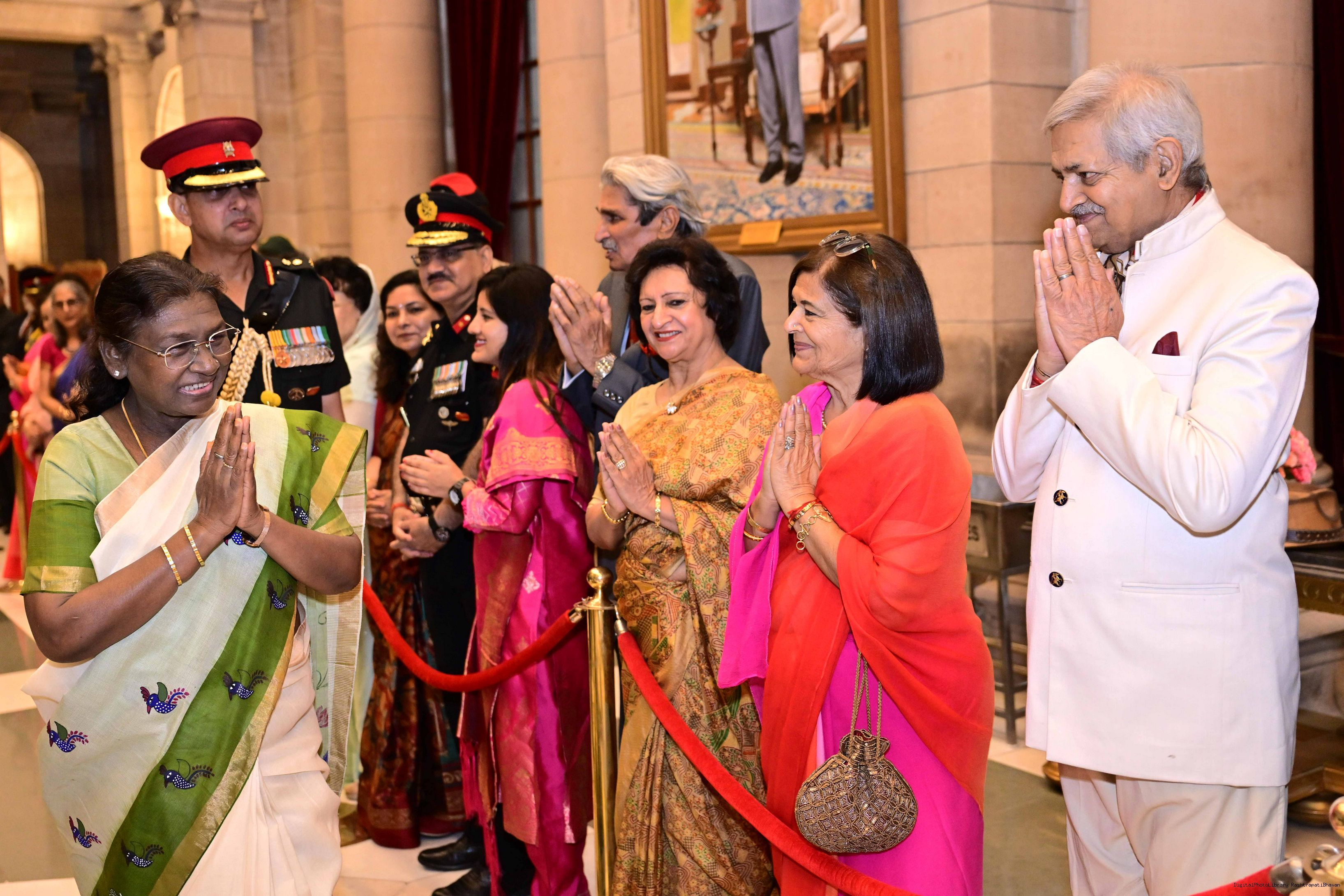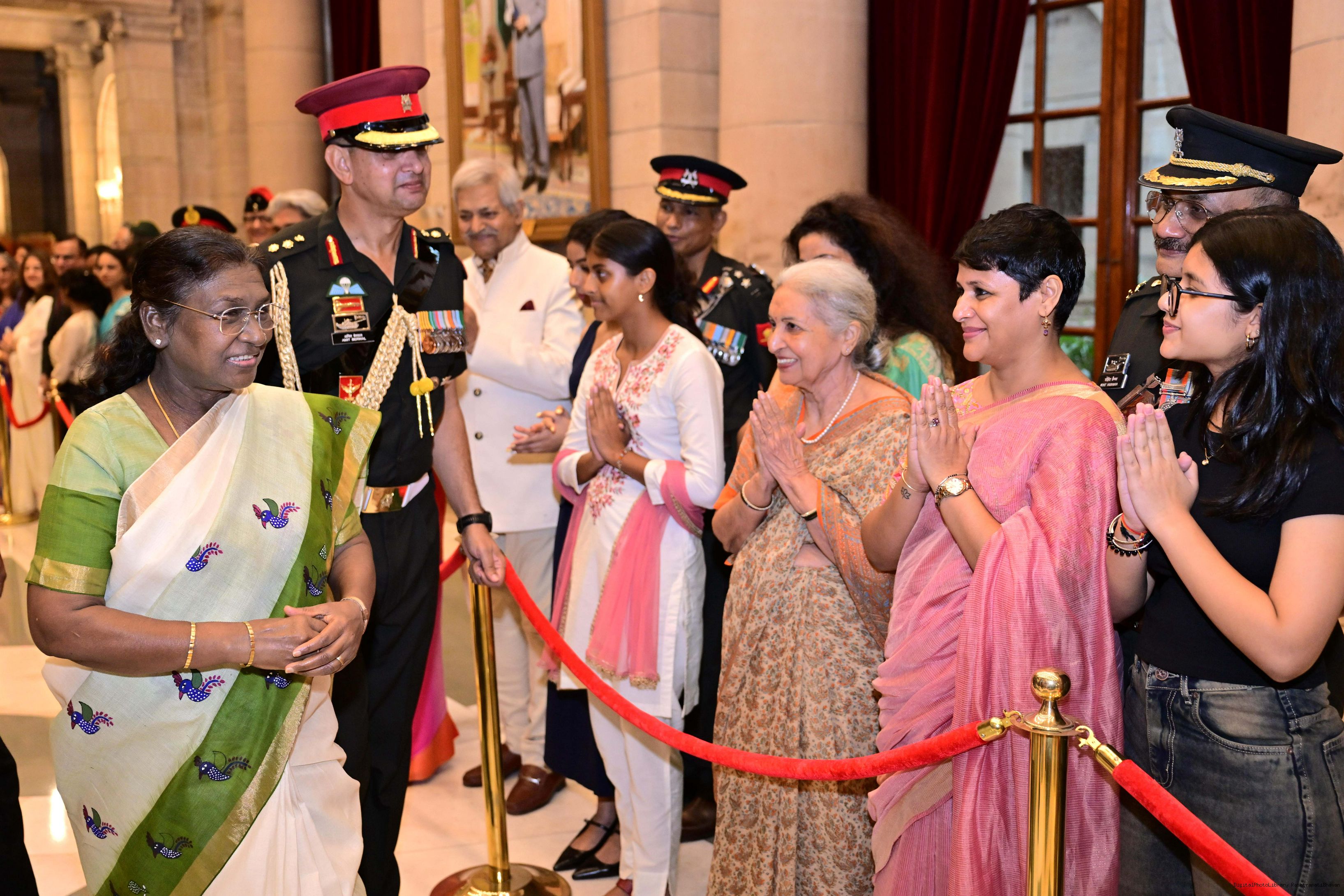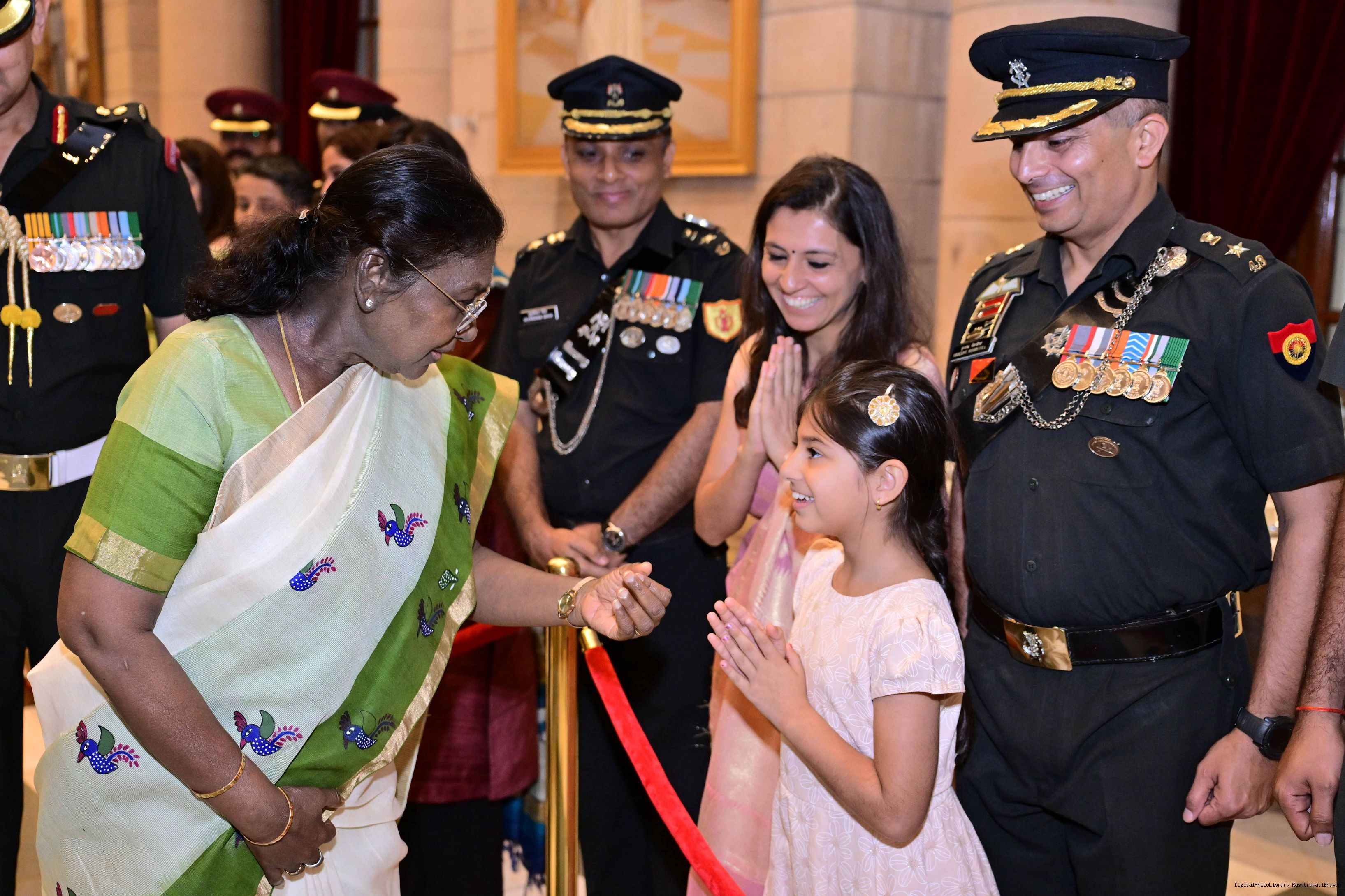 | Caption: | The President of India, Smt. Droupadi Murmu met and posing a group photograph with PBG personnel on the occasion of 75 years of being designated 'The President's Bodyguards' at Rashtrapati Bhavan on September 30, 2025. |